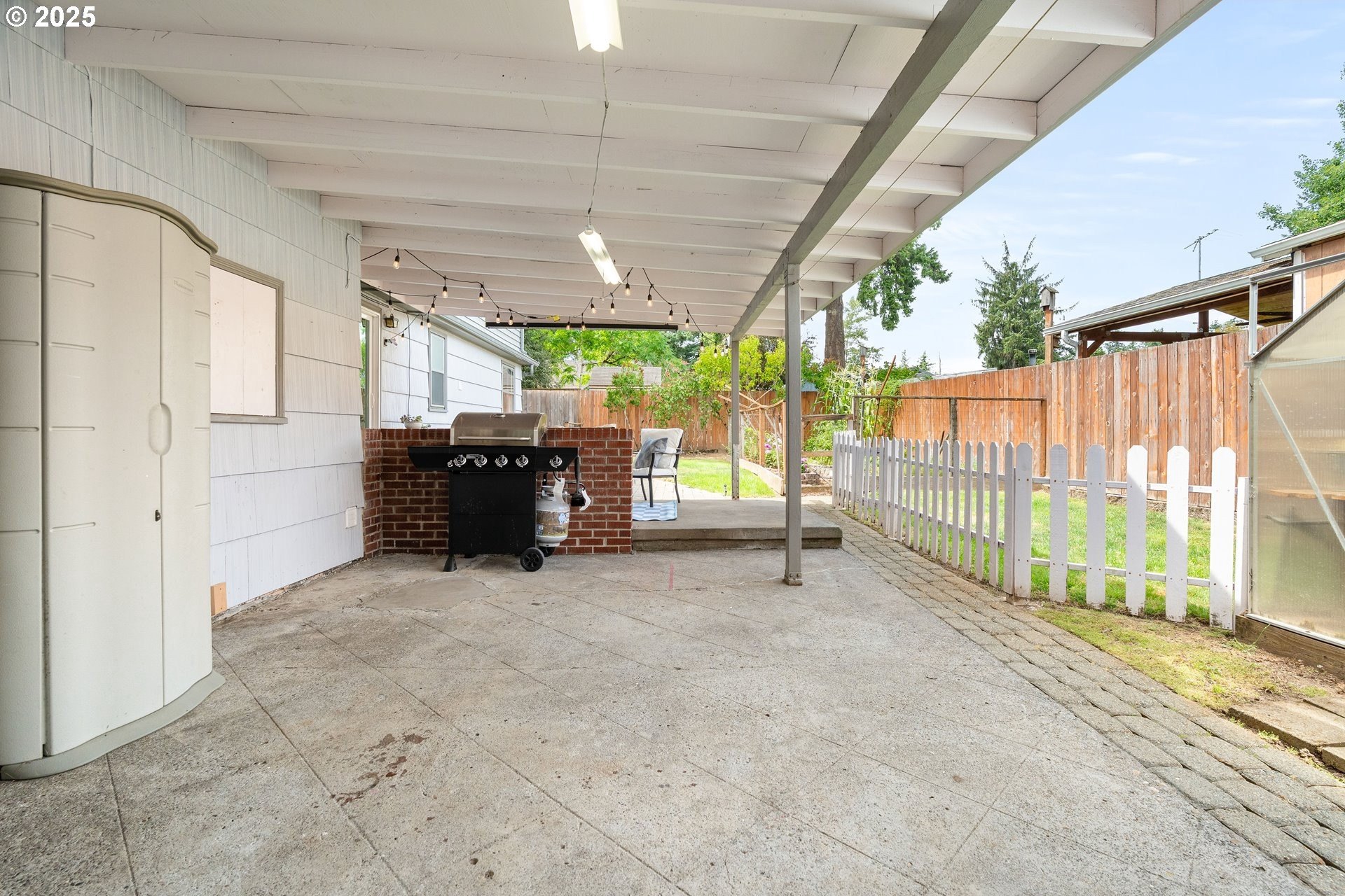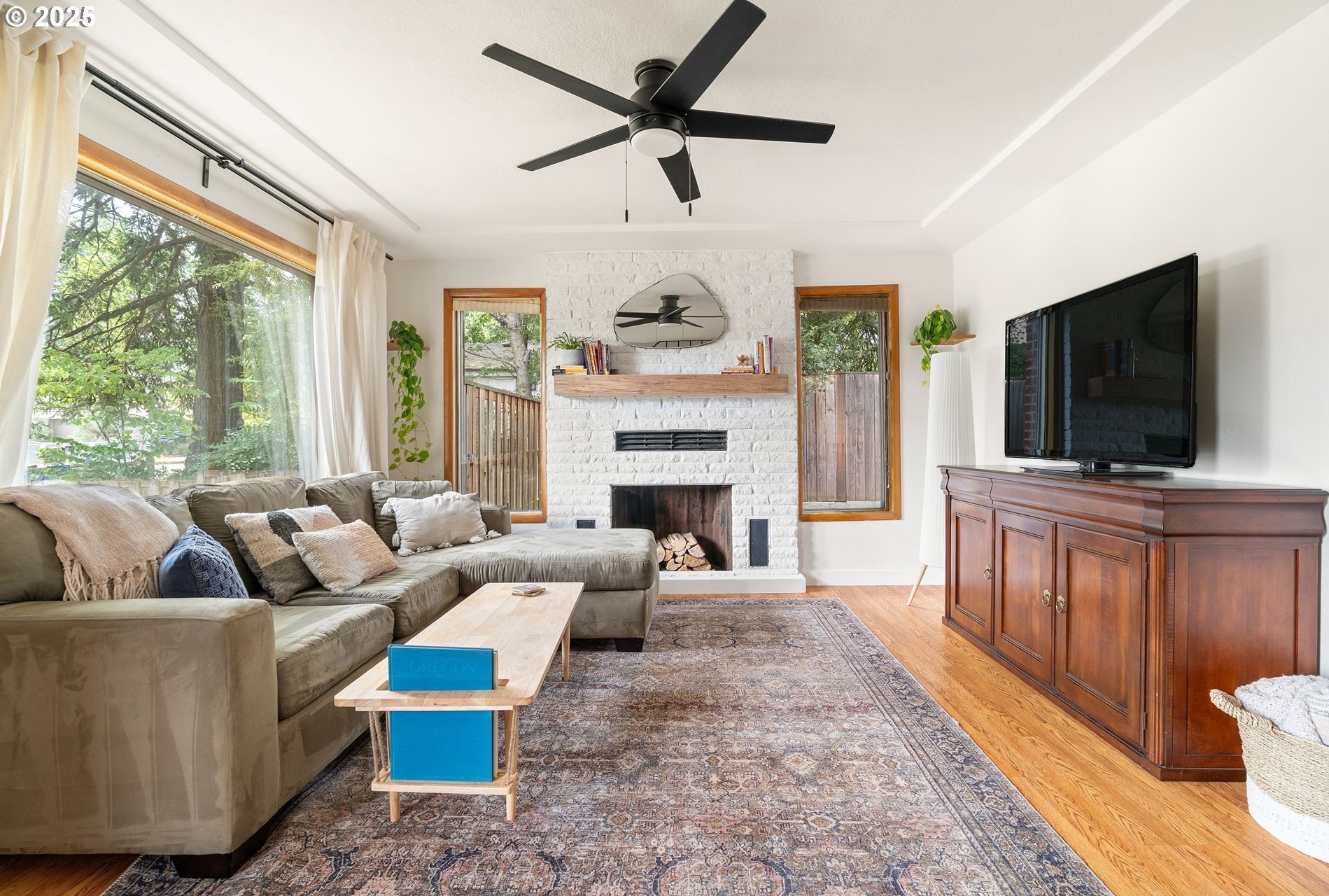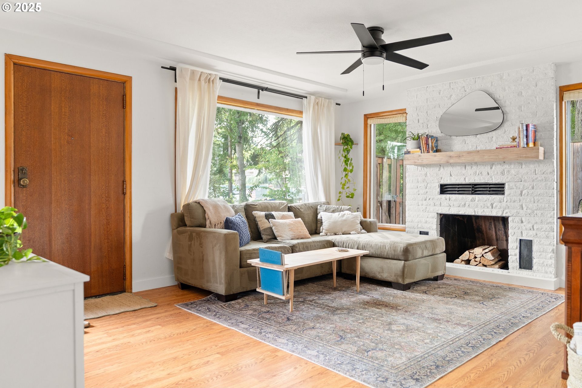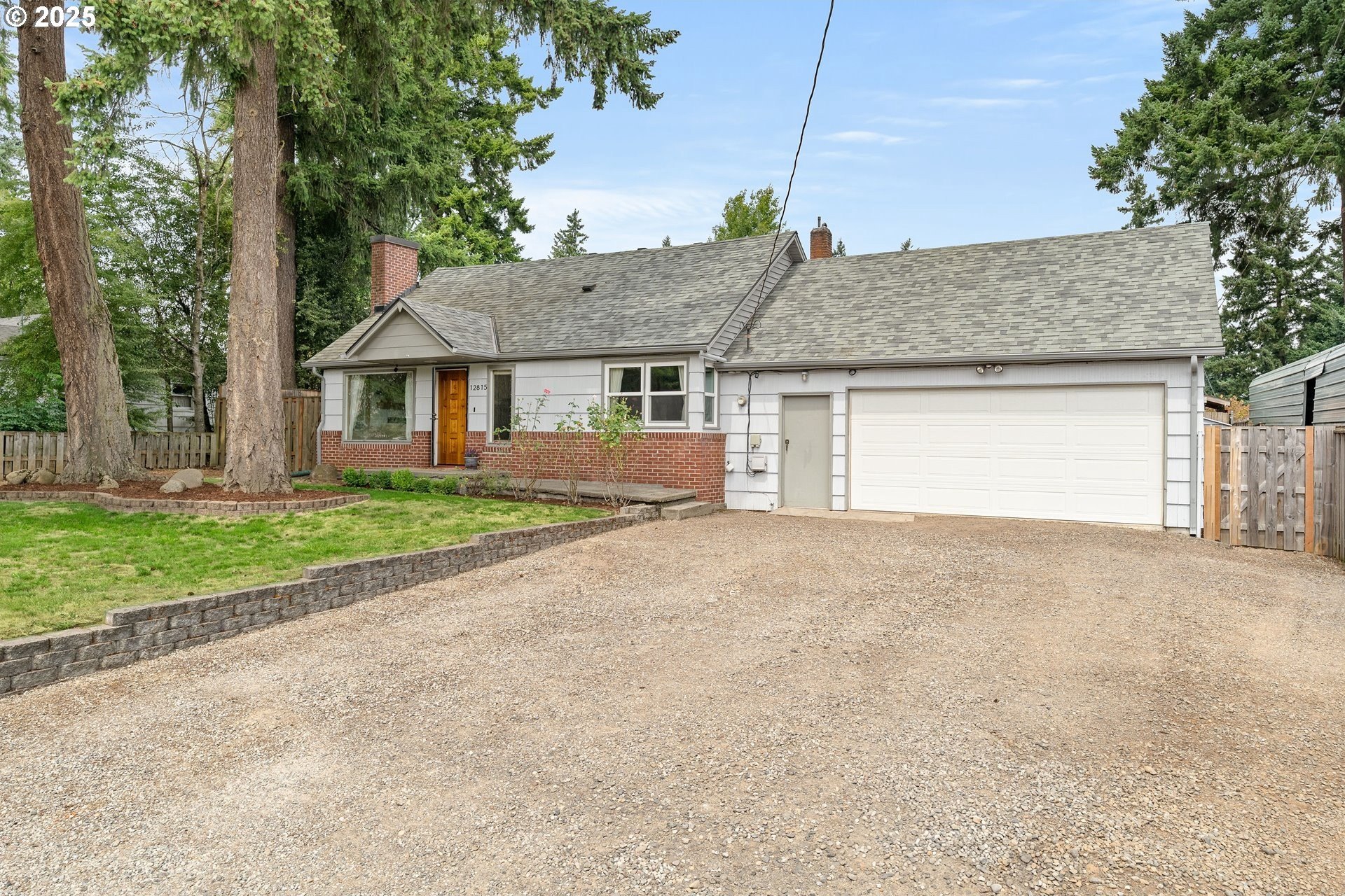 Mid-century roots meet modern living at this refreshed 1950s Mill Park home. Newly exposed brick fireplace, original hardwoods, and fresh paint set the stage for bright, flexible spaces. The kitchen is a cook’s dream with butcher block counters, new tile backsplash, updated cabinets, and plenty of room for chef + sous to work side by side. Sliding doors off the dining room frame backyard views, while the cozy living room centers around the original brick fireplace with twin sidelight windows. A full bath with retro tile and generous storage plus a peaceful main-level bedroom offer easy guest or primary options. Upstairs, two bedrooms and a half bath create space for home office, studio, or the primary suite of your dreams. A bonus 219 sq ft of storage space over the garage is clean and easily accessible. Oversized 2-car garage with shop space and massive driveway offer space for RVs/campers/boats, and all your gear!. Out back, unwind under a covered patio, grow veggies in the garden and greenhouse, and find a place for everything in the shed and fully fenced spaces. Recent updates include refreshed kitchen (2022), new electrical panel (2025), interior paint (2023), updated plumbing and water line (2007), furnace + oil tank decom (2015), and roof (2014). Close to many hidden gems of east Portland, like the newly-renovated Parklane Park, several food truck pods, and Powell Butte, with easy access to Montavilla, Tabor, 205, and the airport. [Home Energy Score = 3. HES Report at https://rpt.greenbuildingregistry.com/hes/OR10198311]