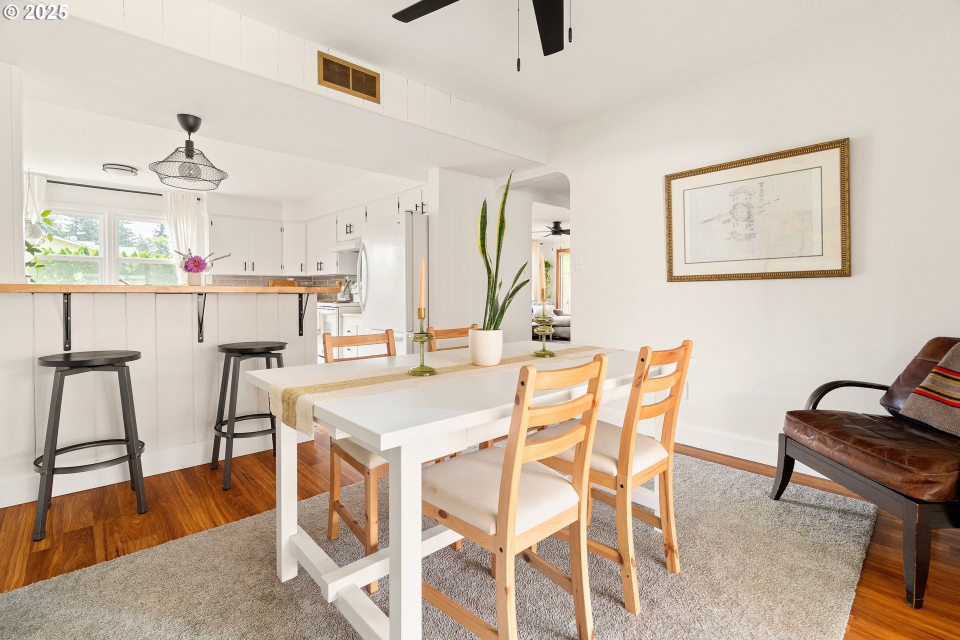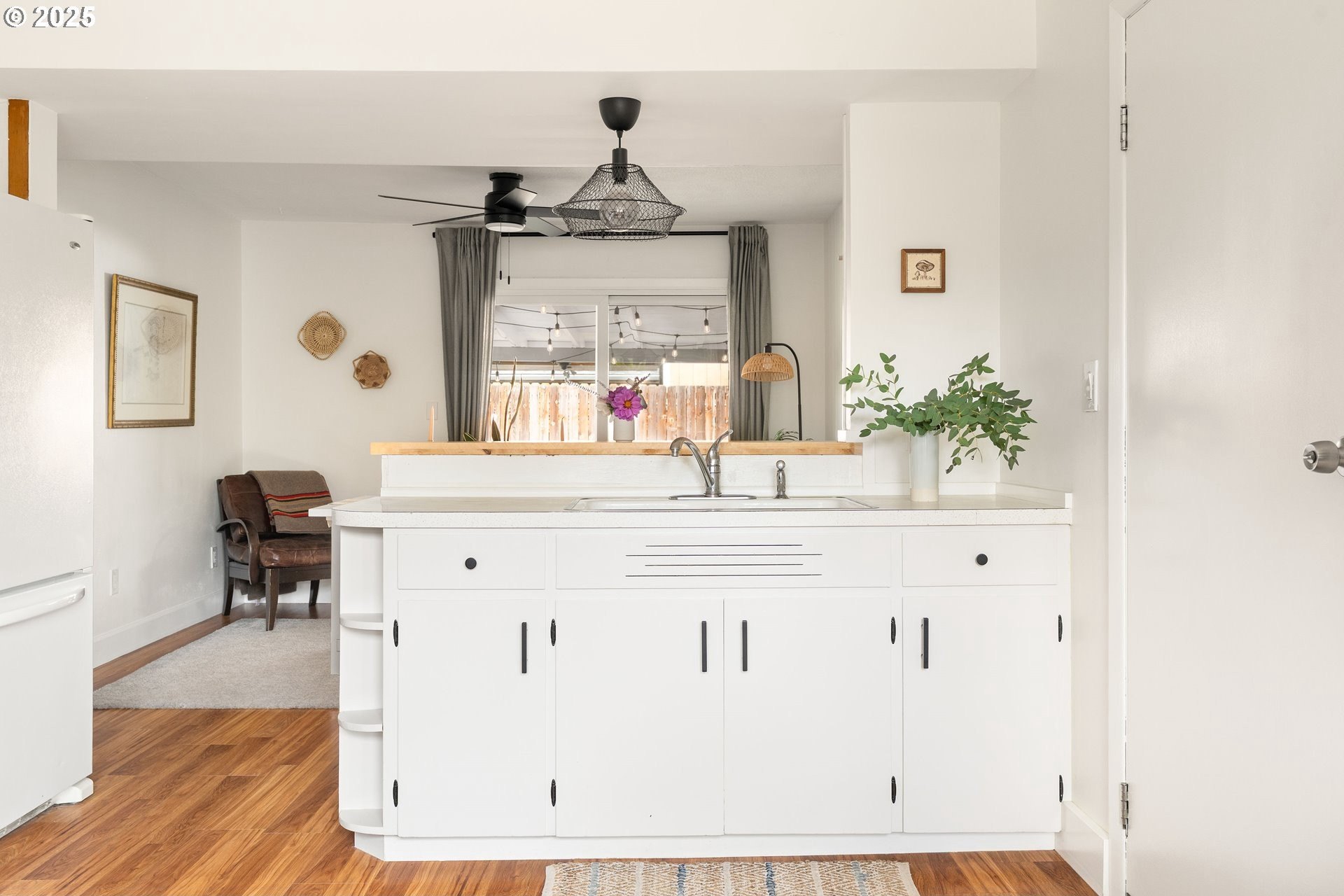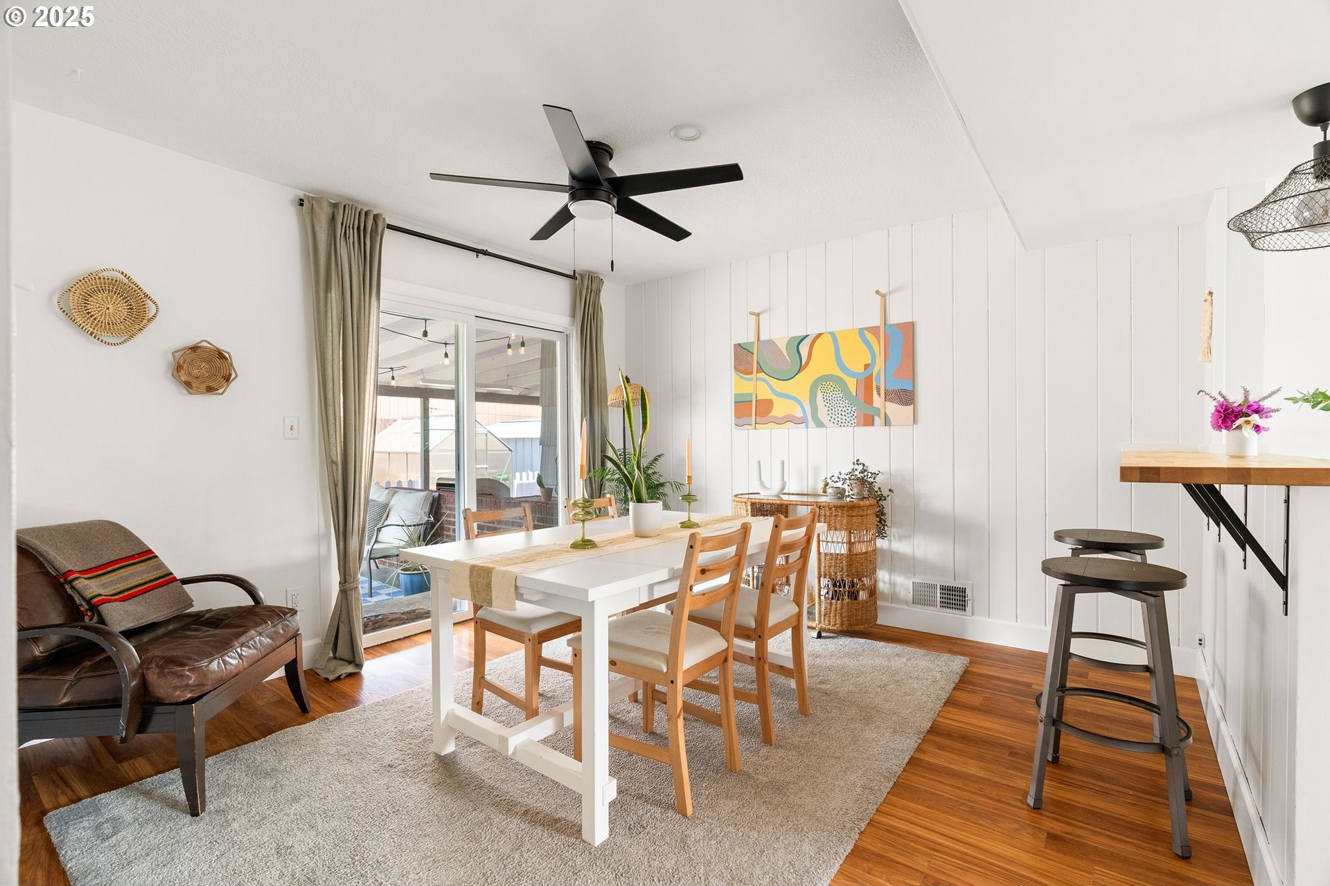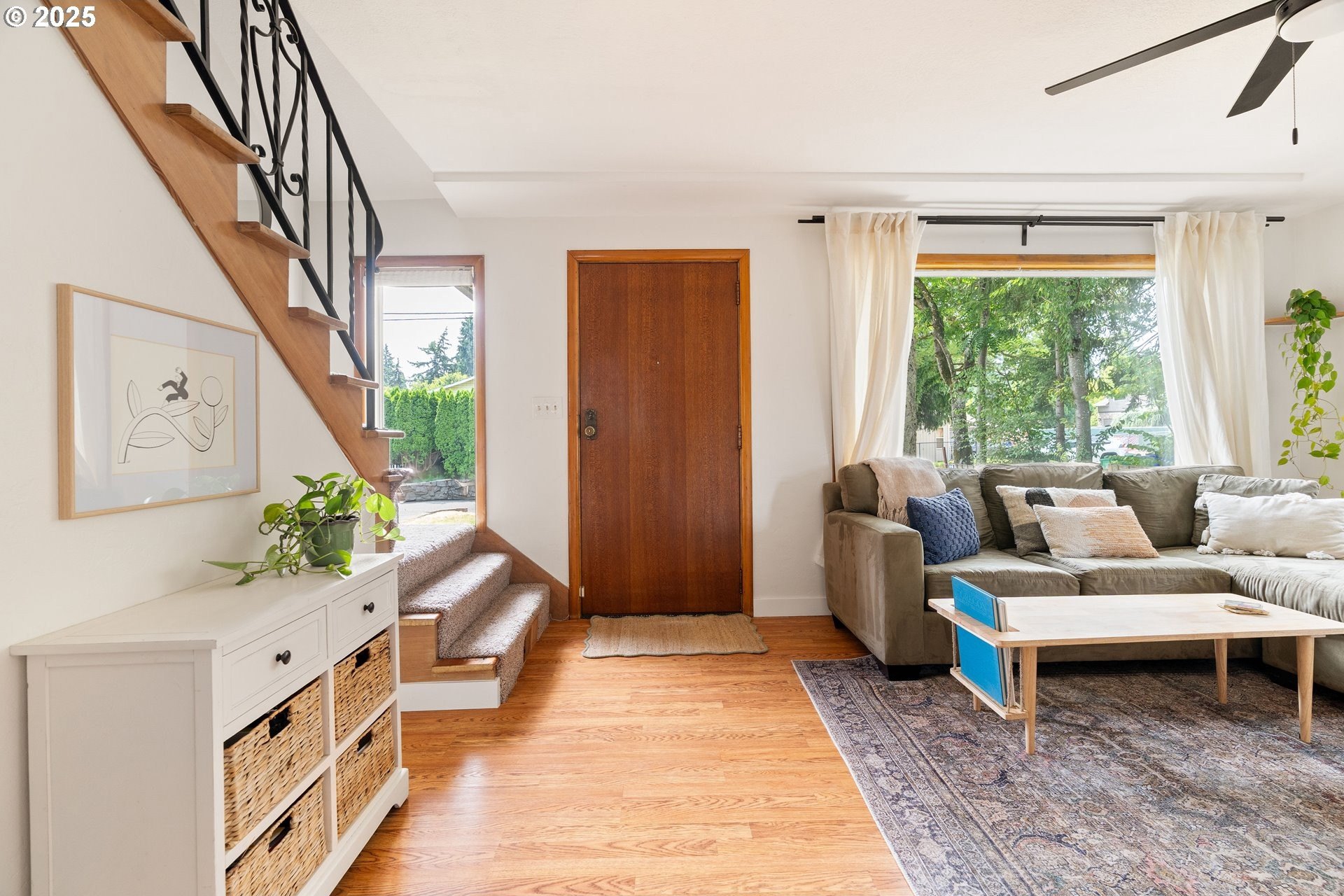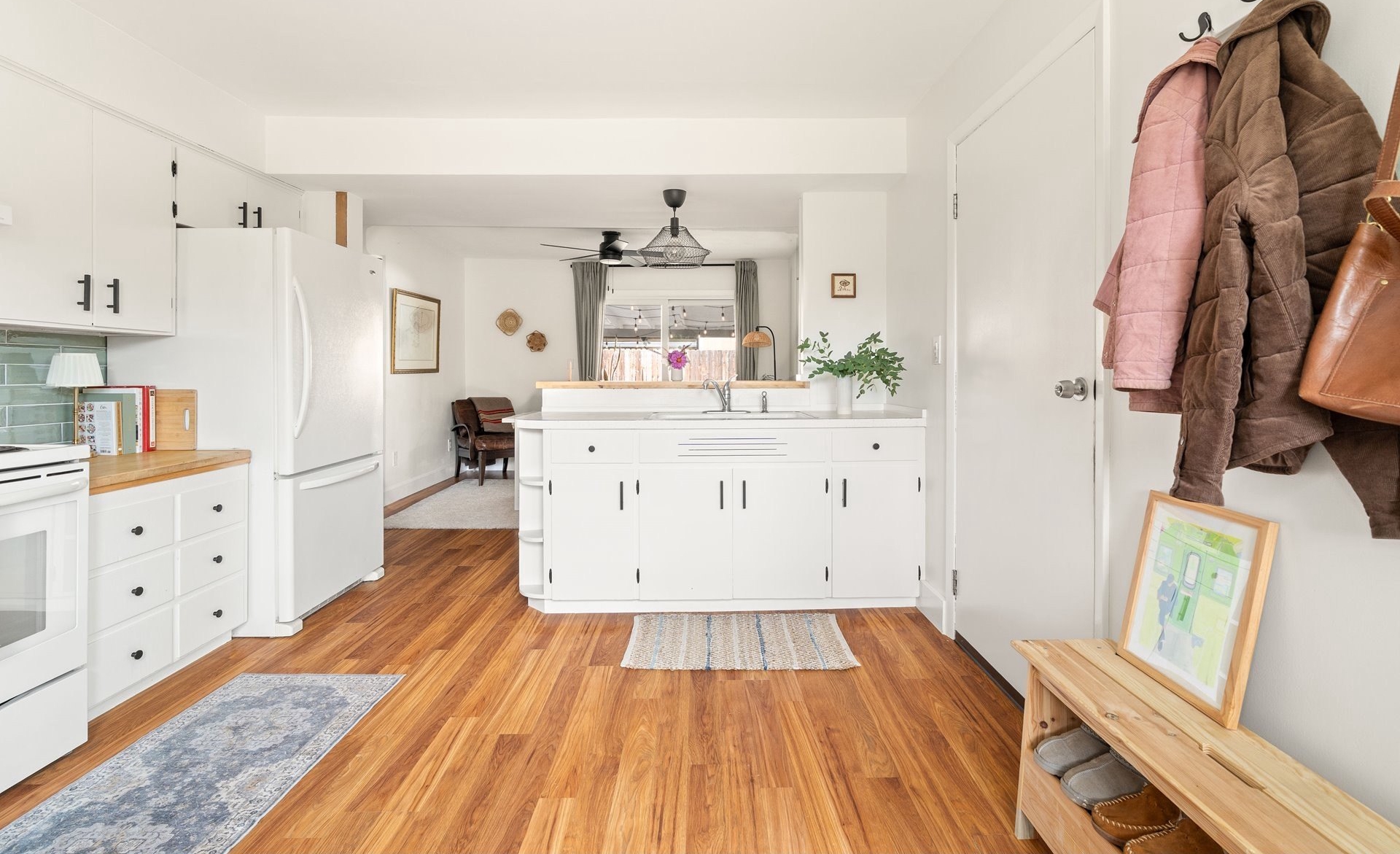 Mid-century roots meet modern living at this refreshed 1950s Mill Park home. Newly exposed brick fireplace, original hardwoods, and fresh paint set the stage for bright, flexible spaces. The kitchen is a cook’s dream with butcher block counters, new tile backsplash, updated cabinets, and plenty of room for chef + sous to work side by side. Sliding doors off the dining room frame backyard views, while the cozy living room centers around the original brick fireplace with twin sidelight windows. A full bath with retro tile and generous storage plus a peaceful main-level bedroom offer easy guest or primary options. Upstairs, two bedrooms and a half bath create space for home office, studio, or the primary suite of your dreams. A bonus 219 sq ft of storage space over the garage is clean and easily accessible. Oversized 2-car garage with shop space and massive driveway offer space for RVs/campers/boats, and all your gear!. Out back, unwind under a covered patio, grow veggies in the garden and greenhouse, and find a place for everything in the shed and fully fenced spaces. Recent updates include refreshed kitchen (2022), new electrical panel (2025), interior paint (2023), updated plumbing and water line (2007), furnace + oil tank decom (2015), and roof (2014). Close to many hidden gems of east Portland, like the newly-renovated Parklane Park, several food truck pods, and Powell Butte, with easy access to Montavilla, Tabor, 205, and the airport. [Home Energy Score = 3. HES Report at https://rpt.greenbuildingregistry.com/hes/OR10198311]
