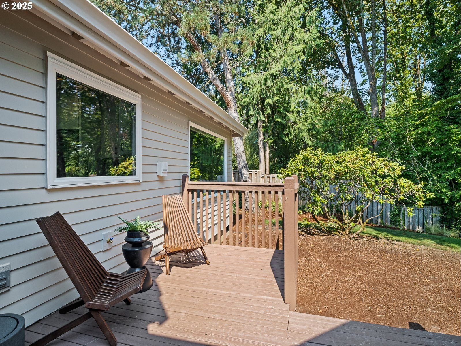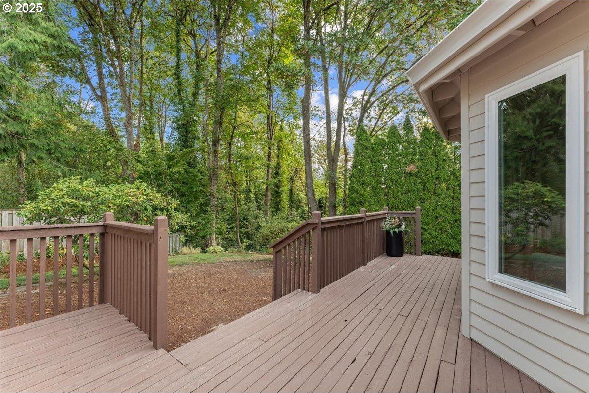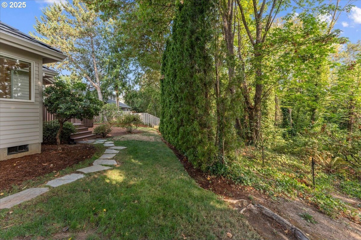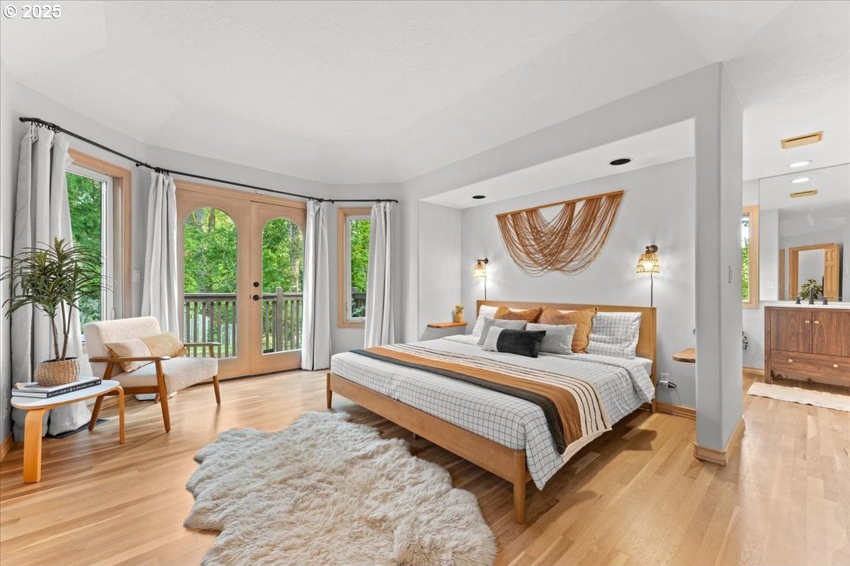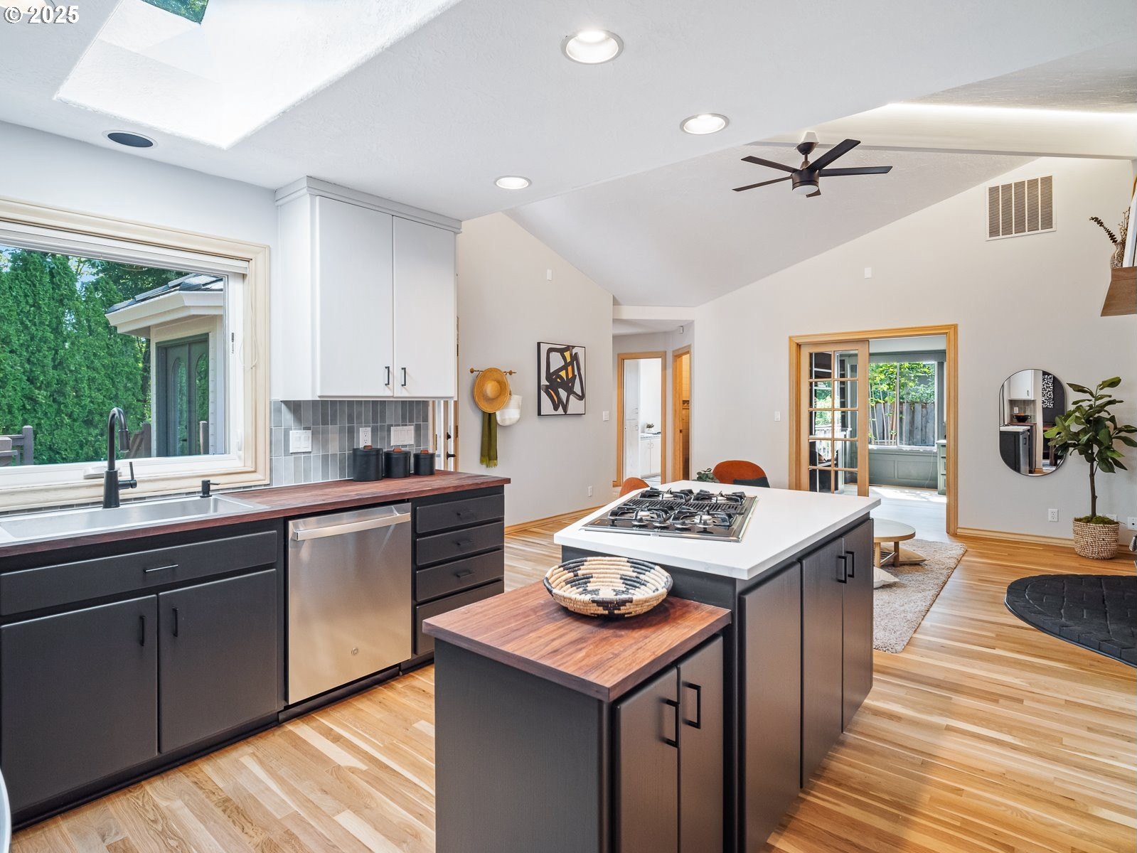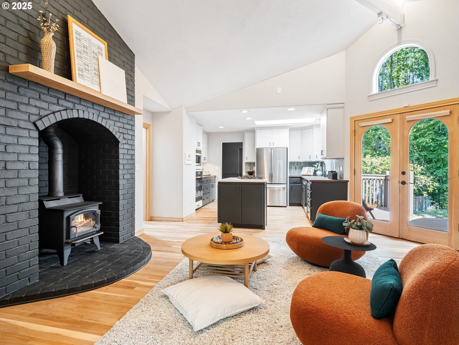 Nestled on a quiet loop, backing to lush greenspace, this is your forever home! One-level living with a designer's touch! Every surface of this home has been lovingly updated with exquisite taste and care. The architectural angles, the reclaimed white oak floors, the seamless floorplan, the abundance of natural light flowing through the new triple pane windows and many skylights, create an ambiance like no other! Entering through the front door welcomes you into a foyer, leading to the living room with captivating vaulted ceilings and picture window, the living room flows into the formal dining area where you will find the most picturesque view of forested greenspace that wraps the backyard. The perfect backdrop for dining! The kitchen is not only perfect for cooking, but beautiful to look at with custom black walnut countertops and a quartz topped island with cooktop. The stainless-steel refrigerator, built in oven and microwave are brand new. The custom tile backsplash, the refreshed cabinetry and generous storage also make this kitchen quite pleasant and functional, and if you must do dishes you might as well have a nice view of the backyard! Off of the kitchen you will find a warm and inviting sitting area for ultimate relaxation with French doors leading to the deck and a certified woodstove for coziness. If you linger down the hallway into the primary bedroom, you will immediately feel as if you are in your own private, serene oasis, the primary has another set of French doors leading to the deck, a walk-in closet, the perfect ensuite with black walnut double vanity, and a soaking tub with a view of the forested greenspace. Two additional large sized bedrooms offer plenty of space for everyone, one bedroom is currently being used as an office with premium built-ins, and can easily be returned to use as a bedroom. The three-car garage offers plenty of storage or studio space. Located in a well loved quiet community on a large lot with access to all amenities.