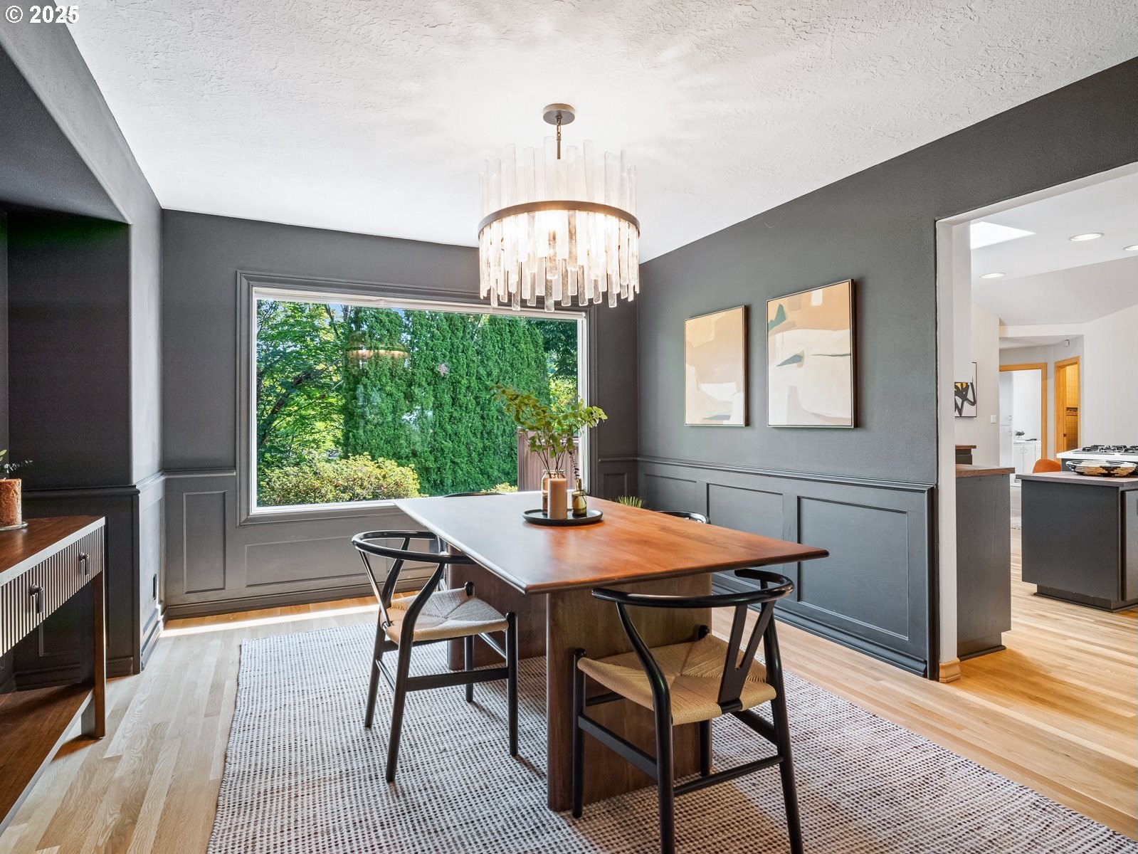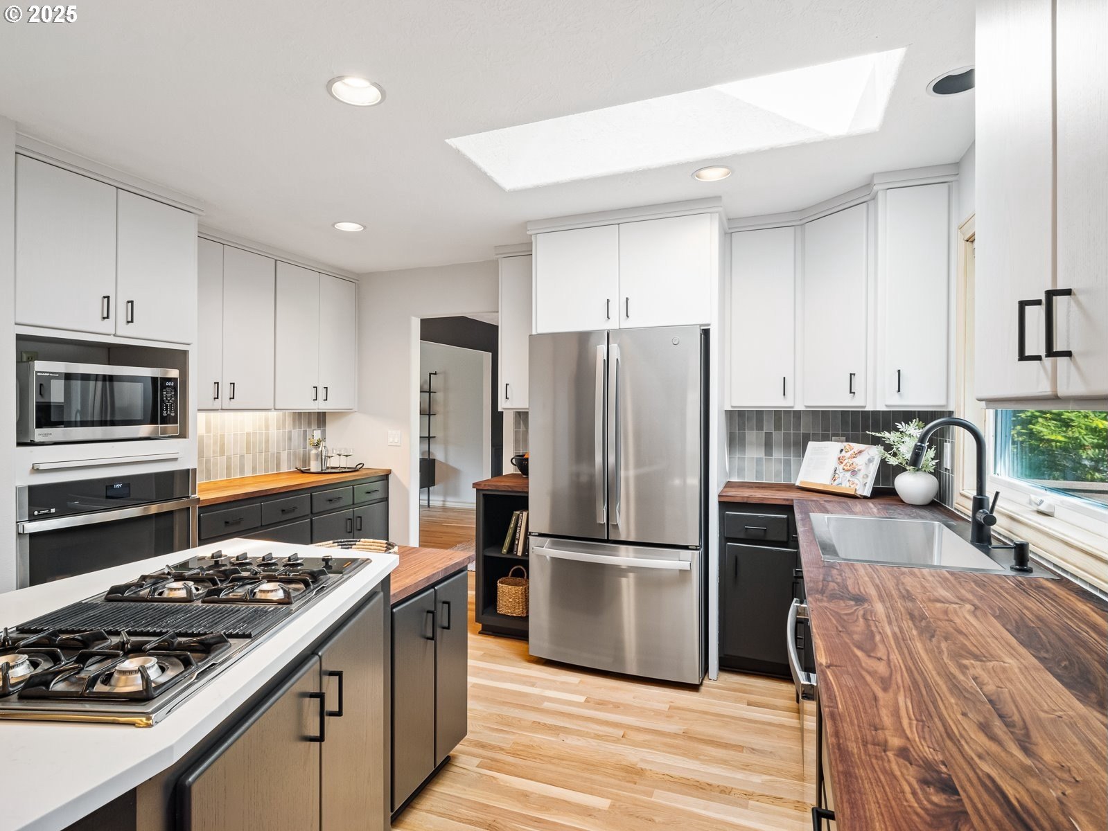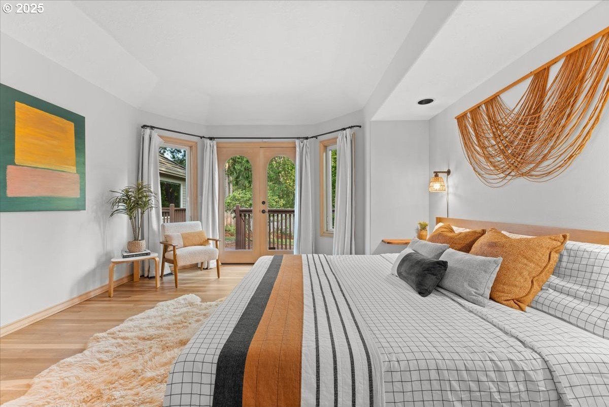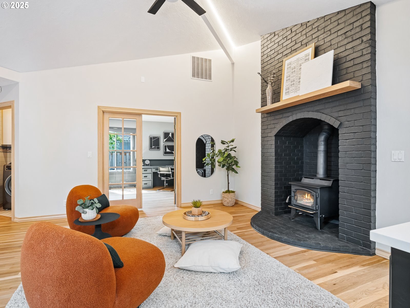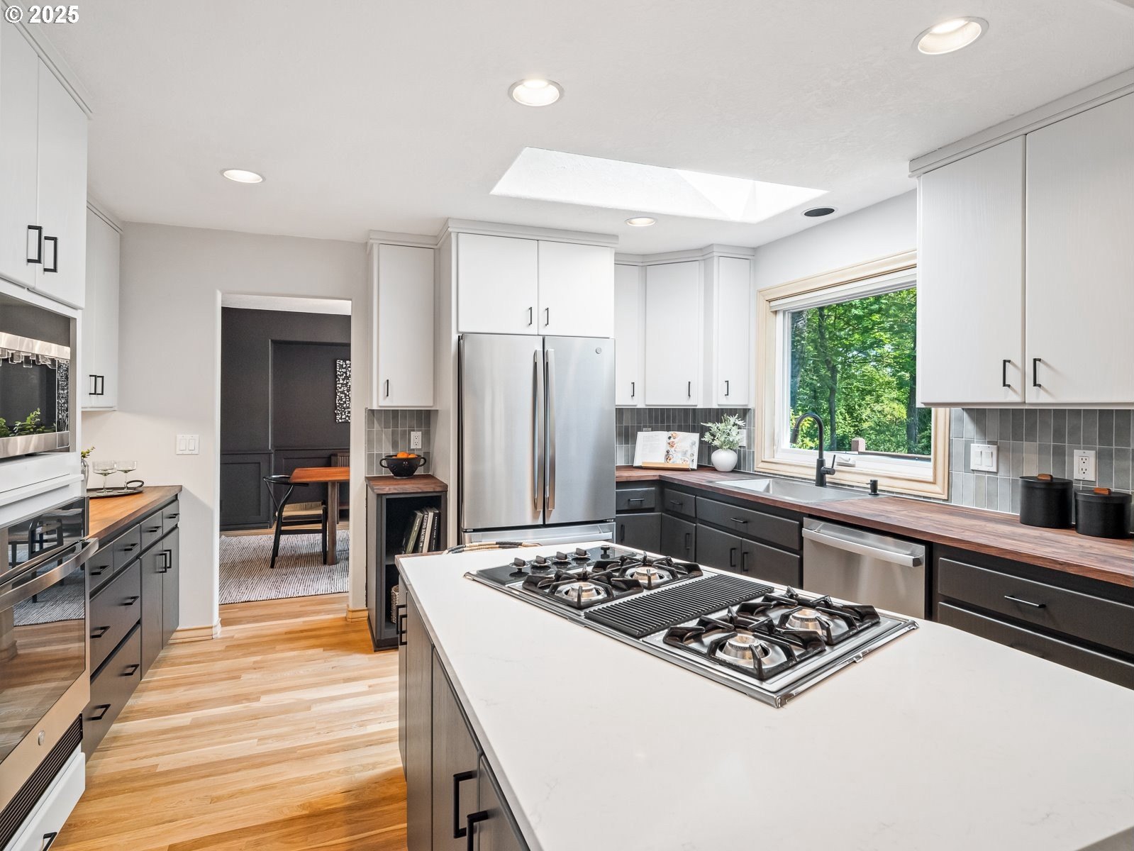 Nestled on a quiet loop, backing to lush greenspace, this is your forever home! One-level living with a designer's touch! Every surface of this home has been lovingly updated with exquisite taste and care. The architectural angles, the reclaimed white oak floors, the seamless floorplan, the abundance of natural light flowing through the new triple pane windows and many skylights, create an ambiance like no other! Entering through the front door welcomes you into a foyer, leading to the living room with captivating vaulted ceilings and picture window, the living room flows into the formal dining area where you will find the most picturesque view of forested greenspace that wraps the backyard. The perfect backdrop for dining! The kitchen is not only perfect for cooking, but beautiful to look at with custom black walnut countertops and a quartz topped island with cooktop. The stainless-steel refrigerator, built in oven and microwave are brand new. The custom tile backsplash, the refreshed cabinetry and generous storage also make this kitchen quite pleasant and functional, and if you must do dishes you might as well have a nice view of the backyard! Off of the kitchen you will find a warm and inviting sitting area for ultimate relaxation with French doors leading to the deck and a certified woodstove for coziness. If you linger down the hallway into the primary bedroom, you will immediately feel as if you are in your own private, serene oasis, the primary has another set of French doors leading to the deck, a walk-in closet, the perfect ensuite with black walnut double vanity, and a soaking tub with a view of the forested greenspace. Two additional large sized bedrooms offer plenty of space for everyone, one bedroom is currently being used as an office with premium built-ins, and can easily be returned to use as a bedroom. The three-car garage offers plenty of storage or studio space. Located in a well loved quiet community on a large lot with access to all amenities.