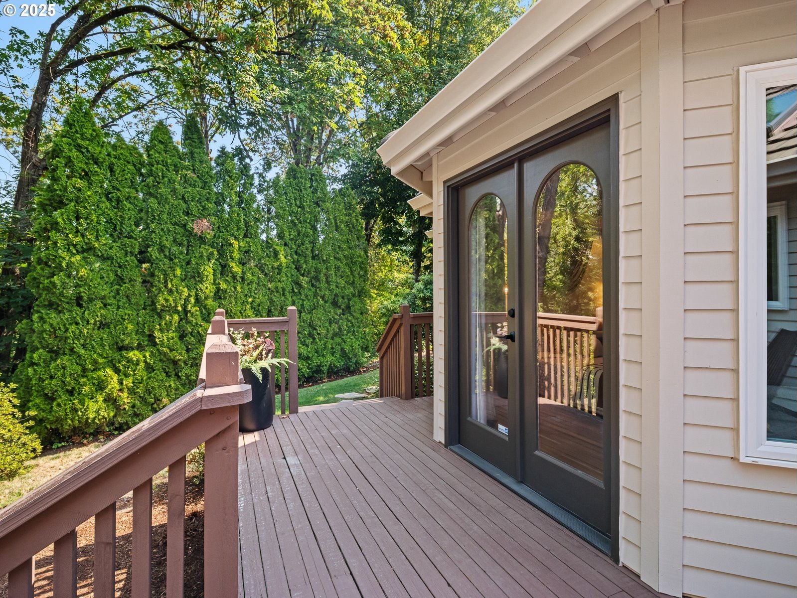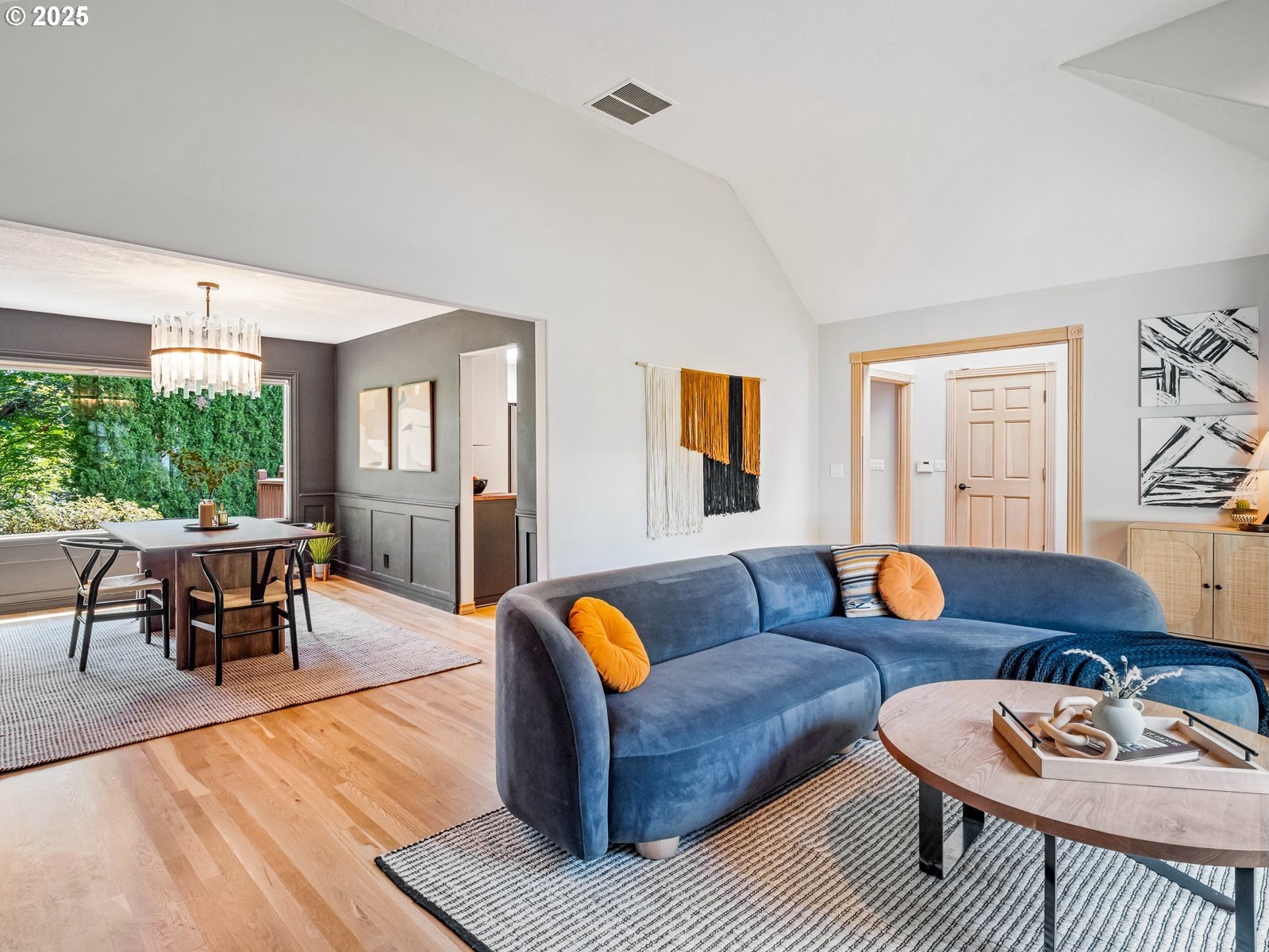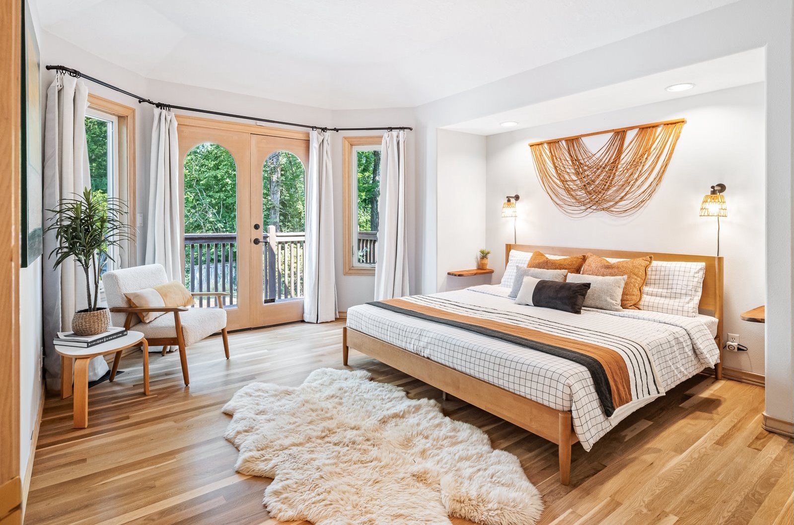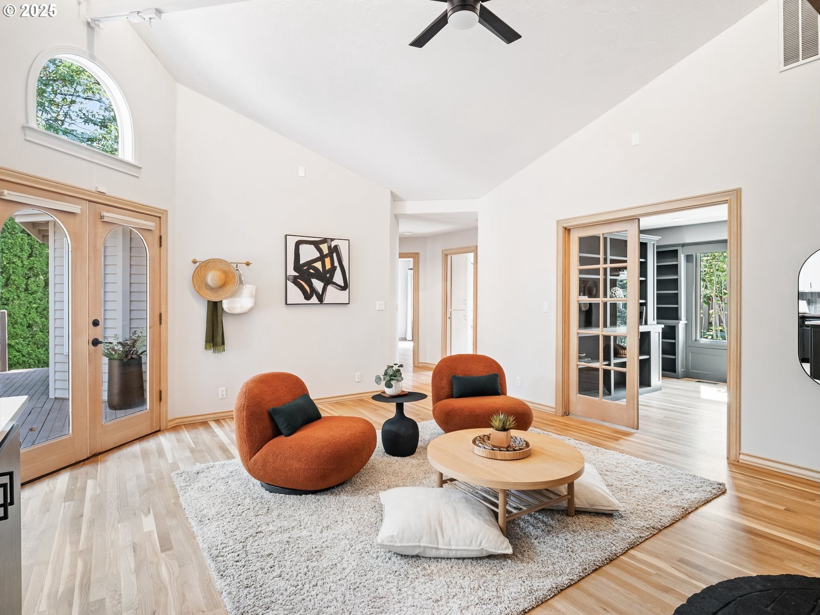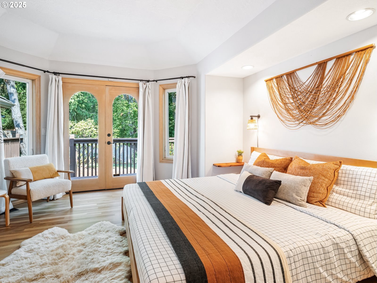 Nestled on a quiet loop, backing to lush greenspace, this is your forever home! One-level living with a designer's touch! Every surface of this home has been lovingly updated with exquisite taste and care. The architectural angles, the reclaimed white oak floors, the seamless floorplan, the abundance of natural light flowing through the new triple pane windows and many skylights, create an ambiance like no other! Entering through the front door welcomes you into a foyer, leading to the living room with captivating vaulted ceilings and picture window, the living room flows into the formal dining area where you will find the most picturesque view of forested greenspace that wraps the backyard. The perfect backdrop for dining! The kitchen is not only perfect for cooking, but beautiful to look at with custom black walnut countertops and a quartz topped island with cooktop. The stainless-steel refrigerator, built in oven and microwave are brand new. The custom tile backsplash, the refreshed cabinetry and generous storage also make this kitchen quite pleasant and functional, and if you must do dishes you might as well have a nice view of the backyard! Off of the kitchen you will find a warm and inviting sitting area for ultimate relaxation with French doors leading to the deck and a certified woodstove for coziness. If you linger down the hallway into the primary bedroom, you will immediately feel as if you are in your own private, serene oasis, the primary has another set of French doors leading to the deck, a walk-in closet, the perfect ensuite with black walnut double vanity, and a soaking tub with a view of the forested greenspace. Two additional large sized bedrooms offer plenty of space for everyone, one bedroom is currently being used as an office with premium built-ins, and can easily be returned to use as a bedroom. The three-car garage offers plenty of storage or studio space. Located in a well loved quiet community on a large lot with access to all amenities.