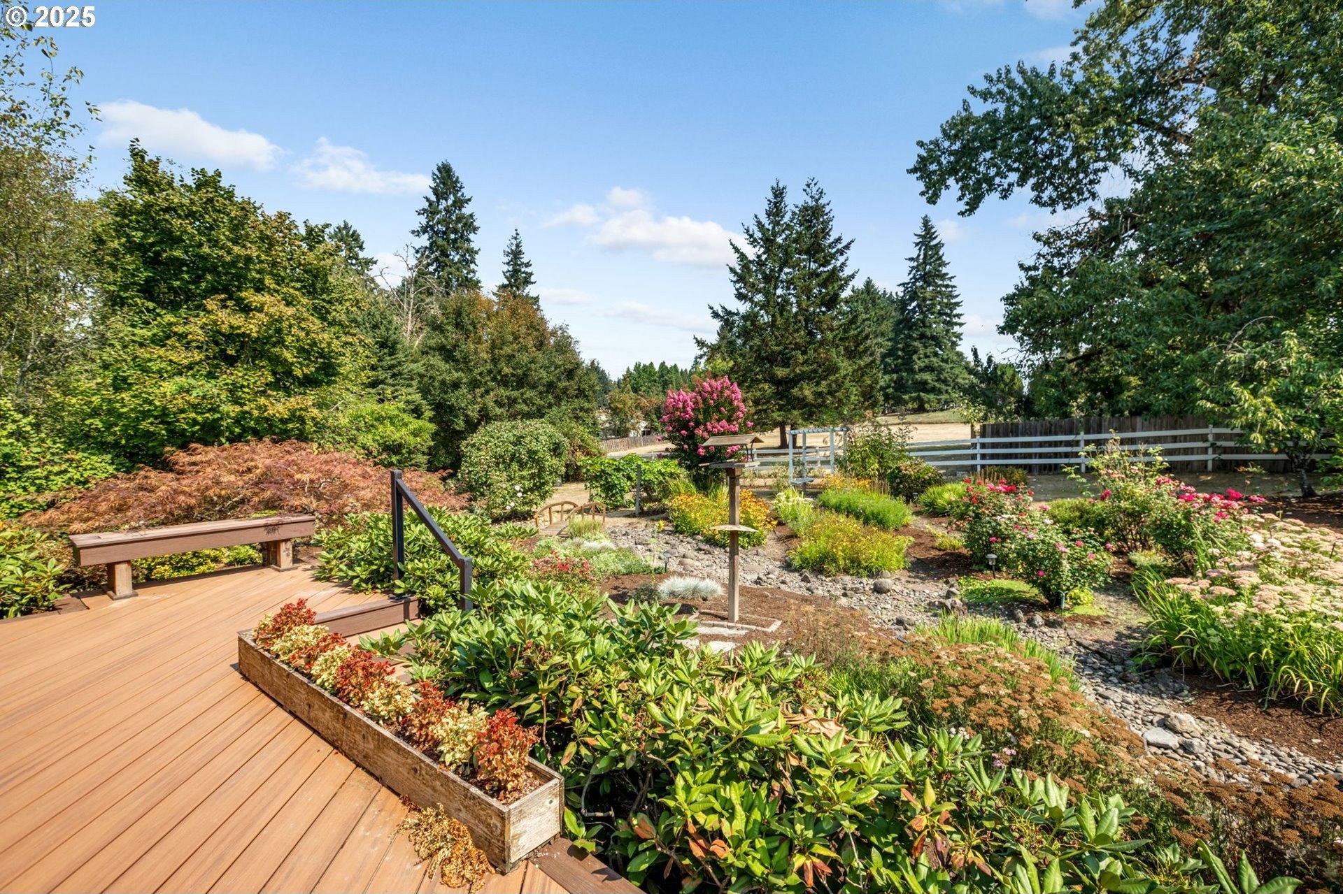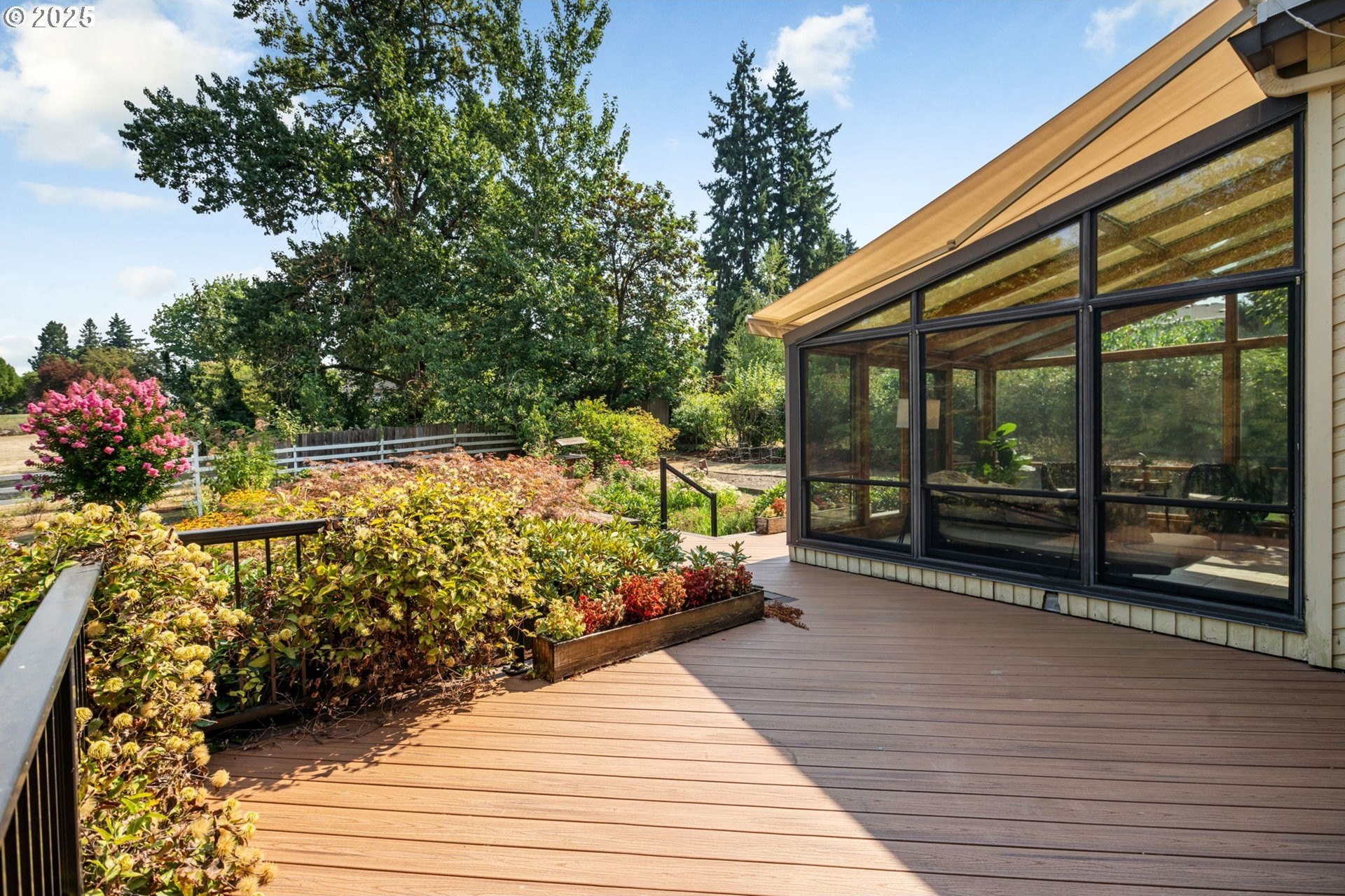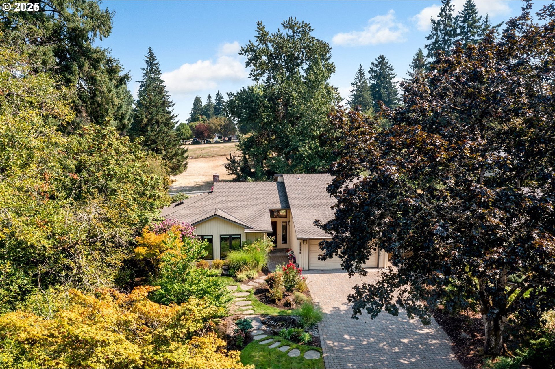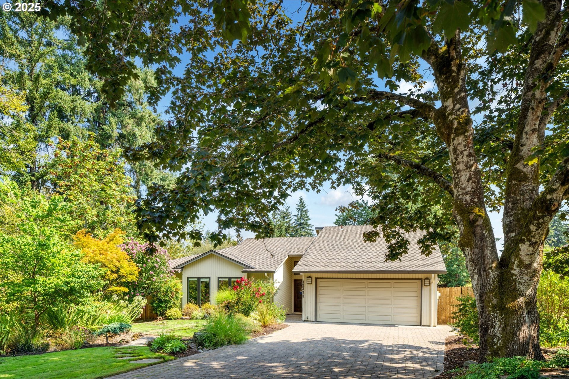 Nestled on a serene .39-acre lot in Tigard, this beautifully maintained one-level home offers 3 bedrooms, 2 bathrooms, and a thoughtful blend of comfort and character. The remodeled kitchen features a cooktop island and eating nook, opening into the spacious great room with dining area, vaulted ceilings, and a cozy gas fireplace. A light-filled sunroom with walls of windows invites year-round enjoyment, while the expansive deck overlooks lush gardens, fruit trees, and peaceful territorial views. The primary suite impresses with vaulted, beamed ceilings and direct access to the outdoors. Additional highlights include solar panels, a presidential roof, and a charming cobblestone driveway. Backing to a greenbelt for privacy, this home combines natural beauty with everyday convenience. An exceptional retreat right in the heart of Tigard.