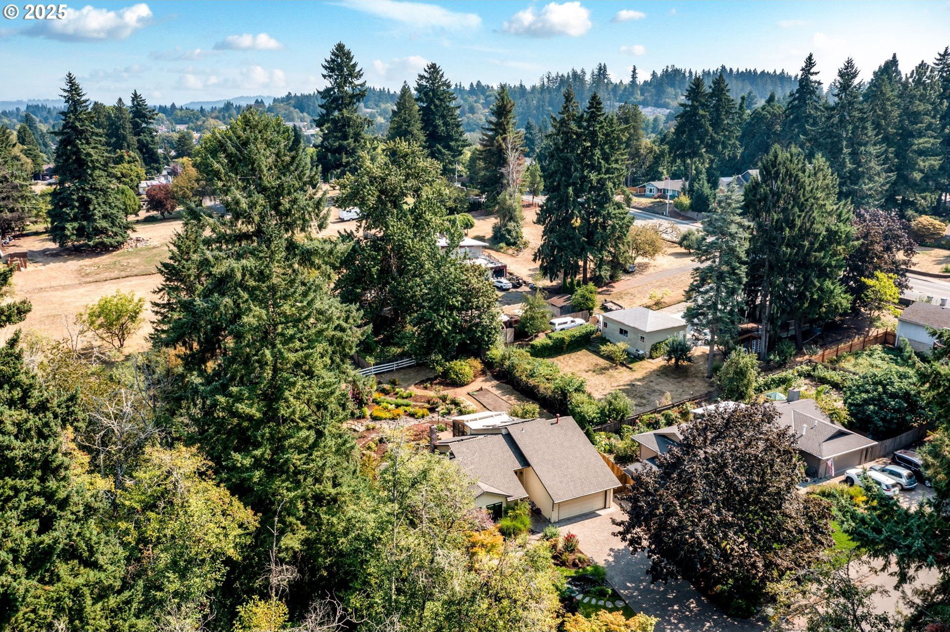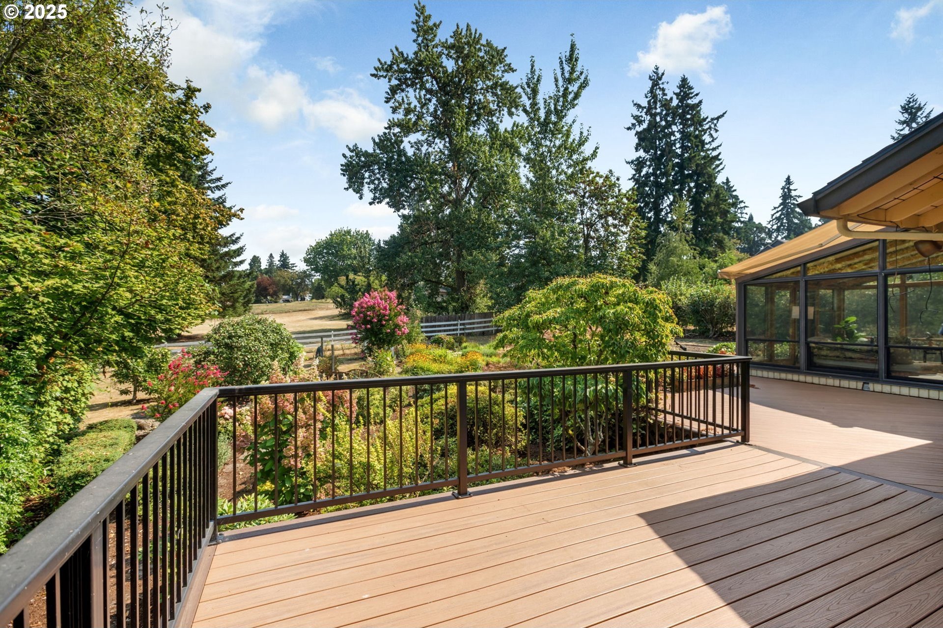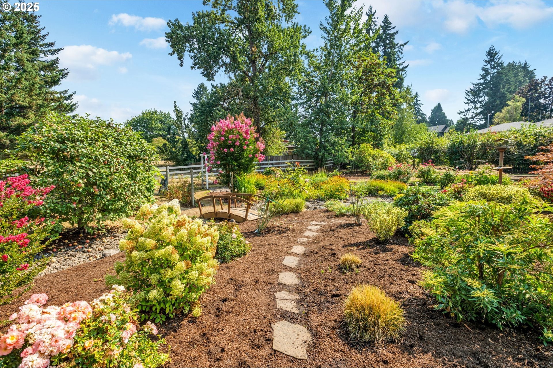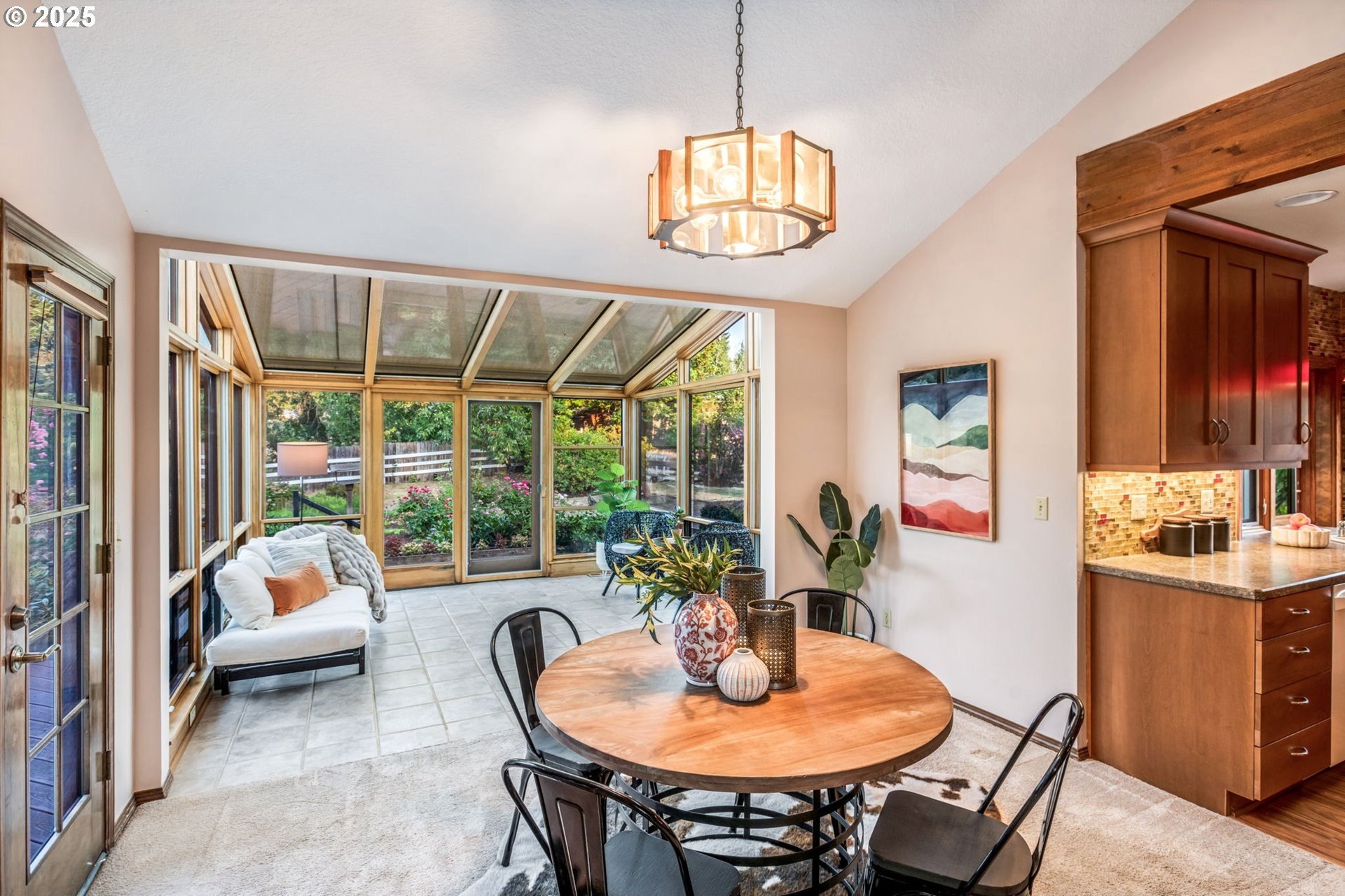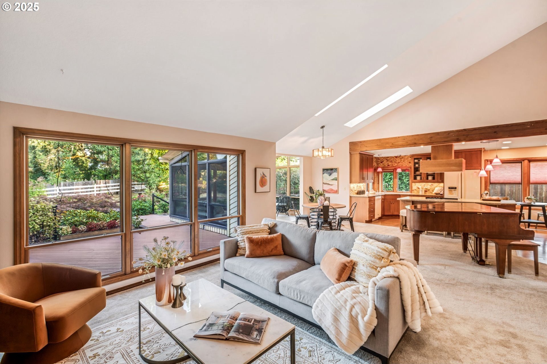 Nestled on a serene .39-acre lot in Tigard, this beautifully maintained one-level home offers 3 bedrooms, 2 bathrooms, and a thoughtful blend of comfort and character. The remodeled kitchen features a cooktop island and eating nook, opening into the spacious great room with dining area, vaulted ceilings, and a cozy gas fireplace. A light-filled sunroom with walls of windows invites year-round enjoyment, while the expansive deck overlooks lush gardens, fruit trees, and peaceful territorial views. The primary suite impresses with vaulted, beamed ceilings and direct access to the outdoors. Additional highlights include solar panels, a presidential roof, and a charming cobblestone driveway. Backing to a greenbelt for privacy, this home combines natural beauty with everyday convenience. An exceptional retreat right in the heart of Tigard.