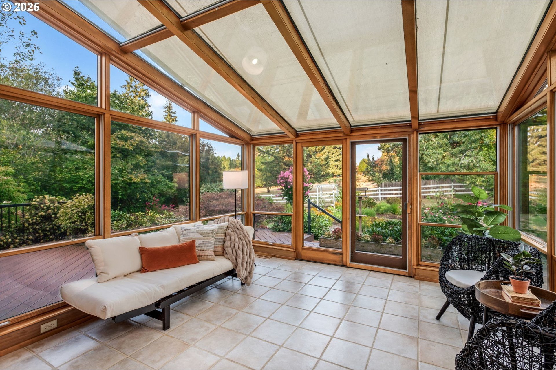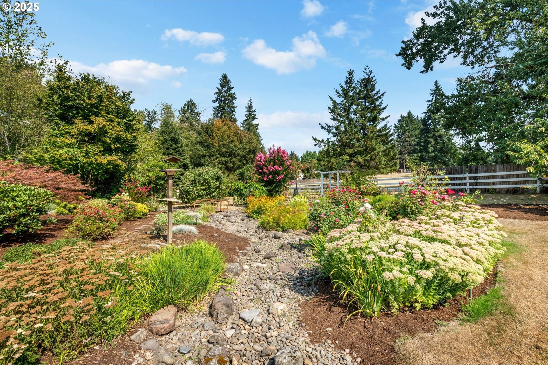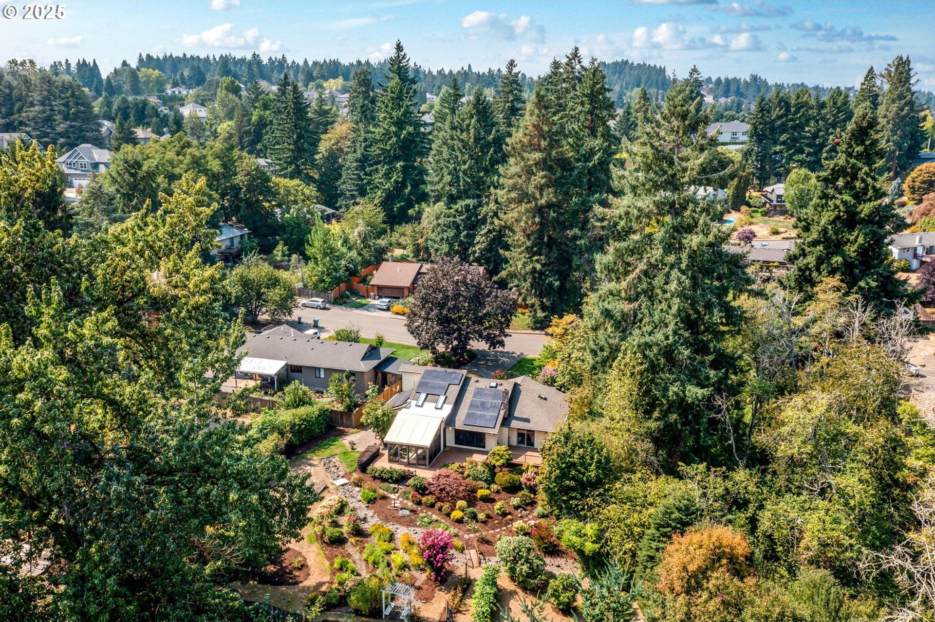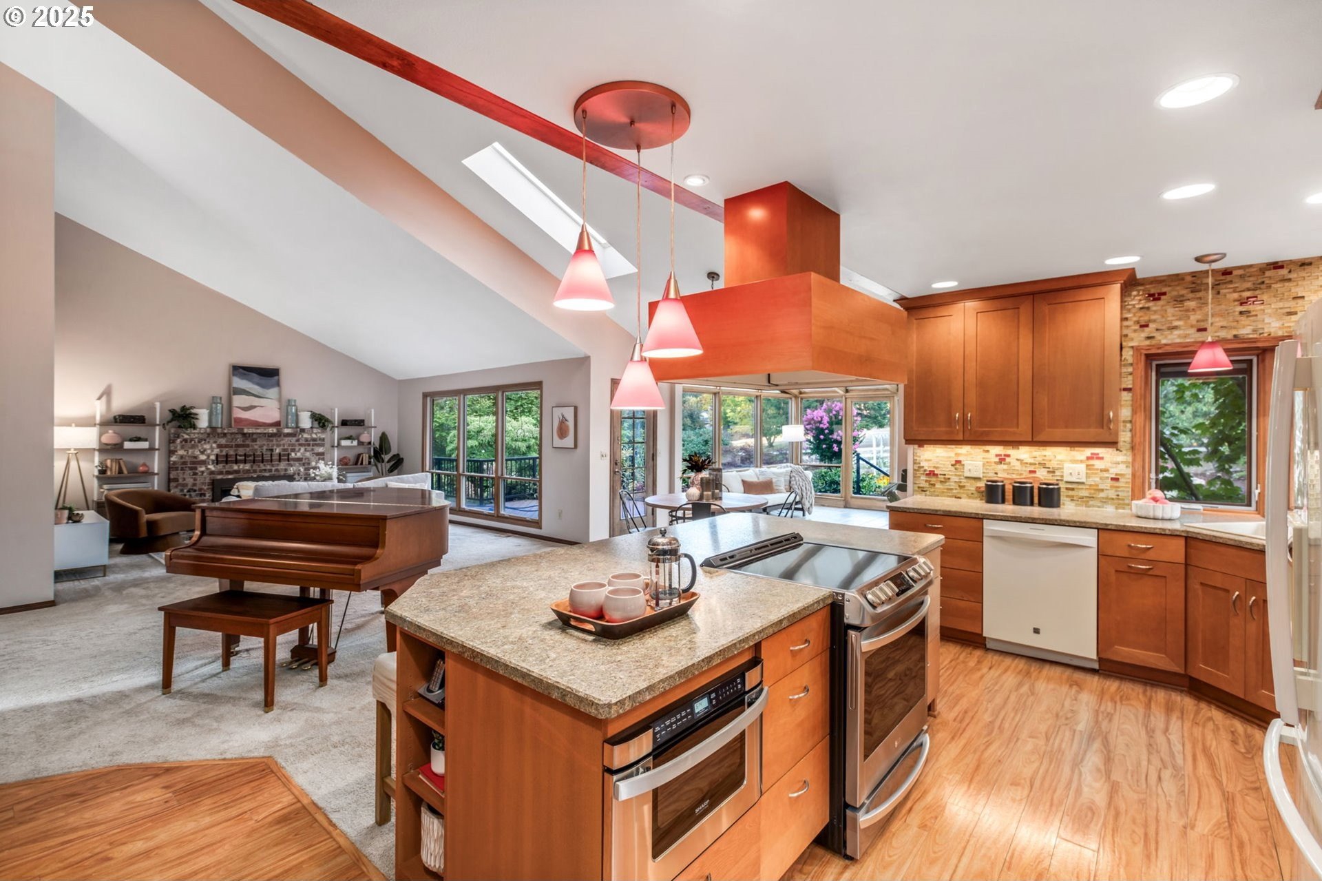 Nestled on a serene .39-acre lot in Tigard, this beautifully maintained one-level home offers 3 bedrooms, 2 bathrooms, and a thoughtful blend of comfort and character. The remodeled kitchen features a cooktop island and eating nook, opening into the spacious great room with dining area, vaulted ceilings, and a cozy gas fireplace. A light-filled sunroom with walls of windows invites year-round enjoyment, while the expansive deck overlooks lush gardens, fruit trees, and peaceful territorial views. The primary suite impresses with vaulted, beamed ceilings and direct access to the outdoors. Additional highlights include solar panels, a presidential roof, and a charming cobblestone driveway. Backing to a greenbelt for privacy, this home combines natural beauty with everyday convenience. An exceptional retreat right in the heart of Tigard.