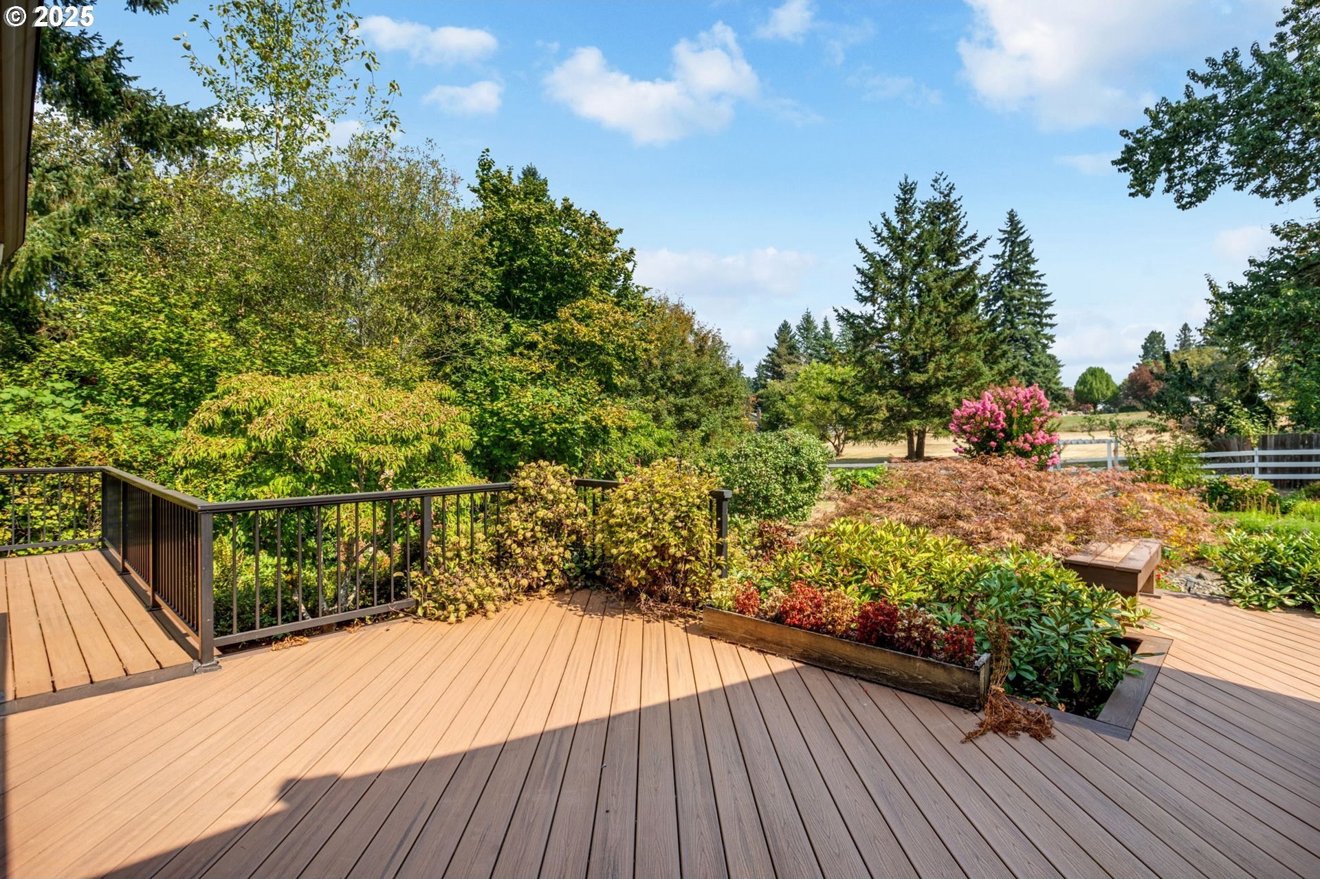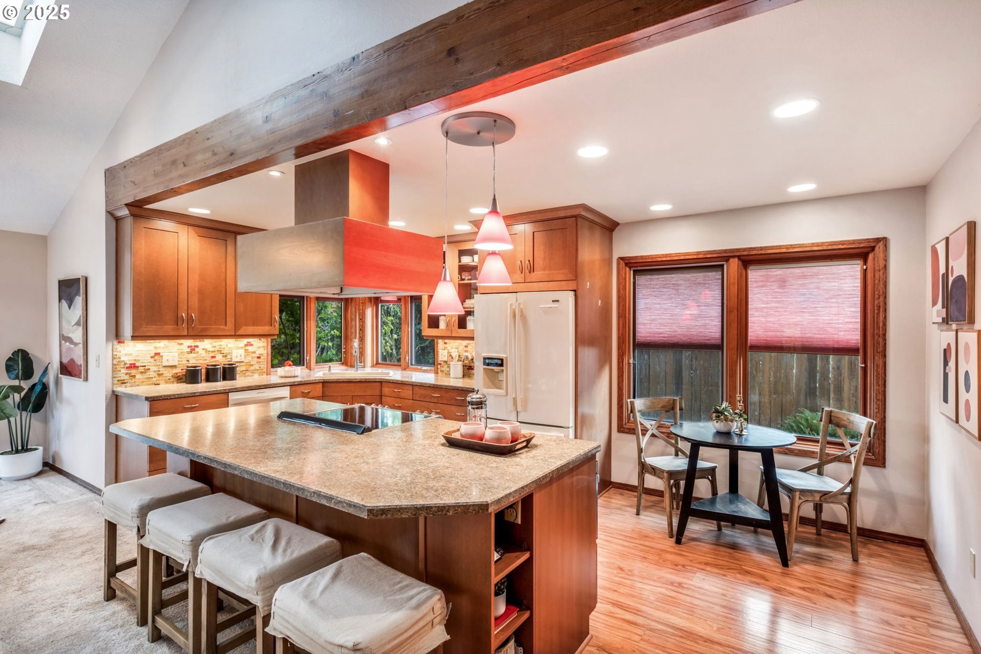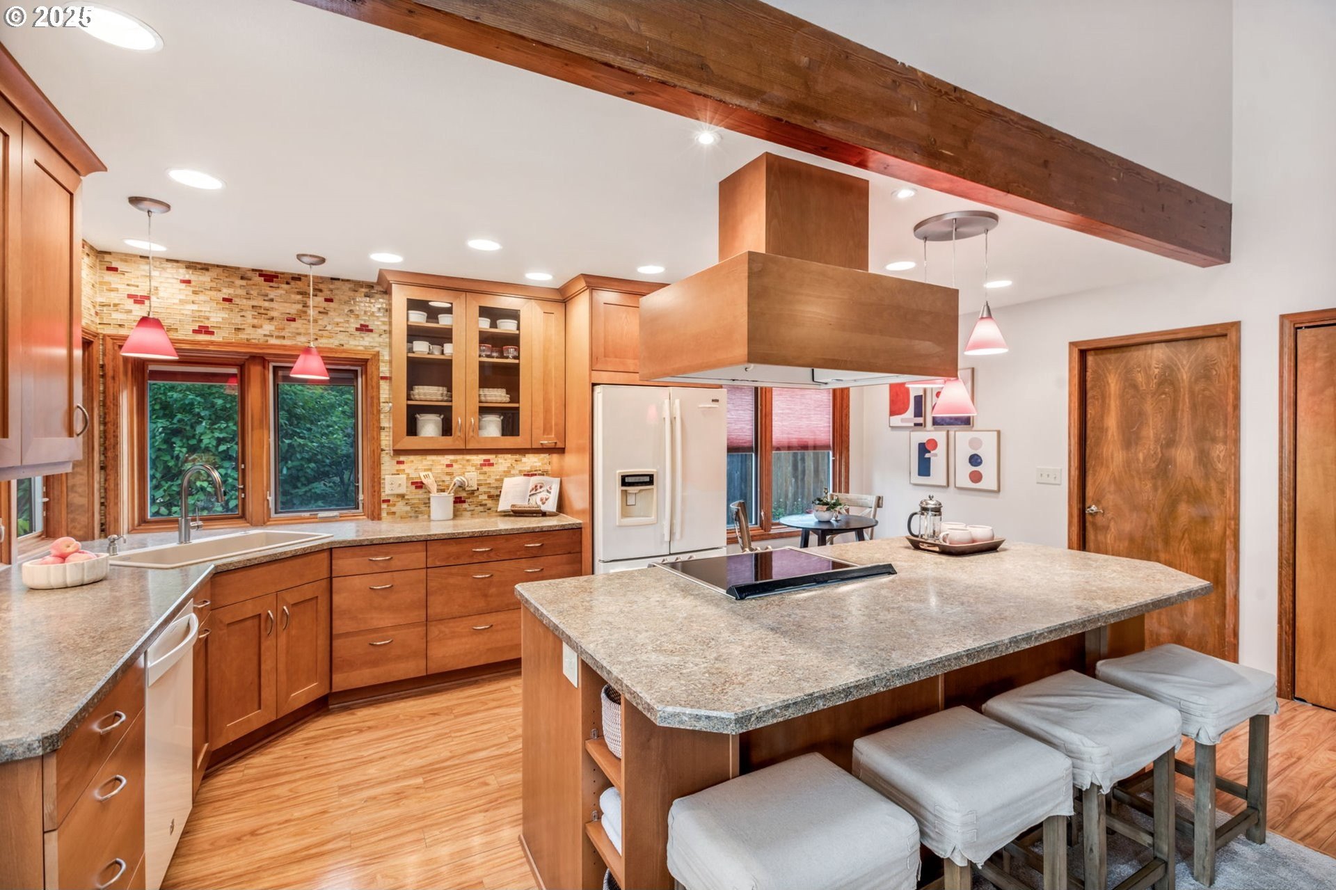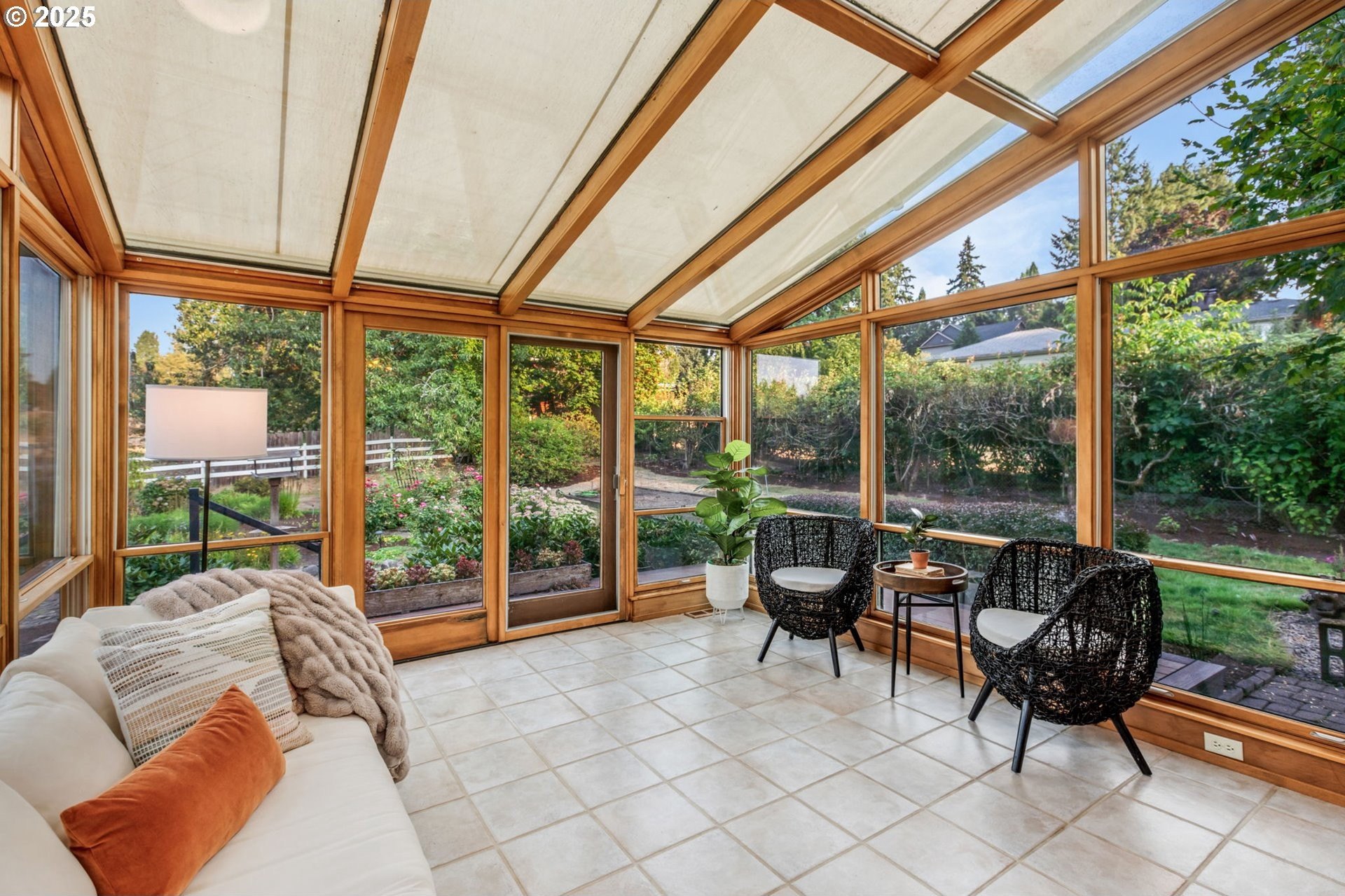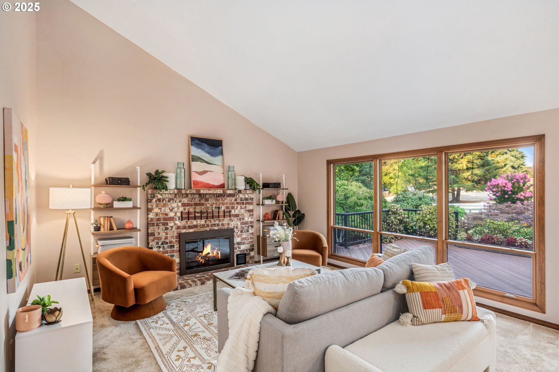 Nestled on a serene .39-acre lot in Tigard, this beautifully maintained one-level home offers 3 bedrooms, 2 bathrooms, and a thoughtful blend of comfort and character. The remodeled kitchen features a cooktop island and eating nook, opening into the spacious great room with dining area, vaulted ceilings, and a cozy gas fireplace. A light-filled sunroom with walls of windows invites year-round enjoyment, while the expansive deck overlooks lush gardens, fruit trees, and peaceful territorial views. The primary suite impresses with vaulted, beamed ceilings and direct access to the outdoors. Additional highlights include solar panels, a presidential roof, and a charming cobblestone driveway. Backing to a greenbelt for privacy, this home combines natural beauty with everyday convenience. An exceptional retreat right in the heart of Tigard.