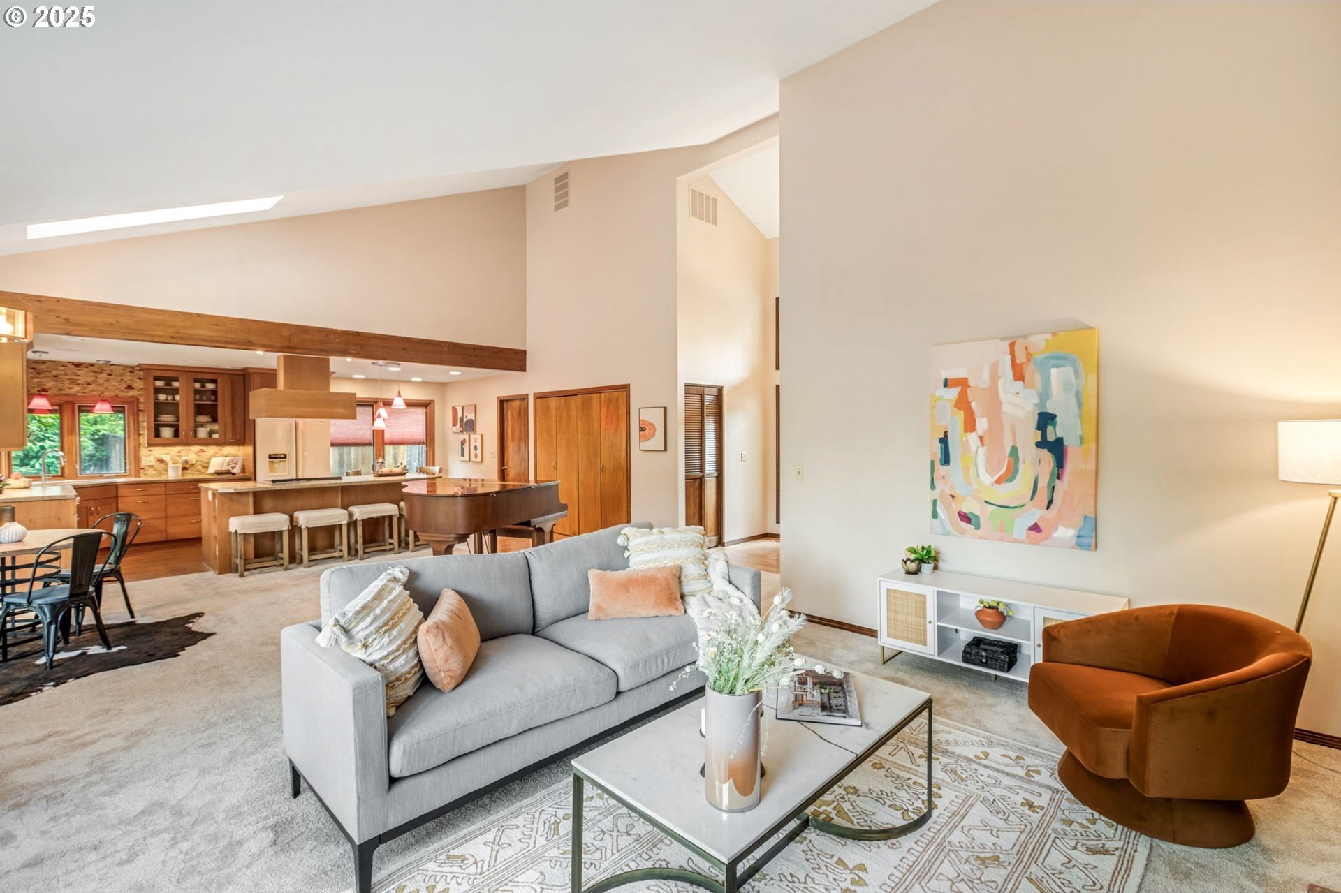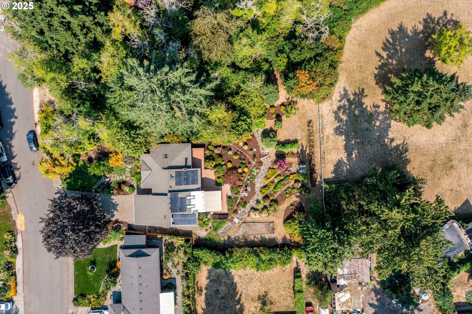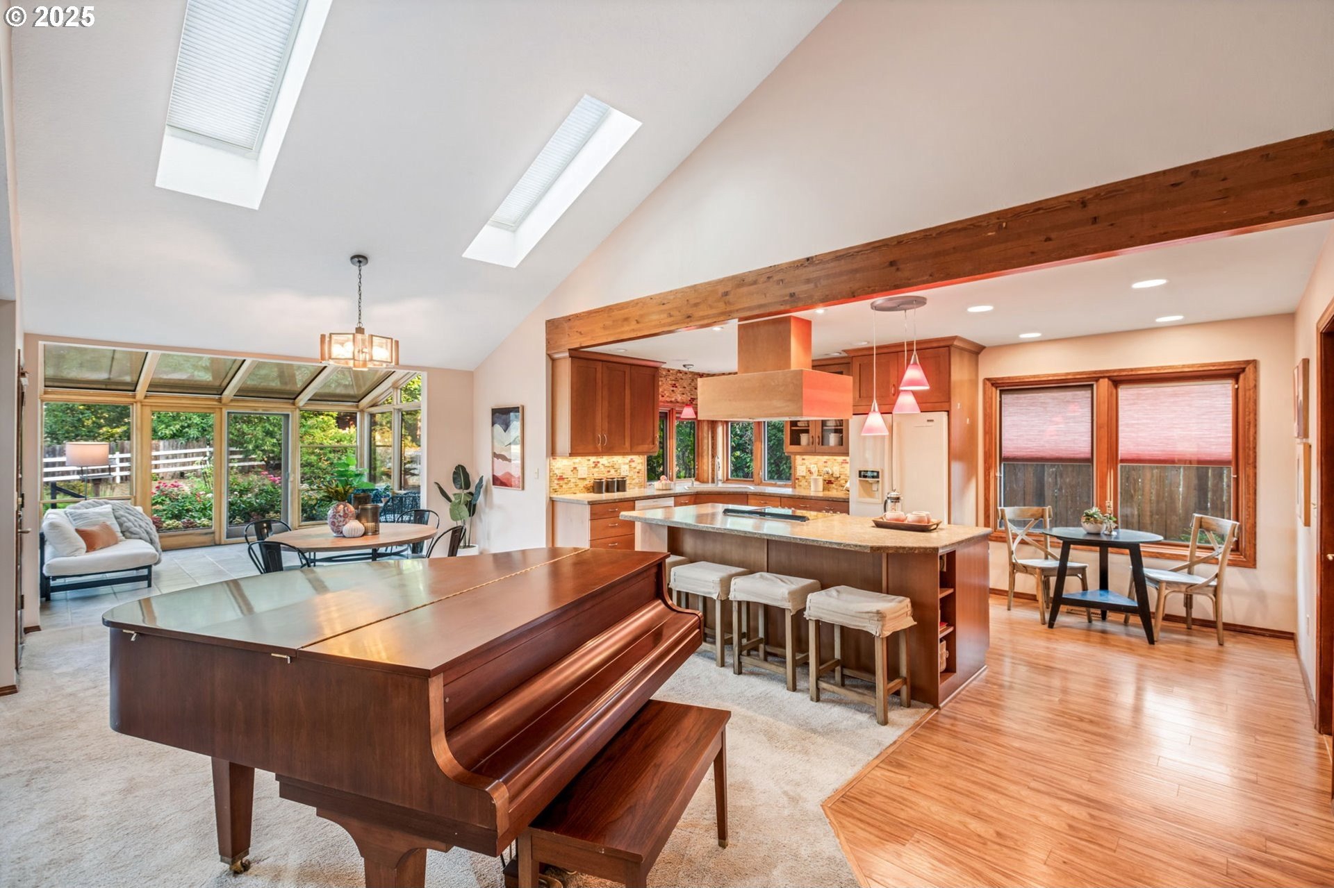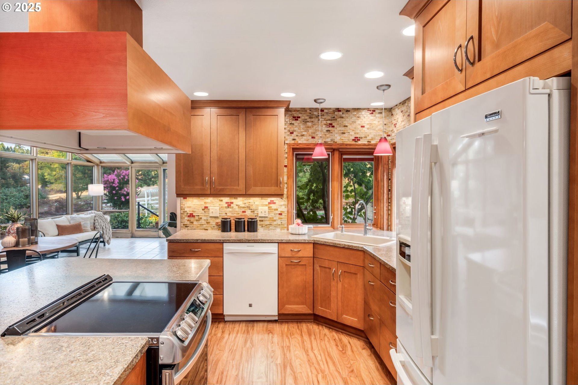Nestled on a serene .39-acre lot in Tigard, this beautifully maintained one-level home offers 3 bedrooms, 2 bathrooms, and a thoughtful blend of comfort and character. The remodeled kitchen features a cooktop island and eating nook, opening into the spacious great room with dining area, vaulted ceilings, and a cozy gas fireplace. A light-filled sunroom with walls of windows invites year-round enjoyment, while the expansive deck overlooks lush gardens, fruit trees, and peaceful territorial views. The primary suite impresses with vaulted, beamed ceilings and direct access to the outdoors. Additional highlights include solar panels, a presidential roof, and a charming cobblestone driveway. Backing to a greenbelt for privacy, this home combines natural beauty with everyday convenience. An exceptional retreat right in the heart of Tigard.