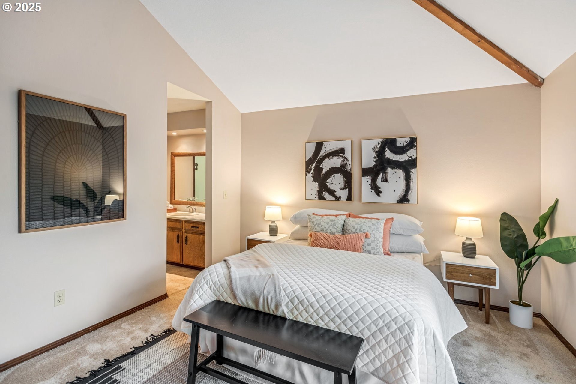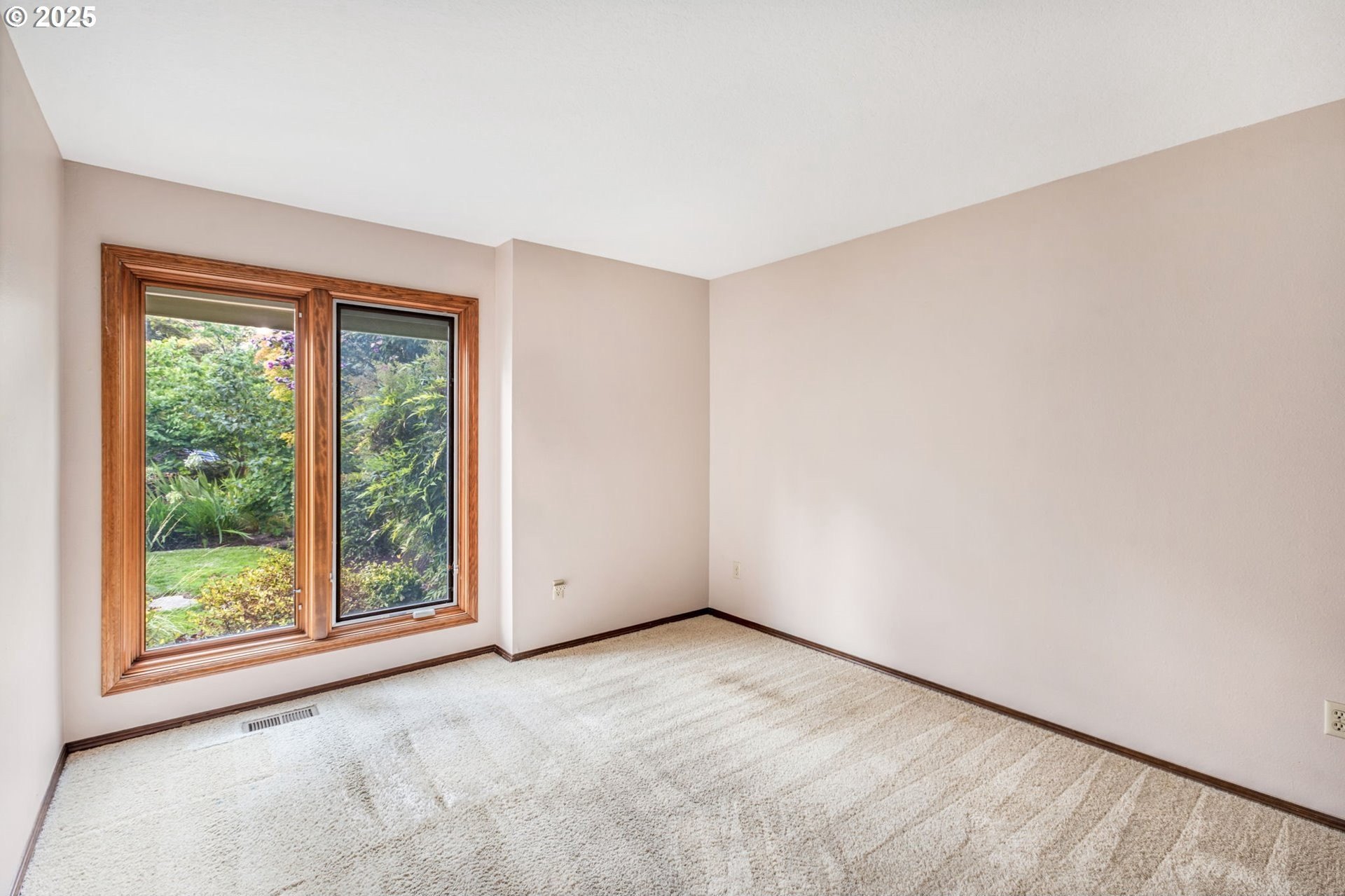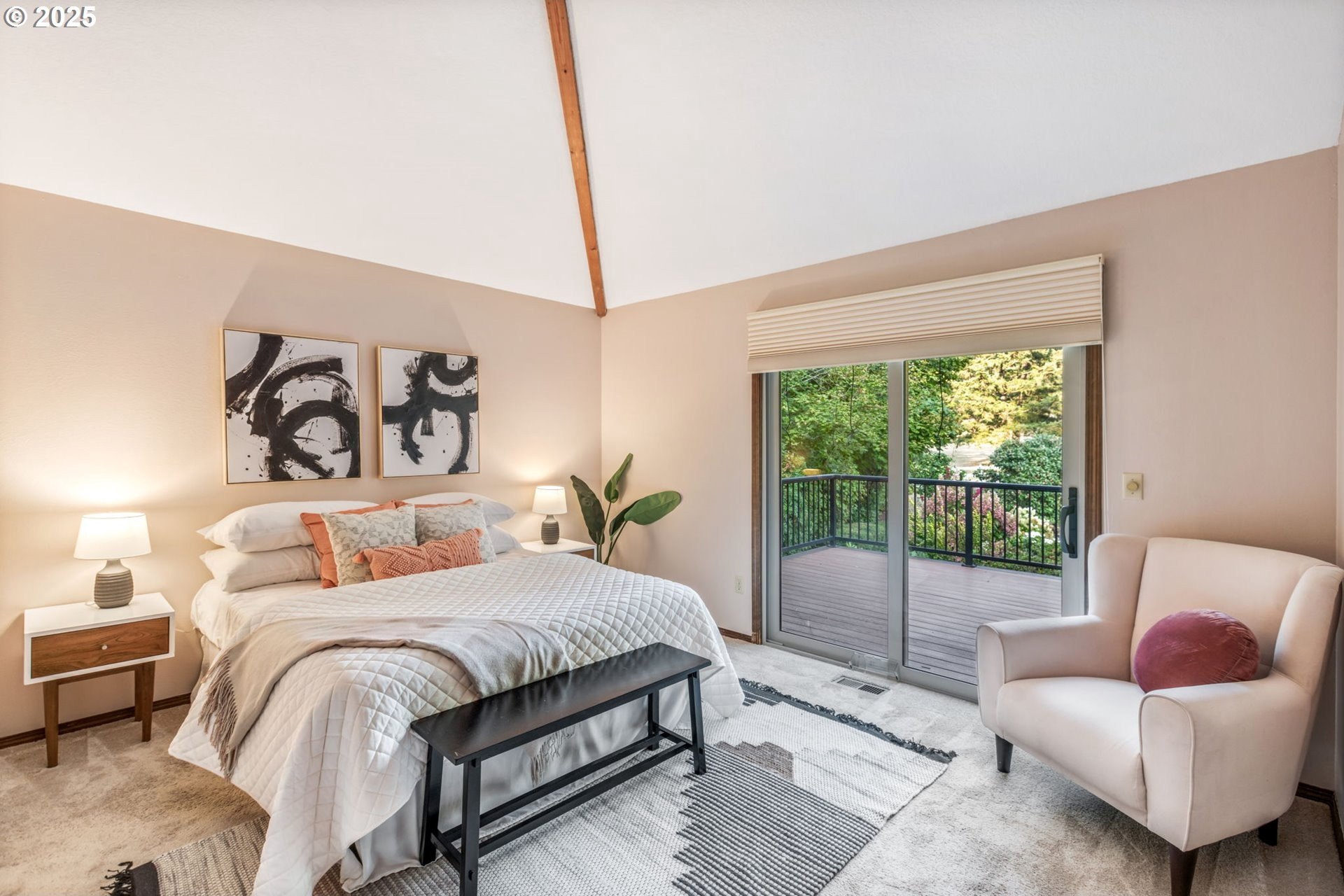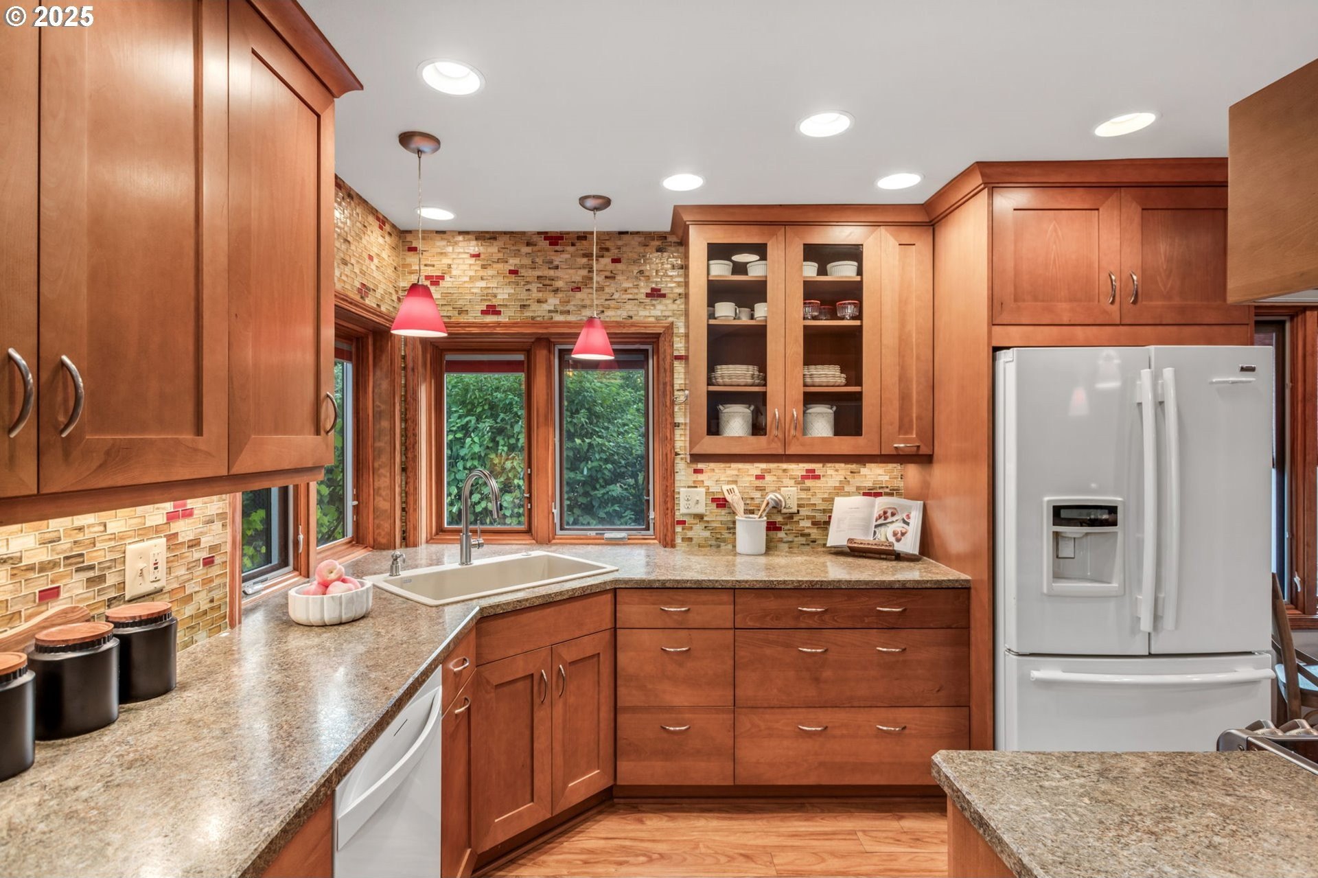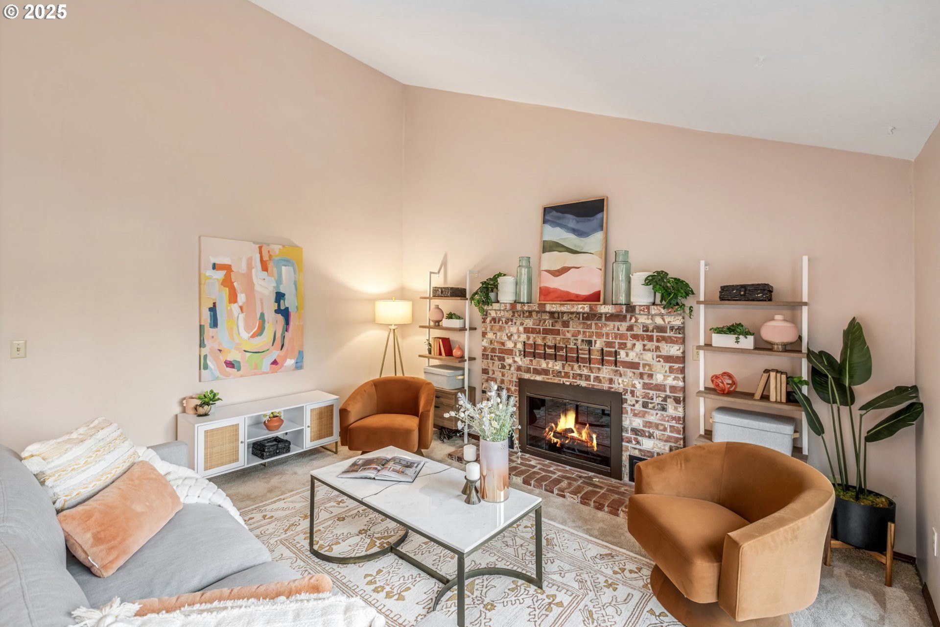 Nestled on a serene .39-acre lot in Tigard, this beautifully maintained one-level home offers 3 bedrooms, 2 bathrooms, and a thoughtful blend of comfort and character. The remodeled kitchen features a cooktop island and eating nook, opening into the spacious great room with dining area, vaulted ceilings, and a cozy gas fireplace. A light-filled sunroom with walls of windows invites year-round enjoyment, while the expansive deck overlooks lush gardens, fruit trees, and peaceful territorial views. The primary suite impresses with vaulted, beamed ceilings and direct access to the outdoors. Additional highlights include solar panels, a presidential roof, and a charming cobblestone driveway. Backing to a greenbelt for privacy, this home combines natural beauty with everyday convenience. An exceptional retreat right in the heart of Tigard.