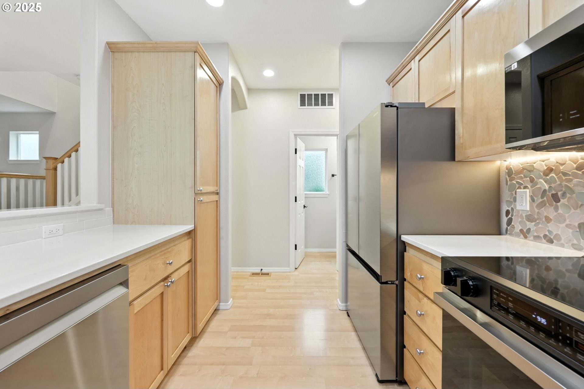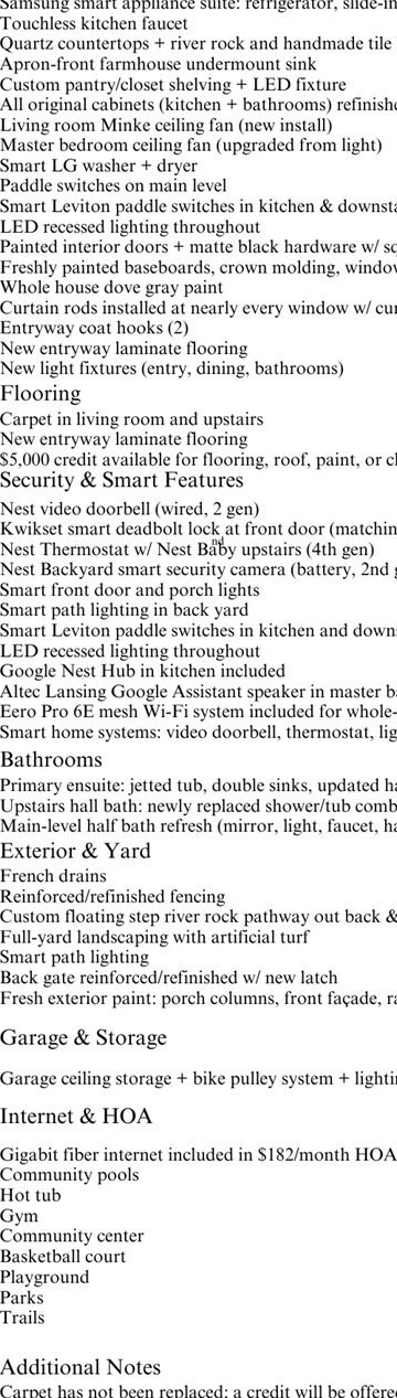 This home doesn’t just keep up with modern living – it’s ahead of it. Thoughtfully upgraded with $56,000 in upgrades and added value, it combines sleek style, high-end finishes, and a fully integrated smart home system designed for those who value innovation as much as comfort. Sellers have accounted for your finishing touches, providing a $5,000 credit for flooring, paint, roof, or closing costs—giving the next owner flexibility to update as they choose. The heart of the home is a smart-equipped kitchen featuring quartz countertops, a custom river rock backsplash with LED strip lights, and a farmhouse sink—paired with Samsung smart appliances including counter-depth refrigerator, slide-in electric range with air fry, microwave, and dishwasher. Custom pantry shelving maximizes storage, and refinished cabinets create a warm, cohesive flow within the home. Bathrooms have been refreshed: the primary ensuite includes double sinks, a jetted tub, high ceilings,and updated hardware; the upstairs hall bath has a new shower/tub combo; and the mainlevel half bath includes updated hardware and a new faucet. Technology sets this home apart with smart kitchen appliances, smart washer & dryer, Leviton paddle switches, smart thermostat, LED recessed lighting, and full Google Home integration with a Nest Hub included. Security and convenience are enhanced with a Nest video doorbell, backyard Nest camera, customizable smart outdoor lighting, and an Eero Pro 6E mesh Wi-Fi system with three hubs, delivering robust coverage across the property. Exterior upgrades include a French drain system, artificial turf, automatic drip irrigation, refinished fencing, a custom floating step river rock pathway, and updated trim paint. The garage offers 50+ sq. ft. of overhead storage and a 2-bike pulley rack. HOA $182/mo covers fiber internet, pool, hot tub, gym, clubhouse, parks, & trails. Close to Intel, Nike, and downtown Hillsboro, this property isn’t just move-in ready- its move-in exceptional