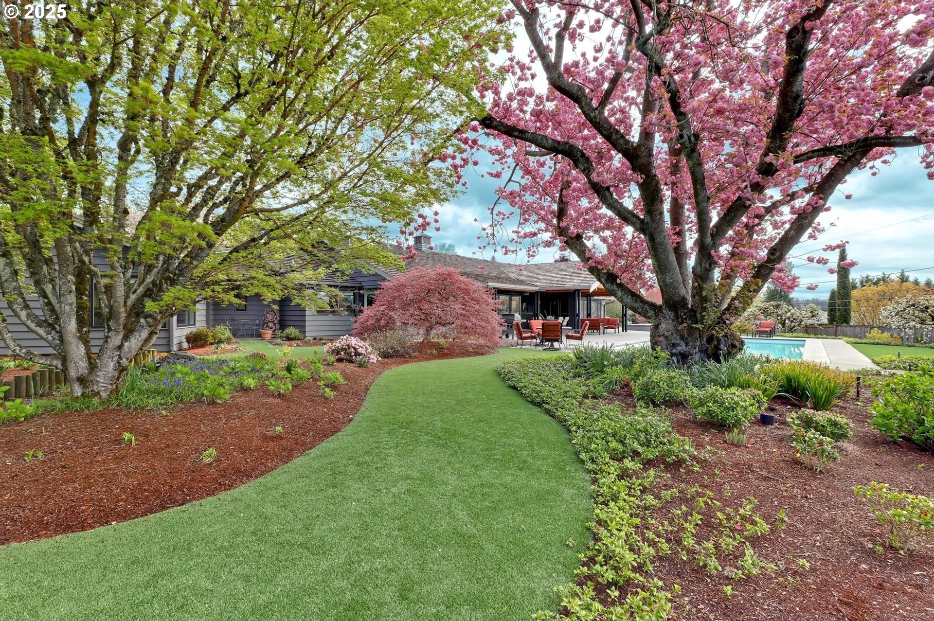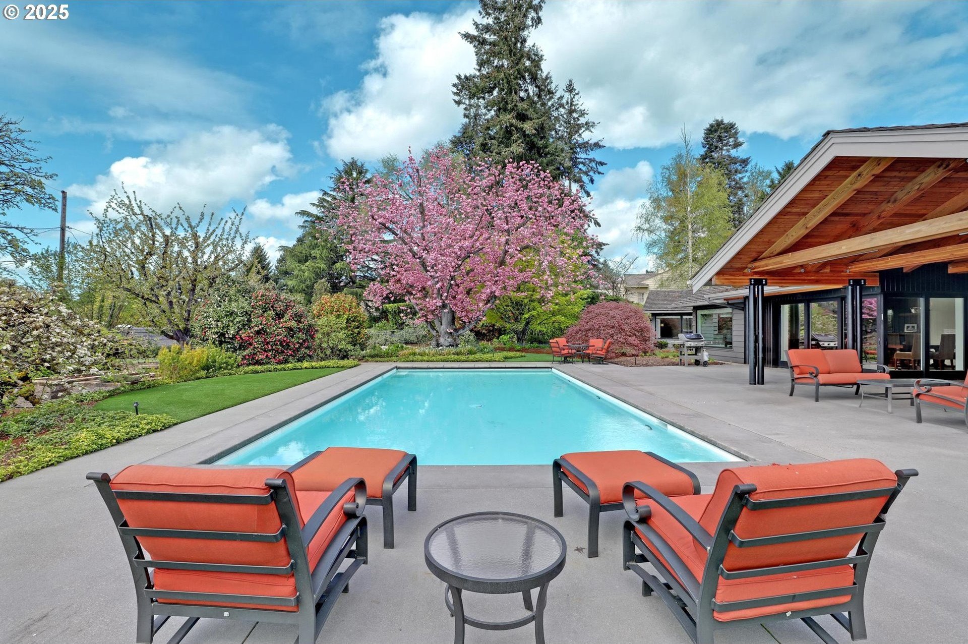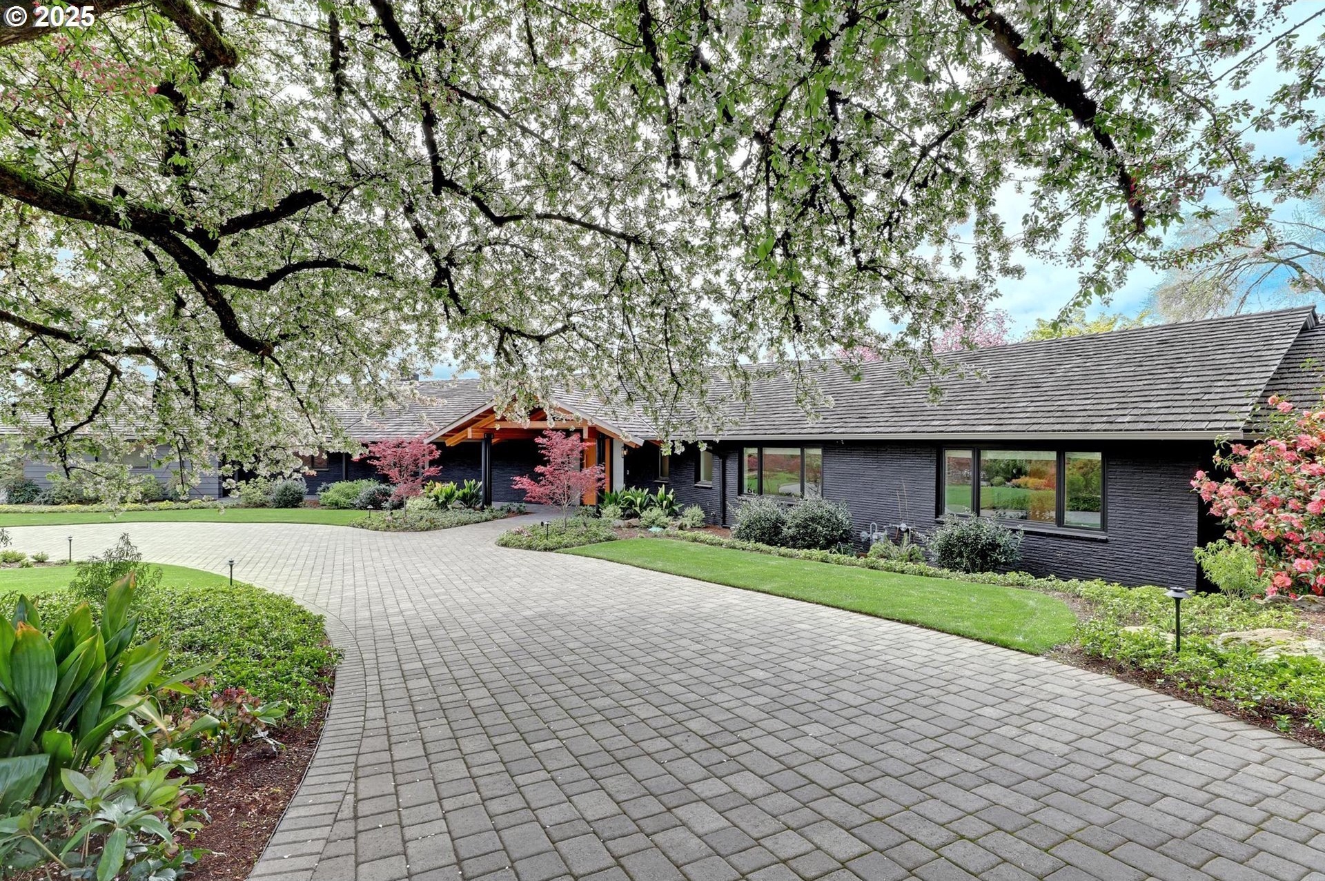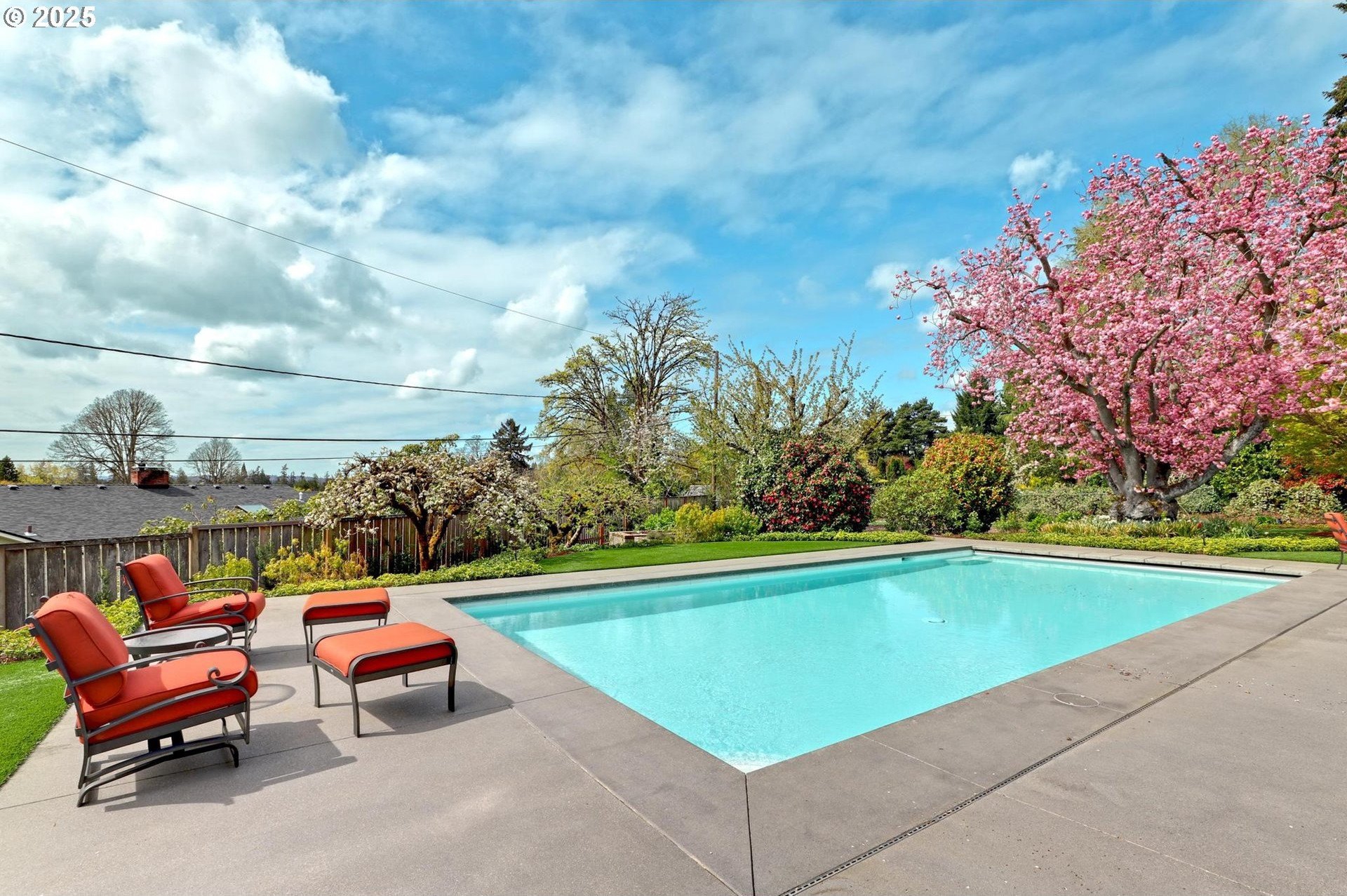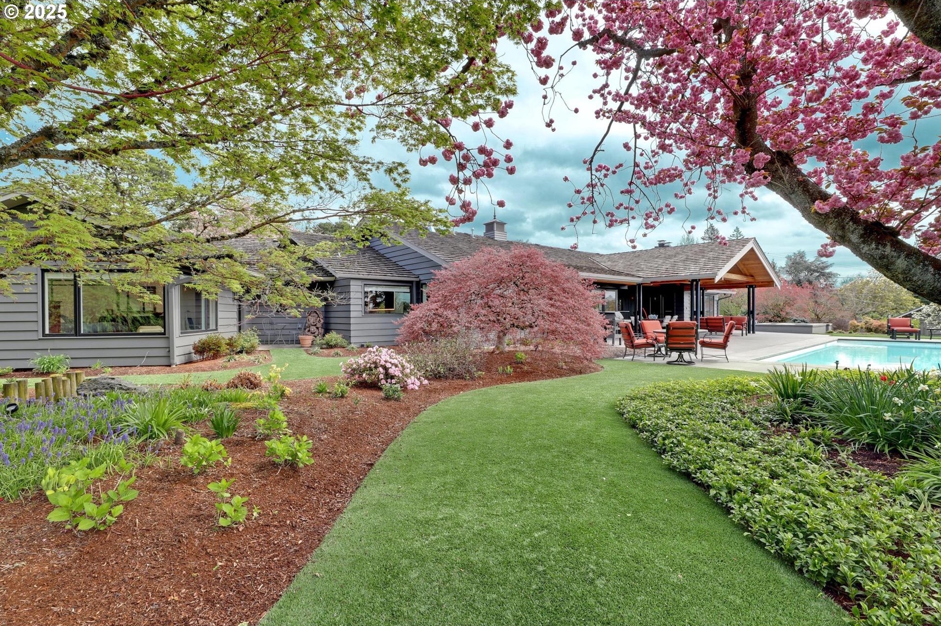 Perhaps the most stunning one-level home in the state - the "Montclair Mid Century" is a good life estate reimagined with the help of a noted Architect, design firm and Landscape Architects. Upon entering the custom 8' modern wood front door, you leave everything else behind. Quality, space, and function are the building blocks. The primary suite is a marvel of vaulted ceilings, custom walk-in closet with a place for everything and a spa bathroom with quartz counters, a curbless shower and a soaking tub. Indoor Outdoor living comes alive in the kitchen, which features a cool, modern vibe with Walnut & quartz countertops and an almost unbelievable 14 foot island, complete with a built in champagne/beverage trough. Open the custom 8 foot accordian-style kitchen window to serve slushies to your outdoor sunbathers. The dining room features an Oregon-Company made 14 foot pocket door system that tucks away and allows the entire corner to be open. With .73 acre, there is plenty of room for the resort sized swimming pool and spa surrounded by velvet concrete and the covered patio with exposed beams and custom metal columns, equipped with four large infrared heaters, creating nearly 600 more square feet in this outdoor room. Two outdoor fireplaces and a Bocce Ball court add even more fun to outdoor play. With 5 bedrooms and 4 full and 2 partial baths, there is room for everyone and everything in this one-of-a-kind home.