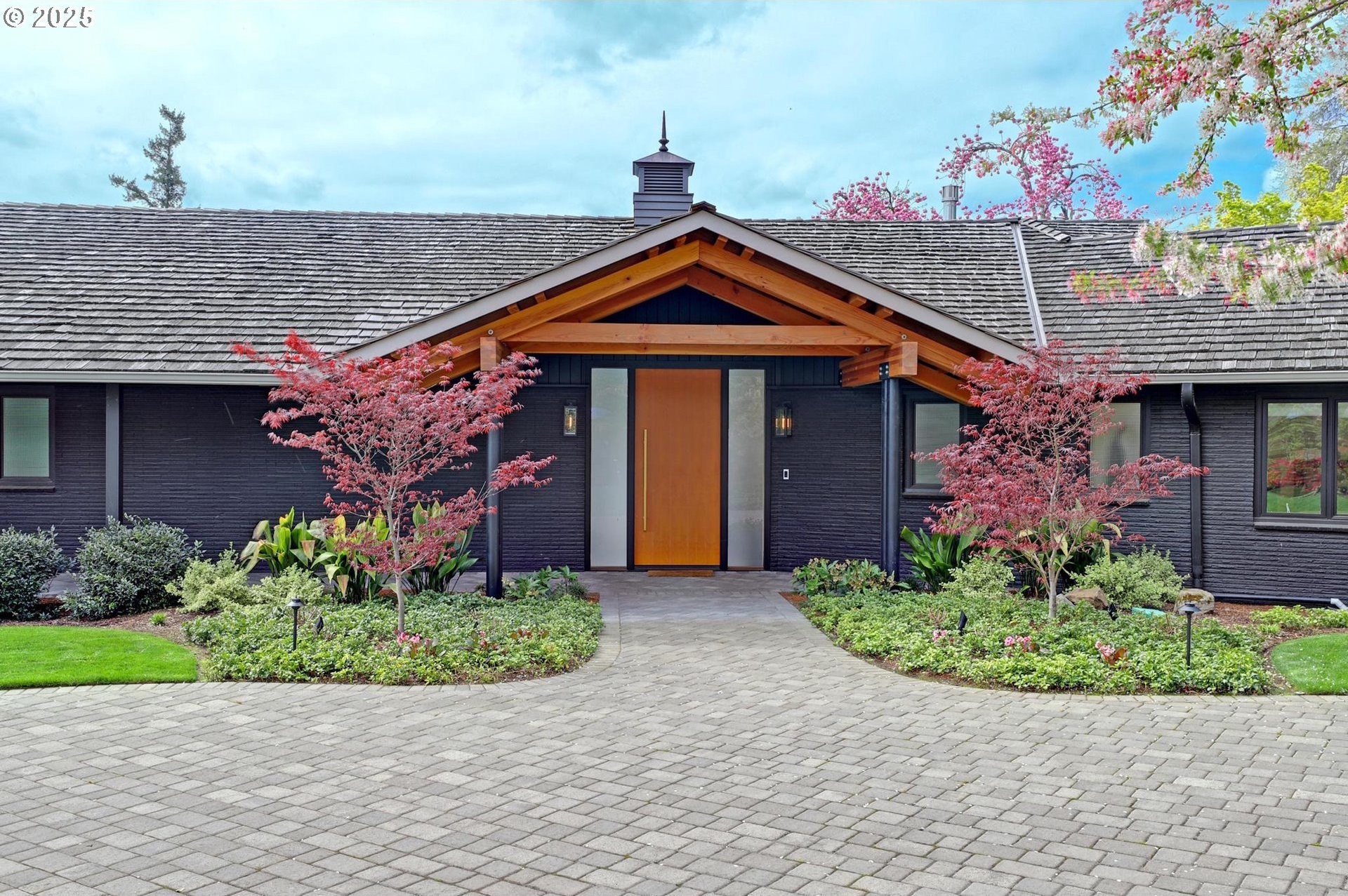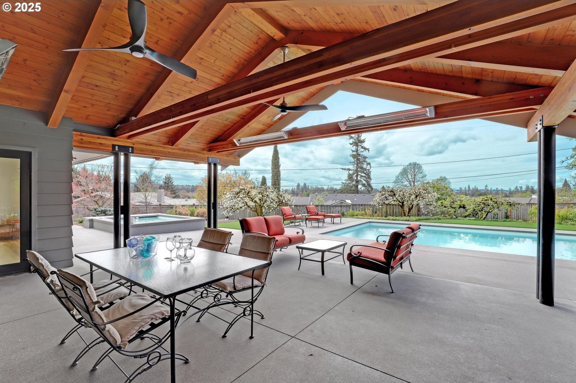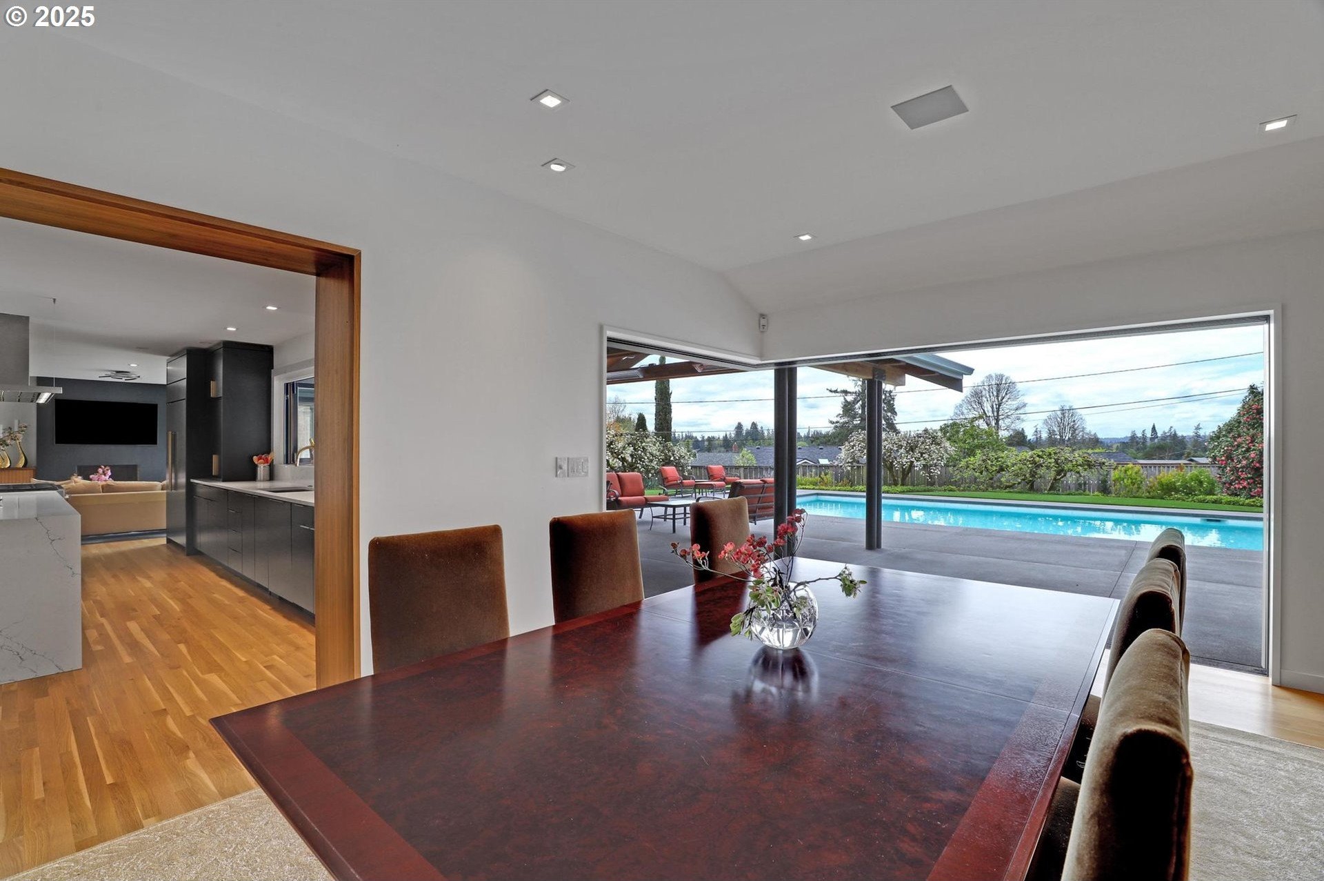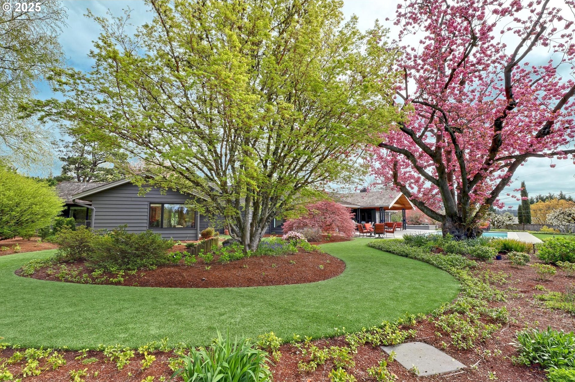 Perhaps the most stunning one-level home in the state - the "Montclair Mid Century" is a good life estate reimagined with the help of a noted Architect, design firm and Landscape Architects. Upon entering the custom 8' modern wood front door, you leave everything else behind. Quality, space, and function are the building blocks. The primary suite is a marvel of vaulted ceilings, custom walk-in closet with a place for everything and a spa bathroom with quartz counters, a curbless shower and a soaking tub. Indoor Outdoor living comes alive in the kitchen, which features a cool, modern vibe with Walnut & quartz countertops and an almost unbelievable 14 foot island, complete with a built in champagne/beverage trough. Open the custom 8 foot accordian-style kitchen window to serve slushies to your outdoor sunbathers. The dining room features an Oregon-Company made 14 foot pocket door system that tucks away and allows the entire corner to be open. With .73 acre, there is plenty of room for the resort sized swimming pool and spa surrounded by velvet concrete and the covered patio with exposed beams and custom metal columns, equipped with four large infrared heaters, creating nearly 600 more square feet in this outdoor room. Two outdoor fireplaces and a Bocce Ball court add even more fun to outdoor play. With 5 bedrooms and 4 full and 2 partial baths, there is room for everyone and everything in this one-of-a-kind home.