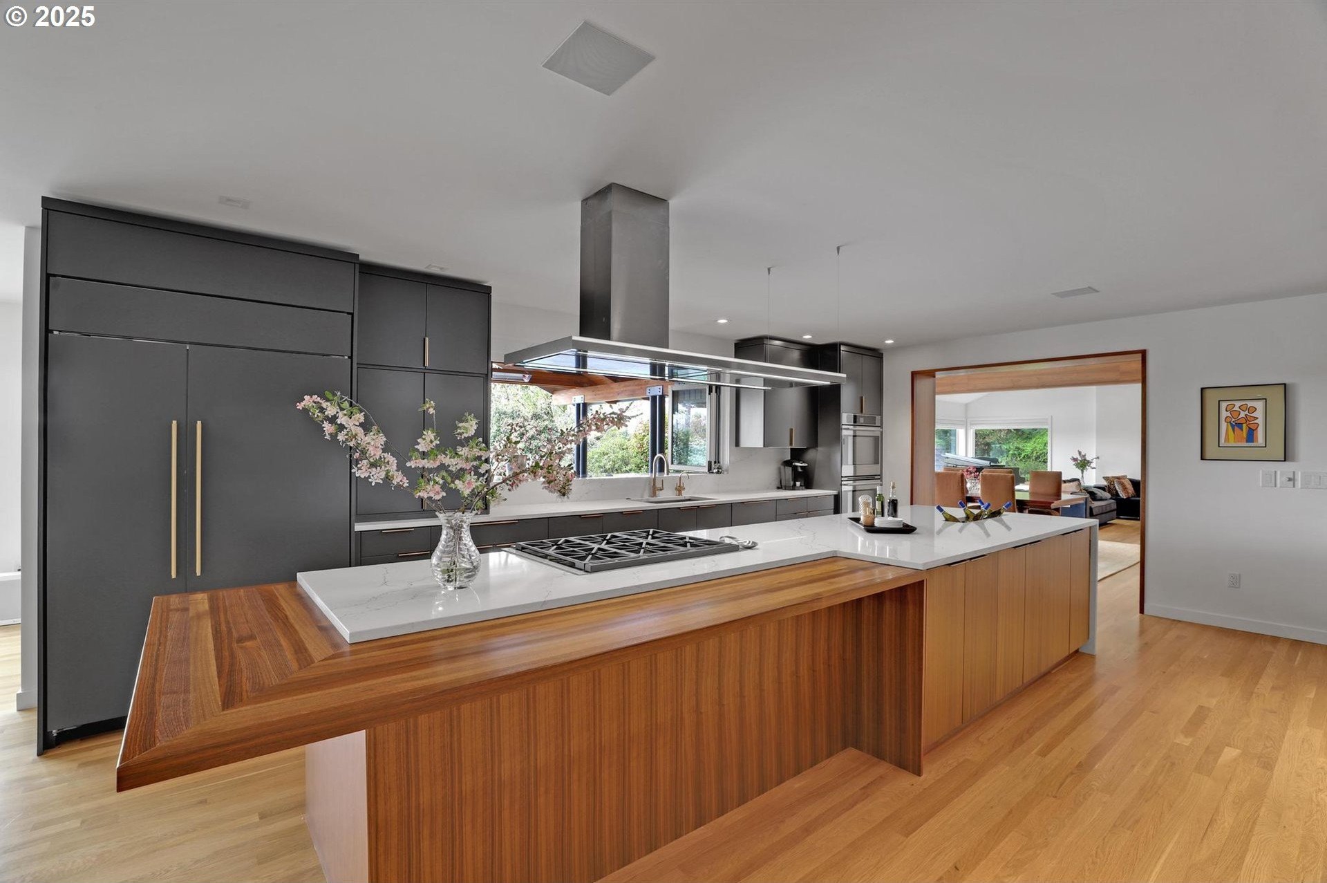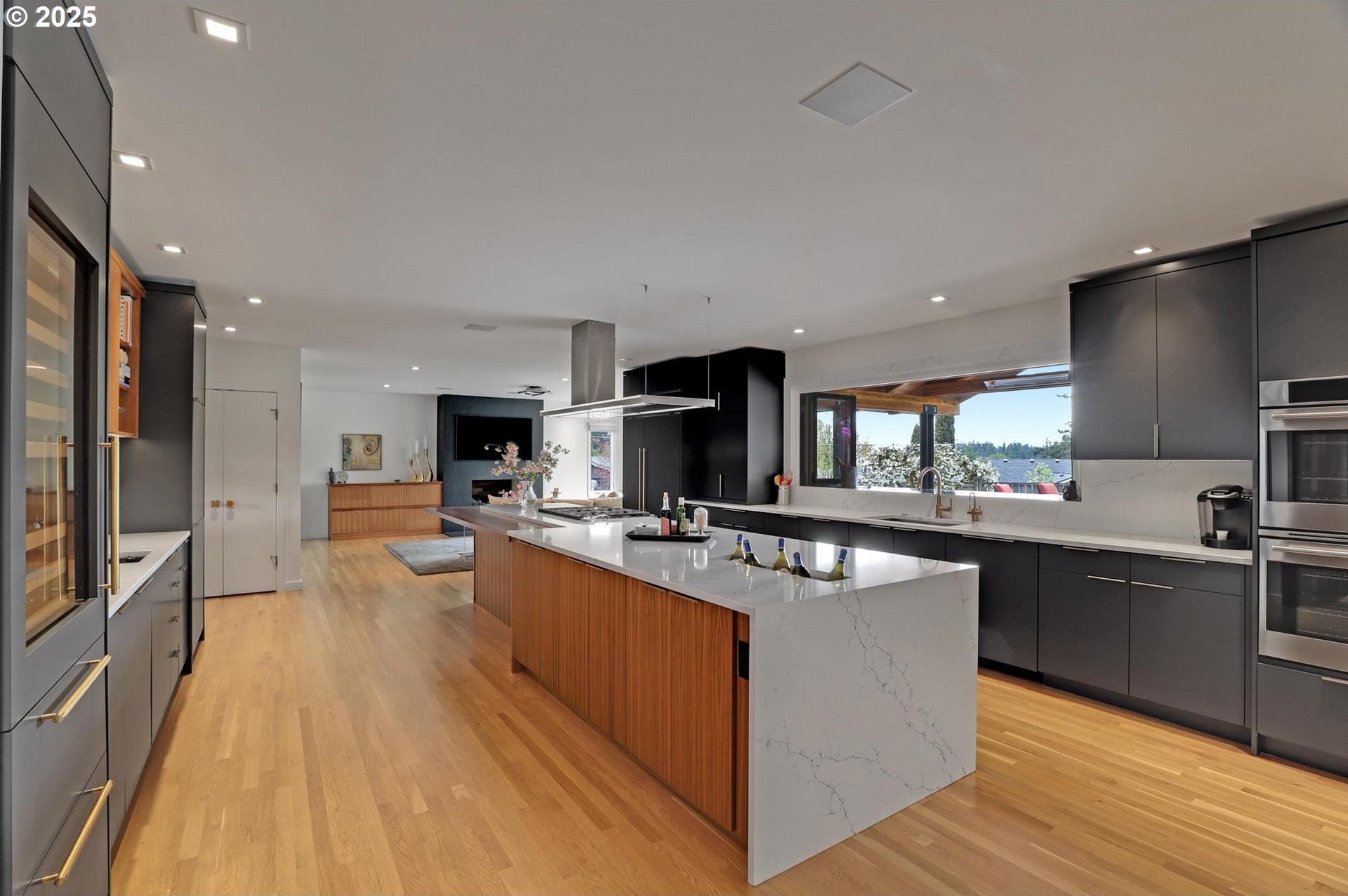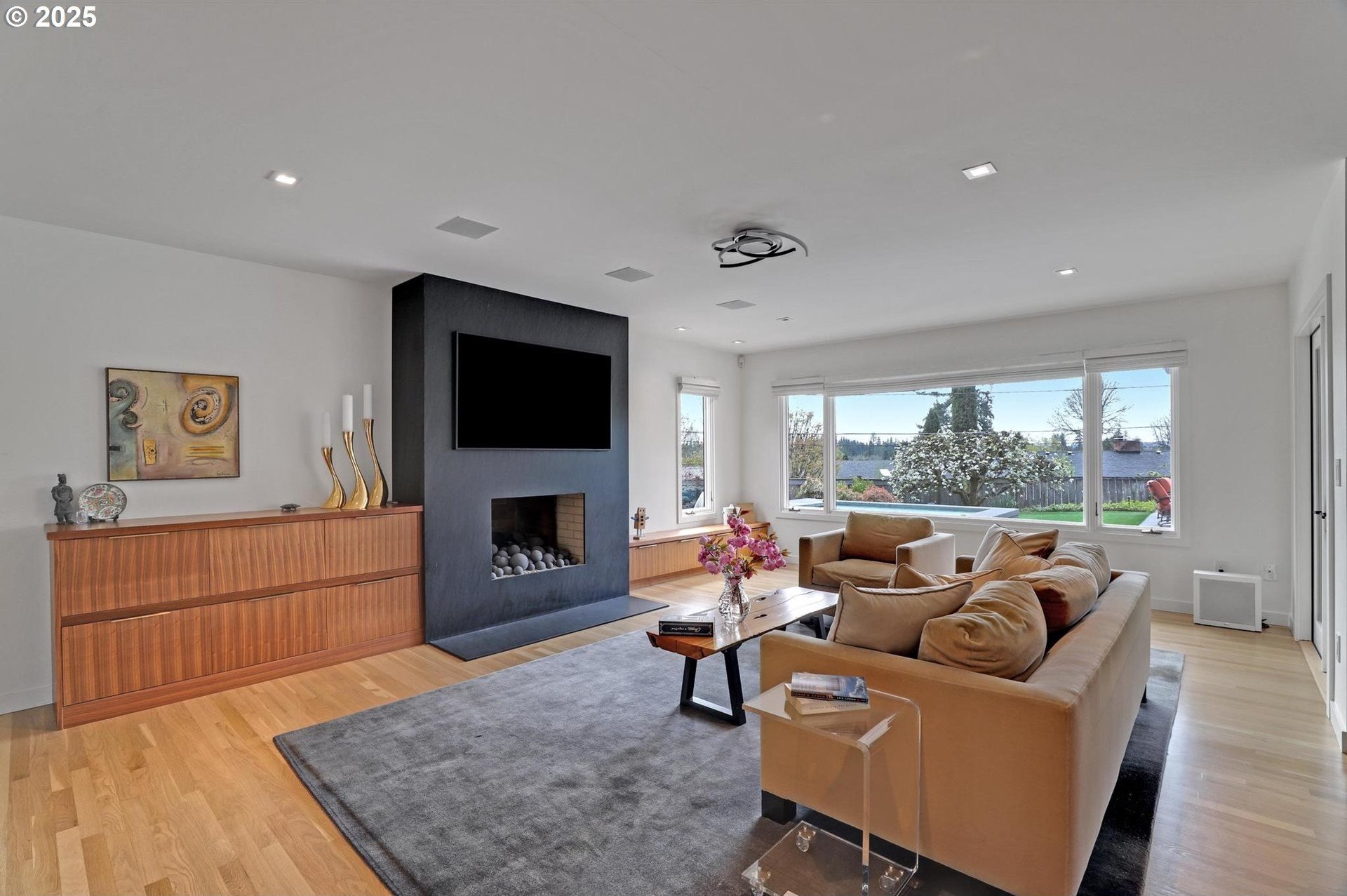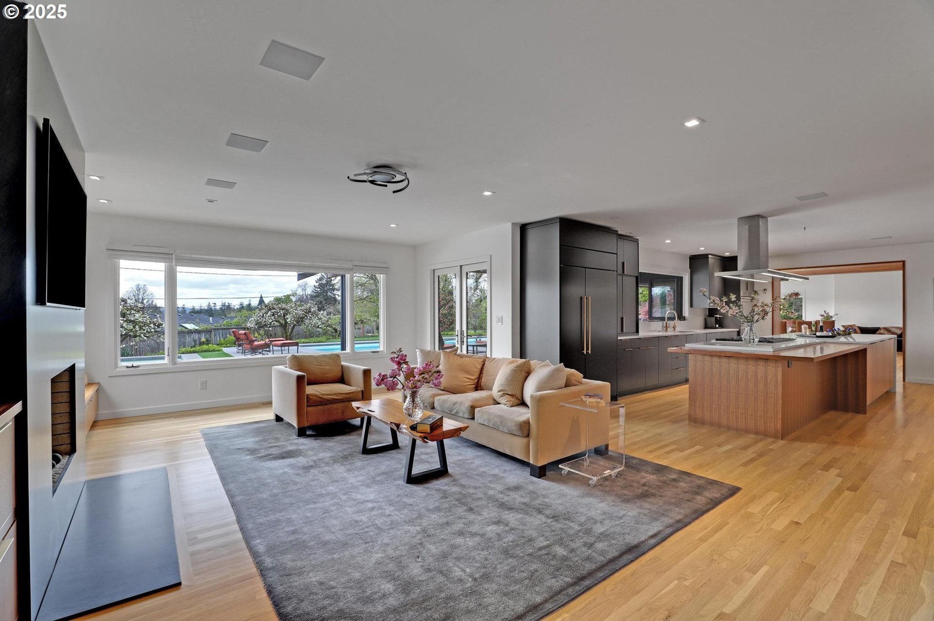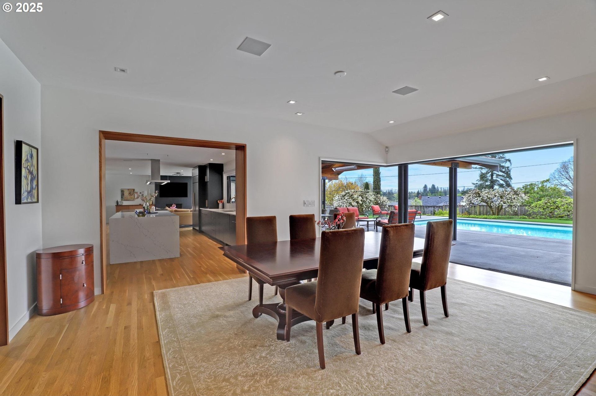 Perhaps the most stunning one-level home in the state - the "Montclair Mid Century" is a good life estate reimagined with the help of a noted Architect, design firm and Landscape Architects. Upon entering the custom 8' modern wood front door, you leave everything else behind. Quality, space, and function are the building blocks. The primary suite is a marvel of vaulted ceilings, custom walk-in closet with a place for everything and a spa bathroom with quartz counters, a curbless shower and a soaking tub. Indoor Outdoor living comes alive in the kitchen, which features a cool, modern vibe with Walnut & quartz countertops and an almost unbelievable 14 foot island, complete with a built in champagne/beverage trough. Open the custom 8 foot accordian-style kitchen window to serve slushies to your outdoor sunbathers. The dining room features an Oregon-Company made 14 foot pocket door system that tucks away and allows the entire corner to be open. With .73 acre, there is plenty of room for the resort sized swimming pool and spa surrounded by velvet concrete and the covered patio with exposed beams and custom metal columns, equipped with four large infrared heaters, creating nearly 600 more square feet in this outdoor room. Two outdoor fireplaces and a Bocce Ball court add even more fun to outdoor play. With 5 bedrooms and 4 full and 2 partial baths, there is room for everyone and everything in this one-of-a-kind home.