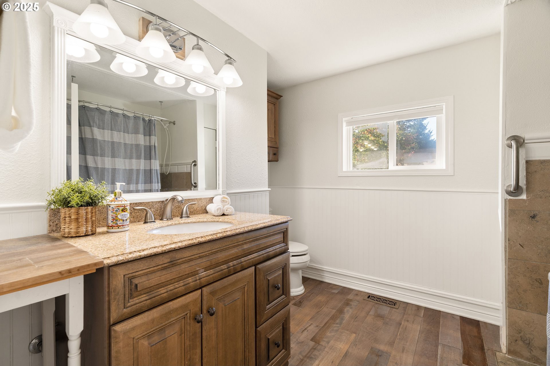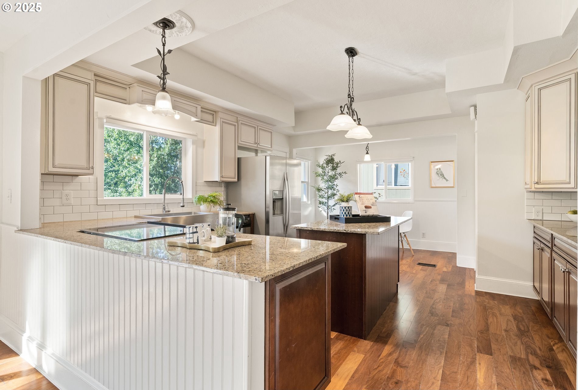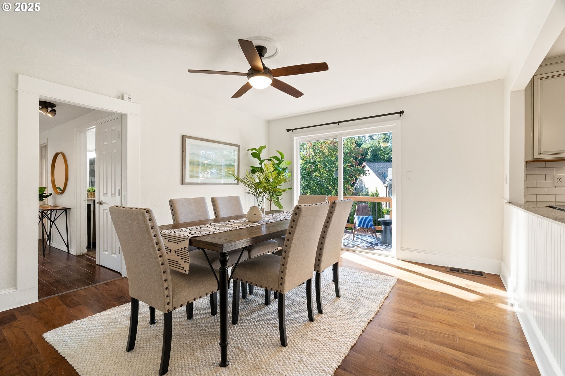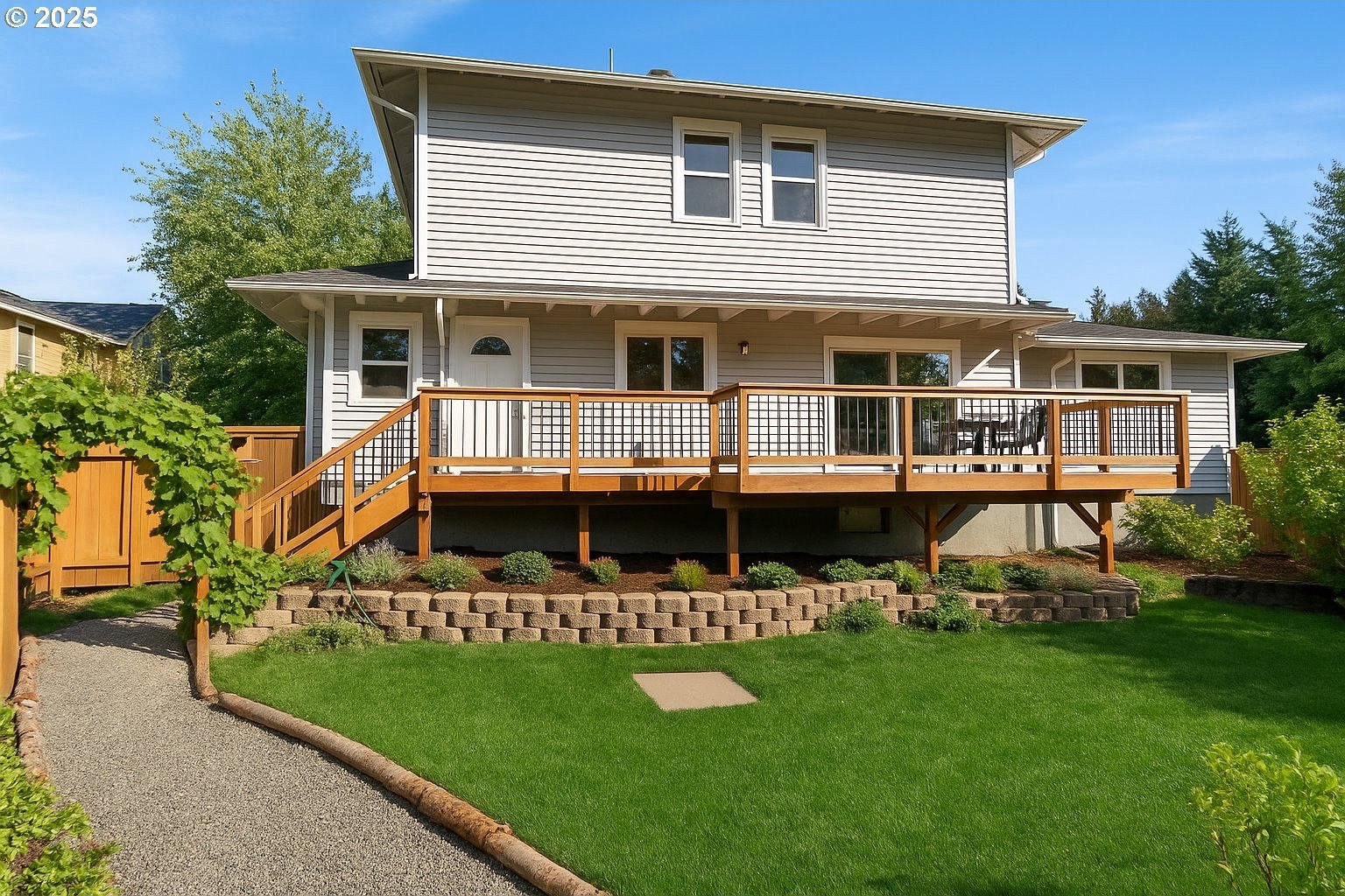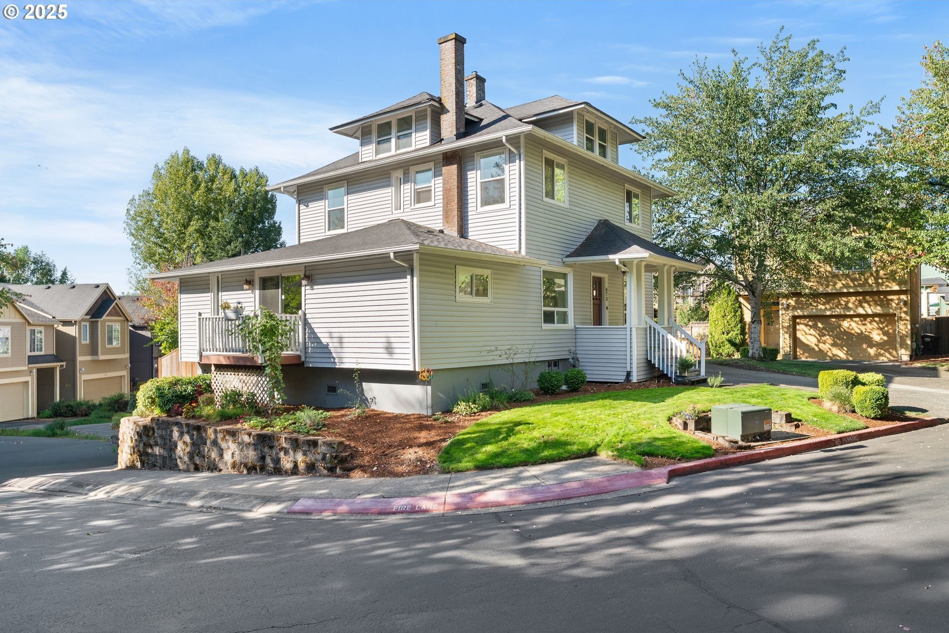 Step into this beautifully updated 1910 American Foursquare style farmhouse, where timeless character meets modern comfort. The spacious main level features easy care hard surface flooring (bamboo and engineered hardwood), fireplace, high ceilings, and spacious open floor plan designed for both entertaining and everyday living. The large kitchen is a true highlight with newer cabinetry, granite countertops, newer stainless-steel appliances, and a classic farmhouse sink. The adjacent dining room and eating nook each open to the expansive (50 yr) composite deck overlooking the fenced yard. There is a pre-wired "hot tub" ready deck/area in the backyard. The main-level primary suite offers convenience and privacy and features a balcony deck, walk-in plus 2 additional closets and ensuite bath. Four additional upstairs bedrooms provide plenty of space for family, guests, and maybe a 2nd home office. The expansive lower level offers endless possibilities - a bonus or party room, plus a home office or media room, a full bathroom with shower, also enjoy the existing wet bar area with sink, counters/cabinets, and refrigerator. Don't miss the nearly 800 sf of accessible unfinished attic space for storage or future living space. Thoughtful updates throughout preserve the home’s vintage charm while adding modern functionality with a newer “smart” Rheem “eco net” water heater, newer appliances, double pane windows/sliders, and fresh interior paint. Sited in a beautifully maintained neighborhood, on a cul-de-sac with level fenced yard, fruit trees, other edible plants, garden boxes, large driveway and covered area / carport. Conveniently located just minutes from Downtown Hillsboro, OHSU Hillsboro hospital, transit/light rail, Shute Park, Jackson Bottom Wetlands Preserve, and the high-tech corridor this one-of-a-kind property combines charm, space, and location in one perfect package! [Home Energy Score = 1. HES Report at https://rpt.greenbuildingregistry.com/hes/OR10241792]