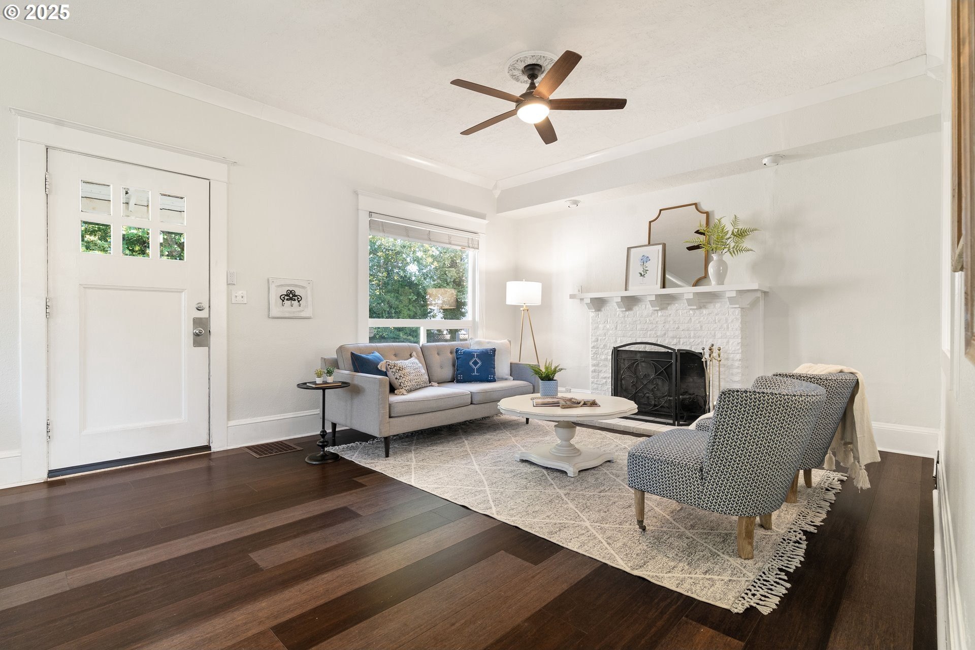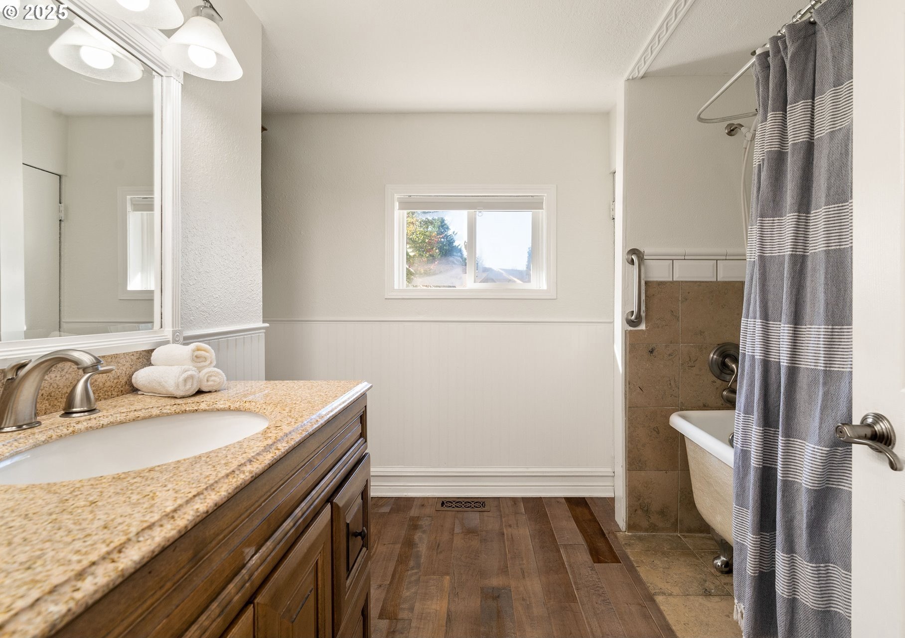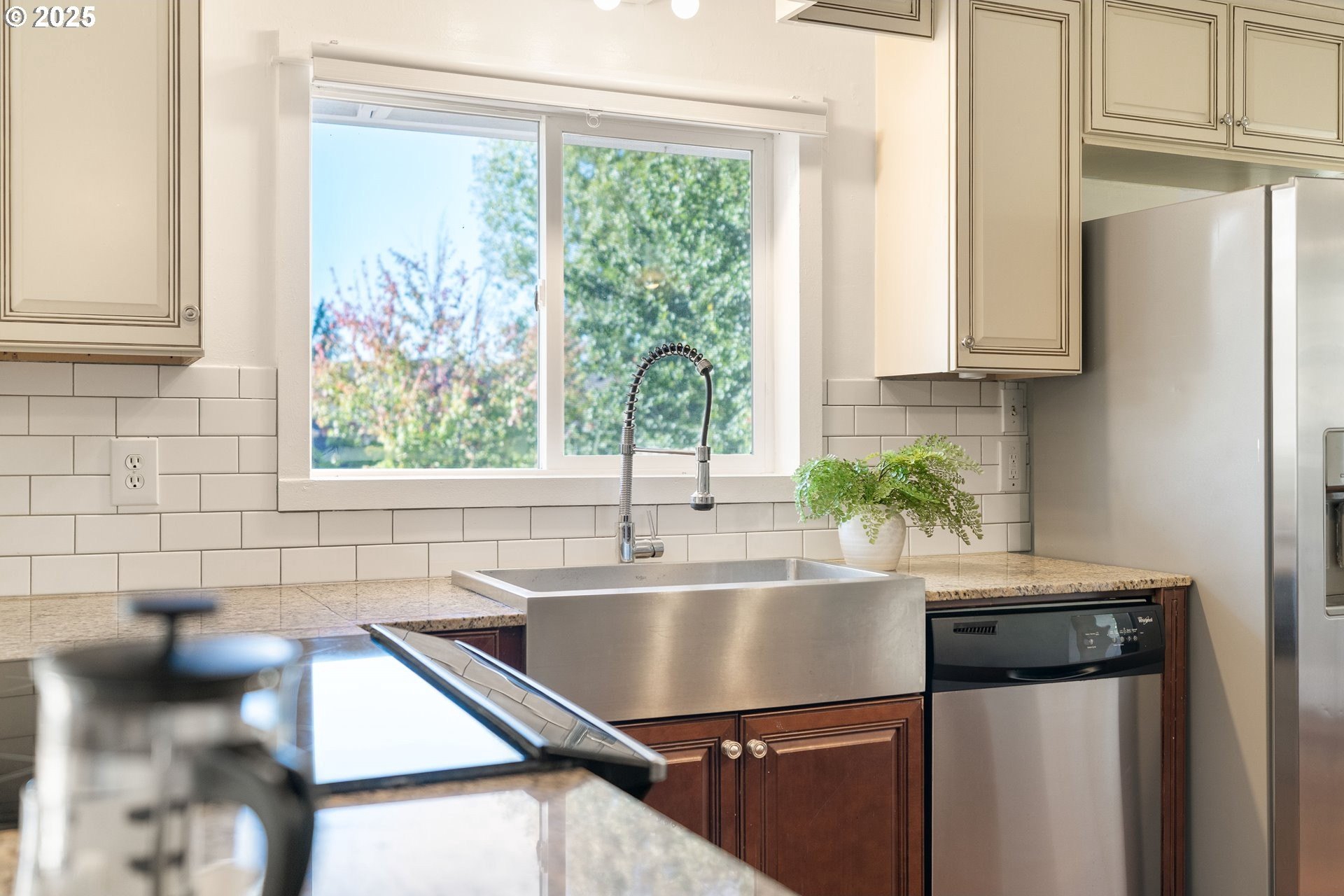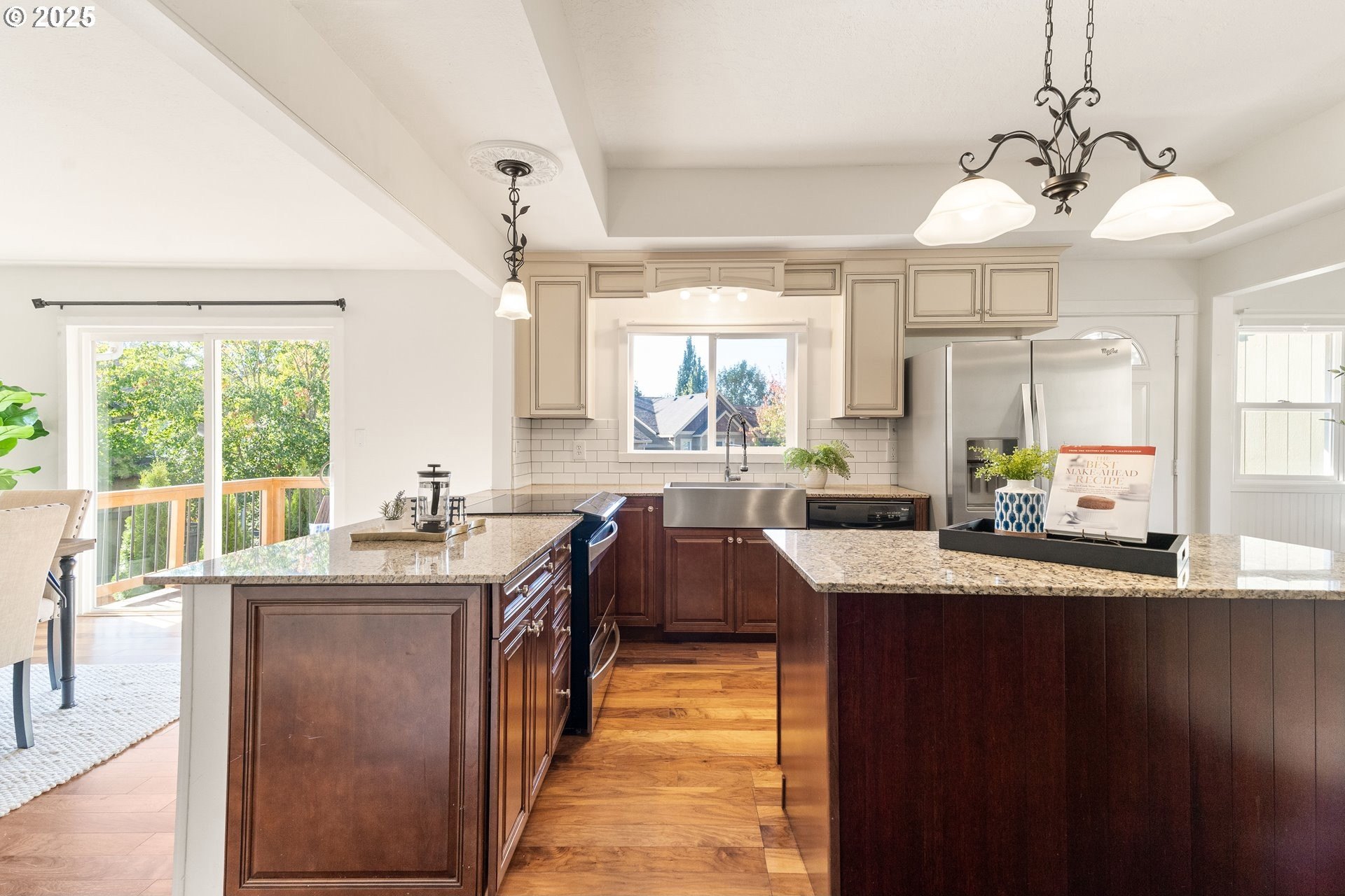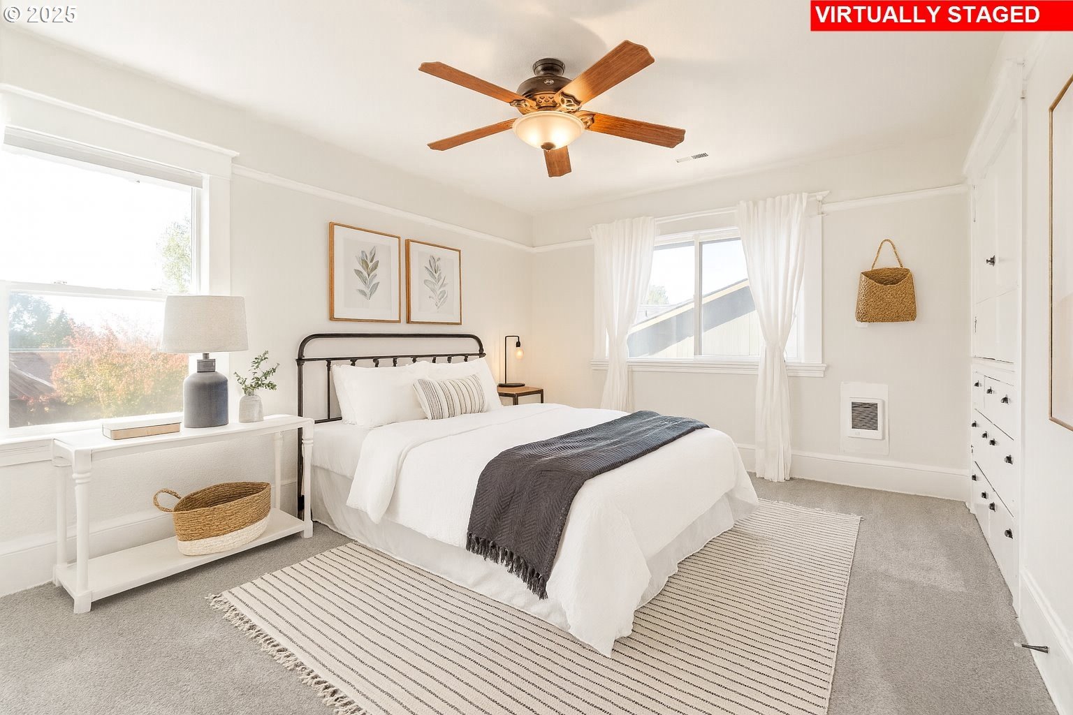 Step into this beautifully updated 1910 American Foursquare style farmhouse, where timeless character meets modern comfort. The spacious main level features easy care hard surface flooring (bamboo and engineered hardwood), fireplace, high ceilings, and spacious open floor plan designed for both entertaining and everyday living. The large kitchen is a true highlight with newer cabinetry, granite countertops, newer stainless-steel appliances, and a classic farmhouse sink. The adjacent dining room and eating nook each open to the expansive (50 yr) composite deck overlooking the fenced yard. There is a pre-wired "hot tub" ready deck/area in the backyard. The main-level primary suite offers convenience and privacy and features a balcony deck, walk-in plus 2 additional closets and ensuite bath. Four additional upstairs bedrooms provide plenty of space for family, guests, and maybe a 2nd home office. The expansive lower level offers endless possibilities - a bonus or party room, plus a home office or media room, a full bathroom with shower, also enjoy the existing wet bar area with sink, counters/cabinets, and refrigerator. Don't miss the nearly 800 sf of accessible unfinished attic space for storage or future living space. Thoughtful updates throughout preserve the home’s vintage charm while adding modern functionality with a newer “smart” Rheem “eco net” water heater, newer appliances, double pane windows/sliders, and fresh interior paint. Sited in a beautifully maintained neighborhood, on a cul-de-sac with level fenced yard, fruit trees, other edible plants, garden boxes, large driveway and covered area / carport. Conveniently located just minutes from Downtown Hillsboro, OHSU Hillsboro hospital, transit/light rail, Shute Park, Jackson Bottom Wetlands Preserve, and the high-tech corridor this one-of-a-kind property combines charm, space, and location in one perfect package! [Home Energy Score = 1. HES Report at https://rpt.greenbuildingregistry.com/hes/OR10241792]