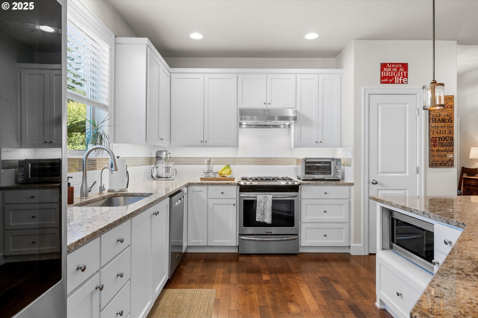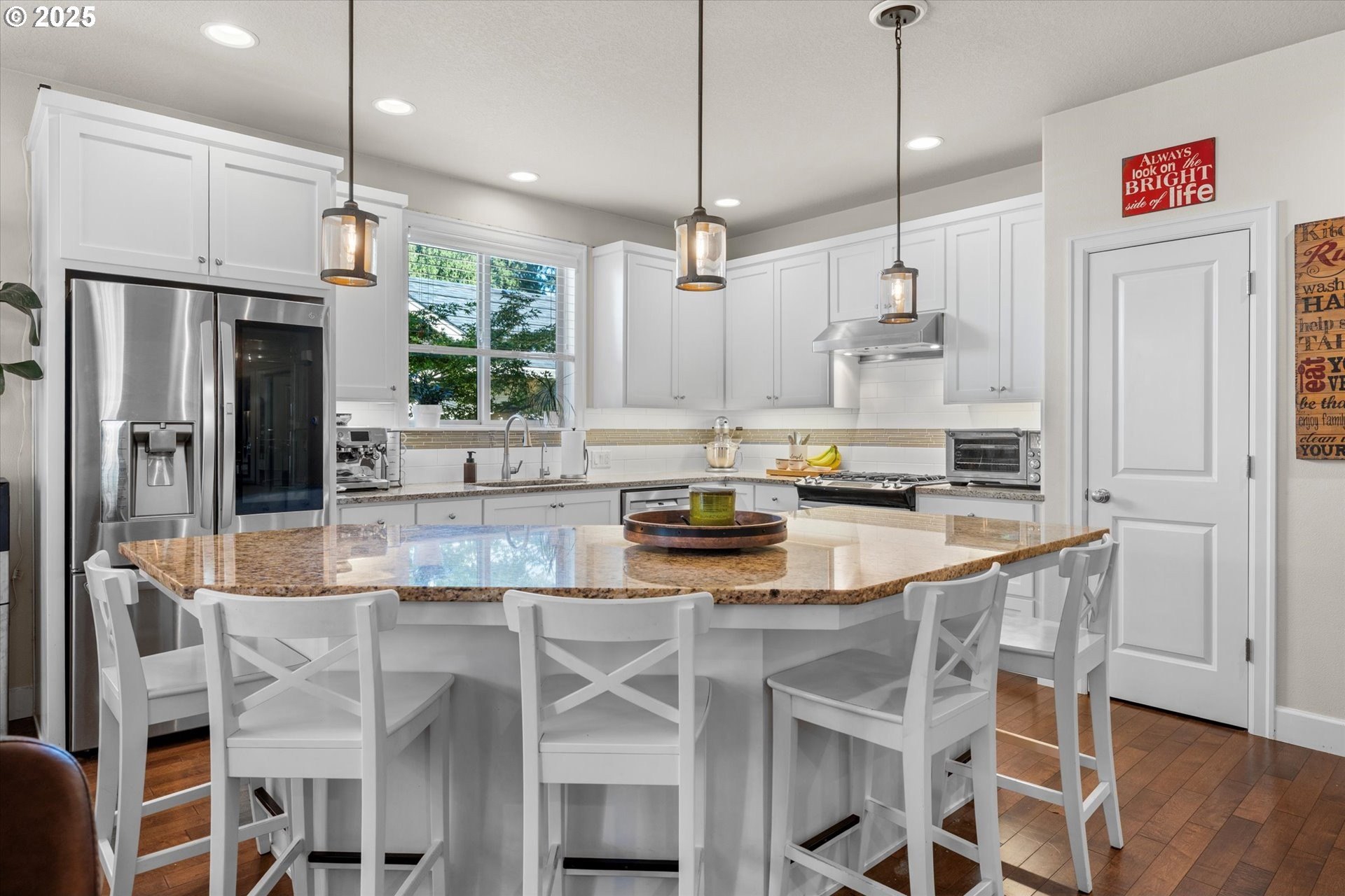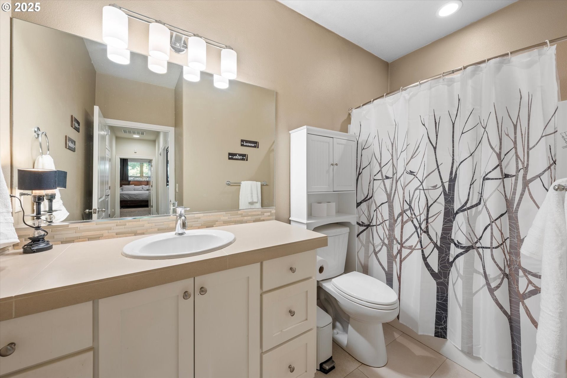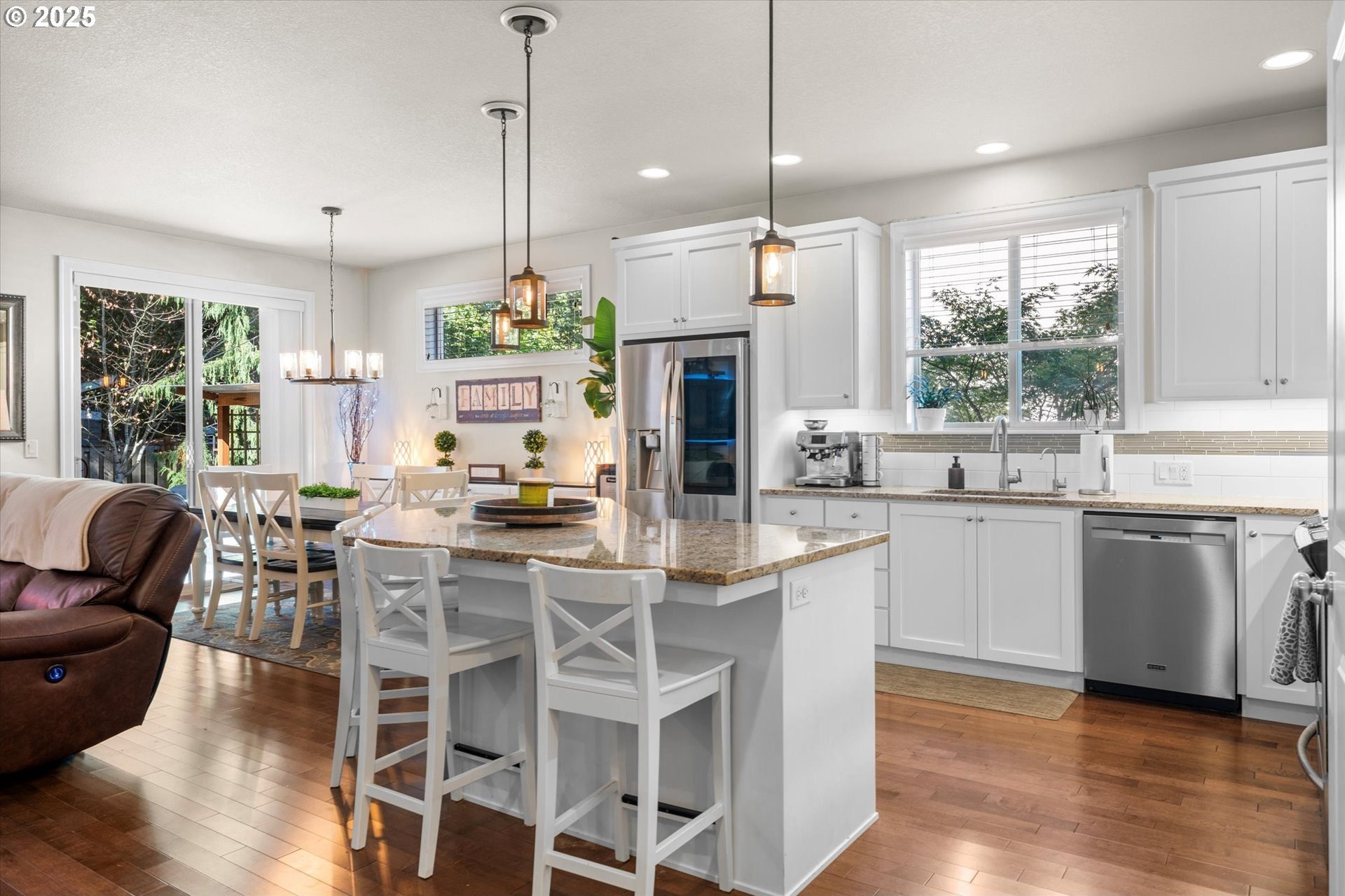 Welcome to your own private retreat — a thoughtfully designed one-level home that combines comfort and convenience in every detail. Step inside to the maple floors that flow through the living areas. The open concept kitchen with granite countertops, pantry storage, and an island with bar seating. The family room invites you to gather around the cozy gas fireplace, framed by custom built-ins and the dining room opens to the backyard with a slider—perfect for easy indoor-outdoor living. The spacious primary suite offers double sinks with quartz countertops, a walk-in closet, and a low-step shower. While the office/den with vaulted ceiling and closet provides flexible space for work or a 4th bedroom. There is a convenient laundry room with sink, storage, and tile flooring too.Out back, the private yard is truly an extension of the home. Designed for gatherings and relaxation, it features a large patio, gazebo, BBQ station with cover, patio lights, and raised garden beds. Fully fenced and surrounded by lush greenery, it’s your own private escape—perfect for both quiet mornings and lively evenings with friends.2 car garage converted to a McMenamins-style game room—great for fun gatherings, and easily converted back if you prefer!This home’s tranquil setting offers a sense of escape, yet you’re just minutes from nearby amenities and the heart of Tigard. Whether you’re relaxing indoors or enjoying the peaceful outdoor spaces, this home offers the perfect blend of privacy, serenity, and comfort.