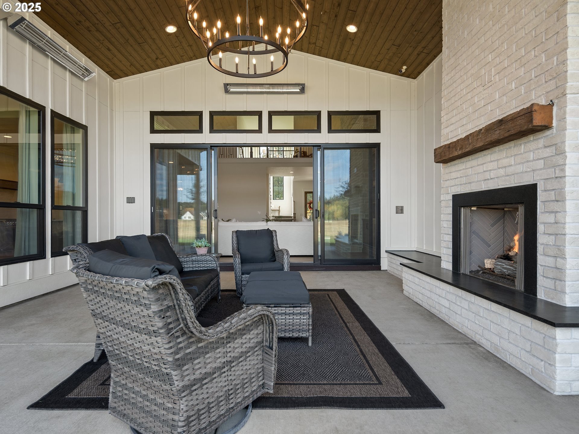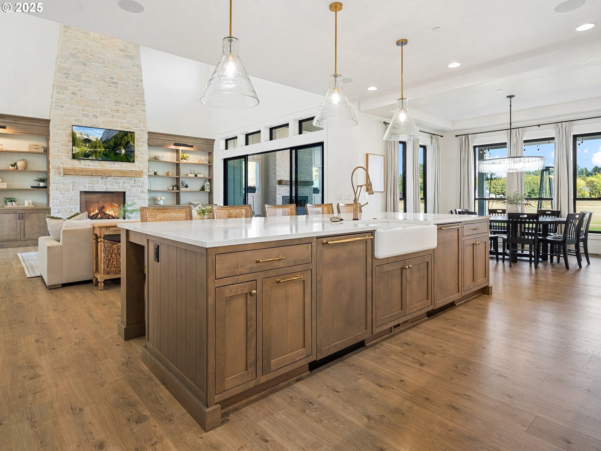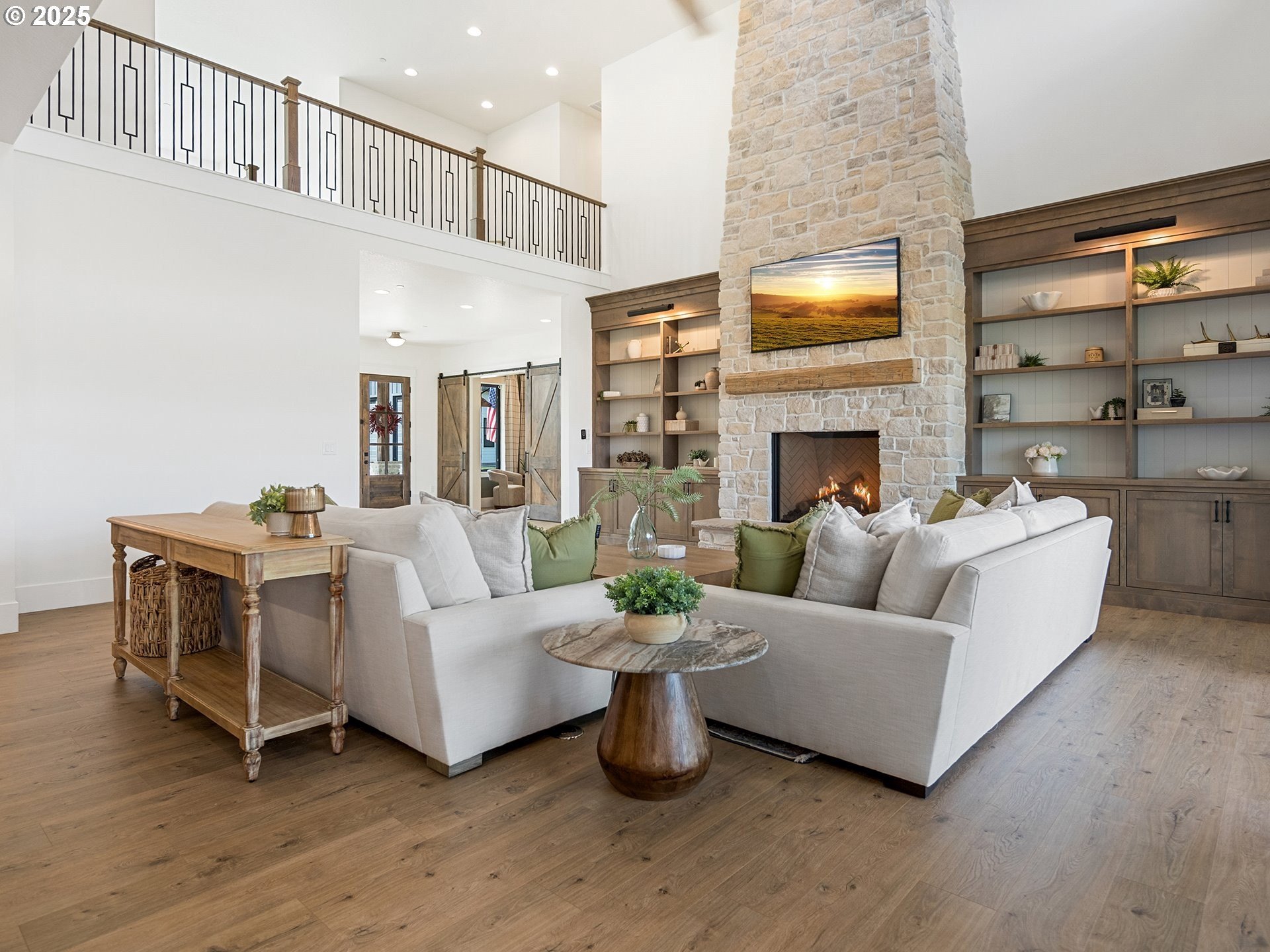 Nestled on 10 acres, this home is an entertainer's dream. The entryway features an open staircase that looks into a great room with 20’ ceilings, views of two 42” gas fireplaces surrounded by stone, surround sound in the main living area/outside, custom built-ins, 14’ double slider that opens to a covered patio. The impressive kitchen includes a 12’ island, premium quartz countertops, Monogram appliances include a six-burner gas stove, double ovens, an electric French door oven, oversized built-in refrigerator/freezer and dual Miele dishwashers. A distinctive butler's pantry elevates the space with a Miele espresso machine, beverage cooler, and expansive storage. Beyond the butler's pantry, custom wood saloon doors lead to a large walk-in food pantry with expansive shelving and room for an additional refrigerator. The primary is thoughtfully located on the main floor and feels like a true escape, offering vaulted ceilings, and a 36" gas fireplace. The ensuite hosts a soaking tub, heated floors, double walk-in shower with smart controls, and large walk-in closet. The main level also includes a 2nd primary suite that adds flexibility for guests or multigenerational living, an office, and a large mudroom/laundry with ample storage, dog washing station, and dual washer/dryers. Upstairs, you'll find three generously sized bedrooms with walk-in closets, two share a Jack-and-Jill bathroom. A large media room with a wet bar and an immersive built in surround sound offers the perfect space for movie nights. The covered patio is equipped with InfraRed heaters, a gas fireplace, and hookups for a future outdoor kitchen. Just steps away, a dedicated sauna room features a 5-person sauna and a full bathroom. An unfinished space above the attached garage, sits ready for your creative vision. Detached oversized shop offers RV storage/hook-up, a full kitchen, and the ability to add a walk-in fridge and lean-to. Outside offers a fruit orchard, irrigation and fenced raised bed garden.