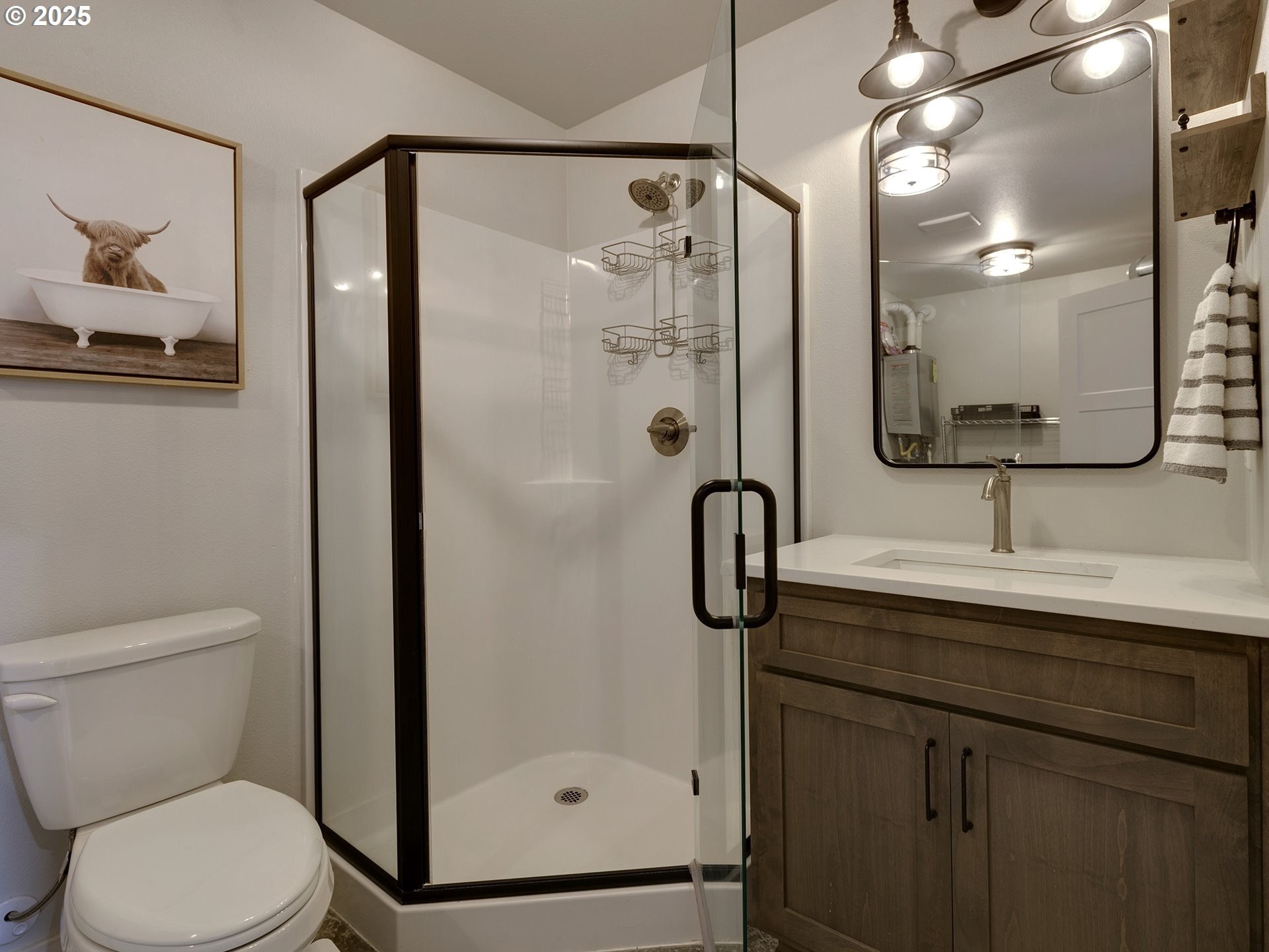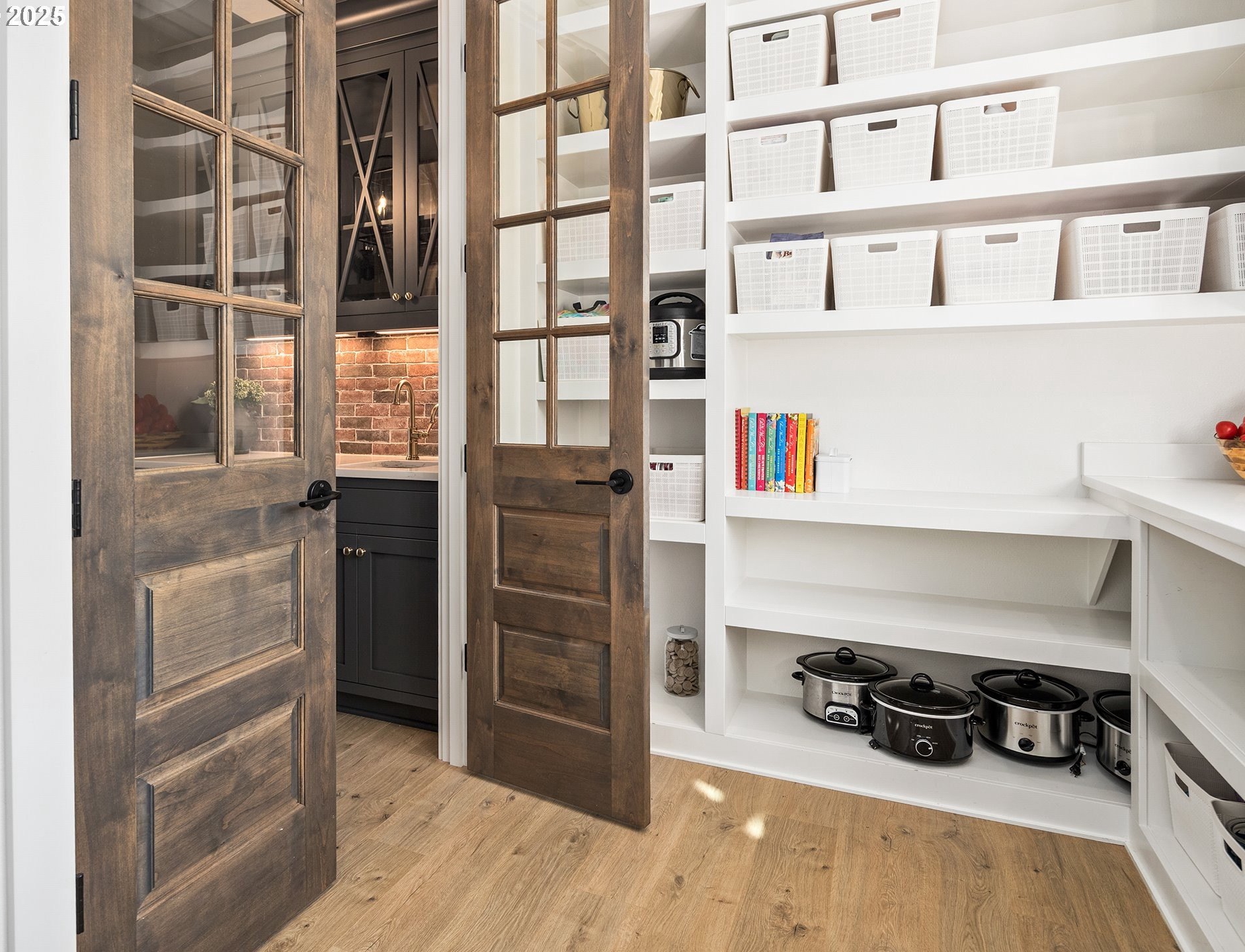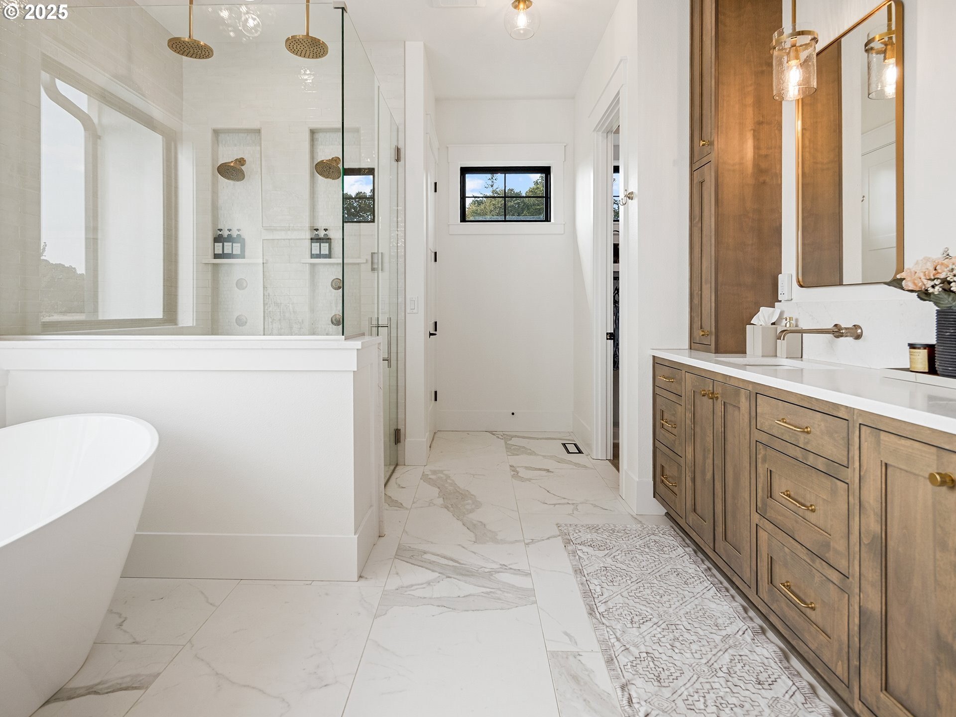 Nestled on 10 acres, this home is an entertainer's dream. The entryway features an open staircase that looks into a great room with 20’ ceilings, views of two 42” gas fireplaces surrounded by stone, surround sound in the main living area/outside, custom built-ins, 14’ double slider that opens to a covered patio. The impressive kitchen includes a 12’ island, premium quartz countertops, Monogram appliances include a six-burner gas stove, double ovens, an electric French door oven, oversized built-in refrigerator/freezer and dual Miele dishwashers. A distinctive butler's pantry elevates the space with a Miele espresso machine, beverage cooler, and expansive storage. Beyond the butler's pantry, custom wood saloon doors lead to a large walk-in food pantry with expansive shelving and room for an additional refrigerator. The primary is thoughtfully located on the main floor and feels like a true escape, offering vaulted ceilings, and a 36" gas fireplace. The ensuite hosts a soaking tub, heated floors, double walk-in shower with smart controls, and large walk-in closet. The main level also includes a 2nd primary suite that adds flexibility for guests or multigenerational living, an office, and a large mudroom/laundry with ample storage, dog washing station, and dual washer/dryers. Upstairs, you'll find three generously sized bedrooms with walk-in closets, two share a Jack-and-Jill bathroom. A large media room with a wet bar and an immersive built in surround sound offers the perfect space for movie nights. The covered patio is equipped with InfraRed heaters, a gas fireplace, and hookups for a future outdoor kitchen. Just steps away, a dedicated sauna room features a 5-person sauna and a full bathroom. An unfinished space above the attached garage, sits ready for your creative vision. Detached oversized shop offers RV storage/hook-up, a full kitchen, and the ability to add a walk-in fridge and lean-to. Outside offers a fruit orchard, irrigation and fenced raised bed garden.