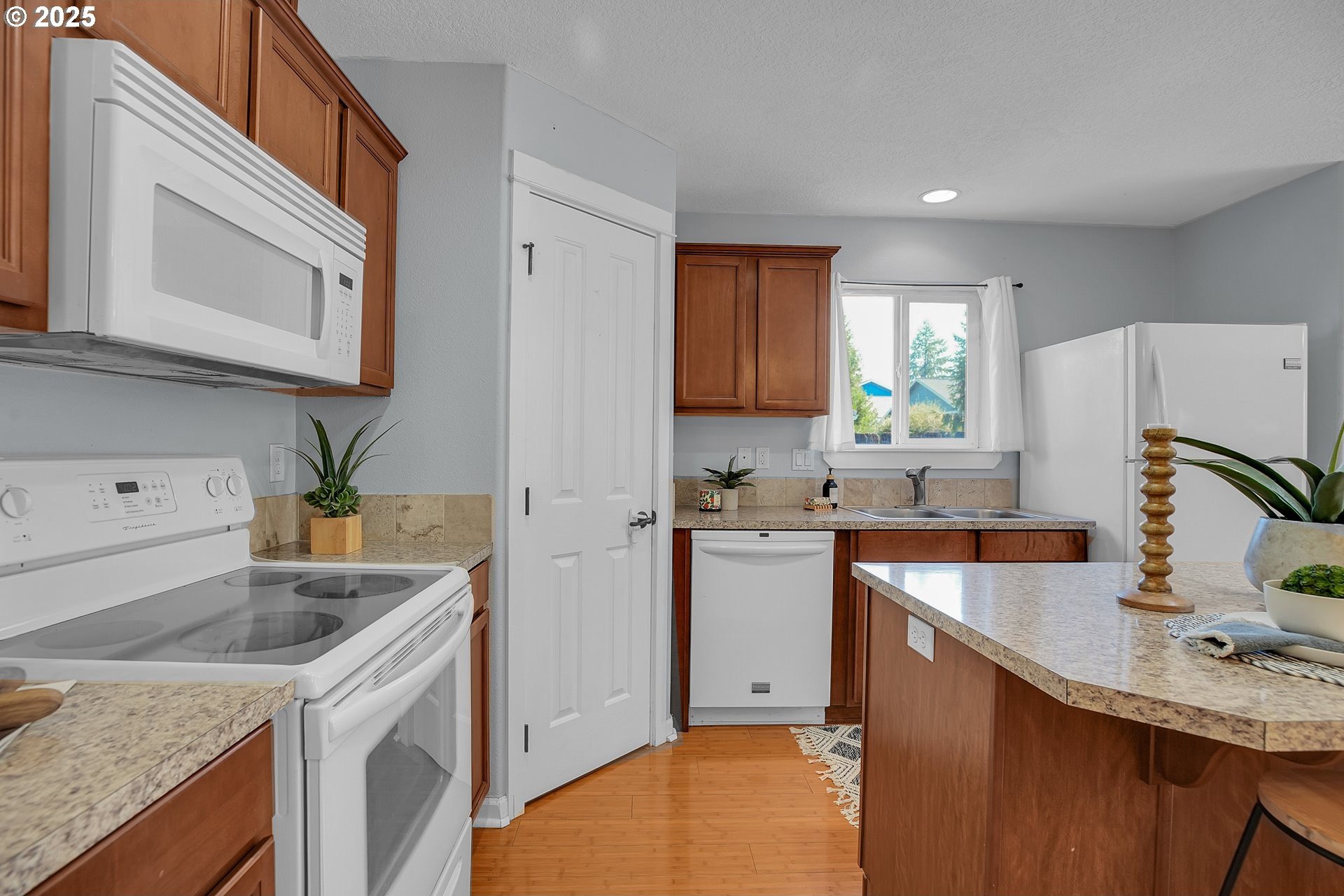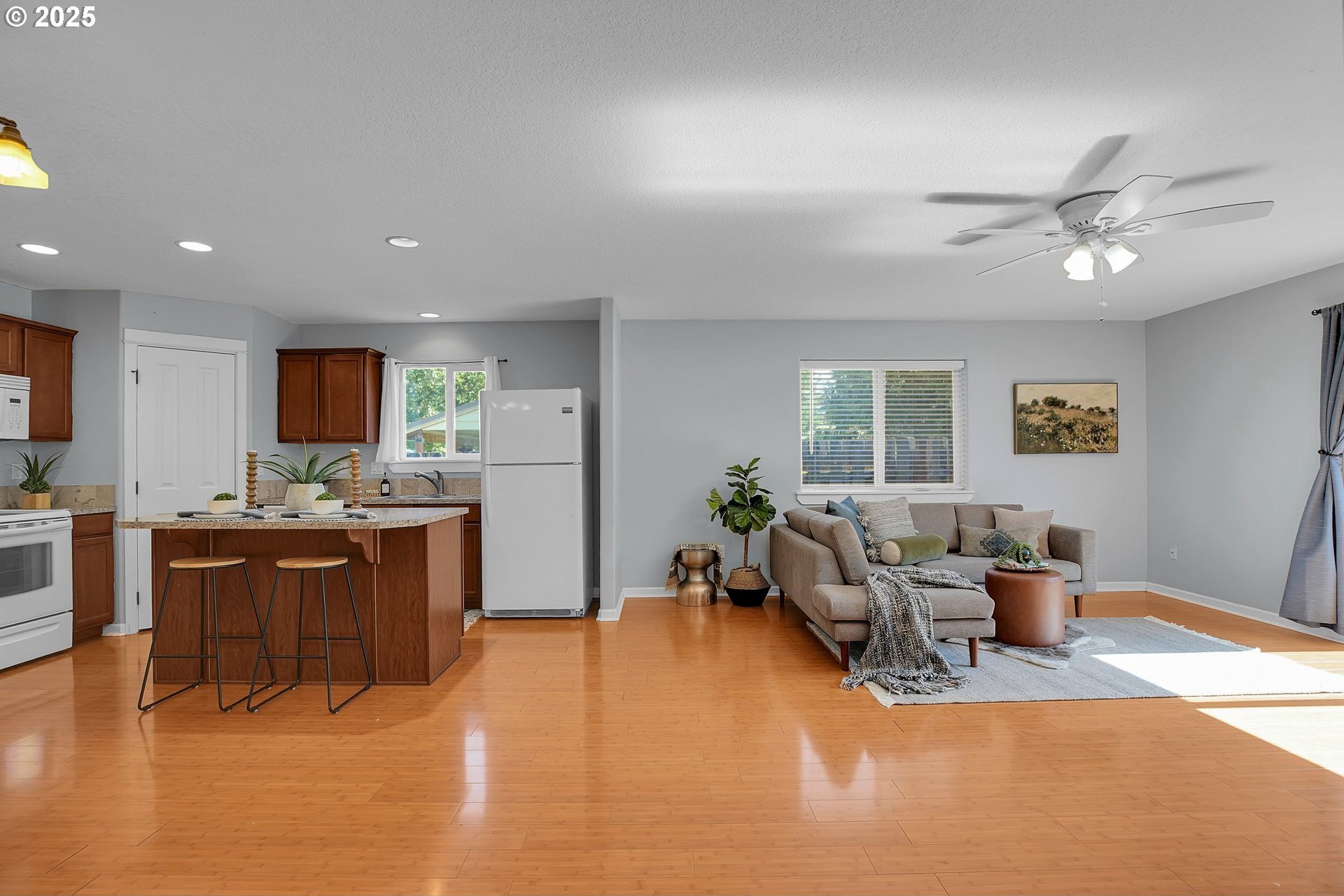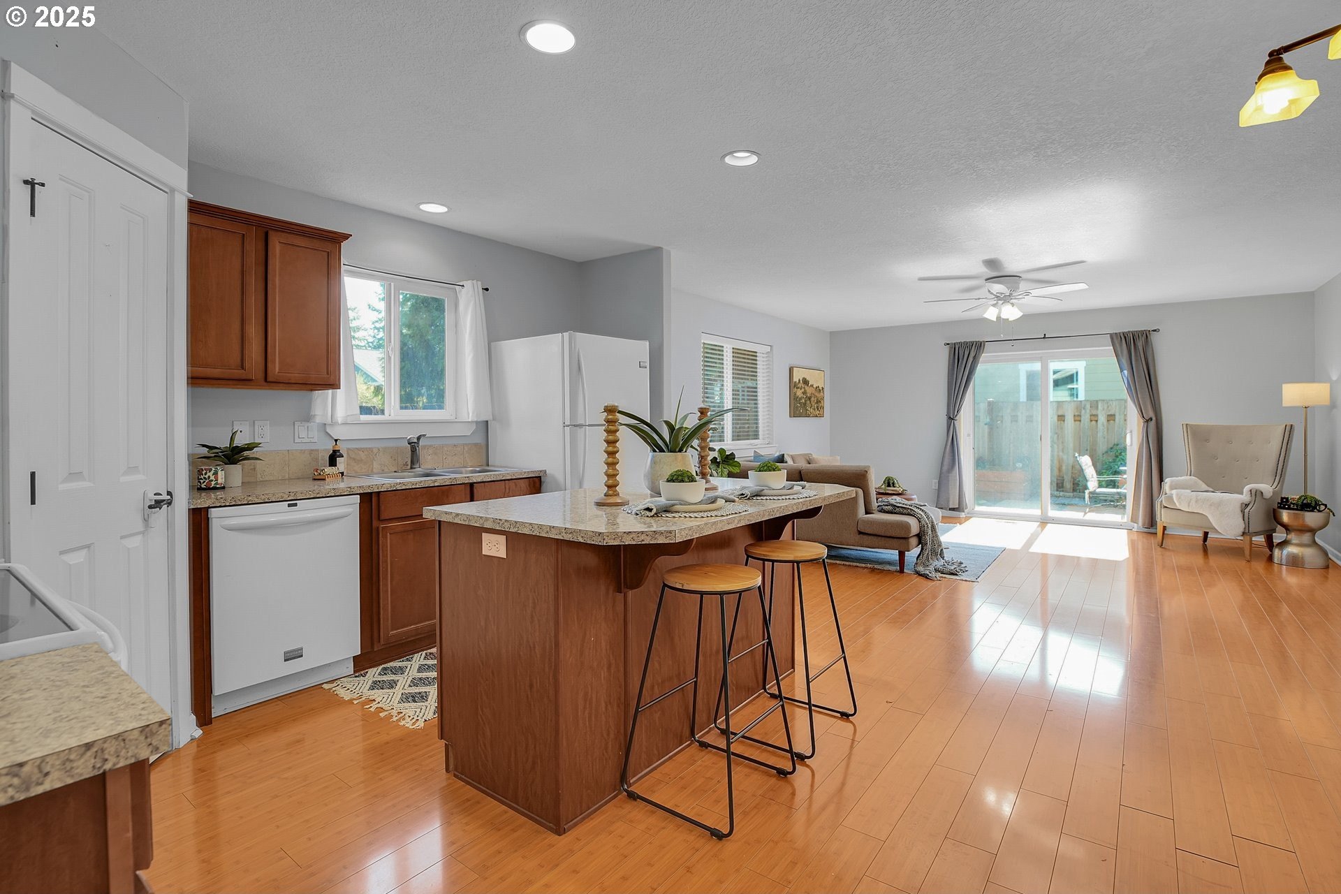 Charming, single-level home in Forest Grove. Welcome to this well maintained 3-bedroom, 2-bathroom home nestled in a quiet Forest Grove neighborhood. Designed for comfort and convenience, this single-level residence features an open floorplan that effortlessly connects the living, dining, and kitchen areas—perfect for entertaining or everyday living. Step inside to find bamboo flooring throughout the main living spaces, creating a warm and modern feel. The kitchen comes fully equipped with appliances included, making it truly move-in ready. Enjoy abundant natural light and a seamless indoor-outdoor flow to the back patio, ideal for relaxing or hosting summer barbecues. The backyard is low maintenance but still offers raised garden beds ready for your favorite vegetables and herbs. A new roof adds peace of mind and long-term value to this well-cared-for home. Located just minutes from parks, schools, shops, and downtown Forest Grove, this home offers the perfect balance of suburban tranquility and urban convenience. Don't miss your chance to own this wonderful home —schedule a showing today! Open houses this Saturday and Sunday from 12-2pm