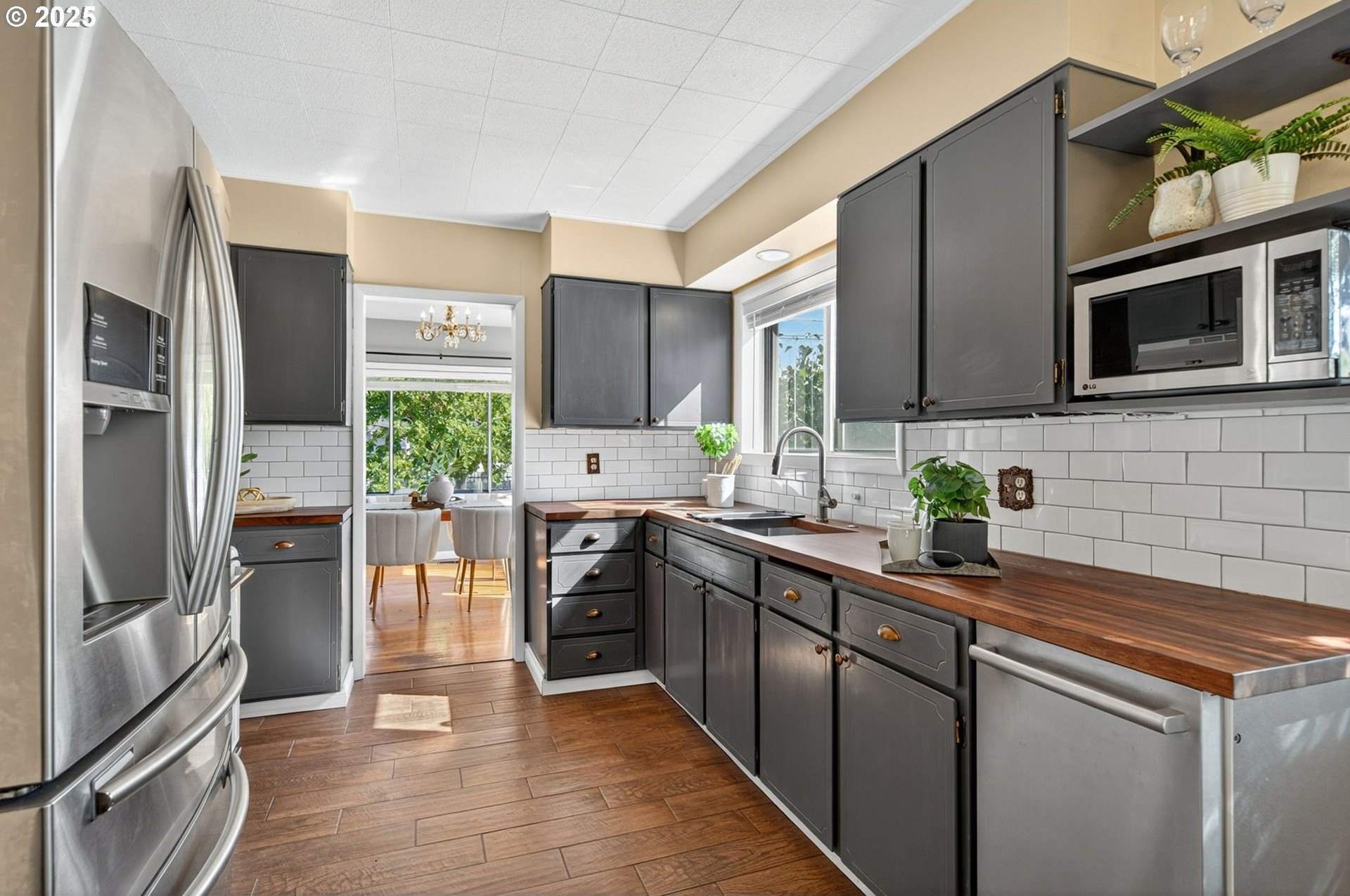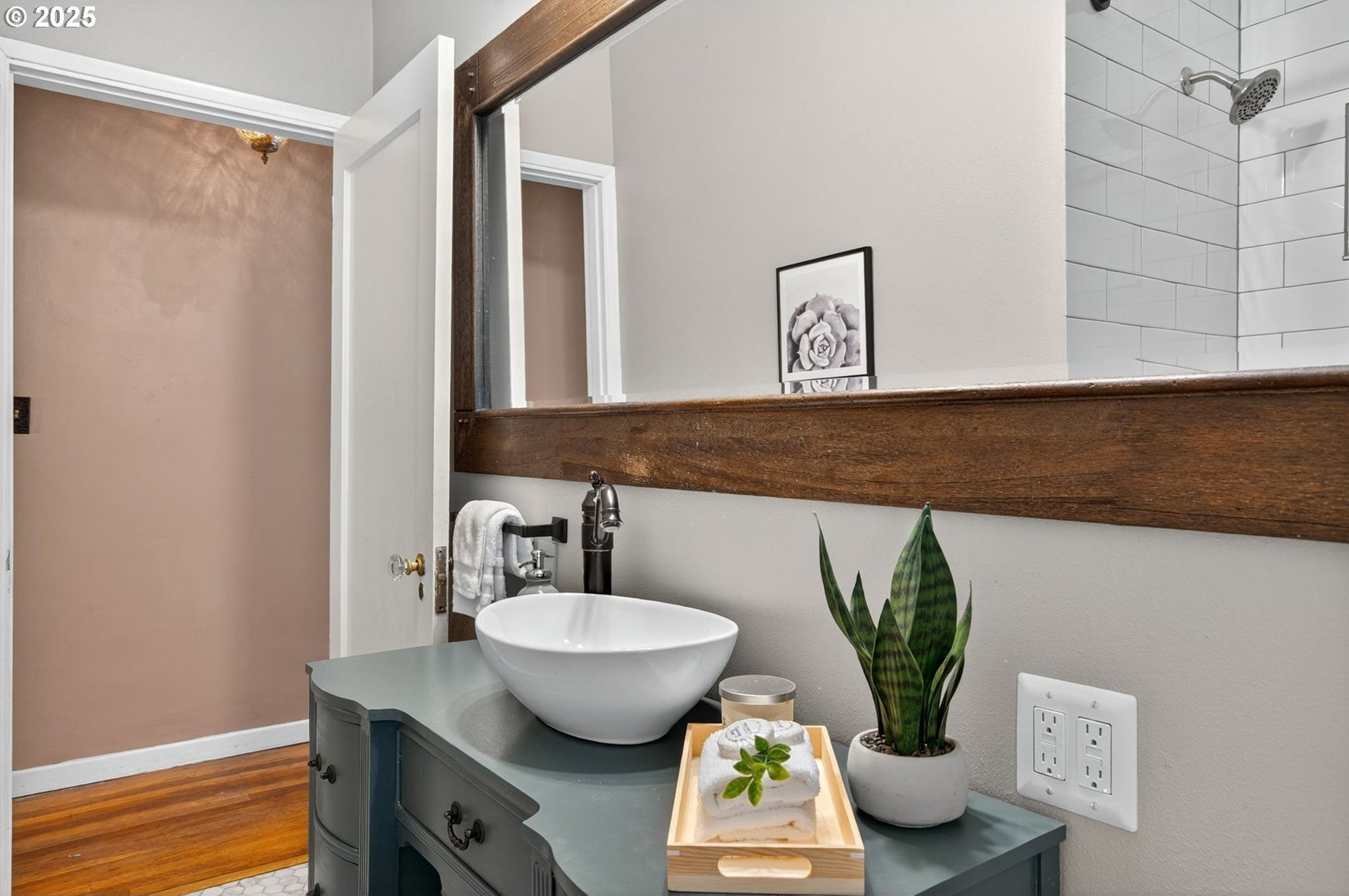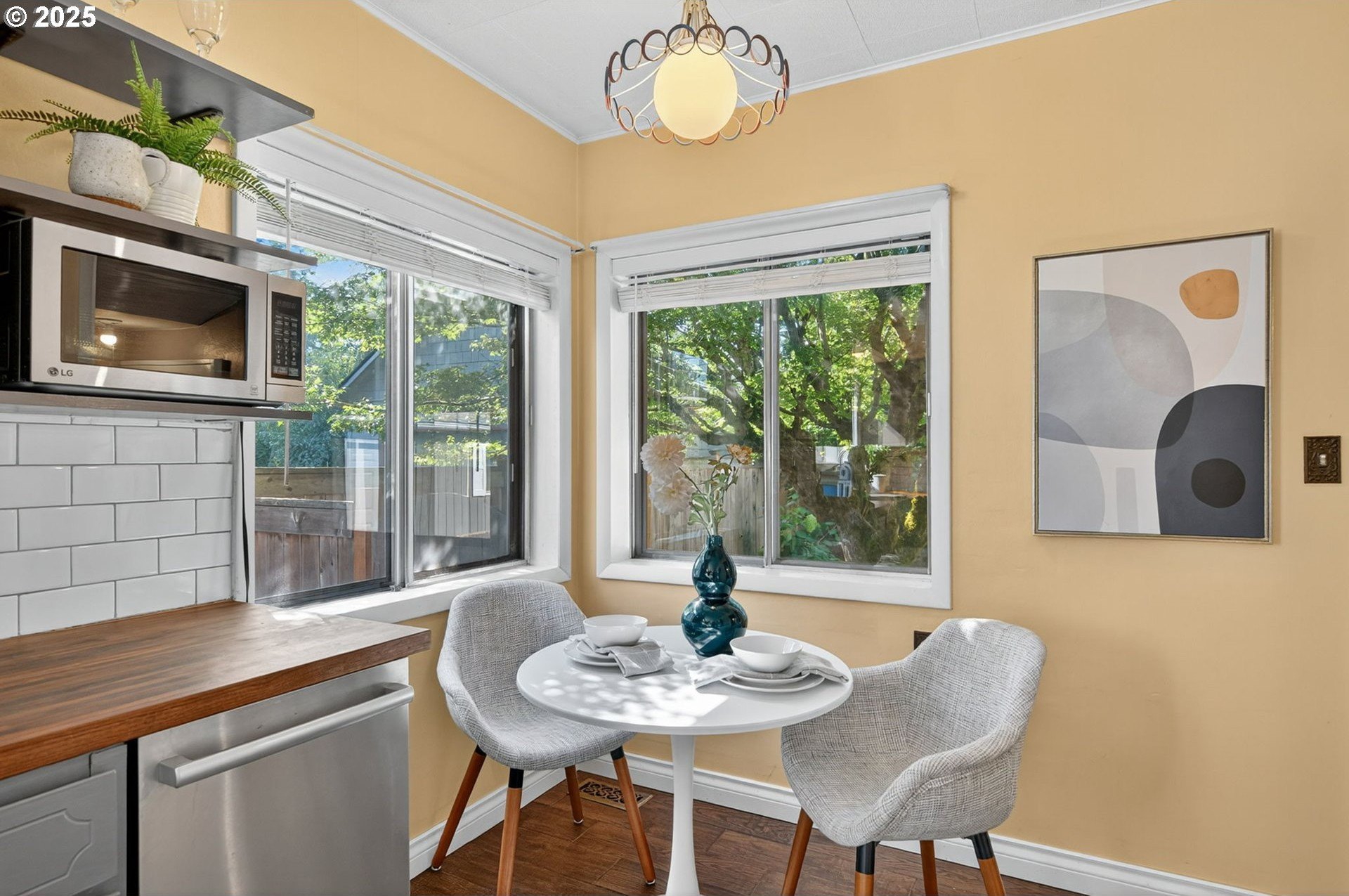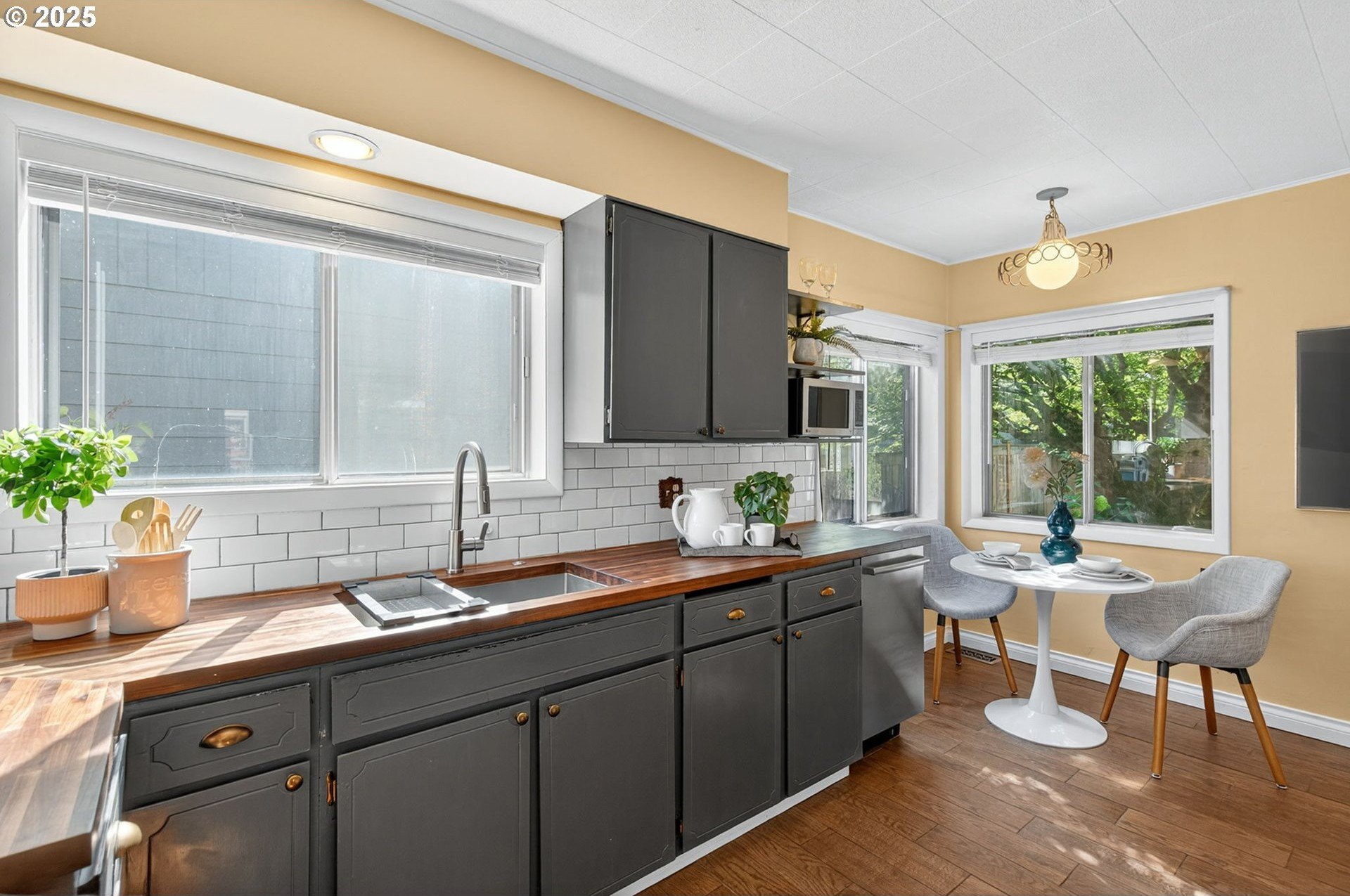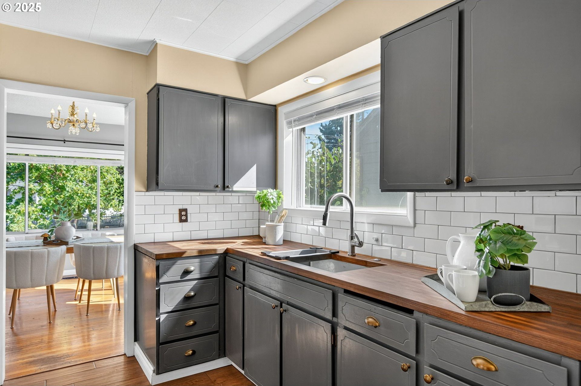 Welcome to this charming 1926 Cape Cod Revival in Portland’s Foster-Powell neighborhood. The main floor features a spacious living room with original hardwood floors, a wood burning fireplace, and large windows, along with a formal dining room, a kitchen with butcher block counters and a breakfast nook, a full bath, and a generously sized bedroom. Upstairs you will find two large bedrooms and a half bath with hall access to an upper deck overlooking the yard. The basement offers laundry, abundant storage, and space for a playroom or office. With a separate exterior connection from the covered patio, the basement provides potential for an ADU conversion subject to city approval while still allowing patio access for the main home. Outside, enjoy a covered patio retreat with string lights and a ceiling fan perfect for summer evenings, garden beds for those who love to grow their own, and a detached garage that is ideal for parking, projects, or a studio. A long gated driveway provides plenty of space for RV parking. This home is close to neighborhood favorites including the newly renovated Holgate Library, Mt. Scott Community Center & Park, Essex Park, and the soon to be renovated Portland Mercado with its vibrant food carts and community gatherings. Schedule your showing today!