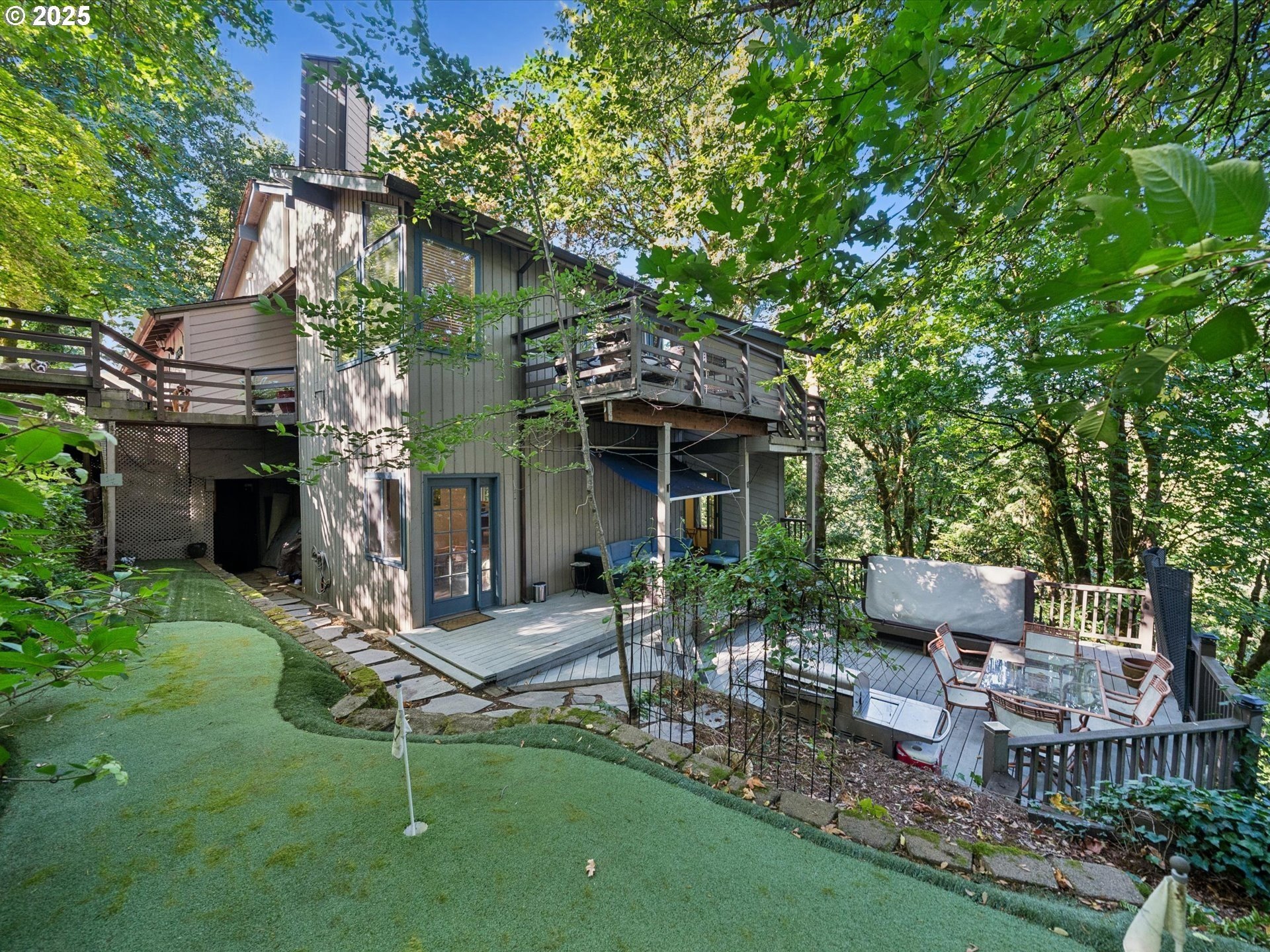 Rare NW Contemporary Tree house in West Linn! Such a cool private vibe with vaulted ceilings, exposed beams, large windows, hardwood floors, multiple balconies with tree filled views, massive deck with hot tub and even a miniature golf course. Trending tri-level floor plan. Main has a cozy fireplace in the living room, large dining with balcony, and large granite gourmet kitchen. Upper has a massive primary with balcony, living space, walk in closet, double vanity and tiled shower along with a large vaulted bright loft or meditation room. Lower basement has a separate entrance, two bedrooms both with exterior access to the deck,full bath with tiled in shower, game room, theater and has been ran as a successful short term rental for years! Make extra cash flow or simply enjoy the extra space for entertaining. Amazing Hidden Springs location with great schools, easy access to freeways and shopping.