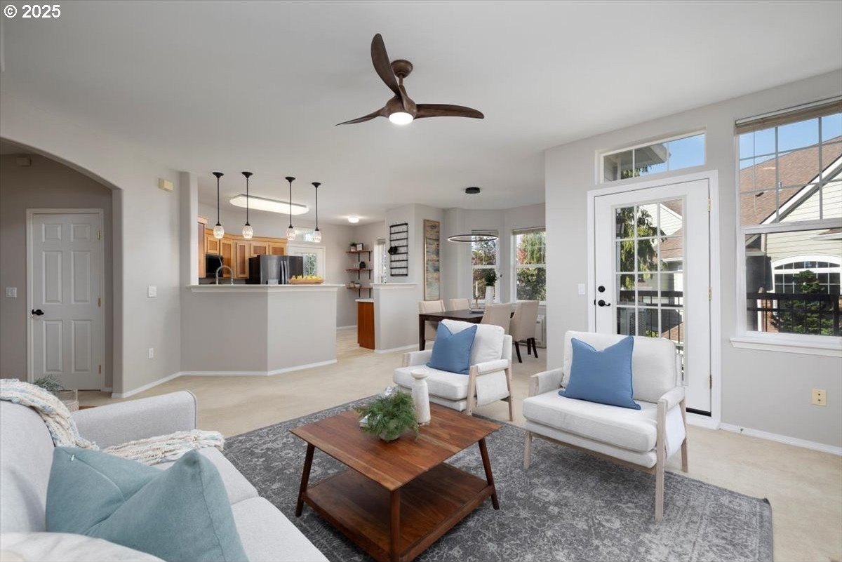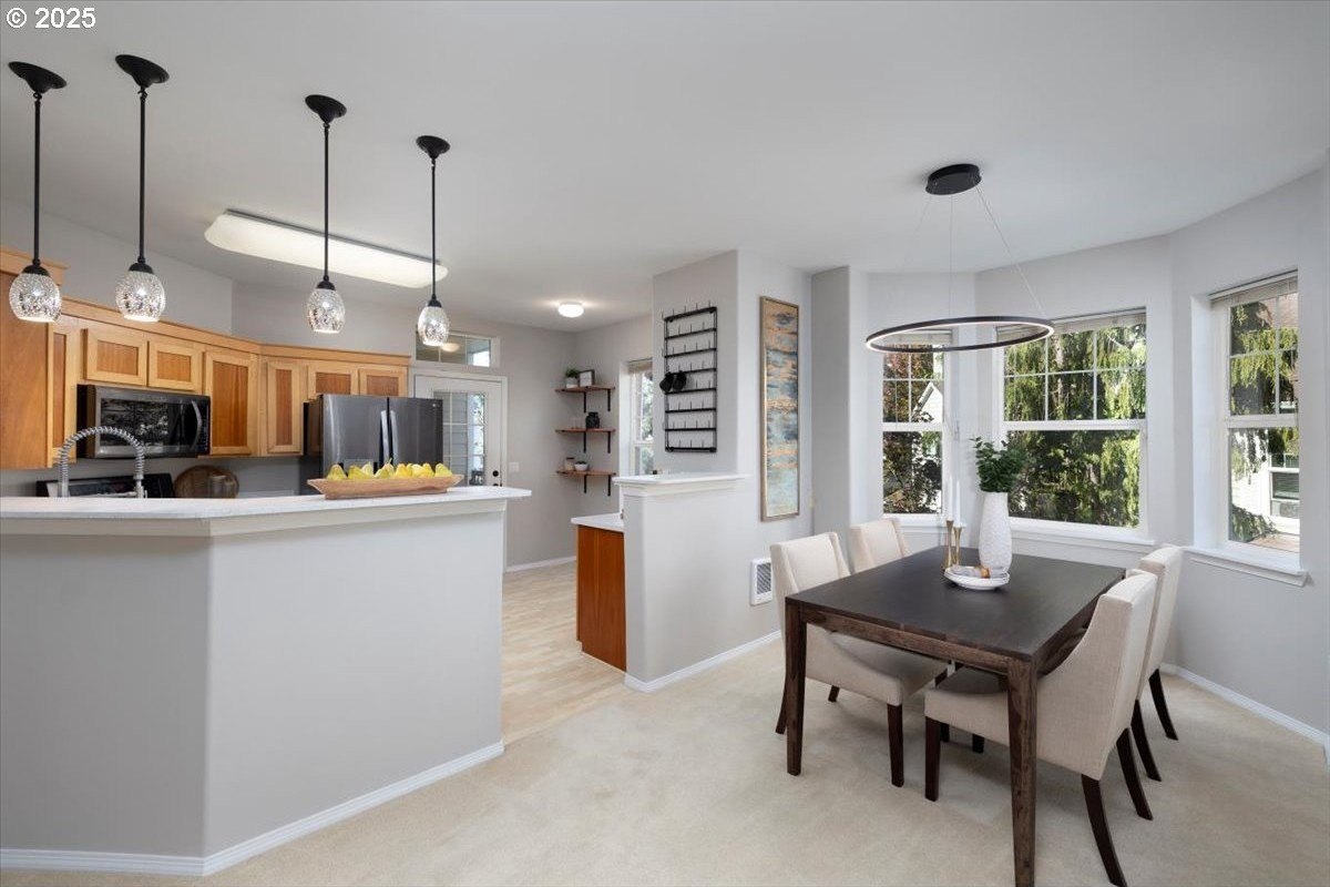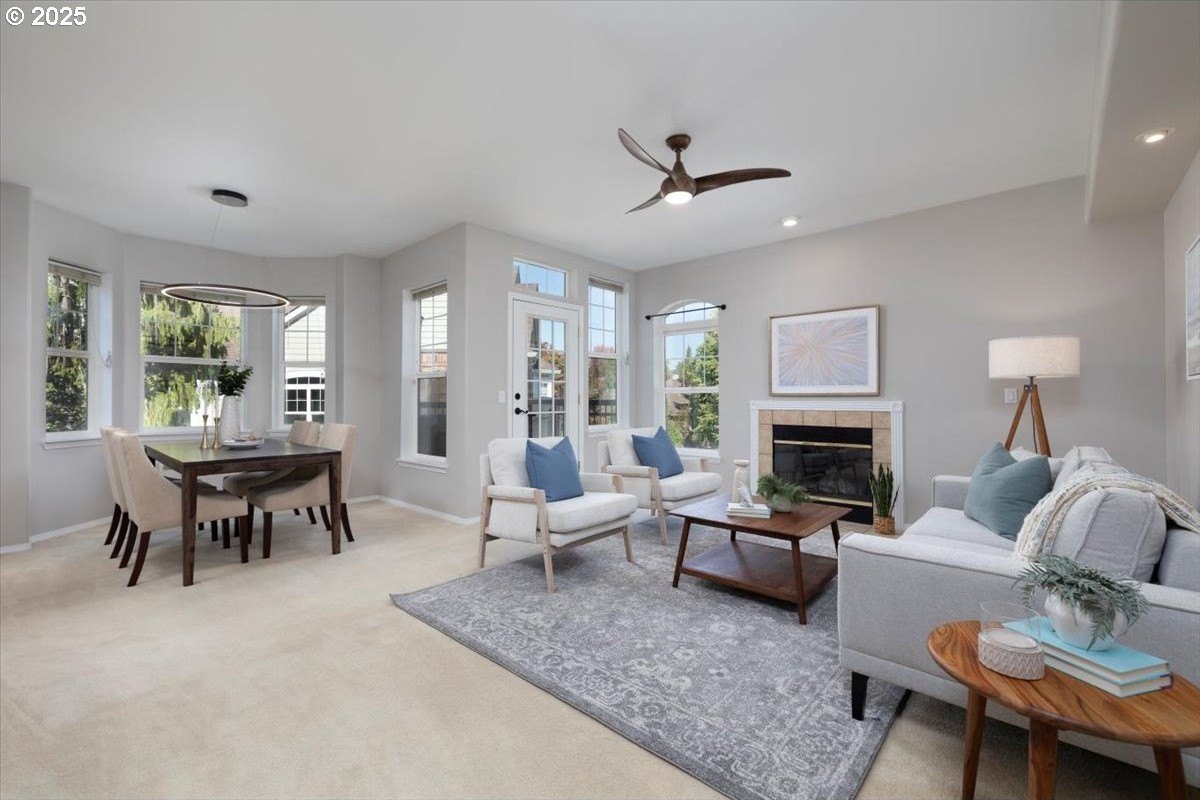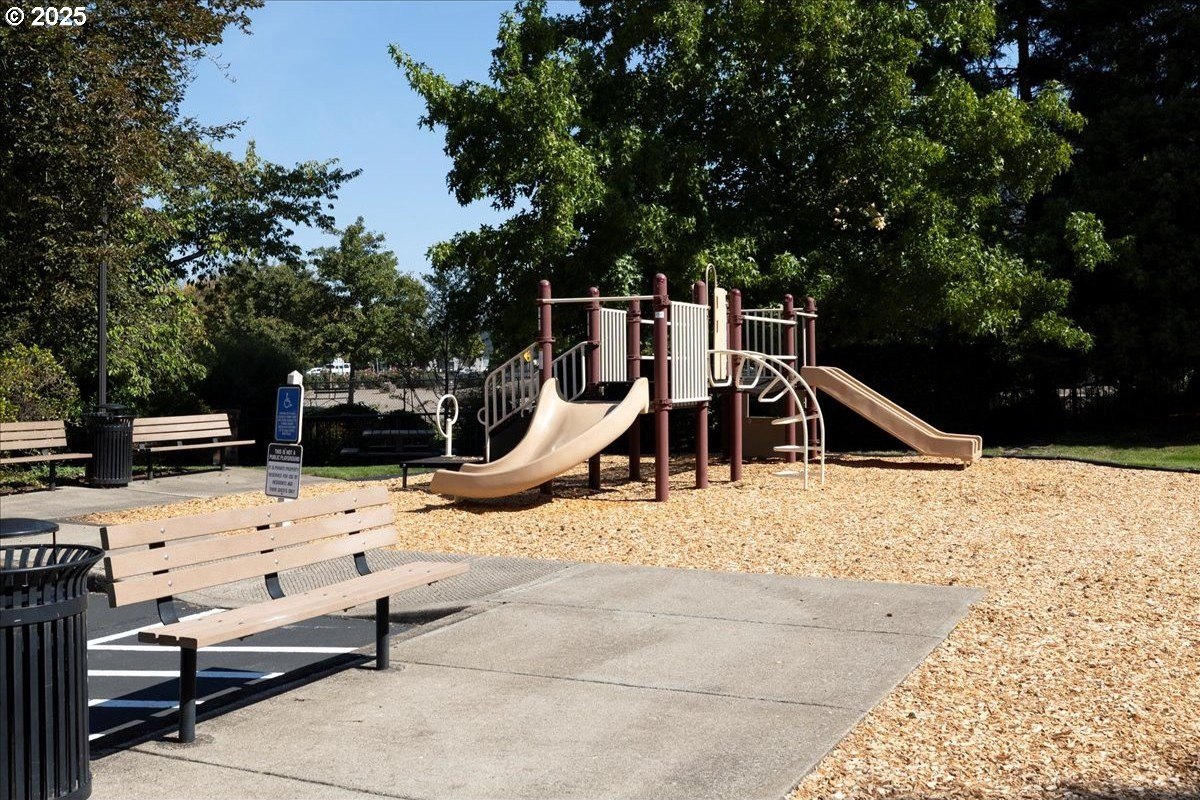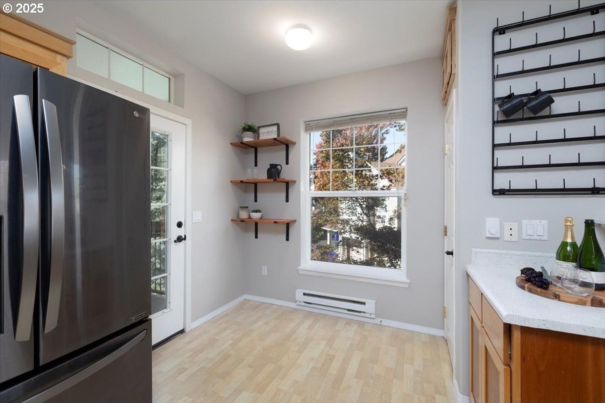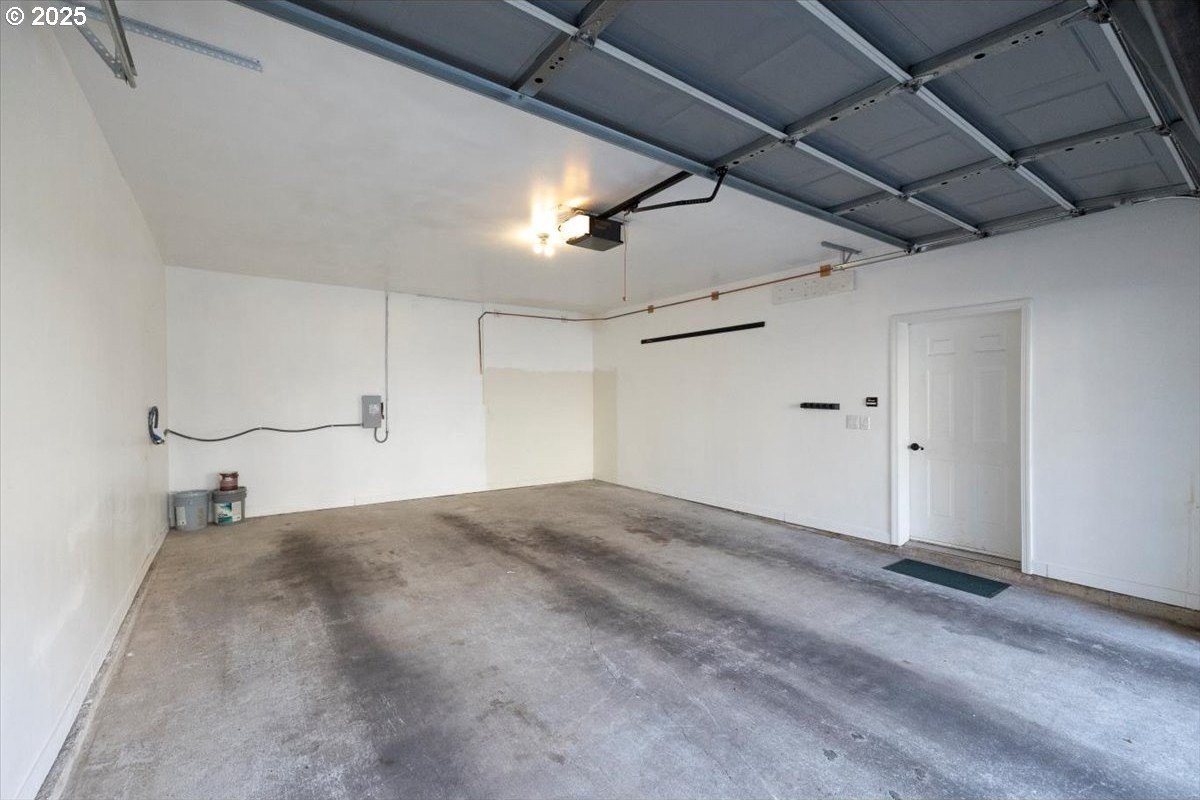Welcome to highly sought-after Orenco Station! This gorgeous corner-unit condo offers 2 bedrooms, 2 bathrooms, and an oversized attached 2-car garage (side by side) with an EV charger. Freshly painted and move-in ready, the home features a bright and inviting open floor plan. The living room includes a cozy wood-burning fireplace and deck access, while the spacious bayed dining area flows seamlessly into the kitchen—complete with granite bar seating, a pantry, nook, and newer stainless steel appliances (refrigerator included). The primary suite boasts a large walk-in closet and private deck, and you’ll appreciate the additional office space with built-in desk and shelving. A generous laundry and storage room (washer and dryer included) adds convenience. South-facing windows flood the home with natural light, while a newer mini-split heat pump ensures comfort year-round. HOA covers water and sewer. Just outside your door, enjoy the vibrant Orenco Station neighborhood with New Seasons Market, restaurants, cafes, and MAX Light Rail all within easy reach.