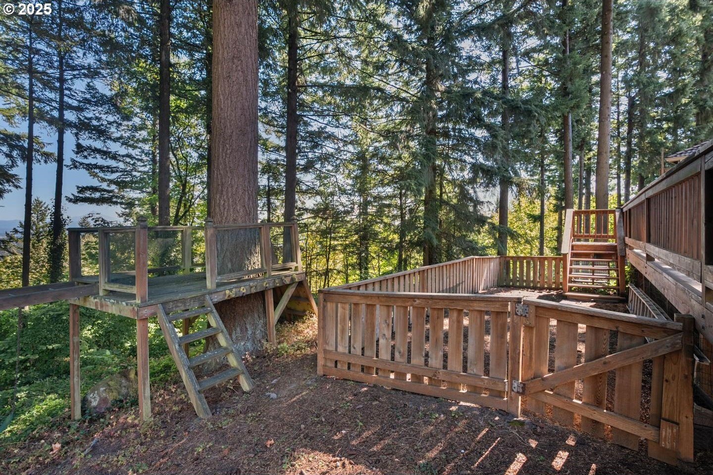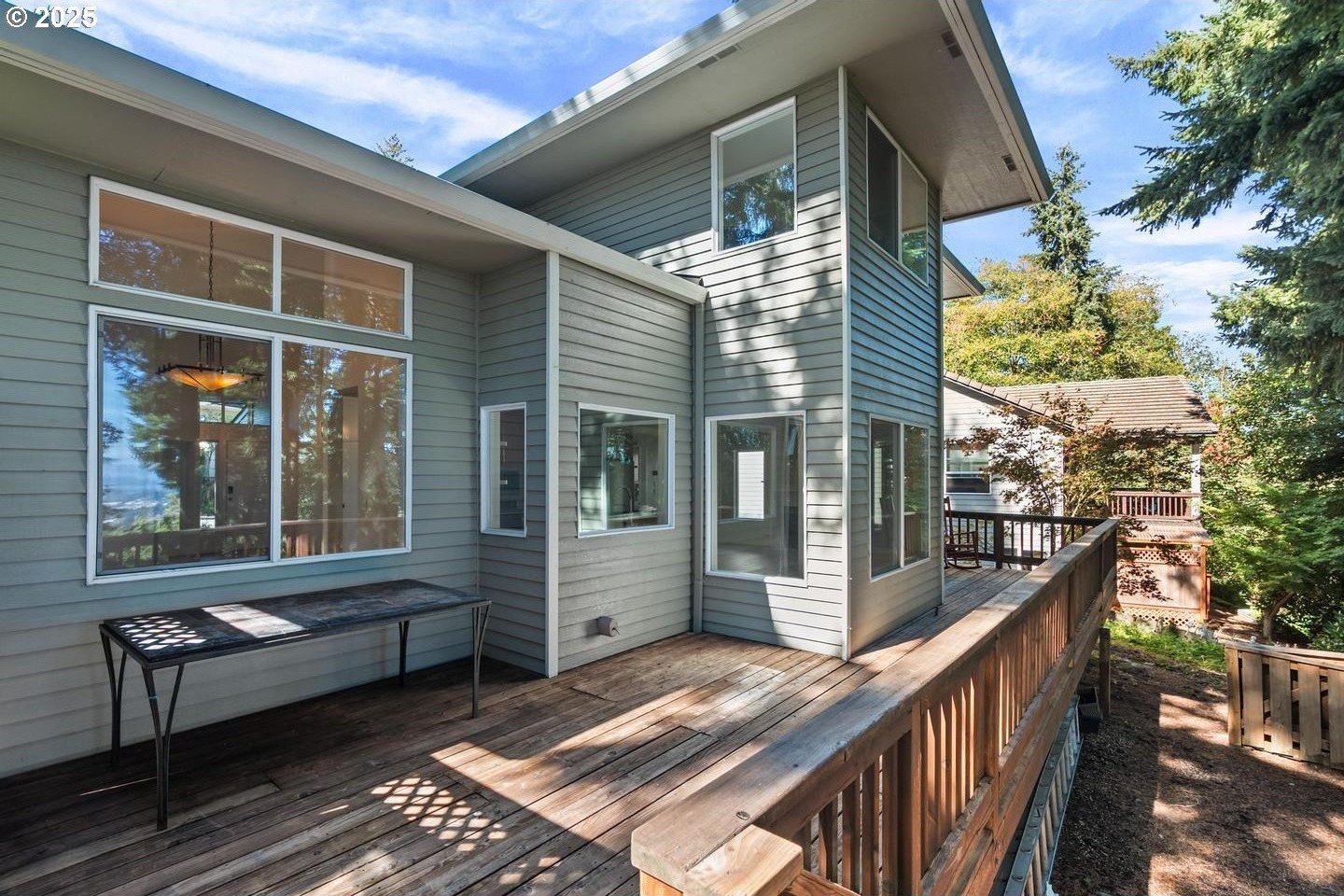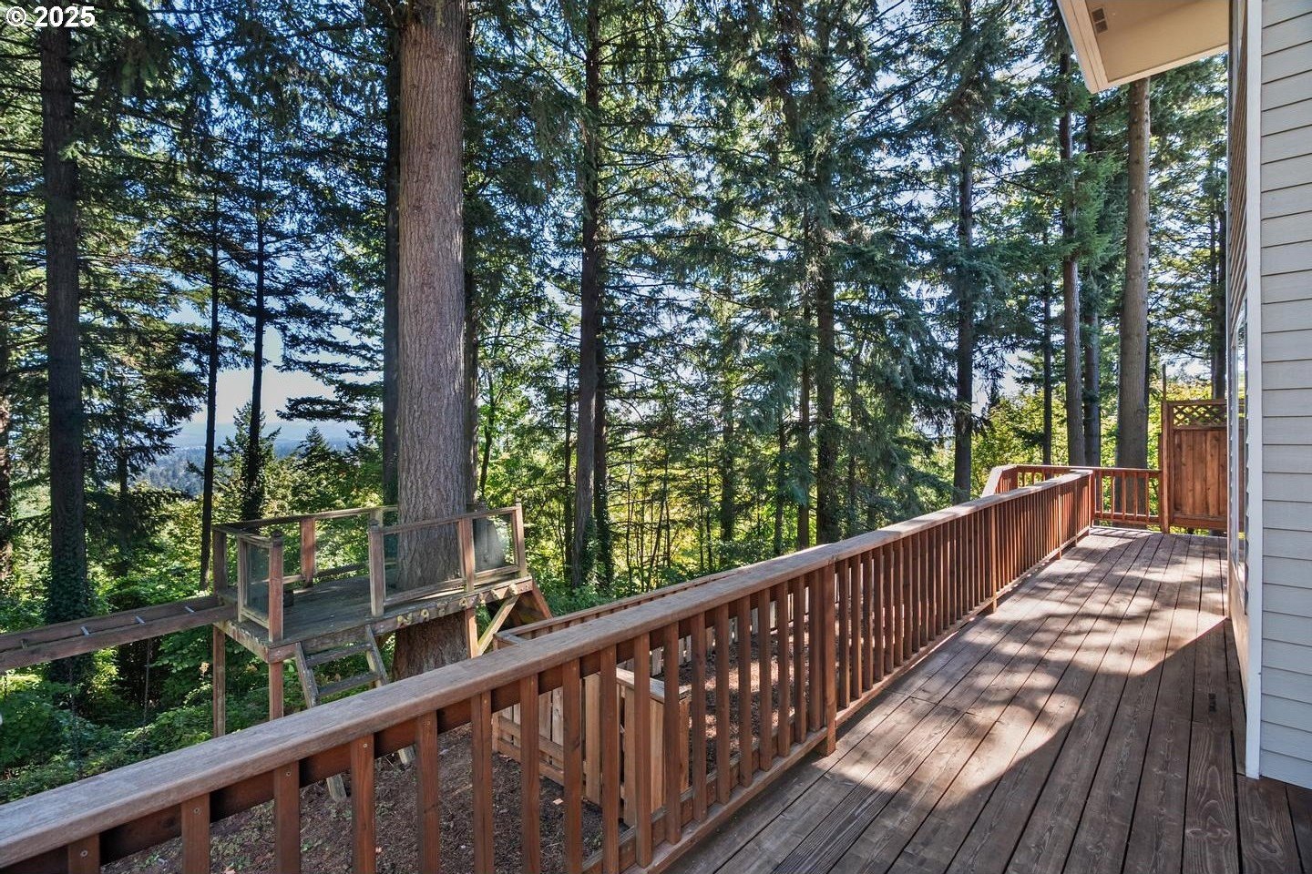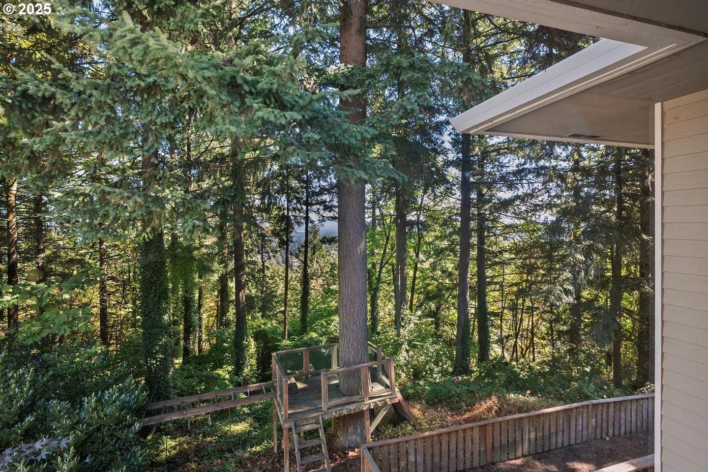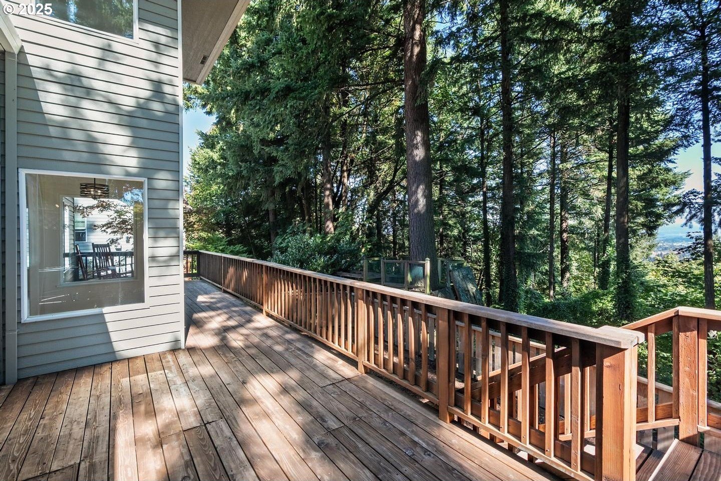 Perched atop Rocky Butte in a quiet cul-de-sac, this beautifully remodeled home offers breathtaking views and a rare private setting beside the historic landmark. Surrounded by lush evergreens, it seamlessly blends modern updates with natural beauty. Step inside to soaring vaulted ceilings and light-filled living spaces, where walls of windows frame serene forest views. The spacious kitchen boasts quartz counters, a large island with a gas Wolf cooktop, new cabinetry, top-of-the-line appliances, and gleaming hardwood floors—all opening to a cozy family room with a fireplace. Glass door leads to a large deck with amazing views, perfect for morning coffee or evening gatherings. Upstairs, the owner’s suite is a peaceful retreat with stunning views, a walk-in closet, and a spa-like bath featuring brushed gold fixtures, heated tile floors, and a walk-in shower. Throughout the home, you’ll find new cabinetry, quartz counters, tile, flooring, designer finishes, and contemporary lighting. Nestled next to the historic Rocky Butte Viewpoint Park with access to a 2.7-mile bike/hike trail, this home offers both tranquility and convenience—just minutes from city amenities. Remodeled in 2024 with new presidential roof, furnace, water heater, plumbing, electrical, SS appliances, cabinets, quartz counters, tile, & much more. A rare opportunity to own a pristine, one-of-a-kind retreat! [Home Energy Score = 4. HES Report at https://rpt.greenbuildingregistry.com/hes/OR10232648]