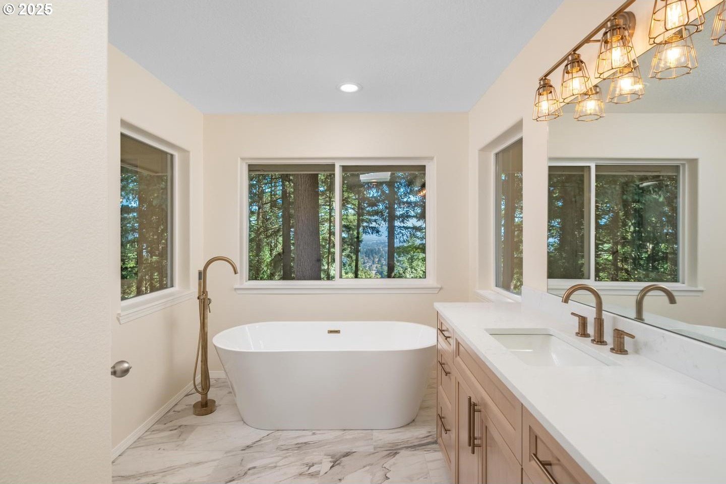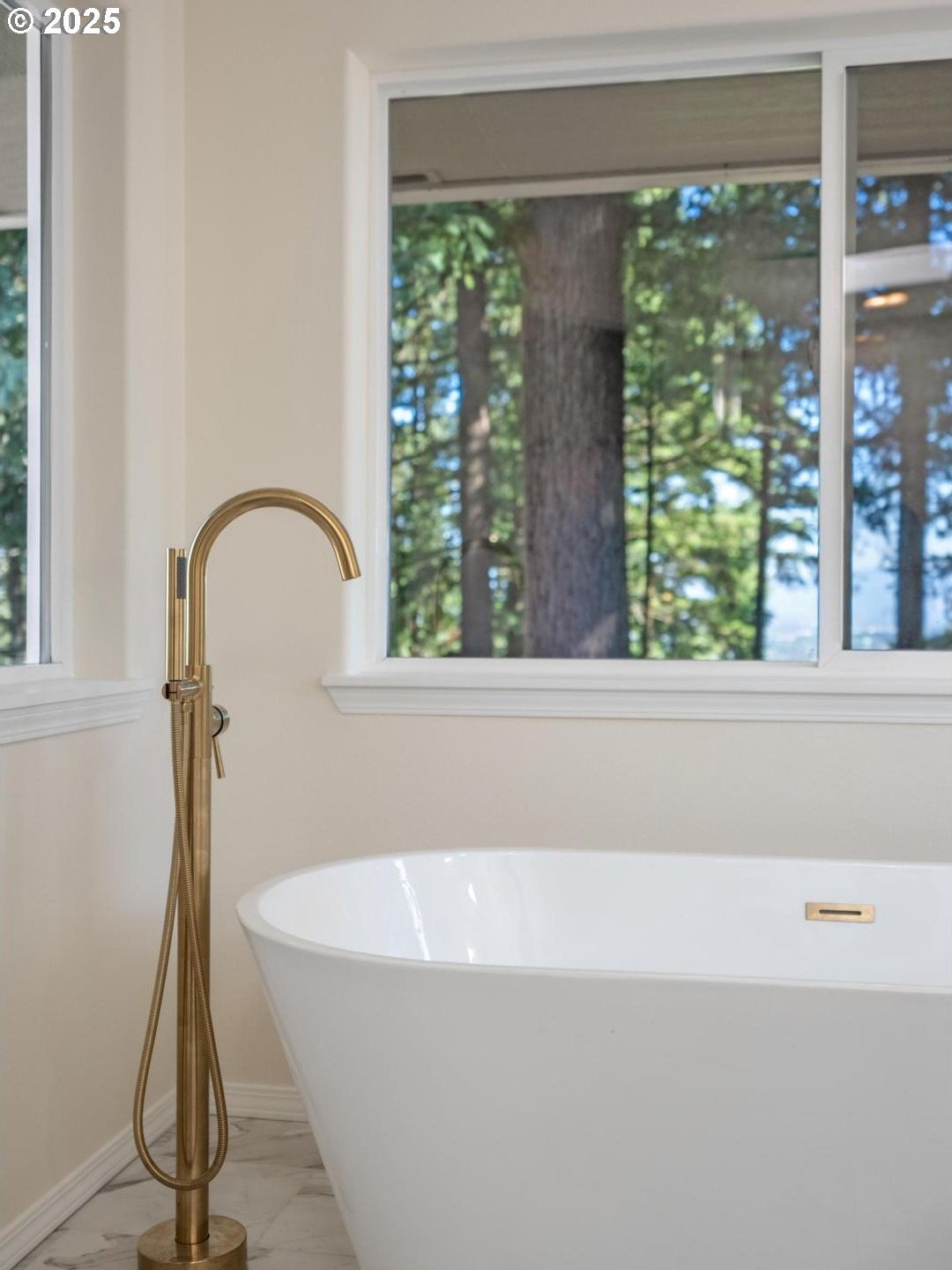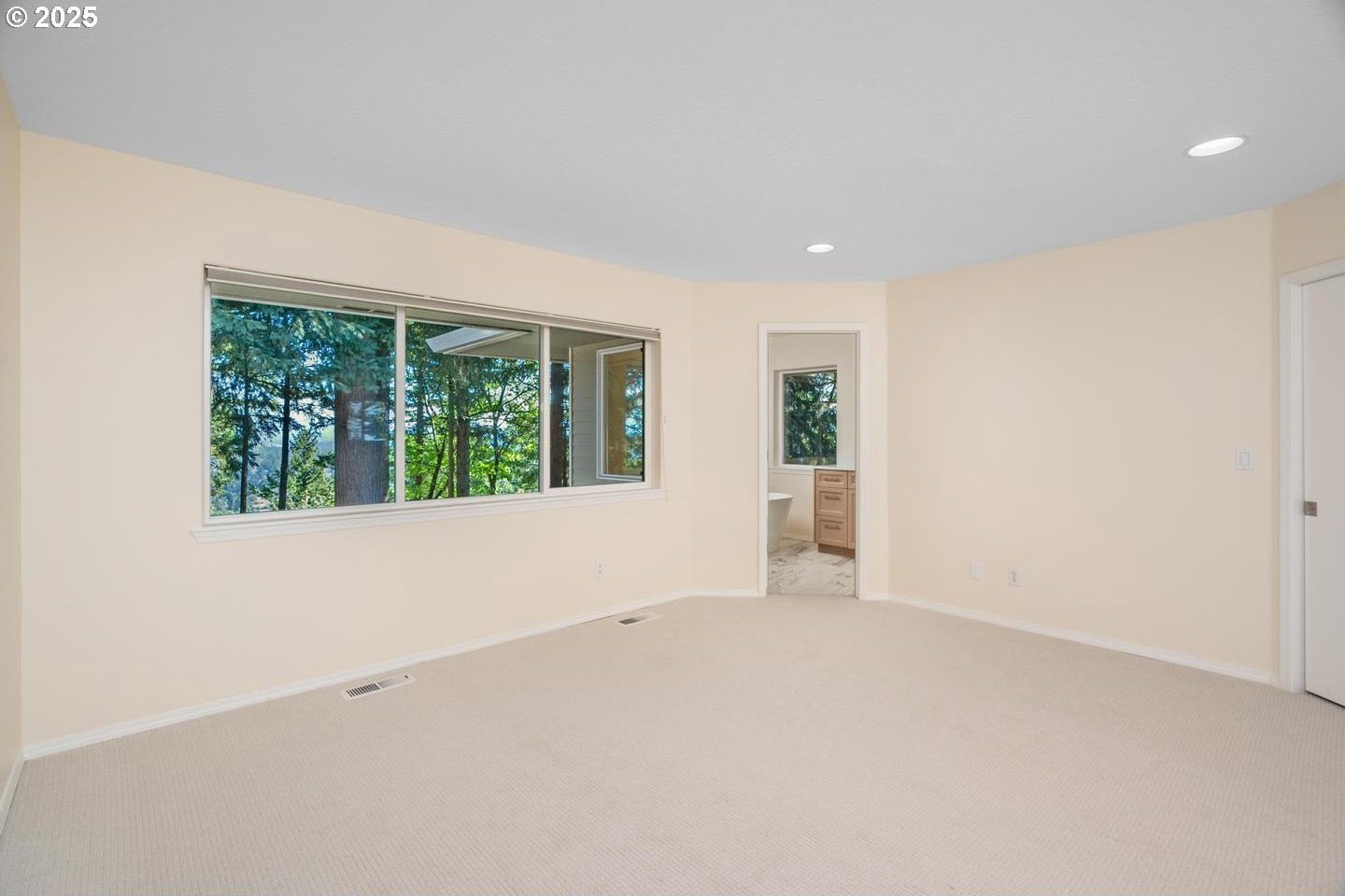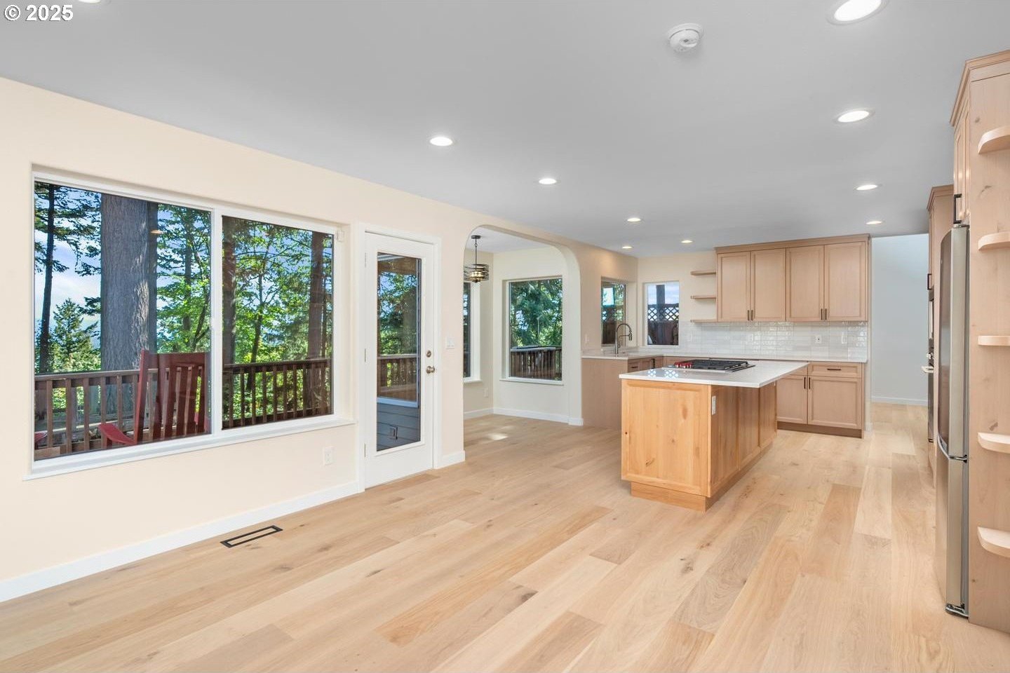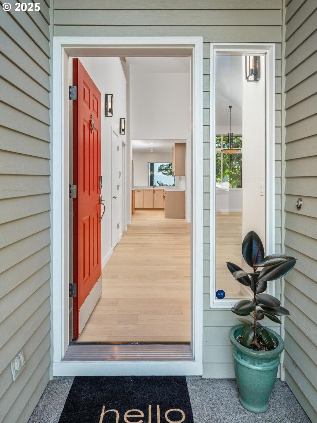 Perched atop Rocky Butte in a quiet cul-de-sac, this beautifully remodeled home offers breathtaking views and a rare private setting beside the historic landmark. Surrounded by lush evergreens, it seamlessly blends modern updates with natural beauty. Step inside to soaring vaulted ceilings and light-filled living spaces, where walls of windows frame serene forest views. The spacious kitchen boasts quartz counters, a large island with a gas Wolf cooktop, new cabinetry, top-of-the-line appliances, and gleaming hardwood floors—all opening to a cozy family room with a fireplace. Glass door leads to a large deck with amazing views, perfect for morning coffee or evening gatherings. Upstairs, the owner’s suite is a peaceful retreat with stunning views, a walk-in closet, and a spa-like bath featuring brushed gold fixtures, heated tile floors, and a walk-in shower. Throughout the home, you’ll find new cabinetry, quartz counters, tile, flooring, designer finishes, and contemporary lighting. Nestled next to the historic Rocky Butte Viewpoint Park with access to a 2.7-mile bike/hike trail, this home offers both tranquility and convenience—just minutes from city amenities. Remodeled in 2024 with new presidential roof, furnace, water heater, plumbing, electrical, SS appliances, cabinets, quartz counters, tile, & much more. A rare opportunity to own a pristine, one-of-a-kind retreat! [Home Energy Score = 4. HES Report at https://rpt.greenbuildingregistry.com/hes/OR10232648]