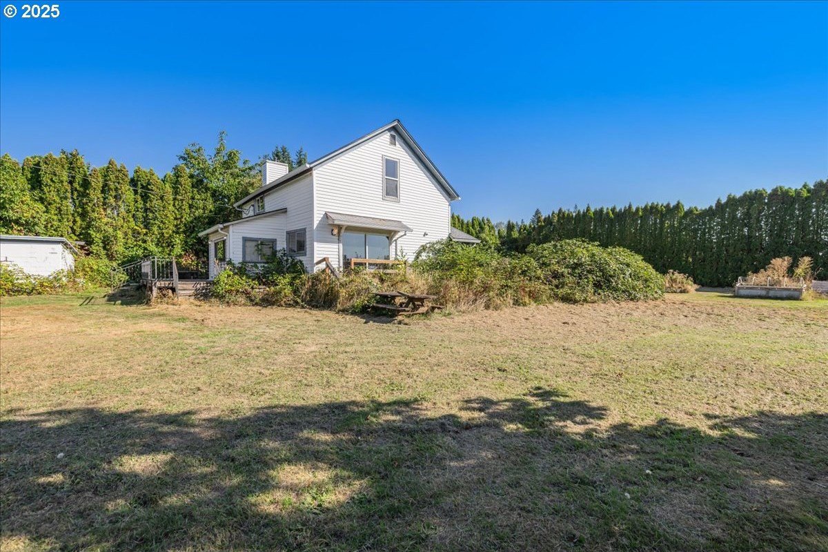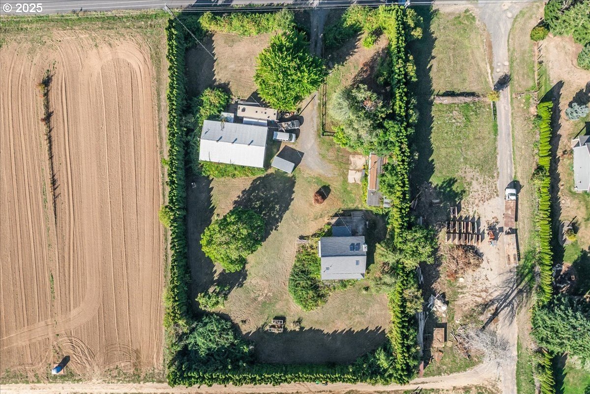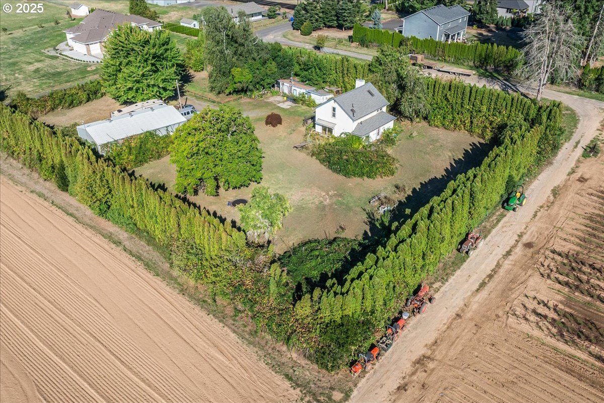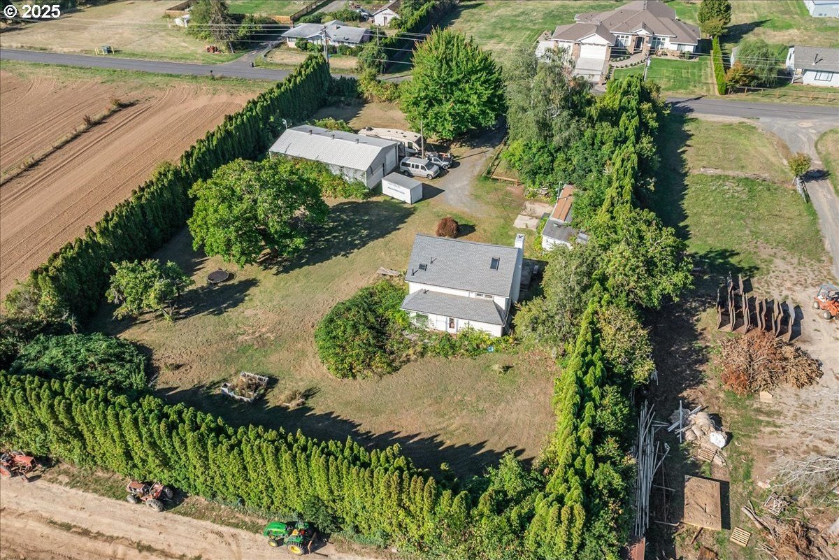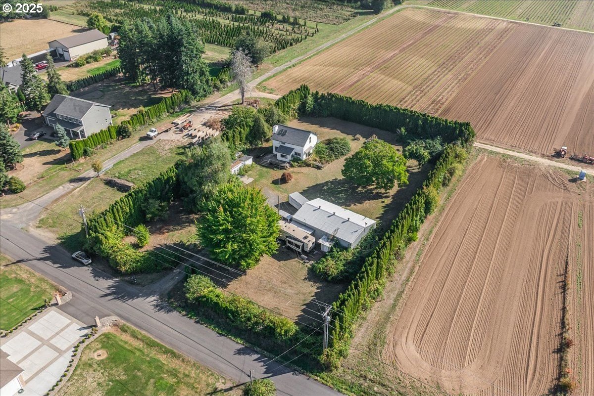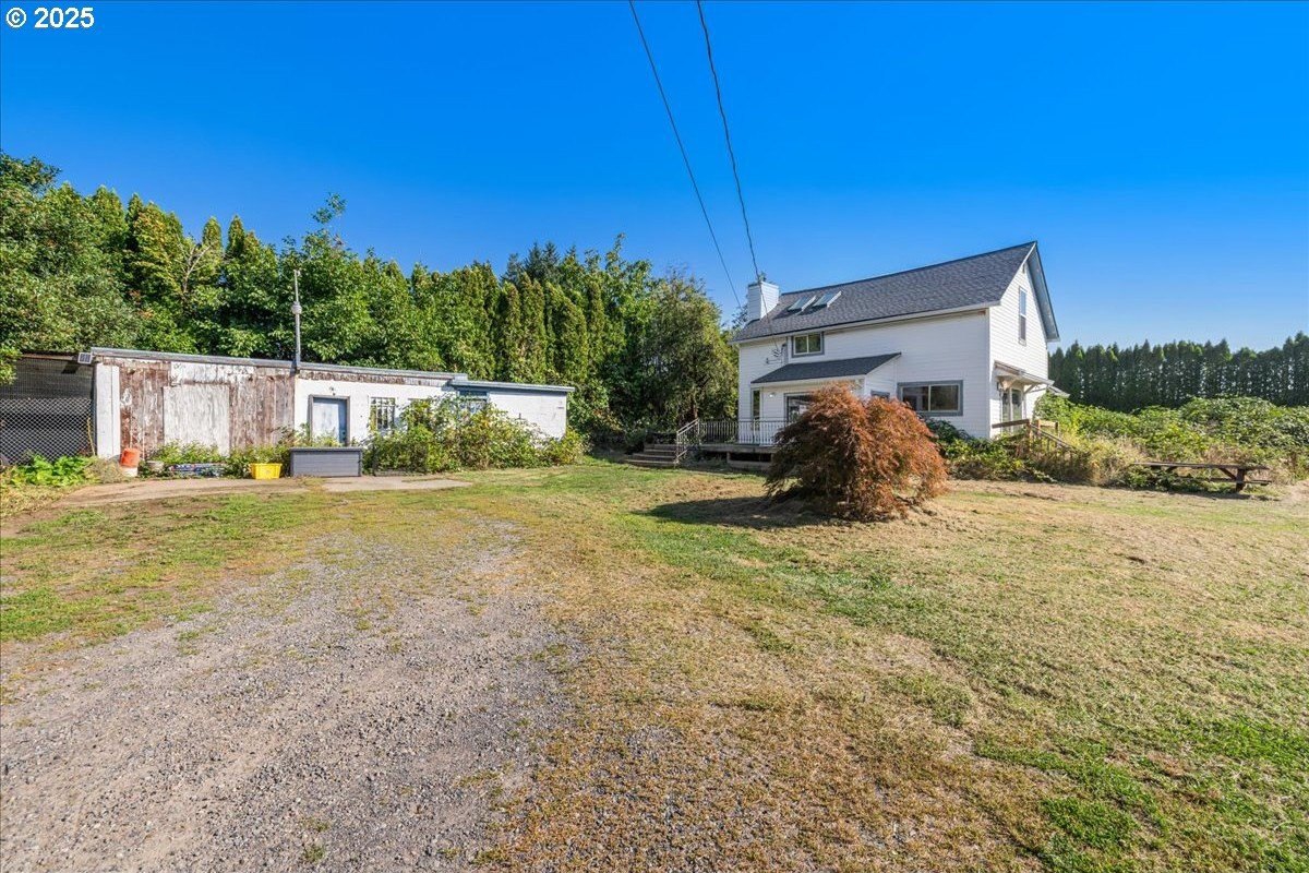 Surrounded by open land and a blend of upscale and country-style properties, this farmhouse fixer rests on a flat, rectangular 1 acre lot enclosed by lush arborvitae, and surrounded by a nursery for privacy—offering endless potential to craft your dream home. Amazing Mt. Hood views are waiting to be rediscovered behind the trees. Major updates have already been completed, including a newer roof and gutters (2024) with transferable warranties, newer skylights for natural light, and a remodeled kitchen with IKEA cabinetry under warranty, custom extended Acacia wood island, under-cabinet outlets, and newer appliances. Original hardwood floors lie beneath the subfloor! A butler’s pantry with extra sink and storage, a false chimney with capped gas line ready for a fireplace, and included remodel supplies like new flooring, walk-in shower, flagstone, and pavers, add to the potential.The land and outbuildings bring even more opportunity. A large shop features a loft, wood-burning fireplace, 400-amp separate commercial meter, a setup for welding, and offers a full auto lift! A smaller shop with power and water, add flexibility, along with an RV pad with 50-amp service and water. The property also includes a secured chicken and duck coop, and multiple water spigots. Organically grown (Never chemically treated) producing walnut, apple, pear, and plum trees, plus blackberries, lemon balm, and raised garden beds. Perfect for a micro-farm!With privacy, usable land, and infrastructure already in place, this property is ideal for investors, contractors, or buyers ready to finish it into something truly special.