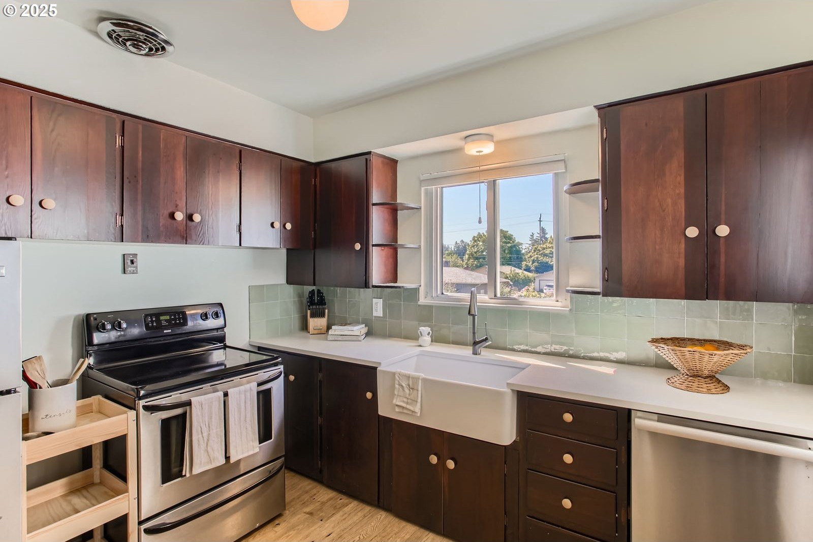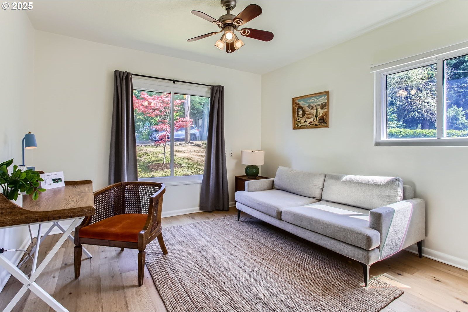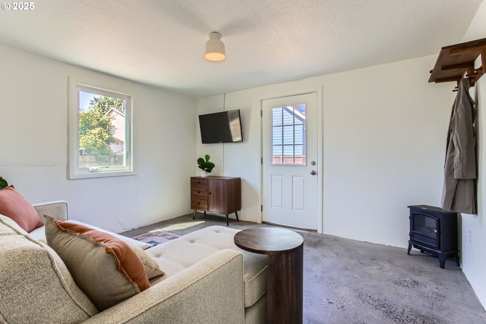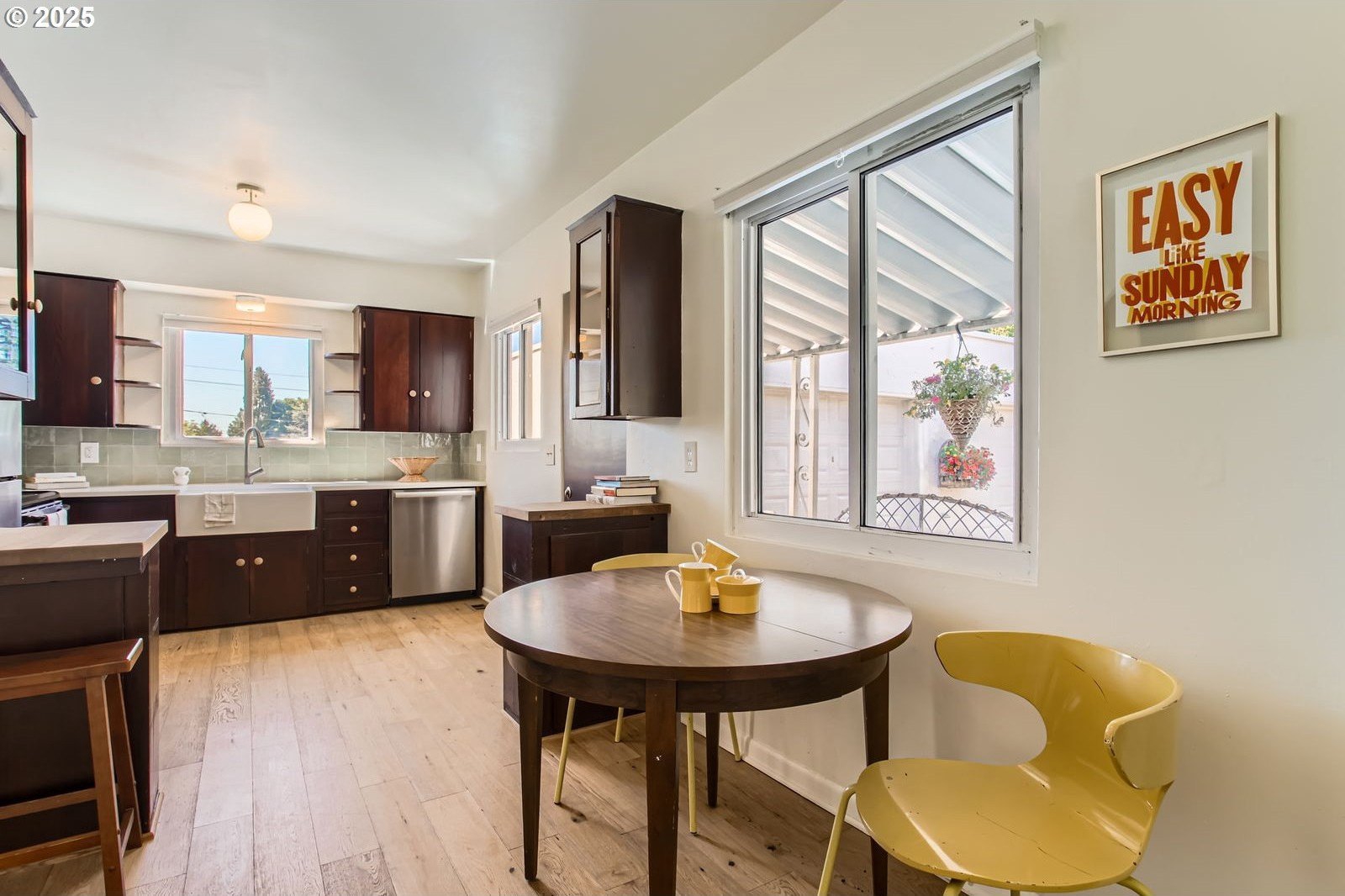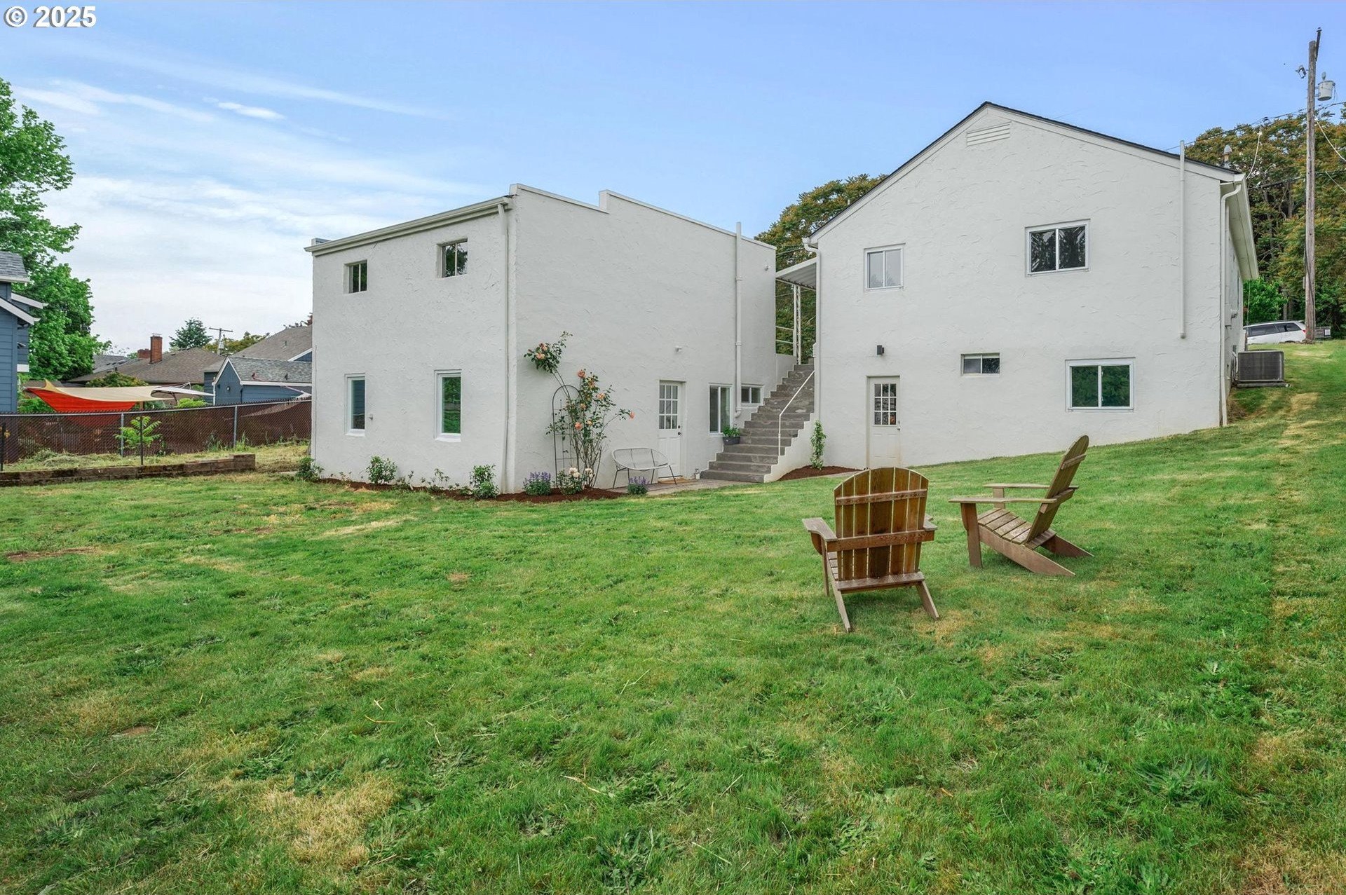 Perched in a peaceful setting with sweeping views of Rocky Butte, this charming bungalow/ranch offers remarkable flexibility with TWO SEPARATE UNITS,for shared living or instant income potential. Restored to its original character in 2022,the main home features hardwood floors, an updated kitchen w/quartz countertops,farmhouse sink, handmade tile, & Miele dishwasher. The living room centers around a cozy wood-burning fireplace,perfect for quiet evenings or entertaining. Charming archways and spacious bedrooms. The lower level provides flexibility to grow with your needs, featuring a daylight basement with a half bath and ample space to create a third bedroom, guest suite, or even a third separate living unit. All new in 2022: Heat pump furnace, Central Air. A separate apartment (fully renovated in 2025) original 2BD/1BA apartment complete with its own electrical meter—makes this an ideal standalone unit. It features brand-new casement windows, new plumbing, new electrical, new heat,polished concrete floors, new kitchen cabinets with walnut counters, a vintage range, new water heater, and new washer/dryer hookups. All brand new updates. Enthusiasts of all kinds will appreciate the oversized two-car garage, ideal for use as a studio, workshop, storage, or more, with two brand new garage doors and openers (2024). The large lot opens up endless options: subdivide (buyer to verify), create urban garden, build additional outbuildings or dwellings by exploring further development. Just blocks from the People’s Courts, local restaurants, new food cart pods, as well as ongoing streetscape improvements on 82nd. Across from a community garden and surrounded by great neighbors, frequent dog walkers headed to Rocky Butte and the ideal spot to enjoy sunsets. [Home Energy Score = 2. HES Report at https://rpt.greenbuildingregistry.com/hes/OR10197146]