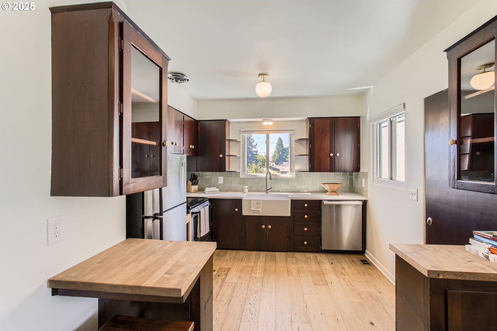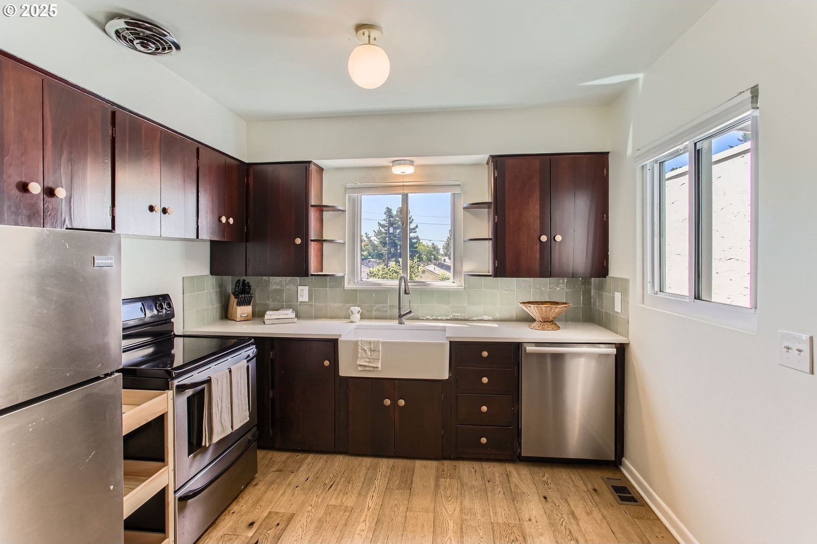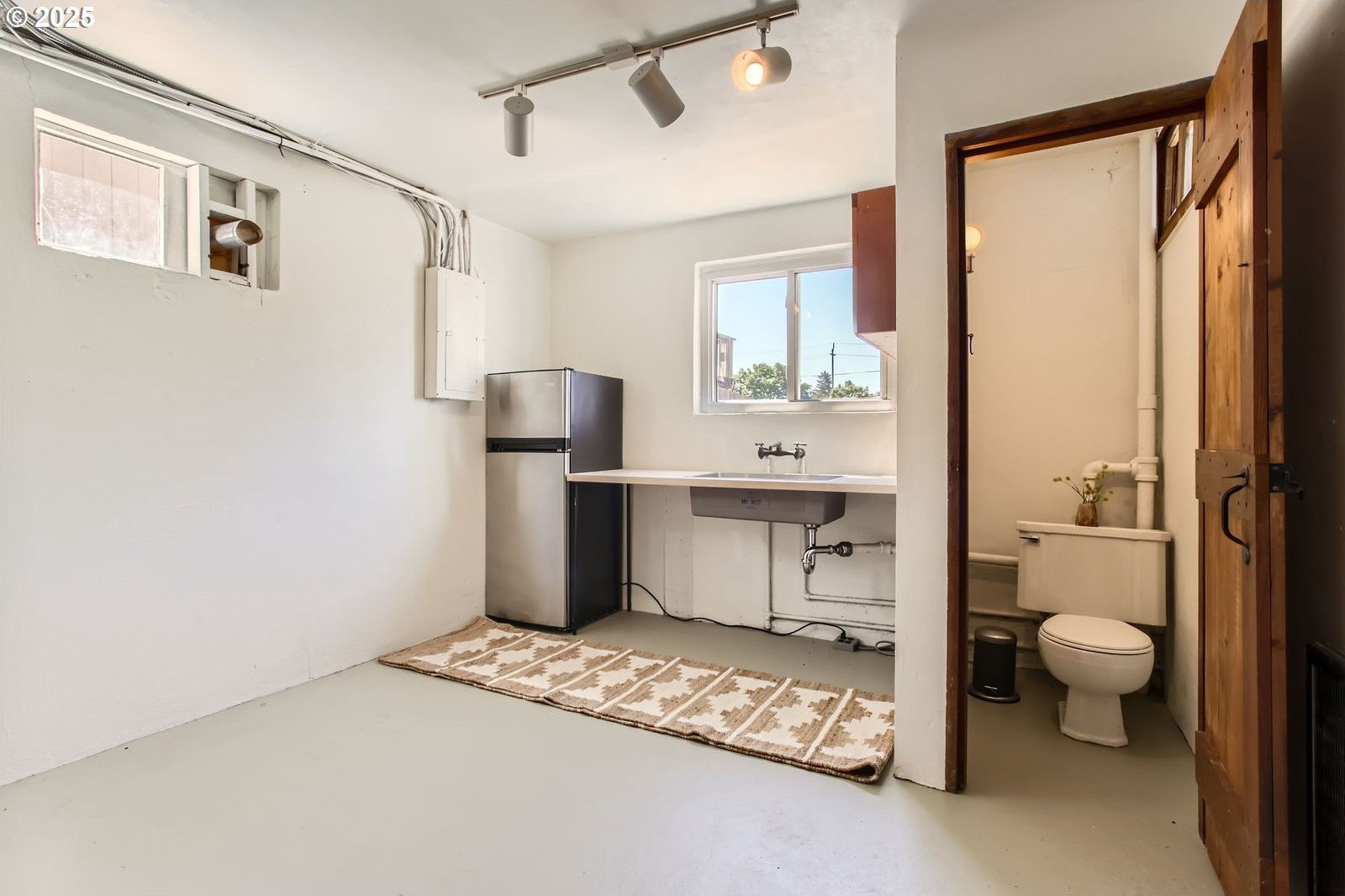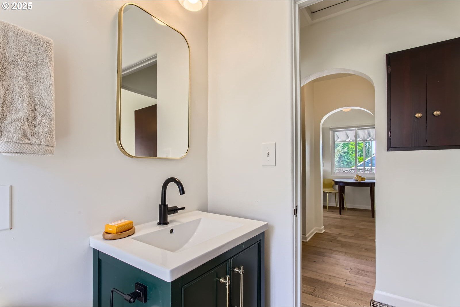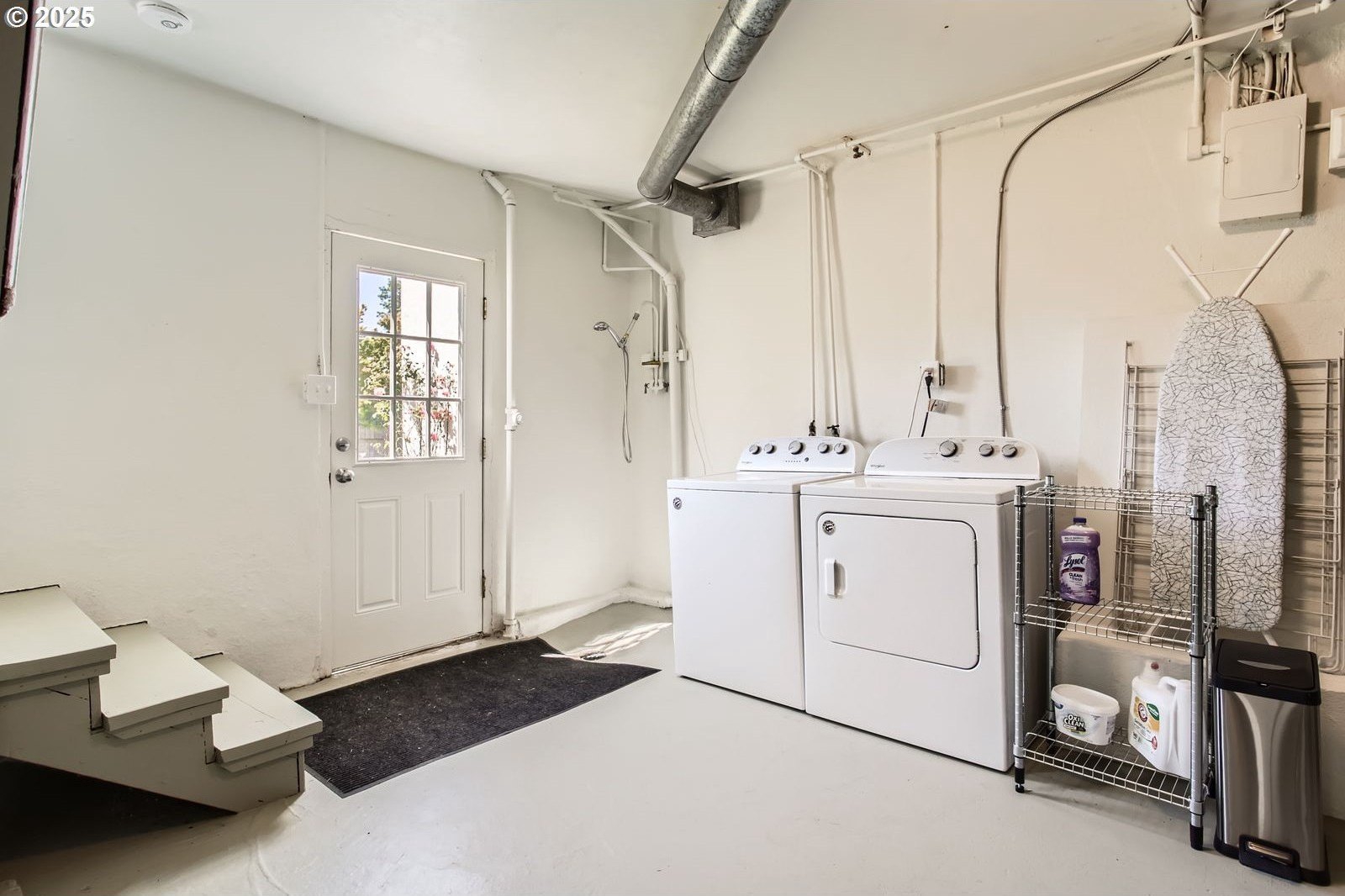Perched in a peaceful setting with sweeping views of Rocky Butte, this charming bungalow/ranch offers remarkable flexibility with TWO SEPARATE UNITS,for shared living or instant income potential. Restored to its original character in 2022,the main home features hardwood floors, an updated kitchen w/quartz countertops,farmhouse sink, handmade tile, & Miele dishwasher. The living room centers around a cozy wood-burning fireplace,perfect for quiet evenings or entertaining. Charming archways and spacious bedrooms. The lower level provides flexibility to grow with your needs, featuring a daylight basement with a half bath and ample space to create a third bedroom, guest suite, or even a third separate living unit. All new in 2022: Heat pump furnace, Central Air. A separate apartment (fully renovated in 2025) original 2BD/1BA apartment complete with its own electrical meter—makes this an ideal standalone unit. It features brand-new casement windows, new plumbing, new electrical, new heat,polished concrete floors, new kitchen cabinets with walnut counters, a vintage range, new water heater, and new washer/dryer hookups. All brand new updates. Enthusiasts of all kinds will appreciate the oversized two-car garage, ideal for use as a studio, workshop, storage, or more, with two brand new garage doors and openers (2024). The large lot opens up endless options: subdivide (buyer to verify), create urban garden, build additional outbuildings or dwellings by exploring further development. Just blocks from the People’s Courts, local restaurants, new food cart pods, as well as ongoing streetscape improvements on 82nd. Across from a community garden and surrounded by great neighbors, frequent dog walkers headed to Rocky Butte and the ideal spot to enjoy sunsets. [Home Energy Score = 2. HES Report at https://rpt.greenbuildingregistry.com/hes/OR10197146]