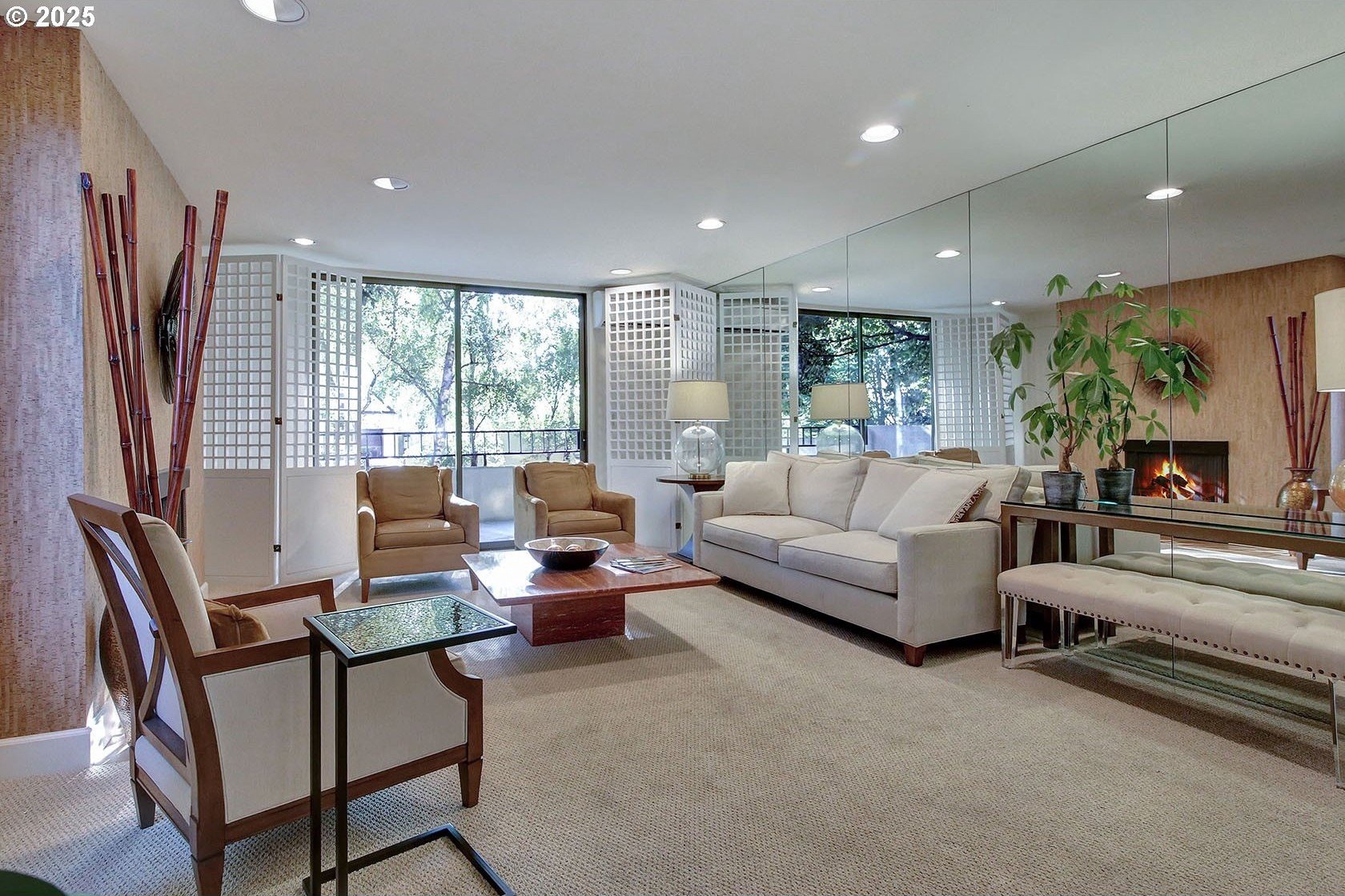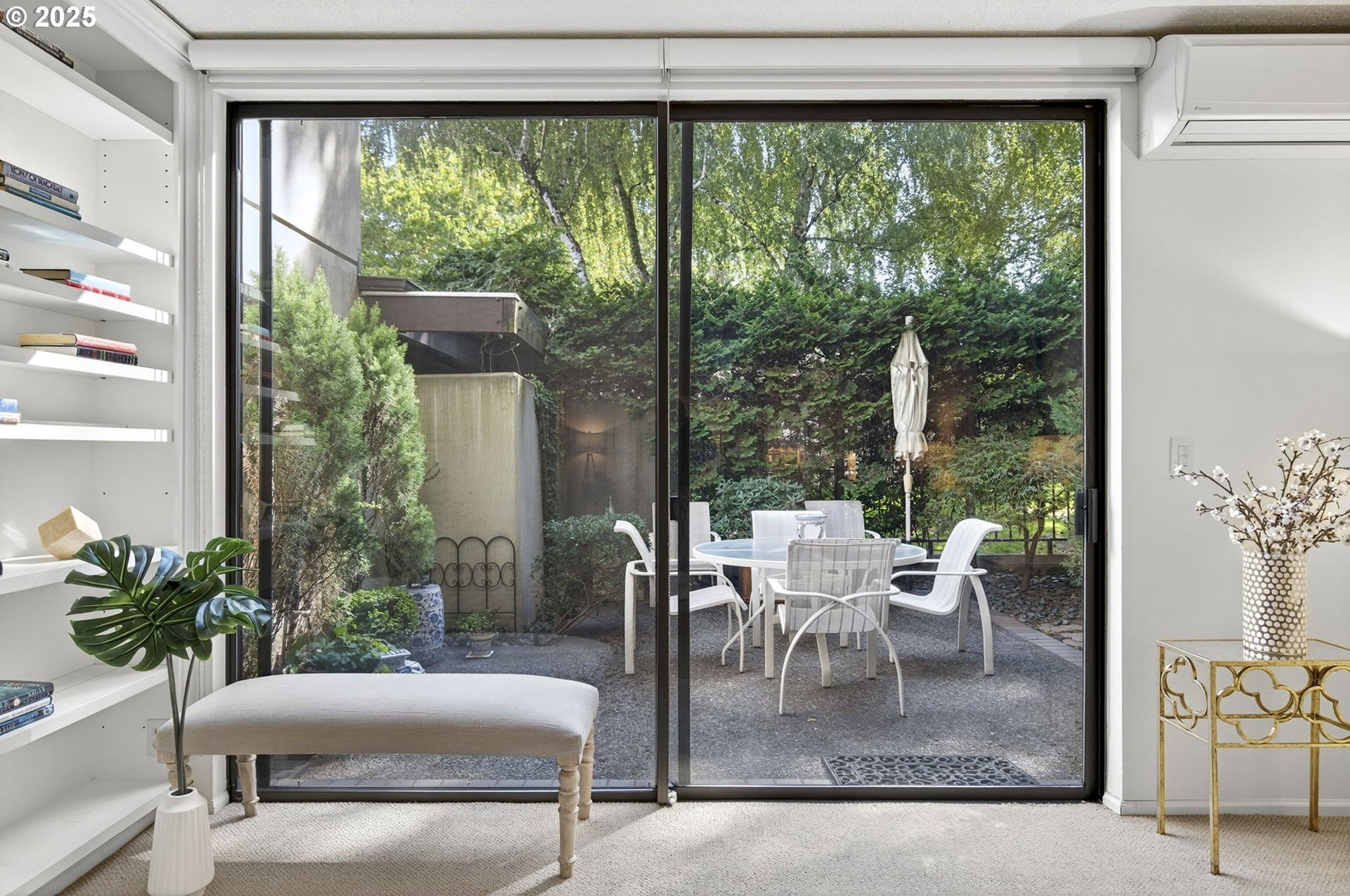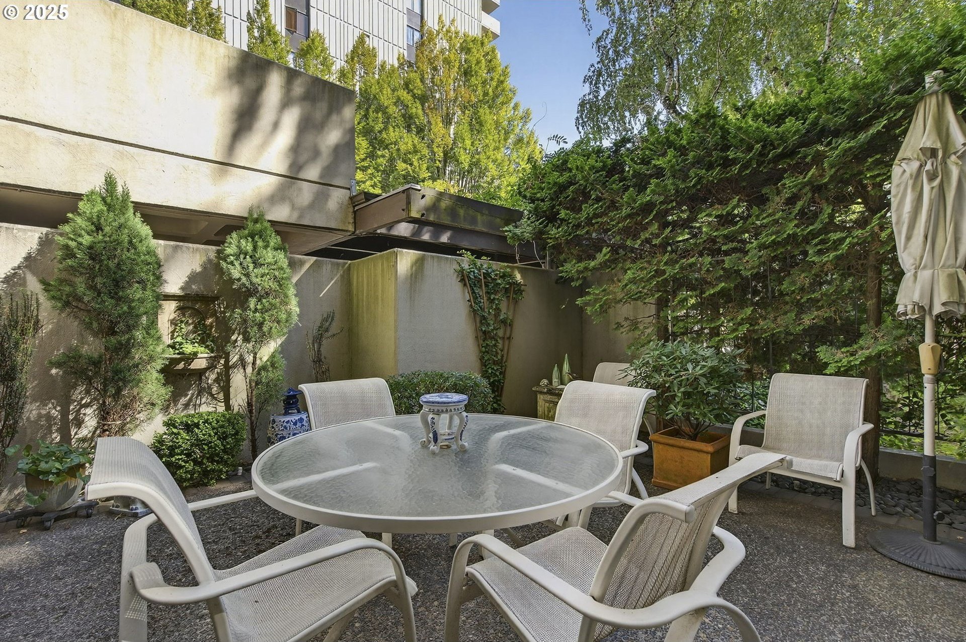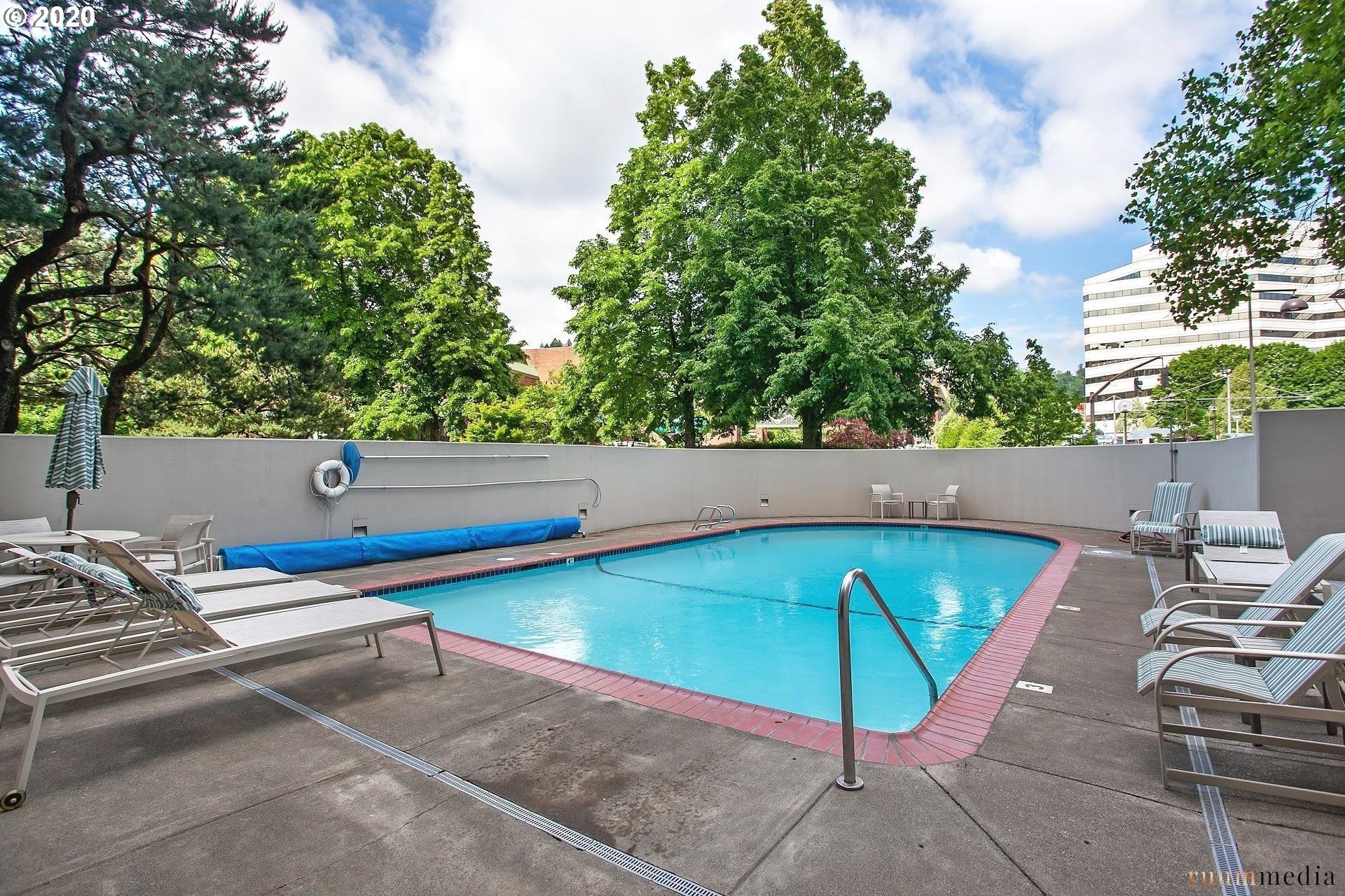 Lovely remodeled rare Garden unit. Open floor plan with dining living room with high ceilings that opens to large private patio and garden space. Wonderful for entertaining and enjoying a beautiful outdoor space. Living room and dining with wall of built-ins and electric fireplace. Kitchen has been completely remodeled with custom cabinets, granite counter tops, stainless steel appliances and fun glass tile back splash. Bedroom with ensuite, remodeled bath with walk-in shower. Bedroom has double closets, wall of built-ins and beatiful view of the garden. Laundry room with small office space. Parking storage and condo are all on the same level so convenient. Amenities include 24/7 Concierge, on-Site property management, indoor saltwater pool and Jaccuzzi, outdoor pool, 2 workout rooms with men and women's locker rooms with saunas. Two community rooms with kitchens that open to large patios great for fun summer parties. Bike and Wine Storage. 53 Guest Parking Spaces unheard of downtown. Pet Friendly. MAX and bus line border the property and the street car is 1 block north. Stroll the Halprin Park Sequence to the Keller Auditorium, coffee shops, restaurants and Riverplace Esplanade. Rental cap not met.