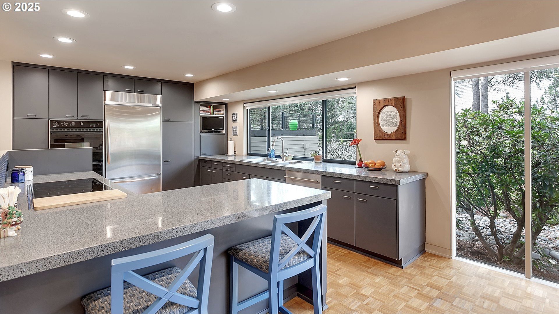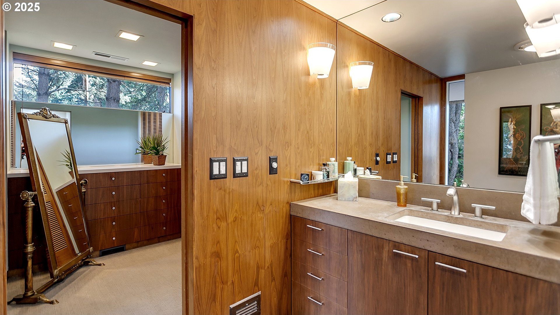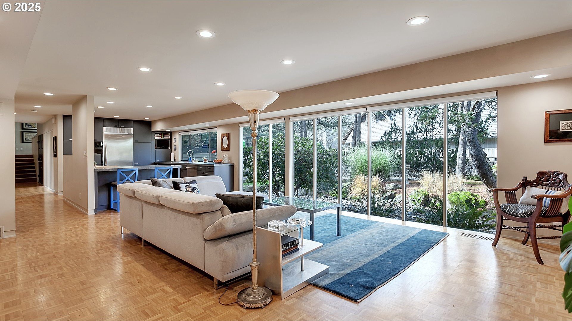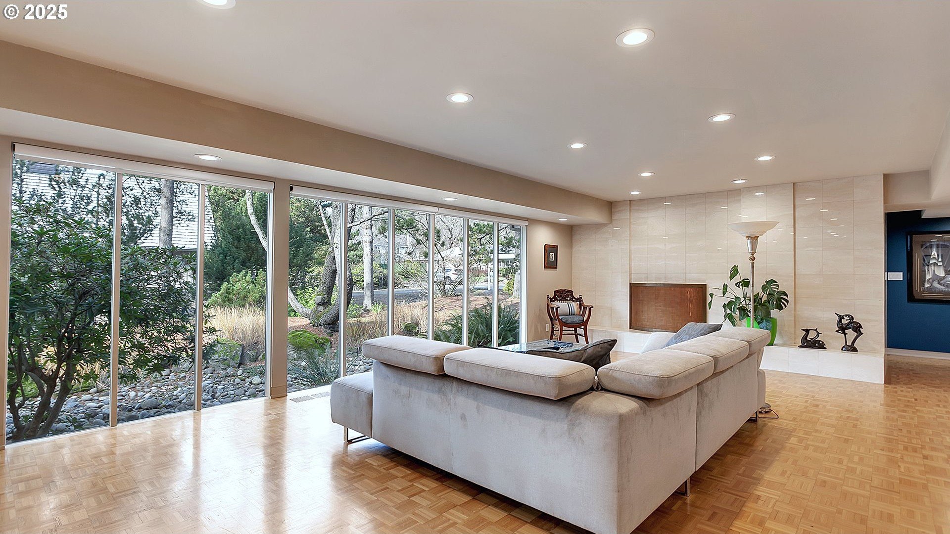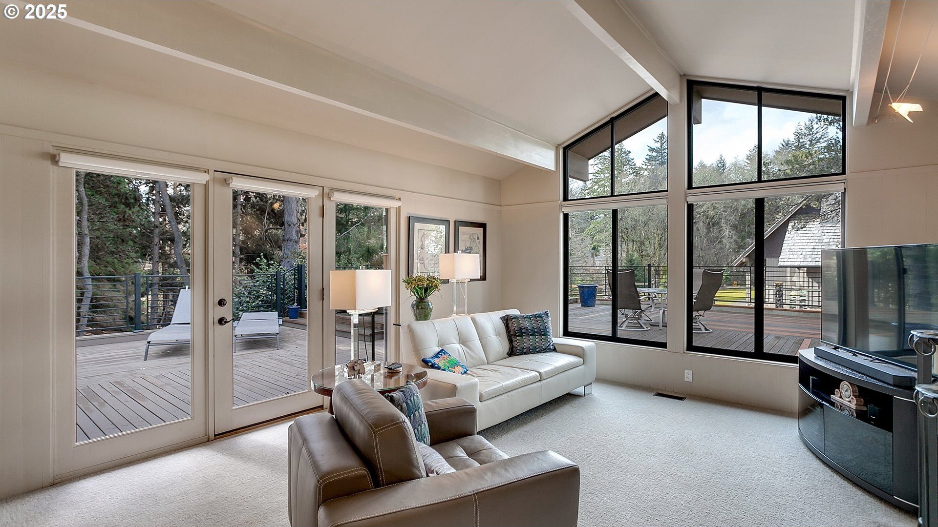 Located in the sought-after Lynnridge neighborhood of Cedar Hills and is situated on a large, naturally landscaped lot that ensures ample privacy. Upon entering through the double doors, you’ll appreciate numerous Mid-Century Modern design elements, series windows, exposed wood beam ceilings, distinctive light fixtures, and floor-to-ceiling fireplaces— all thoughtfully preserved in this well-maintained home. The main level features parquet floors, a welcoming foyer, and a formal dining room filled with natural light. The spacious kitchen opens to the living room, which boasts tall windows and a travertine-encased fireplace. Also on this level is a large bedroom with an adjacent full bathroom and generous laundry room. A few steps up, an open staircase leads to a grand family room with a cathedral ceiling adorned with exposed wood beams, floor-to-ceiling windows and wood-burning fireplace. This room opens onto an expansive 1,100 sq. ft. deck perfect for entertaining. Nearby, a bedroom converted into a dressing room adjoins a luxurious primary suite with its own deck, large windows, floor-to-ceiling wood-burning fireplace, an adjacent dressing room, a walk-in bathroom finished with tile and walnut, including a spacious accessible shower. The lower level offers two large bedrooms, a full bathroom, a second family room with access to a covered patio, a three-car garage, and a sizable private backyard. With a full bedroom and bathroom on the main level plus multiple family rooms, this home is ideal for au pairs, nannies, caregivers, or multigenerational living. Located in the walkable Lynnridge neighborhood of Cedar Hills in unincorporated Washington County near Cedar Hills Marketplace, top rated public and private schools, restaurants, services, St. Vincent’s complex, Easy access to NIKE World Headquarters, Columbia Sportswear Global Campus, downtown Portland, Highway 217, Silicon Forest. Do not miss this opportunity to make this home your own!