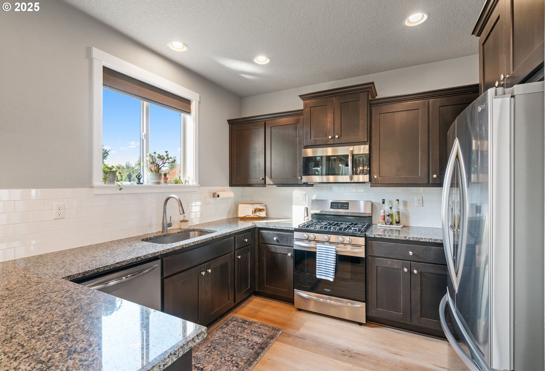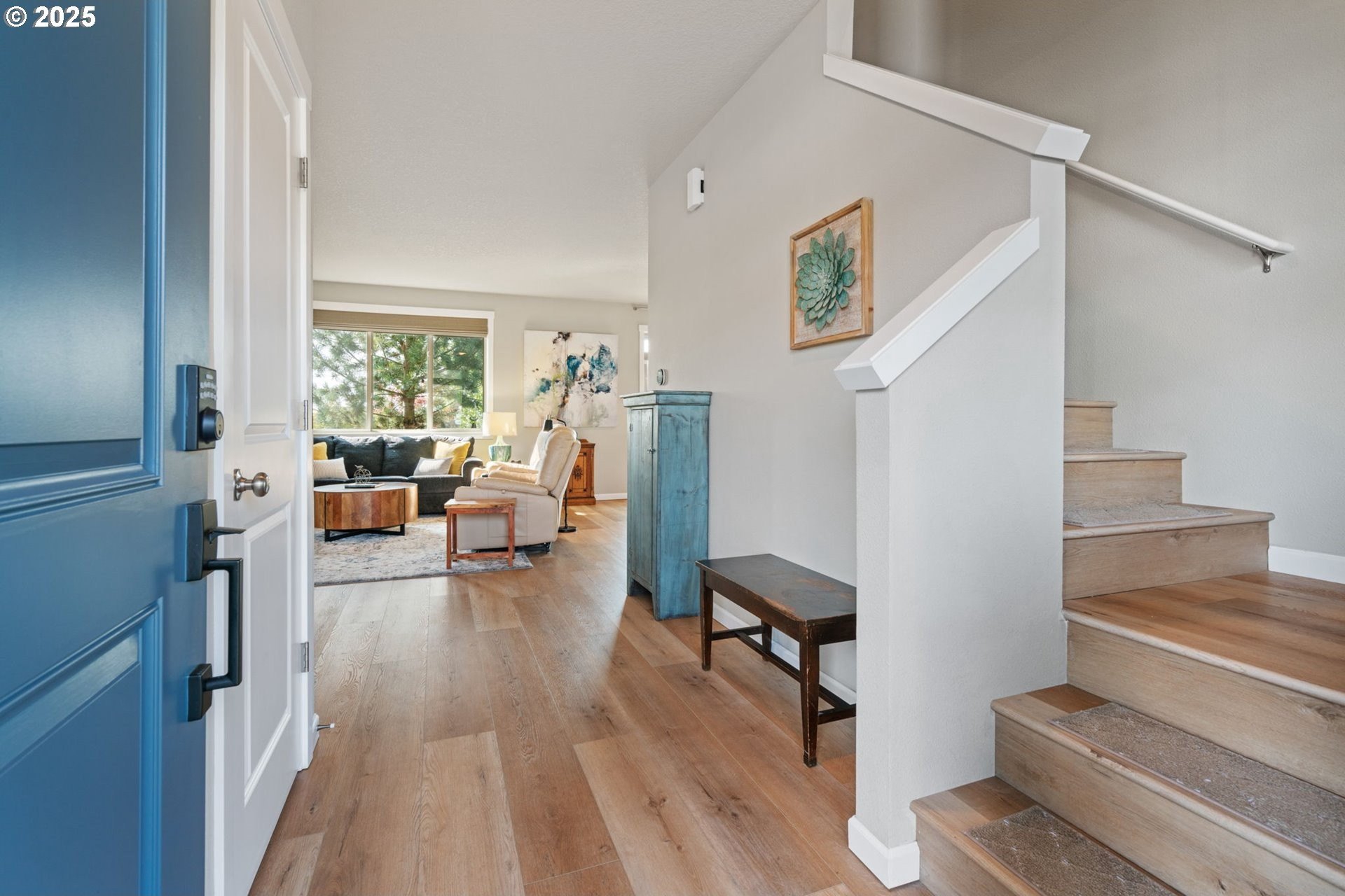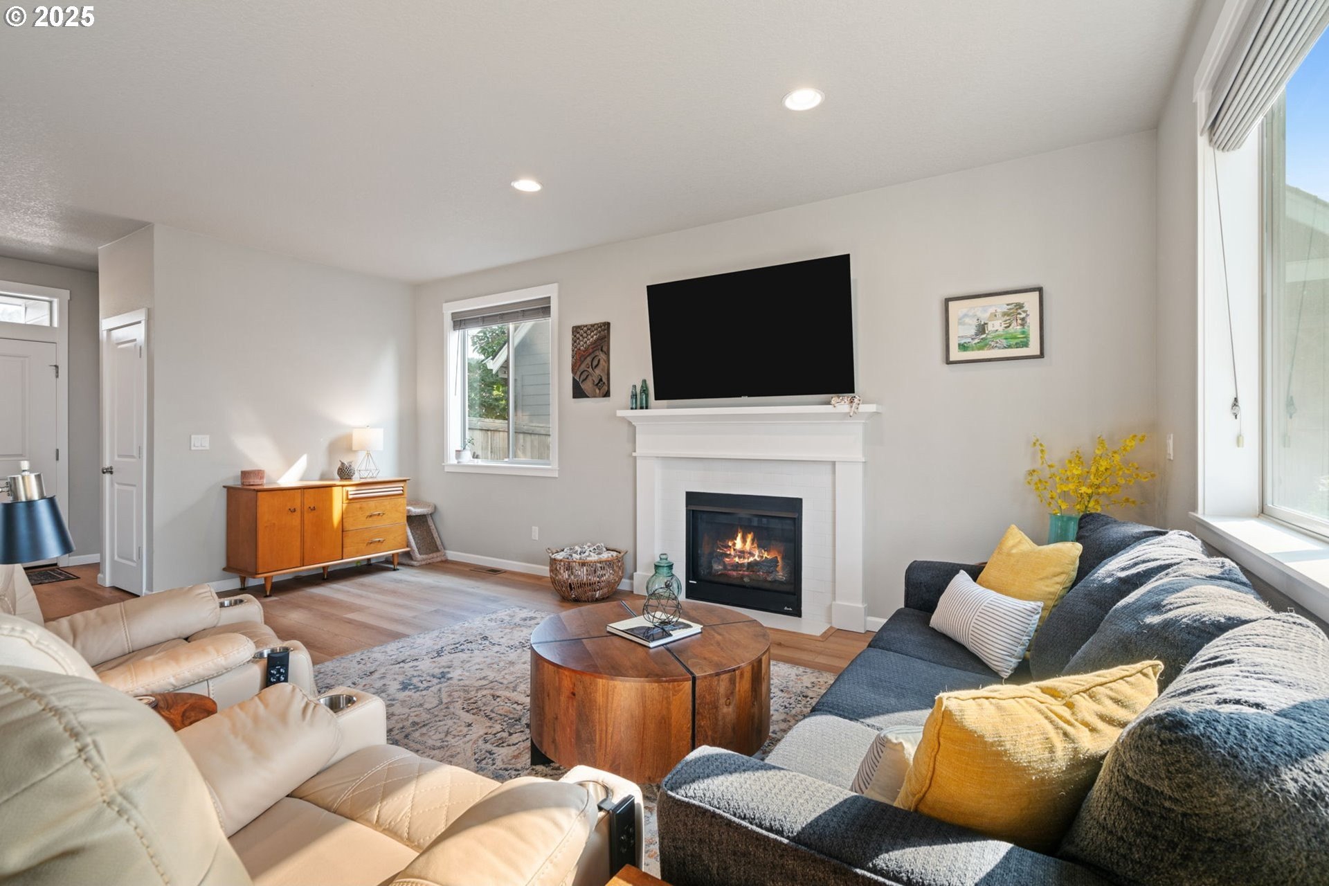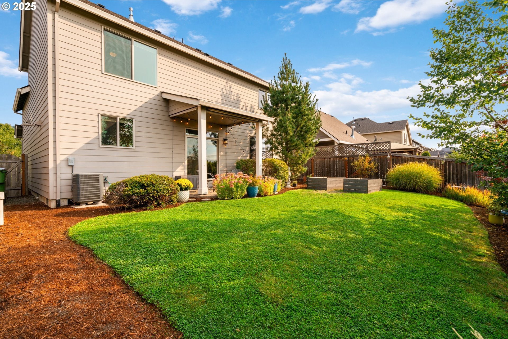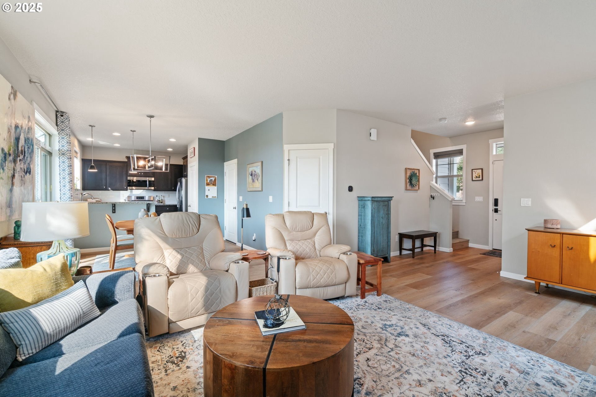 Welcome to this gorgeous, bright move-in ready 4 bedroom 2.5 bath home in a very desirable newer neighborhood near elementary & middle schools with no HOA! Beautiful upgraded waterproof stone polymer composite (SPC) floors installed throughout the main floor, updated powder room & stairs in April 2025. Kitchen has granite counters, nice SS appliances and pantry. Convenient upstairs laundry room (cabinet stays), 4th bed/bonus room is huge, and you'll find custom roman shades and faux wood blinds throughout the home. Now, step out back to relax in your lovely, secluded backyard with no neighbors behind you. Cool off on the patio on those hot days with installed mister and sun shades on all three sides (they also serve to keep rain out!), sprinkler system front/back and bonus, a fruitful blueberry bush. All appliances & TV's are included! Enjoy the many local wineries, breweries and distilleries or spend some time in charming downtown Newberg. Don't wait to check out this beautiful, well cared for home!