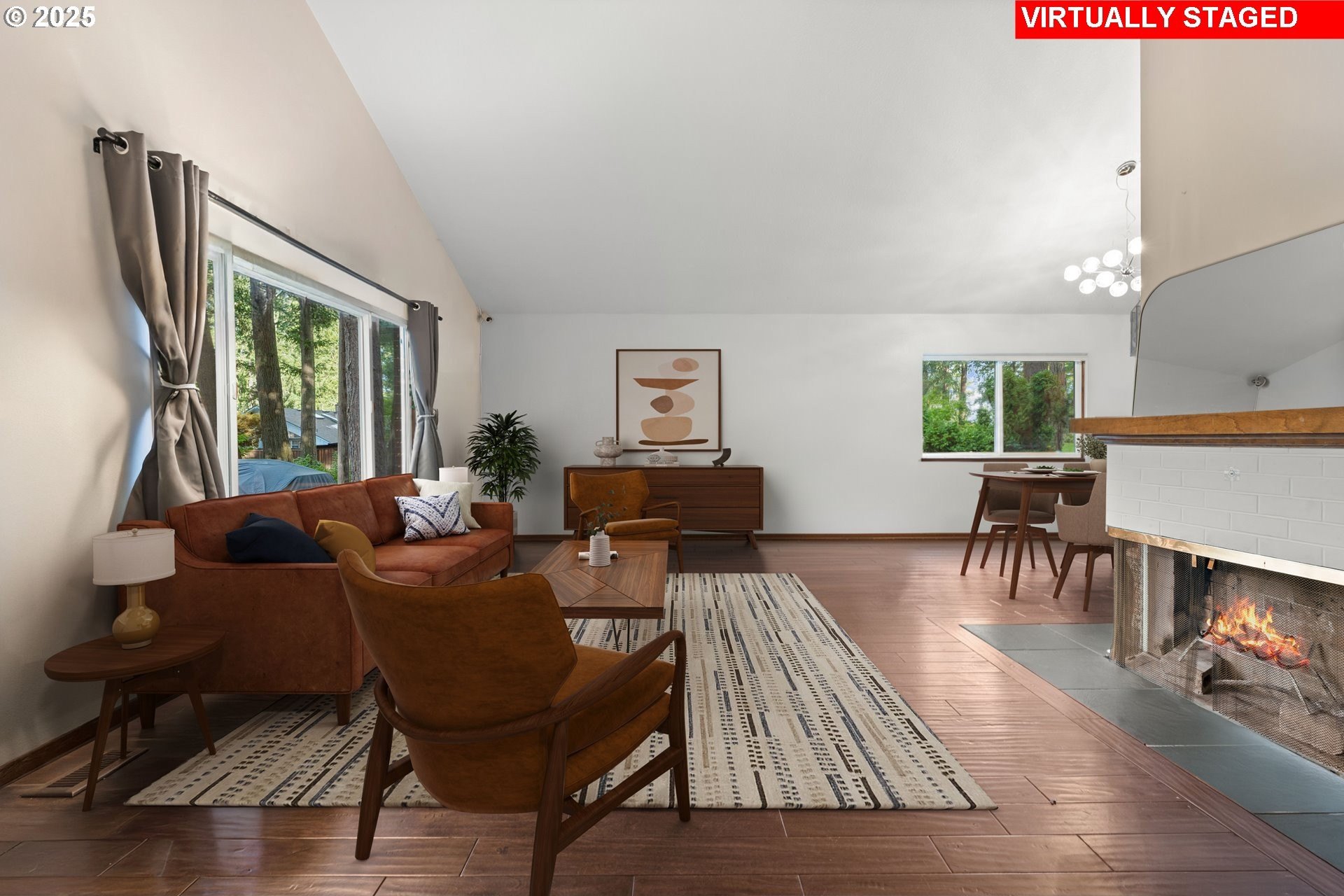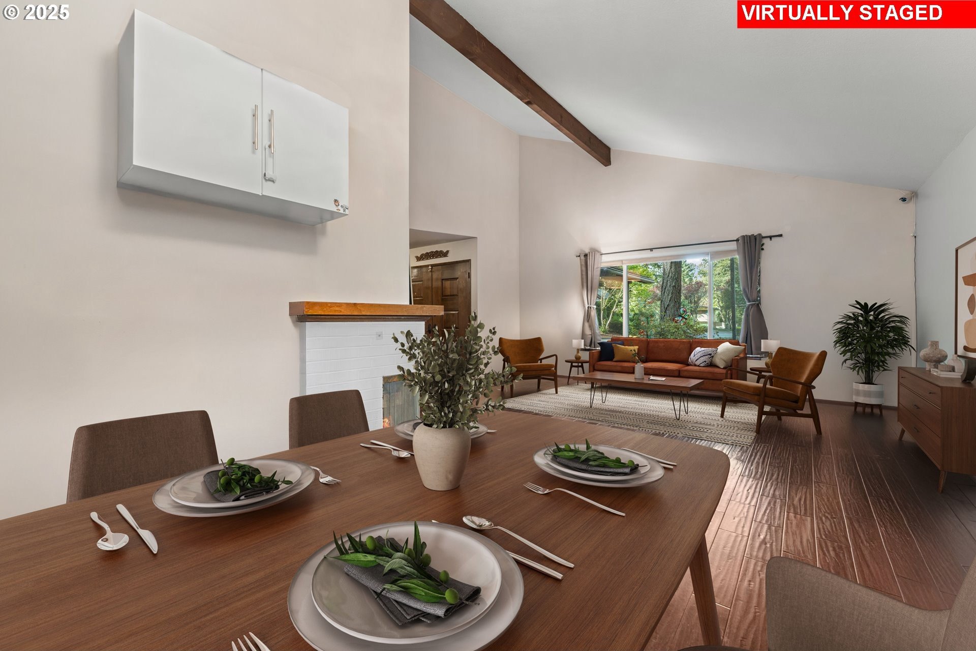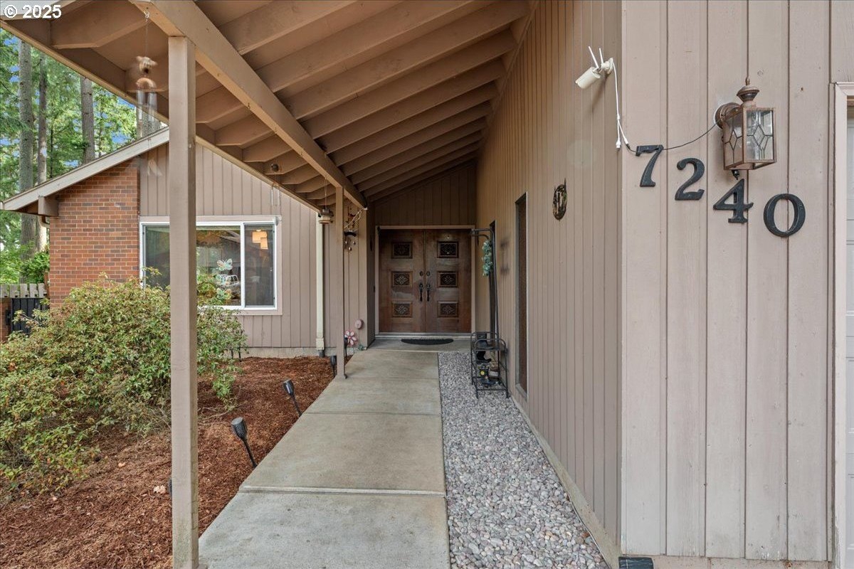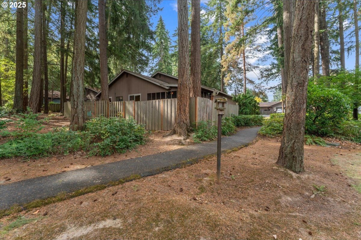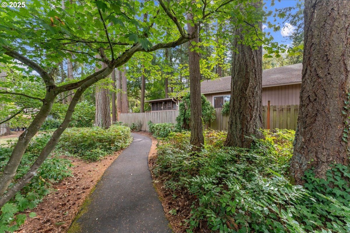 Mid-century charm, one-level living, AND a serene wooded view! This beautifully designed Hyland Hills home delivers it all. Featuring vaulted ceilings with exposed beams, a wide double-door entry, an atrium with skylight, and two fireplaces - every detail celebrates timeless architecture. The circular floor plan offers separate living with two bedrooms and a full bath on one side, and a spacious primary suite on the other. At the center of the home, the signature atrium has been finished with a heating vent, making it usable year-round. Stunning features include granite countertops throughout, engineered hardwood floors, and gas range cooking. Off the back, the enclosed porch is screened in with views of the wooded common area. All with low-maintenance landscaping, fenced yard, and private-drive setting create a serene backdrop for entertaining or relaxing. Located down the pathway to the neighborhood pool and clubhouse with LOW HOA Dues that cover front yard maintenance, and close to popular schools: Fir Grove, Highland Park, and Southridge. Surrounded by multiple parks and trails, with Nike HQ, Progress Ridge, dining, shopping, and Hwy 217 just minutes away. This home blends mid-century design with modern updates for comfort, function, and style.. all in one of Beaverton’s most coveted neighborhoods.