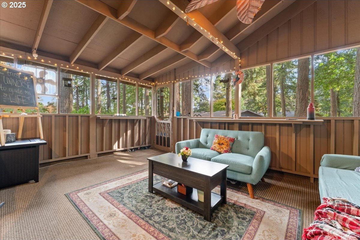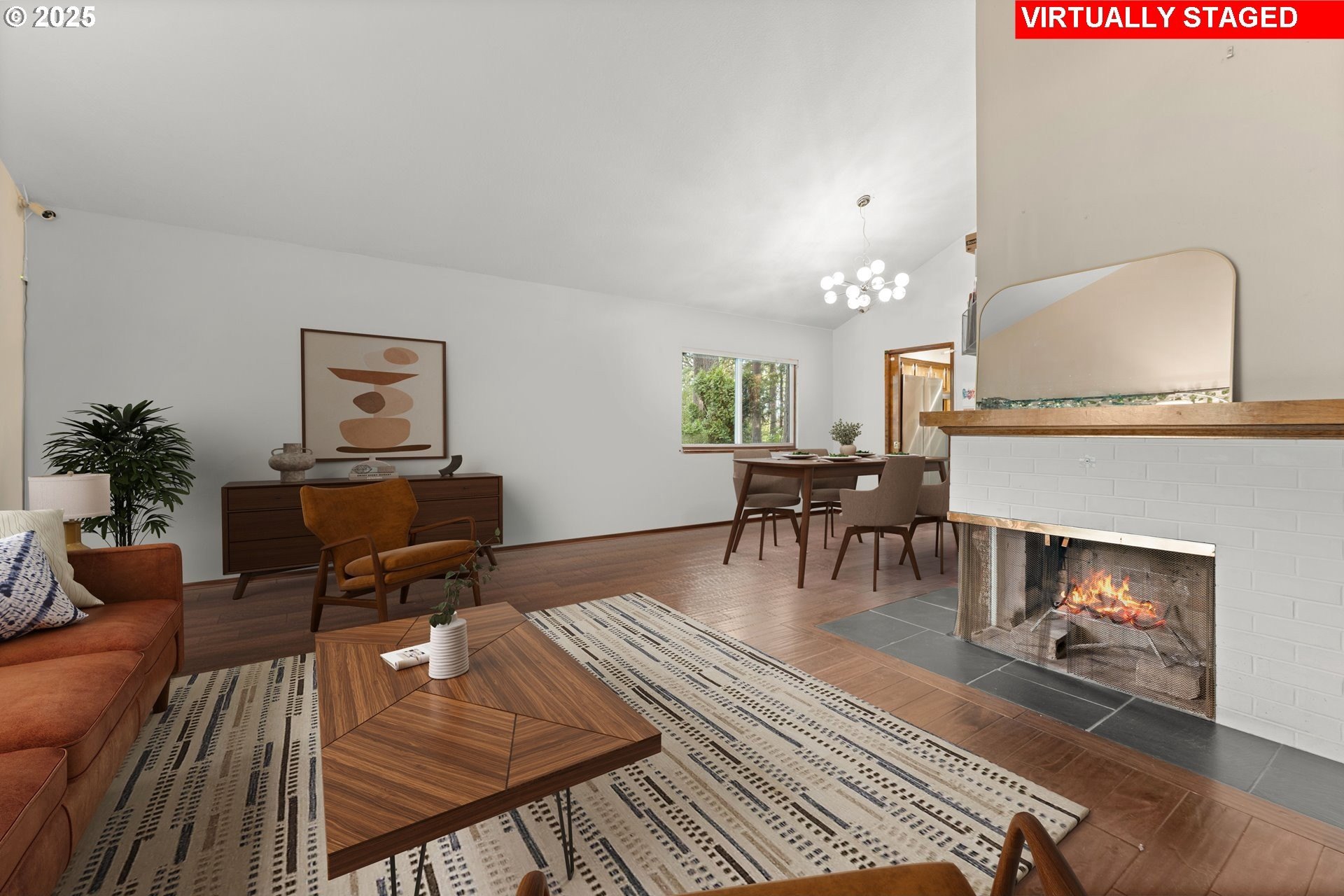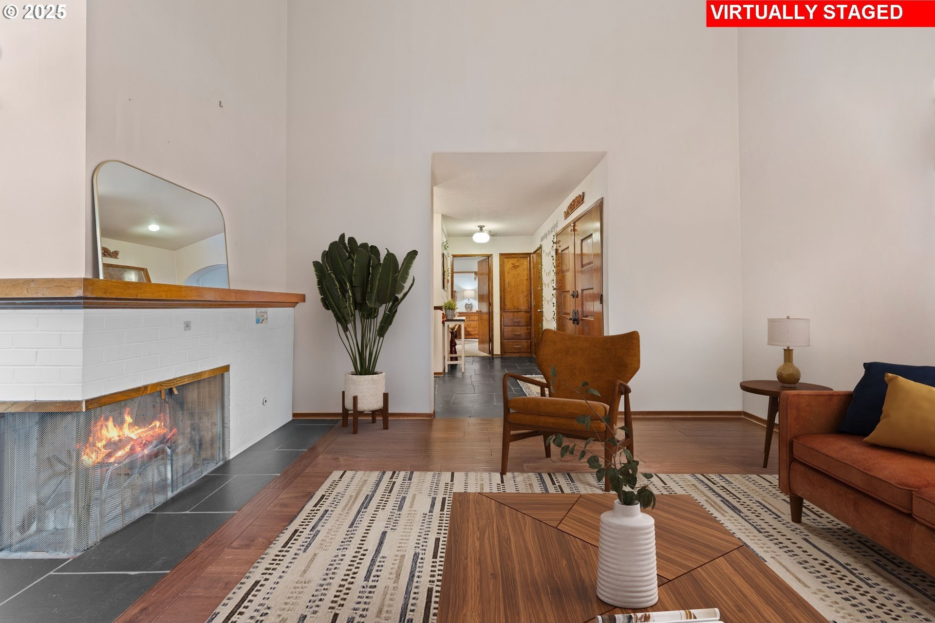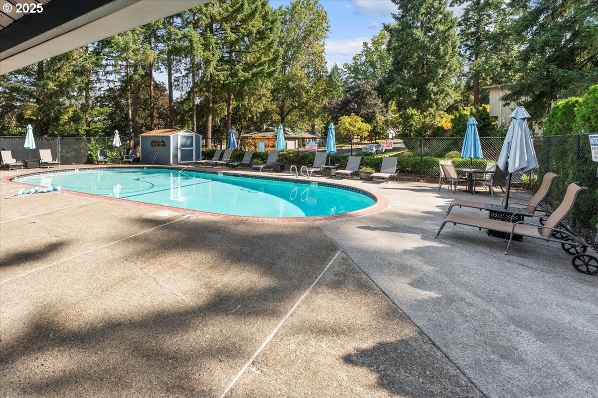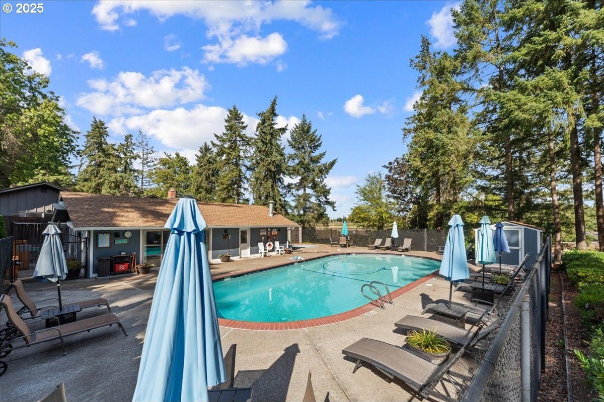 Mid-century charm, one-level living, AND a serene wooded view! This beautifully designed Hyland Hills home delivers it all. Featuring vaulted ceilings with exposed beams, a wide double-door entry, an atrium with skylight, and two fireplaces - every detail celebrates timeless architecture. The circular floor plan offers separate living with two bedrooms and a full bath on one side, and a spacious primary suite on the other. At the center of the home, the signature atrium has been finished with a heating vent, making it usable year-round. Stunning features include granite countertops throughout, engineered hardwood floors, and gas range cooking. Off the back, the enclosed porch is screened in with views of the wooded common area. All with low-maintenance landscaping, fenced yard, and private-drive setting create a serene backdrop for entertaining or relaxing. Located down the pathway to the neighborhood pool and clubhouse with LOW HOA Dues that cover front yard maintenance, and close to popular schools: Fir Grove, Highland Park, and Southridge. Surrounded by multiple parks and trails, with Nike HQ, Progress Ridge, dining, shopping, and Hwy 217 just minutes away. This home blends mid-century design with modern updates for comfort, function, and style.. all in one of Beaverton’s most coveted neighborhoods.