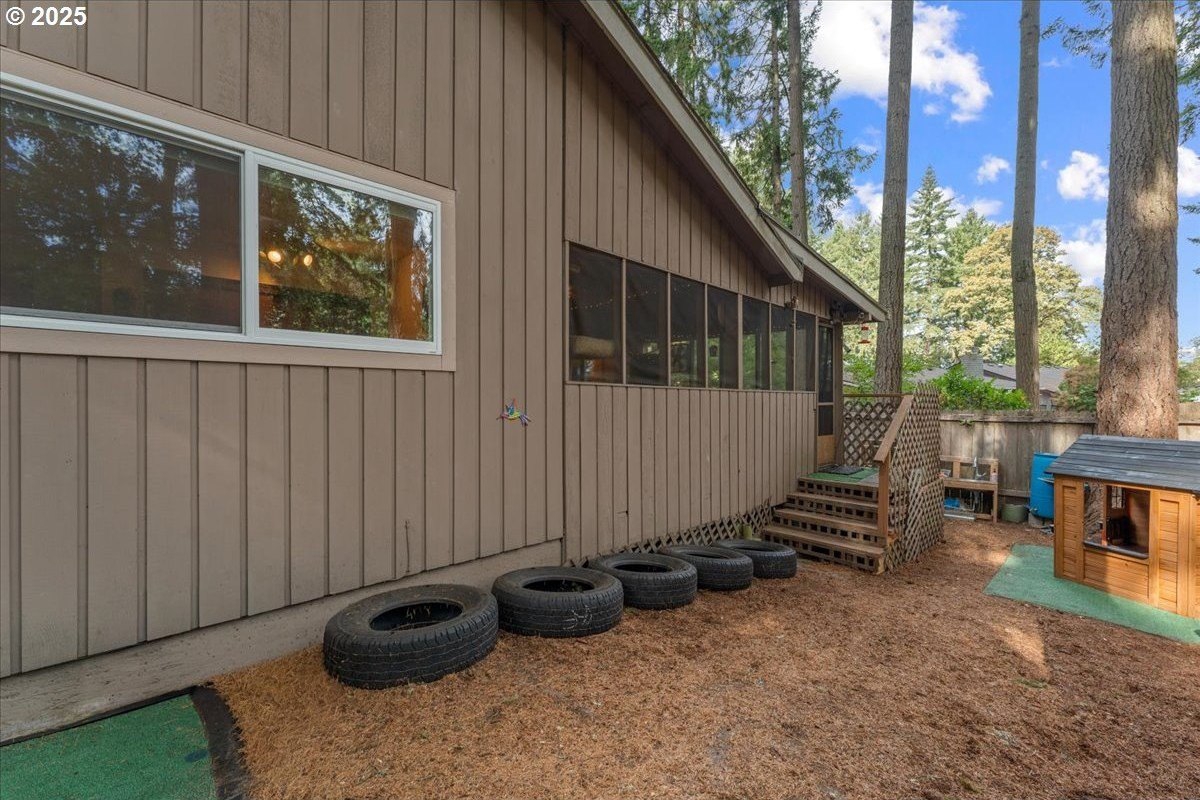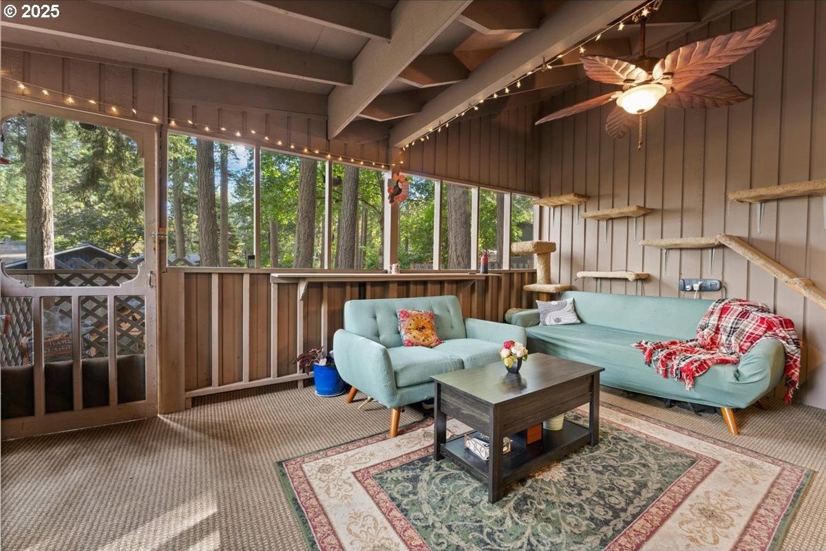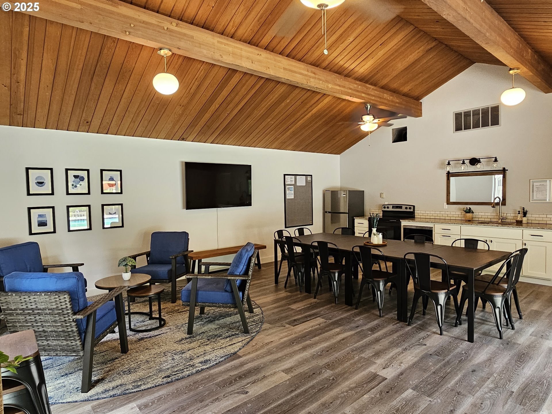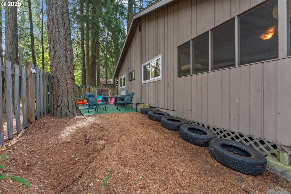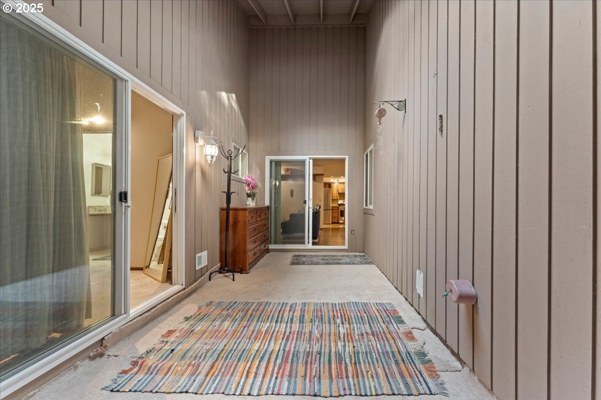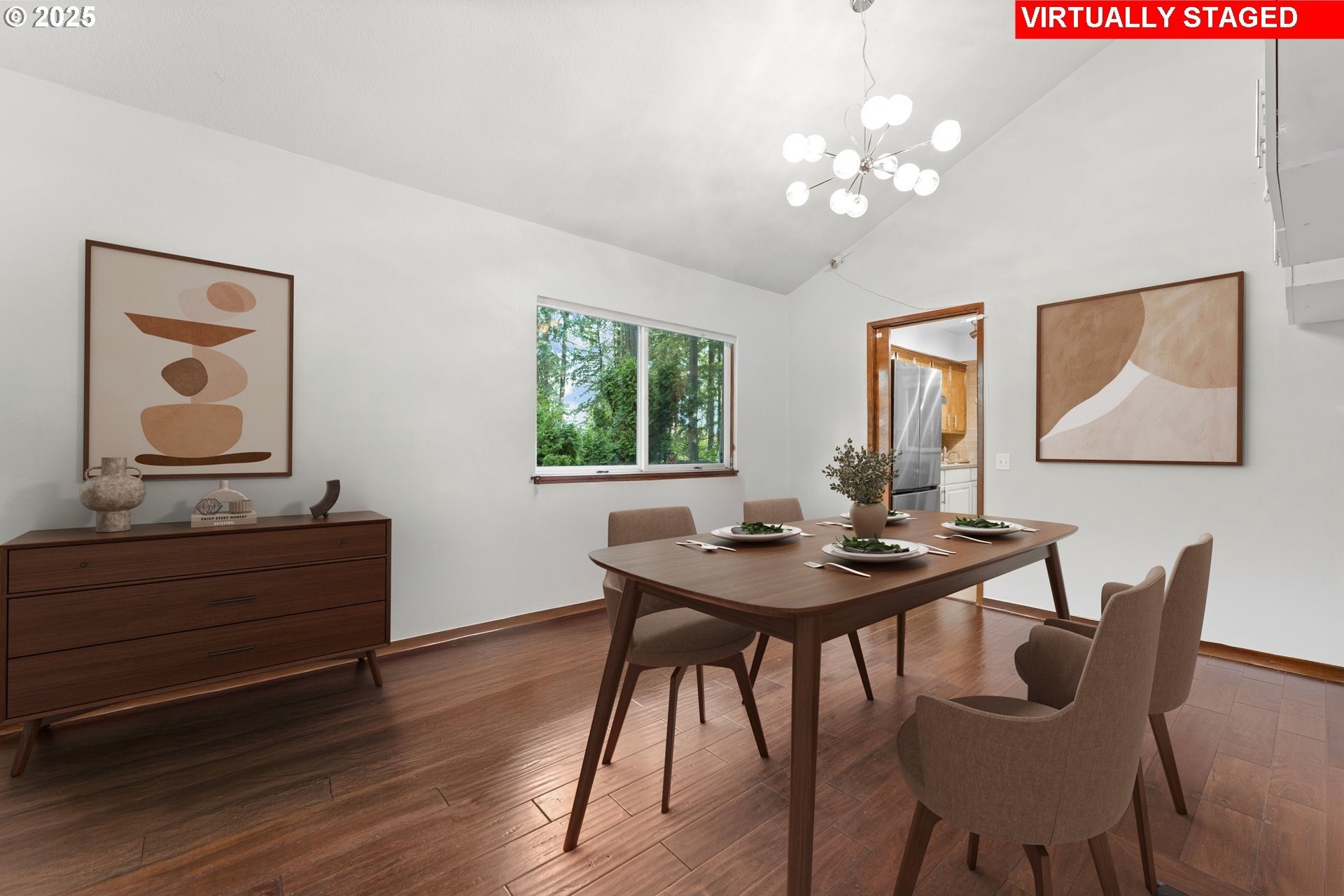 Mid-century charm, one-level living, AND a serene wooded view! This beautifully designed Hyland Hills home delivers it all. Featuring vaulted ceilings with exposed beams, a wide double-door entry, an atrium with skylight, and two fireplaces - every detail celebrates timeless architecture. The circular floor plan offers separate living with two bedrooms and a full bath on one side, and a spacious primary suite on the other. At the center of the home, the signature atrium has been finished with a heating vent, making it usable year-round. Stunning features include granite countertops throughout, engineered hardwood floors, and gas range cooking. Off the back, the enclosed porch is screened in with views of the wooded common area. All with low-maintenance landscaping, fenced yard, and private-drive setting create a serene backdrop for entertaining or relaxing. Located down the pathway to the neighborhood pool and clubhouse with LOW HOA Dues that cover front yard maintenance, and close to popular schools: Fir Grove, Highland Park, and Southridge. Surrounded by multiple parks and trails, with Nike HQ, Progress Ridge, dining, shopping, and Hwy 217 just minutes away. This home blends mid-century design with modern updates for comfort, function, and style.. all in one of Beaverton’s most coveted neighborhoods.