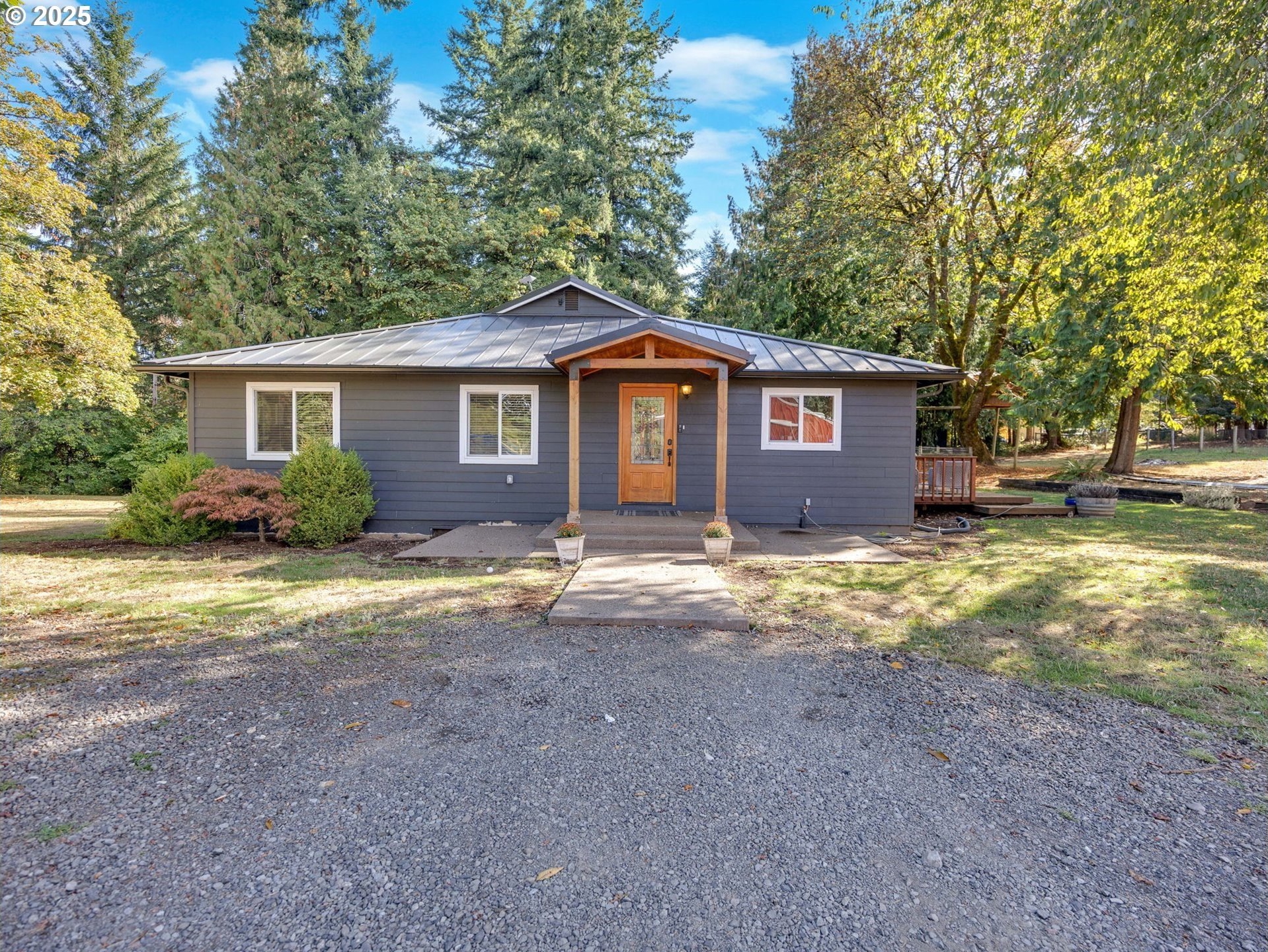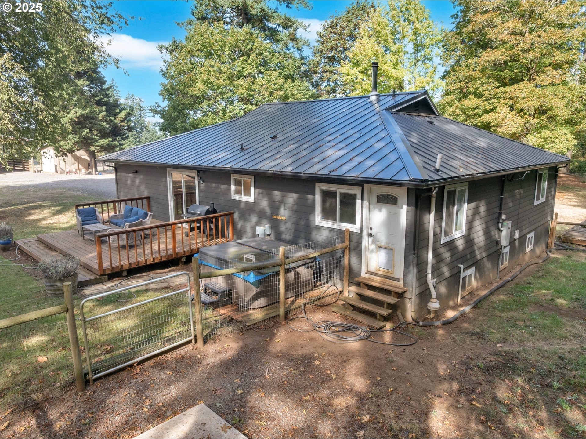 Located in Sandy's desirable countryside, this charming, gated 3 bedroom + full basement, 2 bathroom home with barn, shop, coop and RV pad offers 2,551 square feet of comfortable living space sitting on 5.48 acres. Once you enter the home you will discover well-appointed living areas with hardwood flooring that flow naturally from room to room. The upgraded kitchen with eat at bar and granite counters flows to the dining room and slider to the back deck with hot tub. The living room has a cozy woodstove centrally located between the primary and secondary bedrooms with French doors to a covered porch. The primary bedroom offers a restful sanctuary with walk in closet and private bathroom, while two additional bedrooms provide flexibility for family, guests, or home offices as well as an additional full bathroom to ensure convenience for daily living. The large laundry/mud room smartly offers passage to the exterior for those muddy days in the pasture. The “mostly” finished basement adds valuable living space; perfect for a media room, gym, home office, canning, play room or guest area. The real magic happens outside, where expansive grounds offer endless possibilities for livestock, recreation, and gardening. The 5-stall 60x36 barn with tack room and flex space has room for 3 more stalls if desired. In addition, you will find a 36x 24 shop with loft and 49x39 RV Carport with pad AND a poultry coop. the cross fencing allows for various animals to be kept safely and separately. Updated electrical, plumbing, central air and newer metal roof, siding, septic and exterior paint. Located in Sandy's welcoming community, you'll find local trails, parks, rivers, and creeks for outdoor recreation and convenient access to grocery shopping and schools. This property represents more than just a house – it's a lifestyle opportunity where indoor comfort meets outdoor potential.