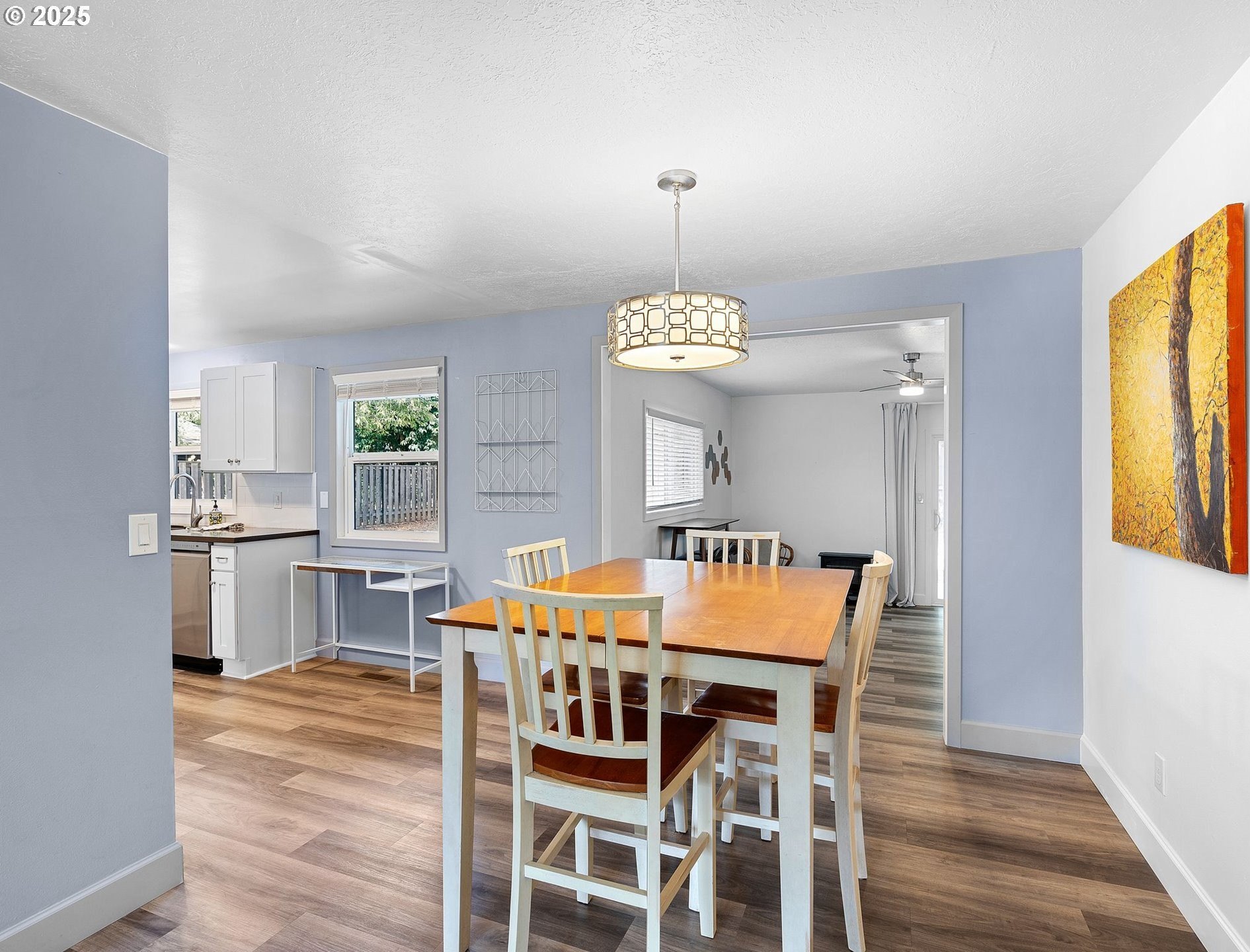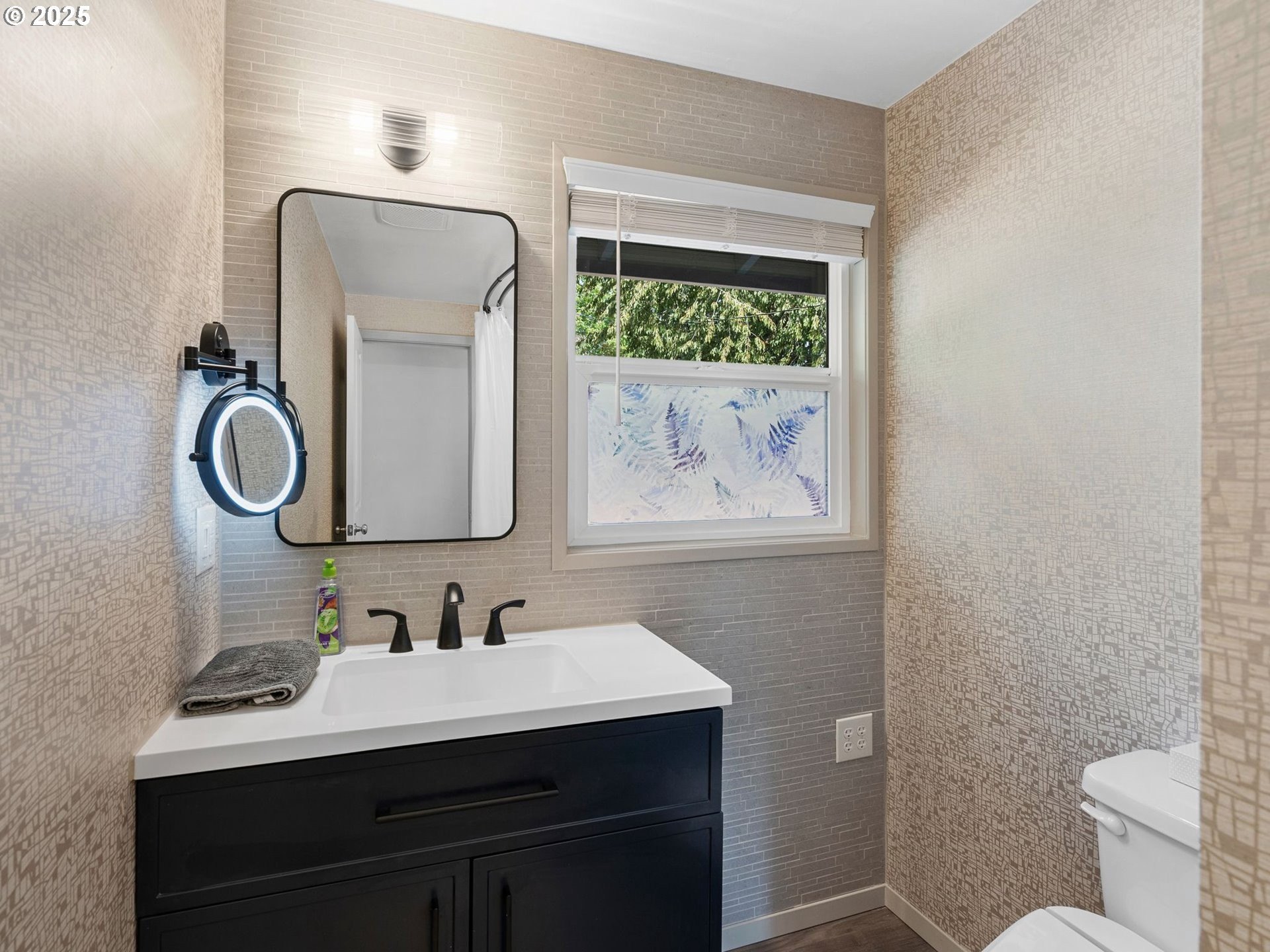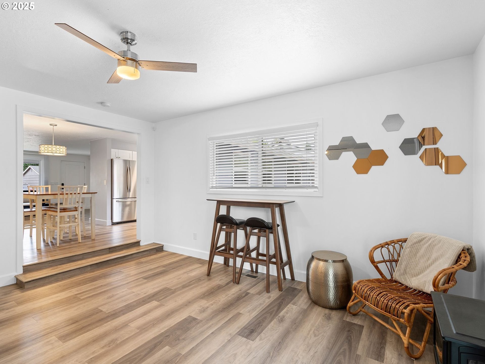 Renovated ranch in Centennial with no detail missed! White soft-close cabinets and backsplash tile in the kitchen artistically complement the black quartz countertops, accented by stainless steel appliances. A wood-burning fireplace keeps the living room cozy. Throughout you'll find Evoke LVP flooring seamlessly connecting each room, “electrician's special” dimming switches, and vinyl windows. Solar panels greatly reduce the electric bill, and new PEX plumbing and a new water main provide peace of mind. Creative bathroom renovation features soaker tub, tub-to-ceiling tile, floor-to-ceiling tile accent wall, hardwired makeup mirror, recessed medicine cabinet, and vanity lighting on dimmer switch. Plush carpet in the 13x10 primary bedroom and second bedroom. Expansive bonus room with ceiling fans and a slider leading to the stamped patio in the backyard. A new cedar fence with rigid metal posts provides durability and privacy. New gutters and water collection barrels are eco-friendly and a gardener's delight. Eye-catching front landscaping and low-maintenance backyard with room for your vision. Attached garage with laundry area. Conveniently located near the refreshed Parklane Park and Fred Meyer.