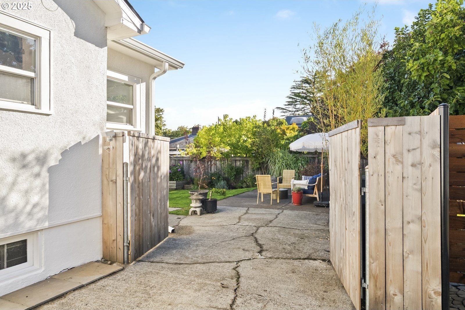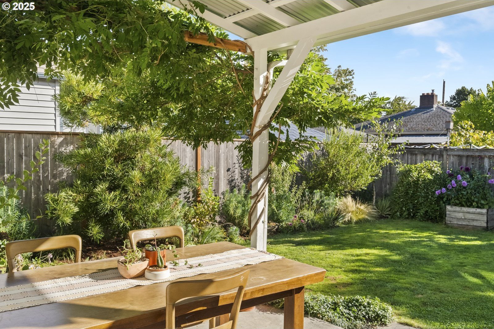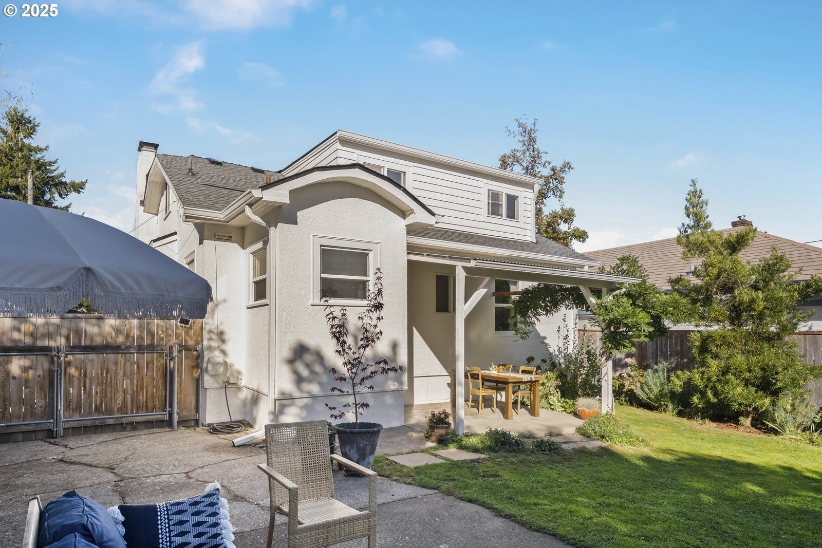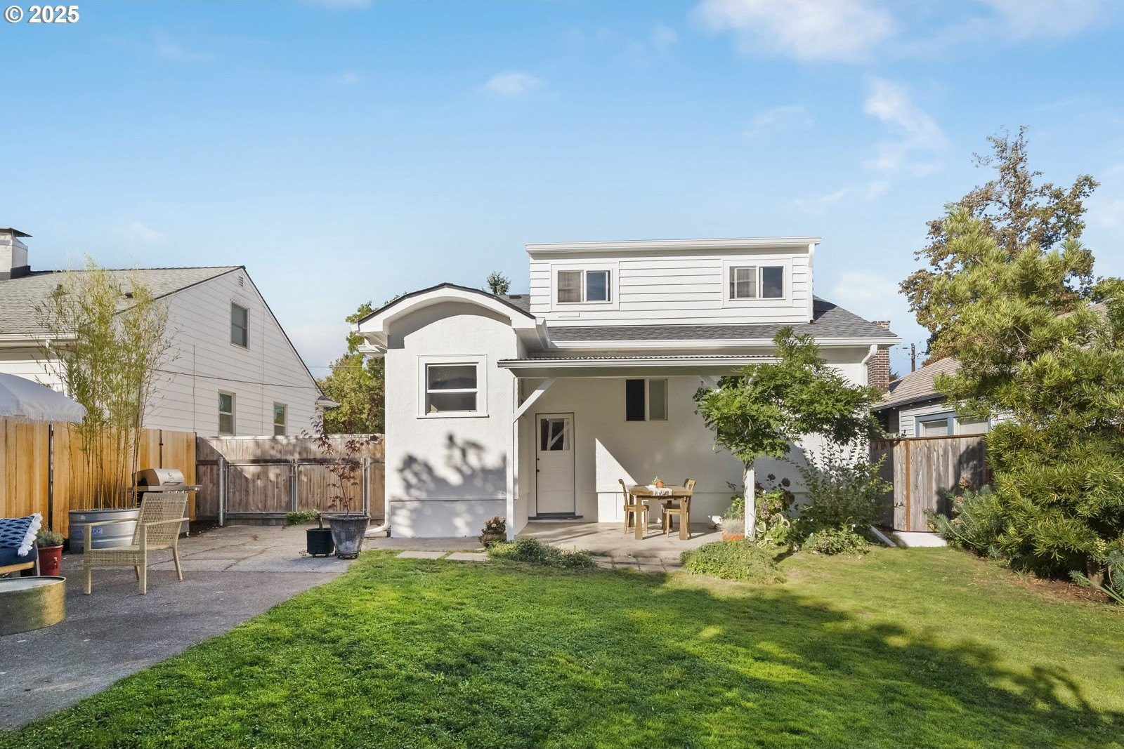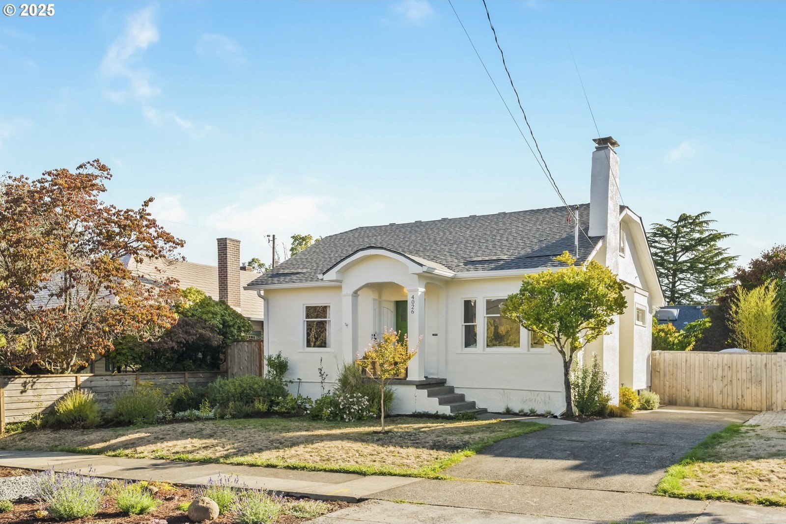 Discover this exceptional 1927 stucco home, exuding charm and elegance with its newly painted exterior in a timeless essential white, with just the right touch of creamy warmth. Upon the approach, prepare to be greeted by a landscaped front + the fenced backyard as a more private retreat. Embrace the essence of Portland living in this charming home, with beautiful oak hardwood floors that extend through the inviting living + dining room, complete with a cozy wood-burning fireplace. With coved details, quaint nooks, and a serene atmosphere, this home offers a unique sanctuary ready for its next fortunate owners. 2 bedrooms on the main and 2 on the upper level with an adjacent bonus space. Find a spot to tuck away and read, stretch + options for sleeping and a home office. On the main floor, in the private hall there is a large bathroom with double sink, expansive counter, plenty of storage and a shower/ tub combo. Find the joy of outdoor living in the fenced backyard, offering plenty of room for gardening + enjoying the beauty of each season as it unfolds. A unique copper cold plunge will remain with the home, providing a refreshing way to stay energized year-round. For added convenience, a covered outdoor dining and lounge area is situated near the back door, seamlessly connecting to the kitchen for entertaining.