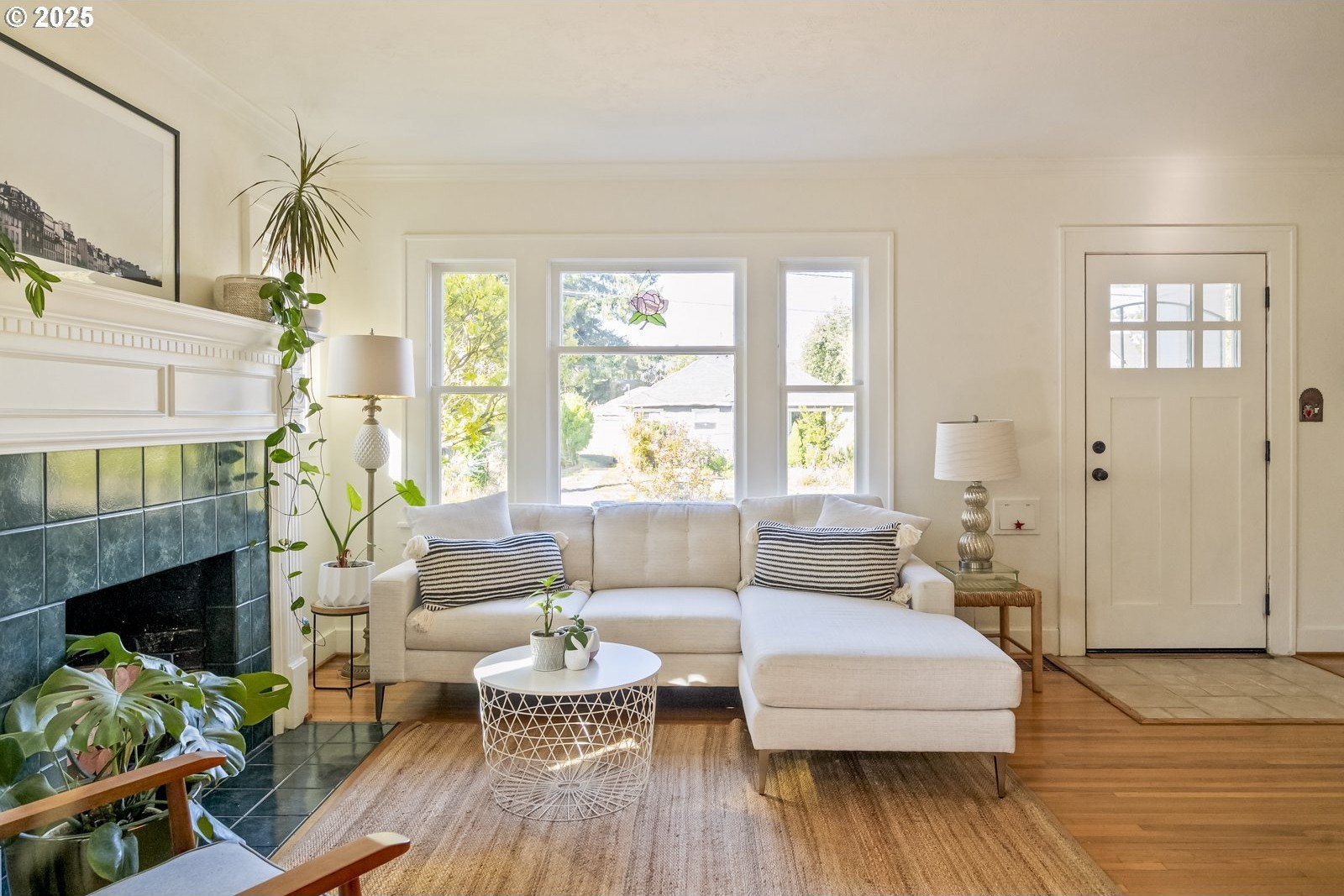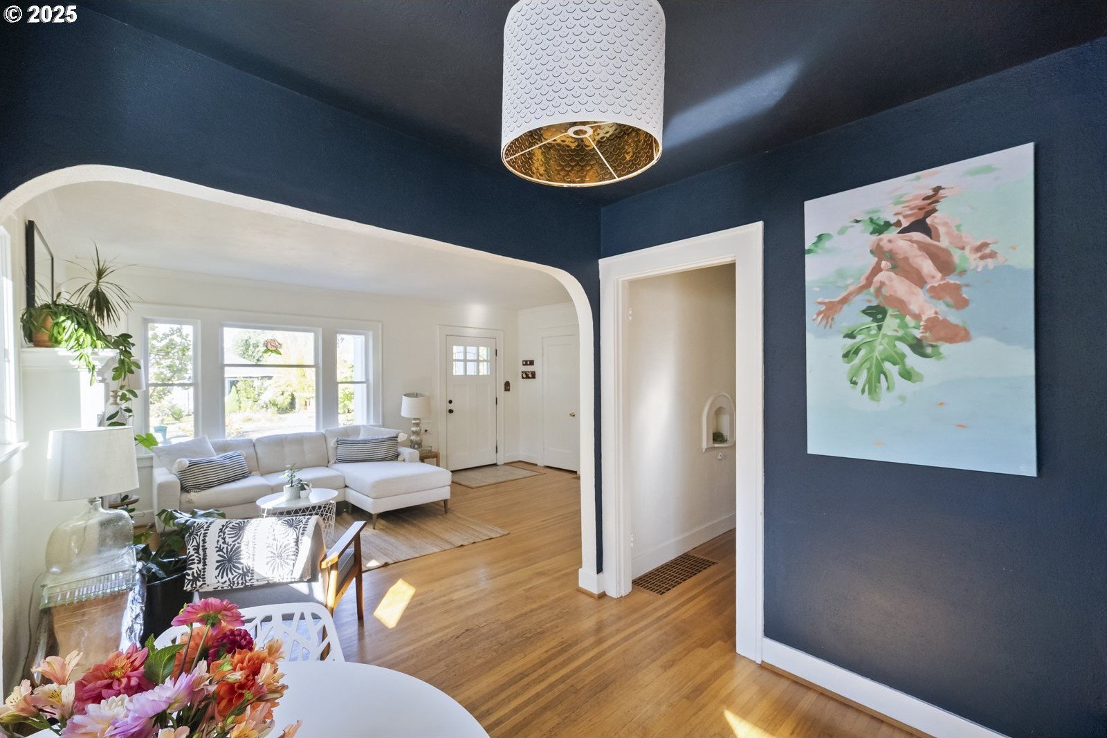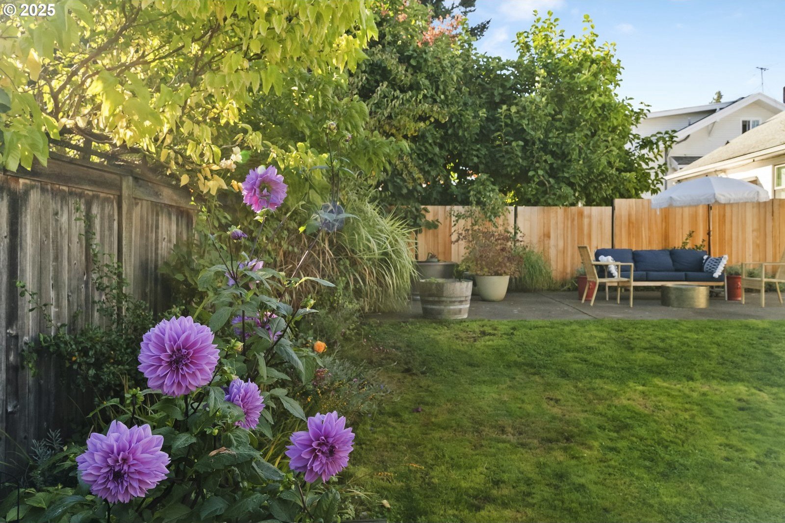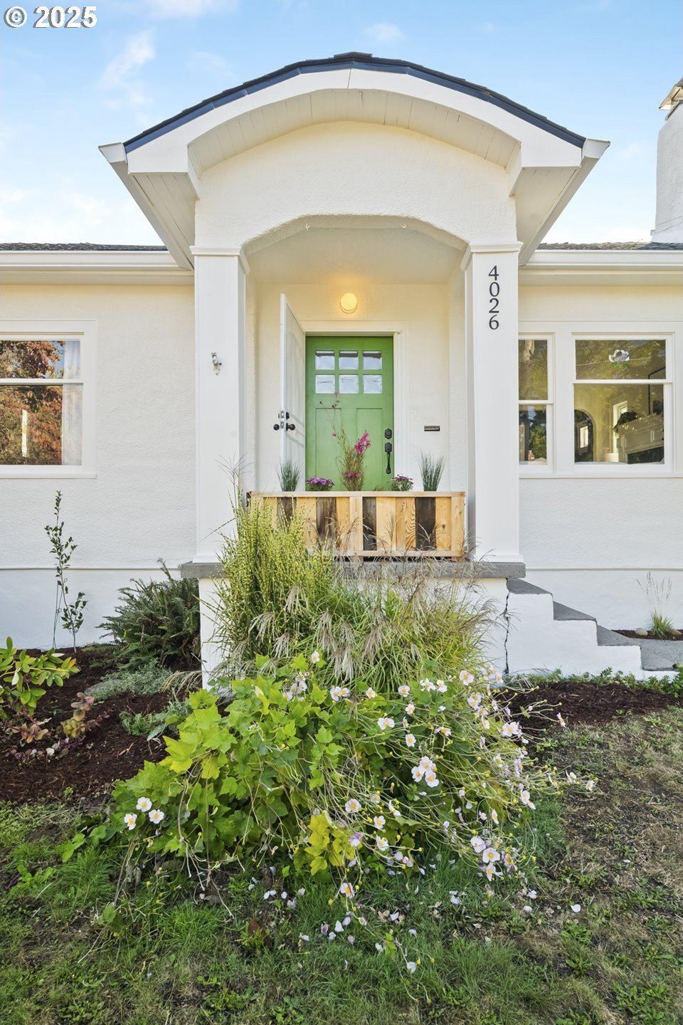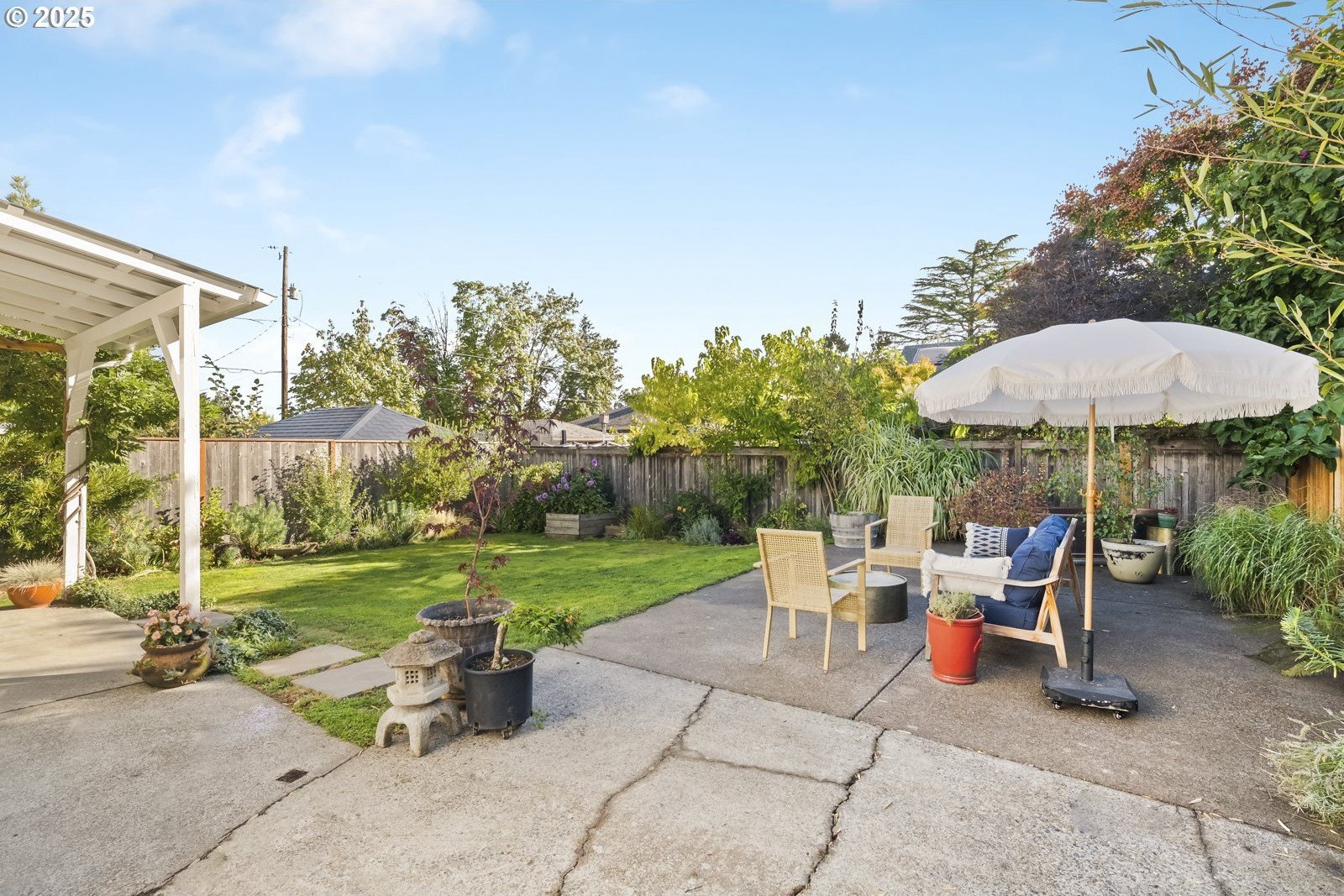 Discover this exceptional 1927 stucco home, exuding charm and elegance with its newly painted exterior in a timeless essential white, with just the right touch of creamy warmth. Upon the approach, prepare to be greeted by a landscaped front + the fenced backyard as a more private retreat. Embrace the essence of Portland living in this charming home, with beautiful oak hardwood floors that extend through the inviting living + dining room, complete with a cozy wood-burning fireplace. With coved details, quaint nooks, and a serene atmosphere, this home offers a unique sanctuary ready for its next fortunate owners. 2 bedrooms on the main and 2 on the upper level with an adjacent bonus space. Find a spot to tuck away and read, stretch + options for sleeping and a home office. On the main floor, in the private hall there is a large bathroom with double sink, expansive counter, plenty of storage and a shower/ tub combo. Find the joy of outdoor living in the fenced backyard, offering plenty of room for gardening + enjoying the beauty of each season as it unfolds. A unique copper cold plunge will remain with the home, providing a refreshing way to stay energized year-round. For added convenience, a covered outdoor dining and lounge area is situated near the back door, seamlessly connecting to the kitchen for entertaining.