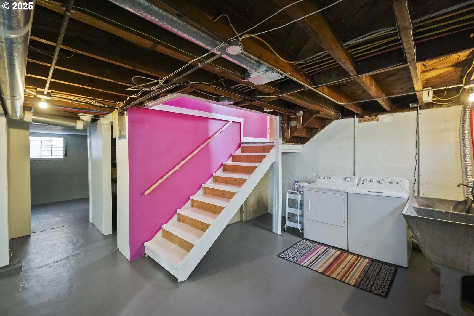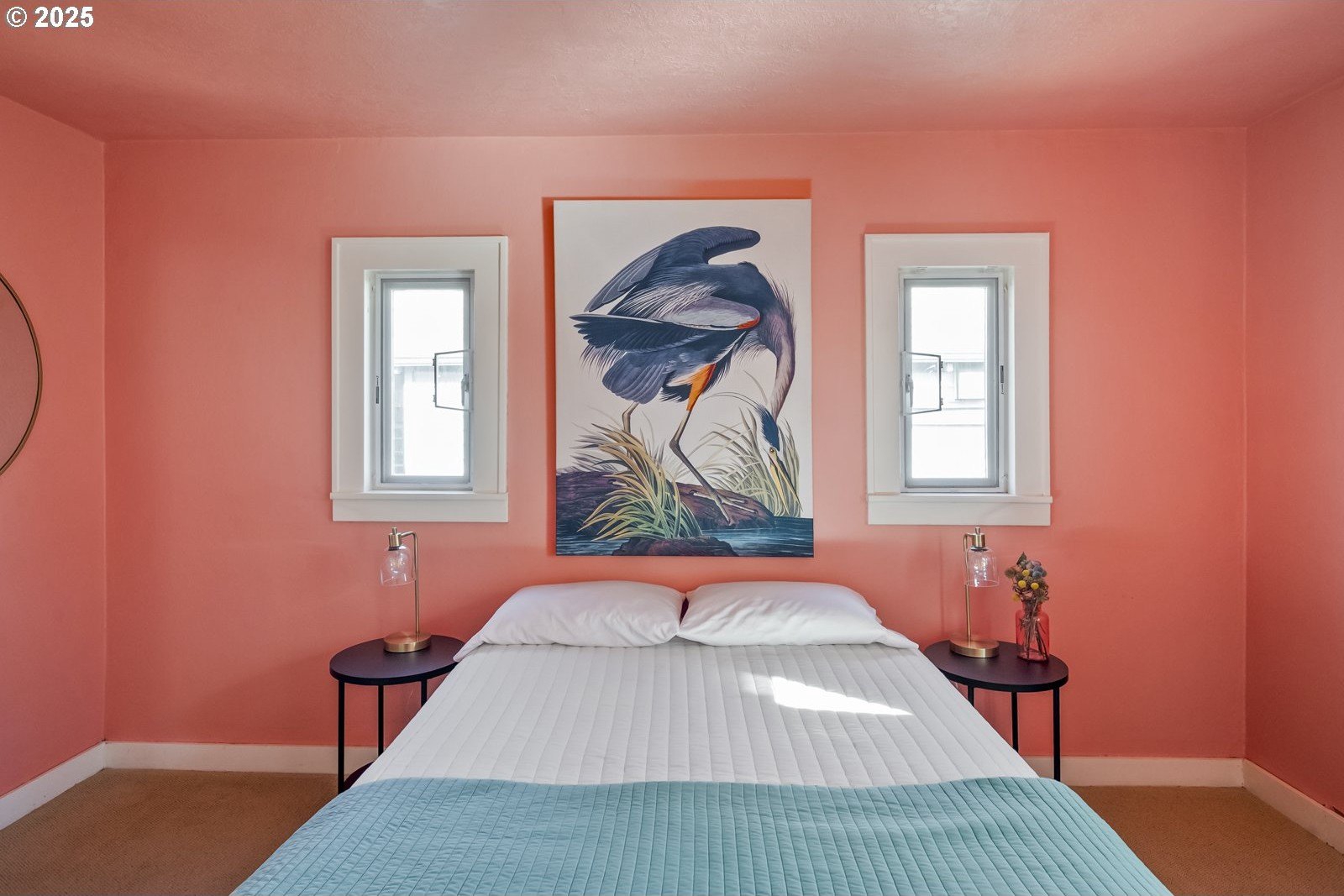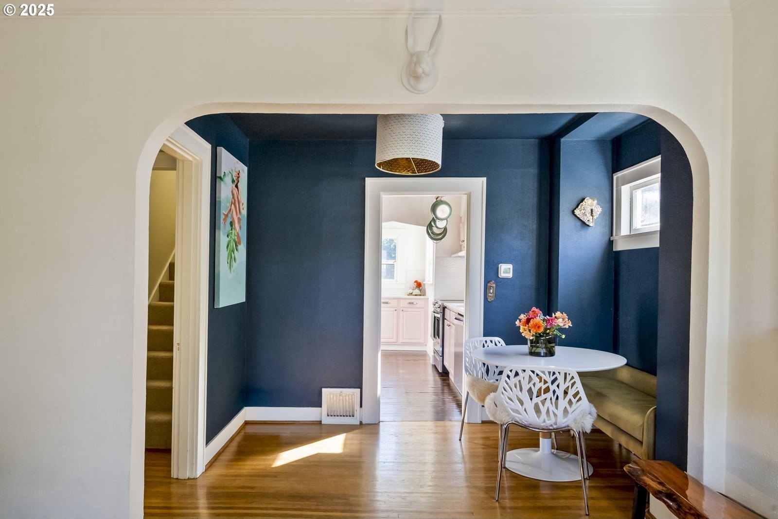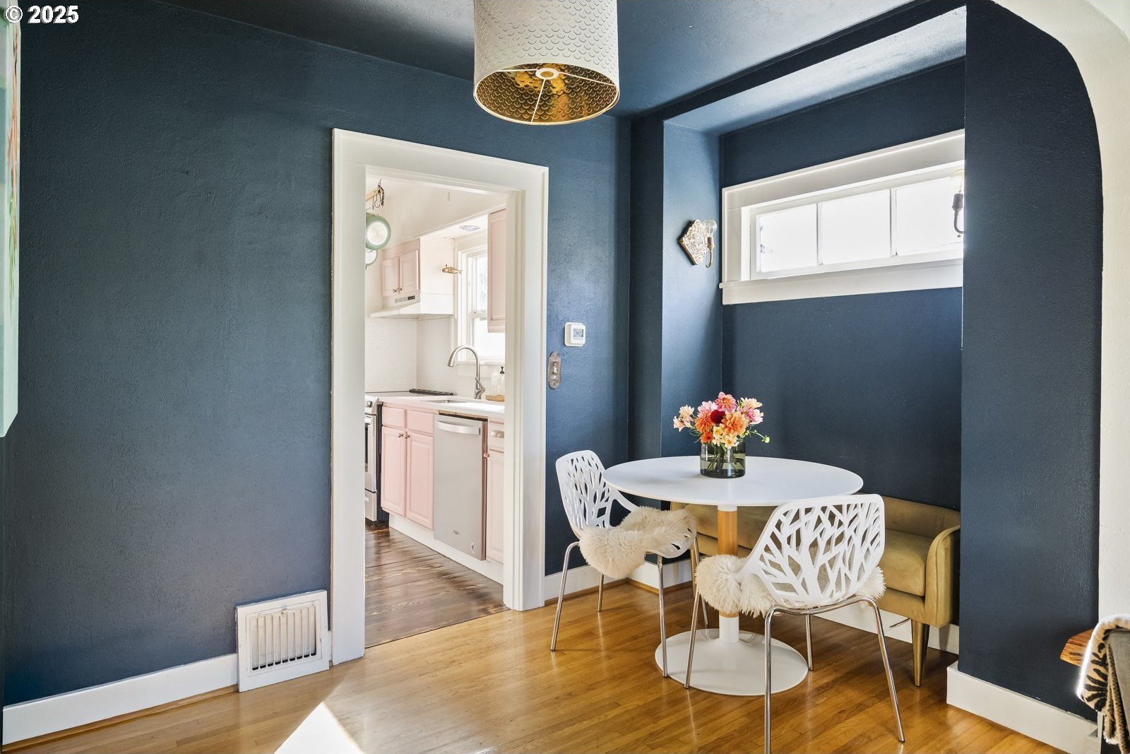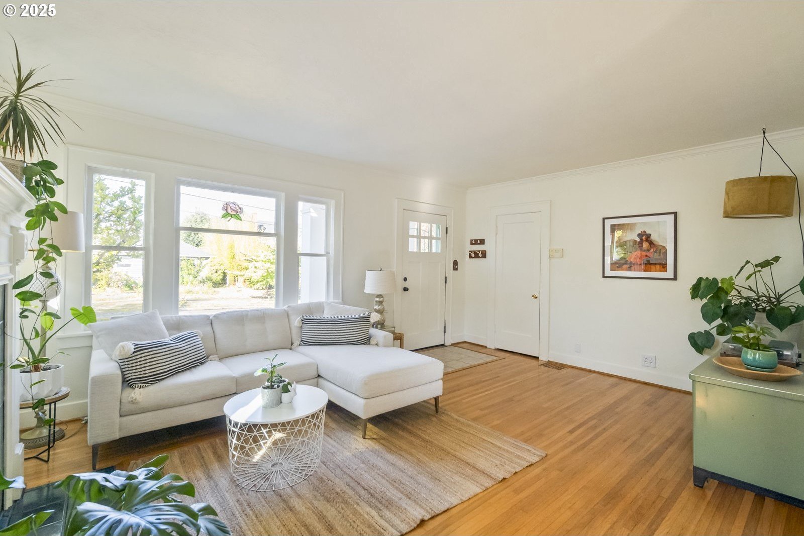 Discover this exceptional 1927 stucco home, exuding charm and elegance with its newly painted exterior in a timeless essential white, with just the right touch of creamy warmth. Upon the approach, prepare to be greeted by a landscaped front + the fenced backyard as a more private retreat. Embrace the essence of Portland living in this charming home, with beautiful oak hardwood floors that extend through the inviting living + dining room, complete with a cozy wood-burning fireplace. With coved details, quaint nooks, and a serene atmosphere, this home offers a unique sanctuary ready for its next fortunate owners. 2 bedrooms on the main and 2 on the upper level with an adjacent bonus space. Find a spot to tuck away and read, stretch + options for sleeping and a home office. On the main floor, in the private hall there is a large bathroom with double sink, expansive counter, plenty of storage and a shower/ tub combo. Find the joy of outdoor living in the fenced backyard, offering plenty of room for gardening + enjoying the beauty of each season as it unfolds. A unique copper cold plunge will remain with the home, providing a refreshing way to stay energized year-round. For added convenience, a covered outdoor dining and lounge area is situated near the back door, seamlessly connecting to the kitchen for entertaining.