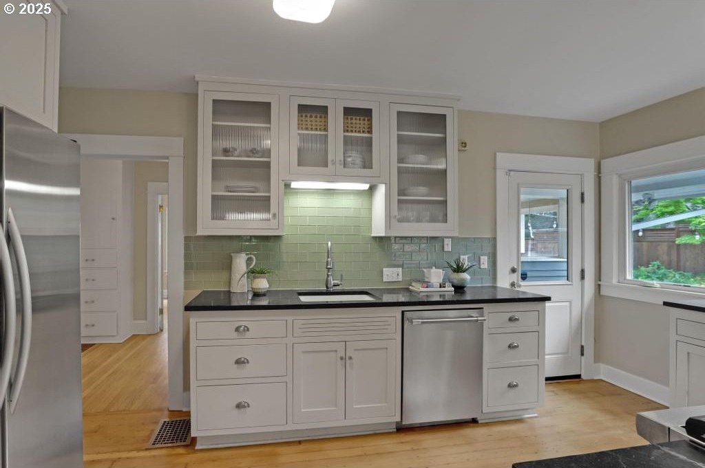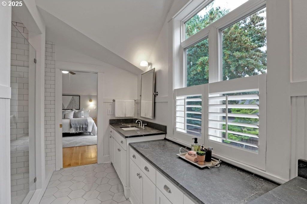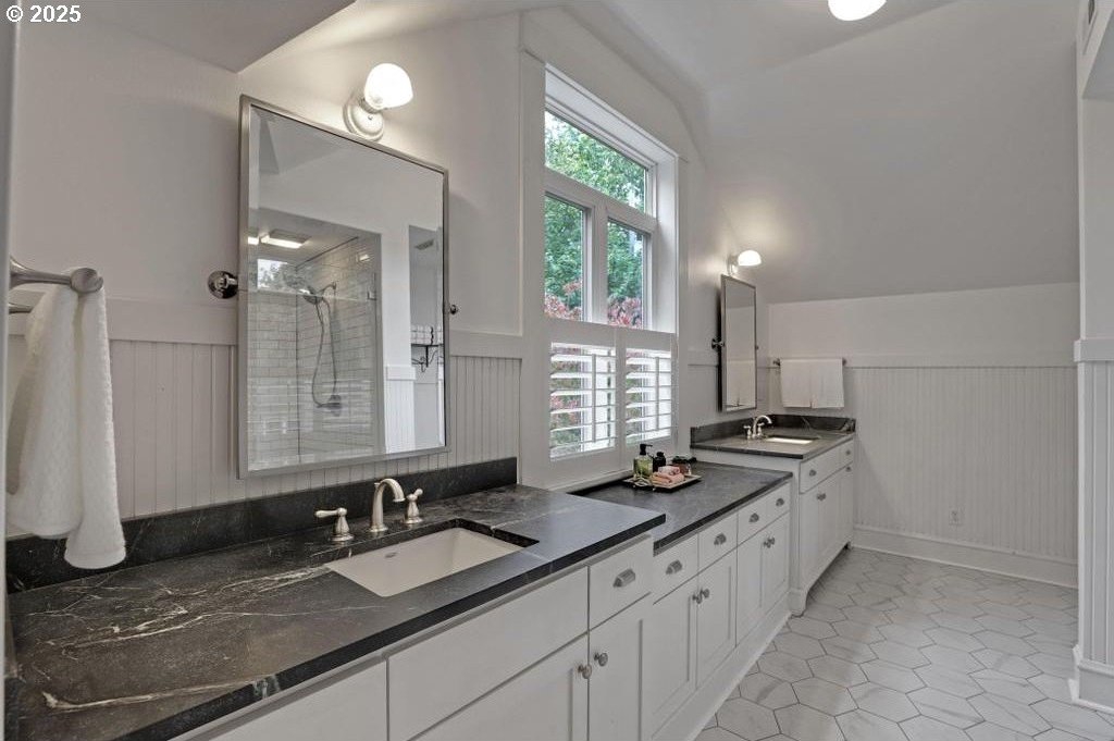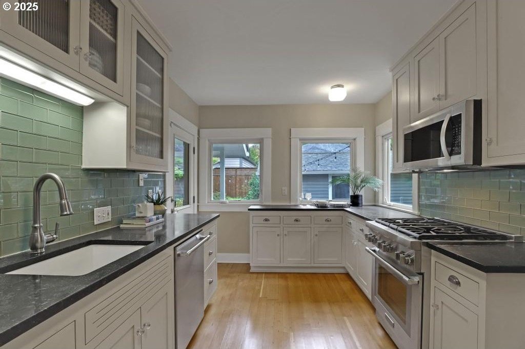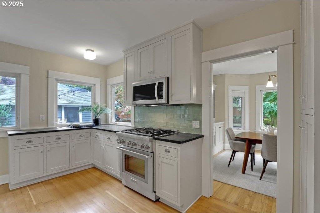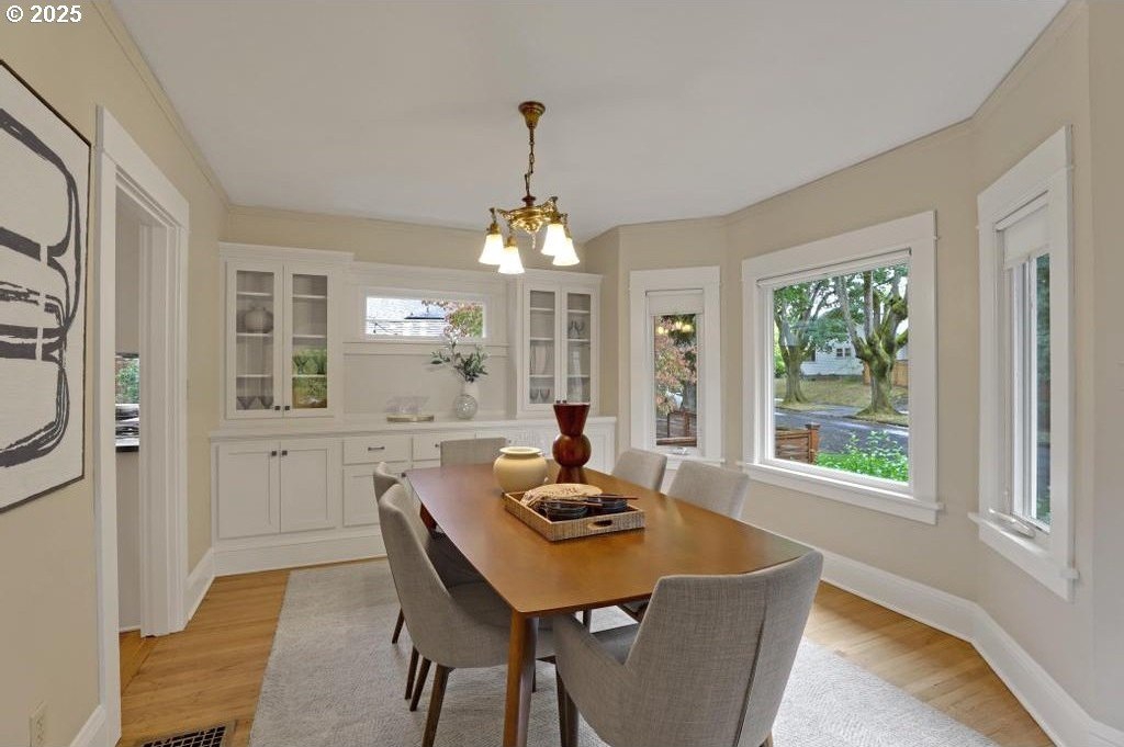 Stylishly remodeled bungalow lives large and beautifully! This light-filled Laurelhurst home on a gorgeous, sunny 6,200 SF corner lot checks all the boxes. Windows and natural light everywhere. Period charm blends seamlessly with modern updates throughout. A large, flexible floorplan includes a spacious living room with fireplace, dining room with pristine built-ins, beautifully remodeled, yet period-style kitchen with Thermador stainless appliances and soapstone counters, two bedrooms and a bath - all on the main floor! Three grand-sized bedrooms and impressively large, remodeled bathroom upstairs (two sinks and the shower of your dreams), spacious hallway with skylights, adorable desk nook, and a large landing. The warm and inviting finished family room in the lower level features a full bathroom, tons of storage, and great workshop. Truly beautiful, green, and lush professionally landscaped backyard patio is ideal for entertaining all year long. Fully fenced, covered back porch and mud room from driveway and garage, makes offloading easy. Like-new hot tub is tucked away for privacy and comes with the property. Please see the impressive “Updates” list, including newly remodeled bathroom, refinished hardwood and fir floors on two levels, exterior and interior paint, new basement carpeting, all in 2025. Truly turn-key and pristine! Epicenter to over 60+ fun restaurants, cafes, parks, and shopping. Please see carefully curated list. Just 1+ block from beloved Laurelhurst K-8 school. Walk score of 90 and Bike score of 91. Open Saturday and Sunday, 1-3 pm!