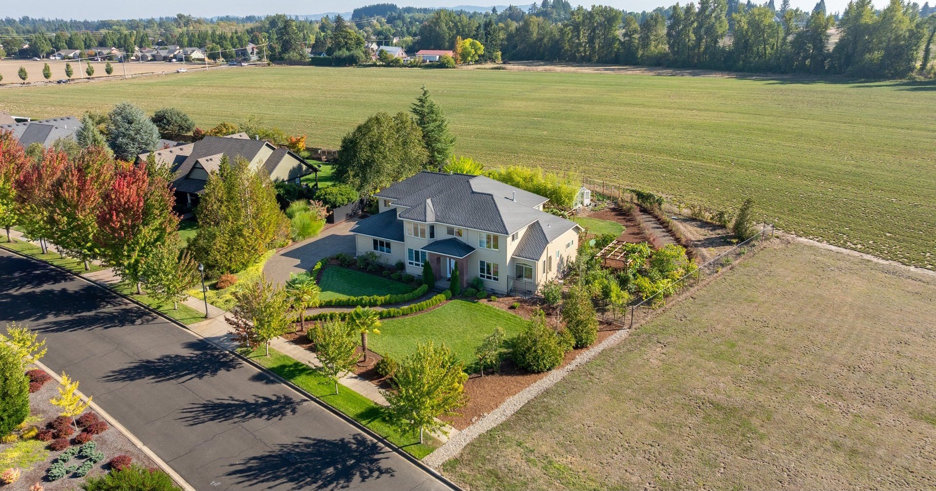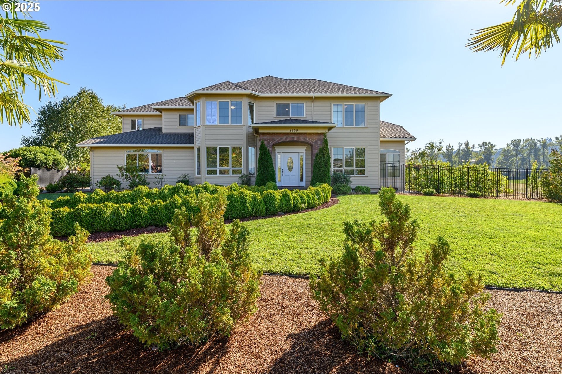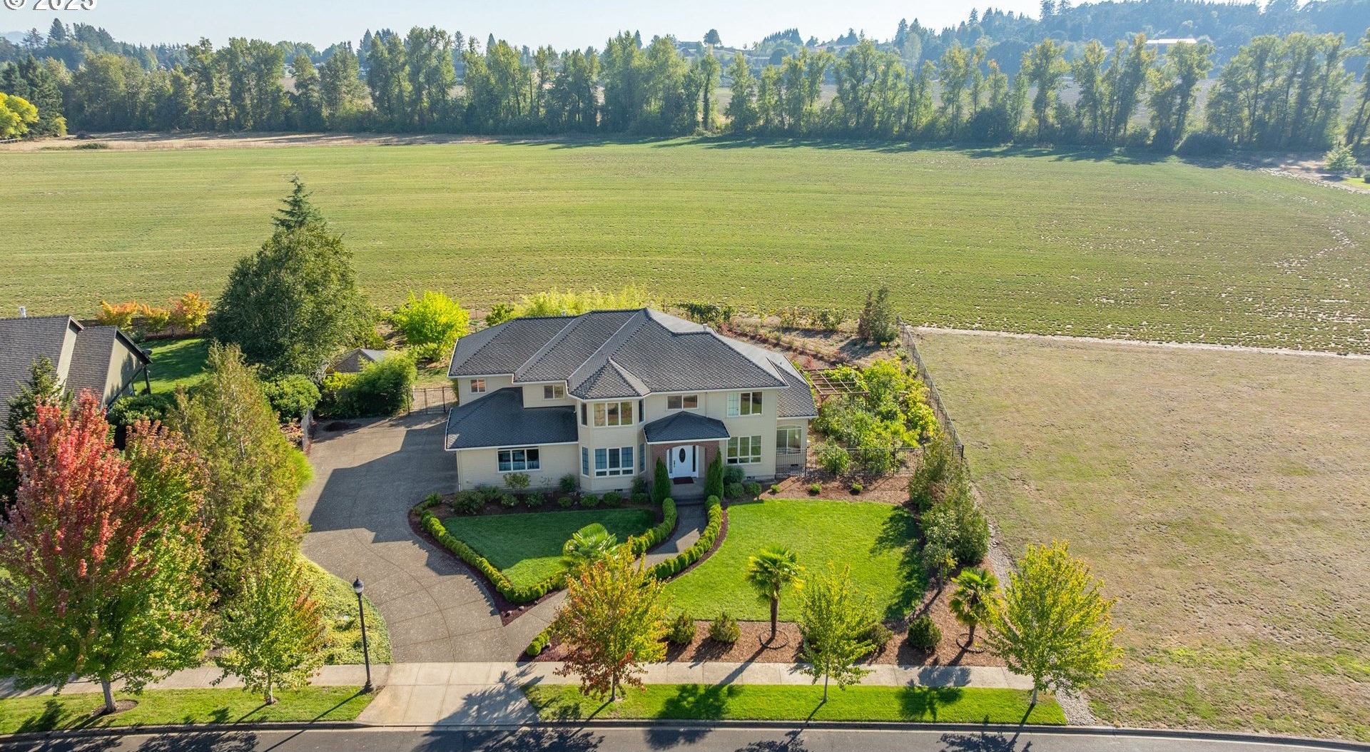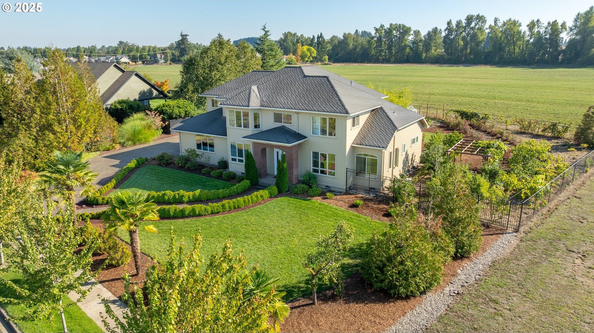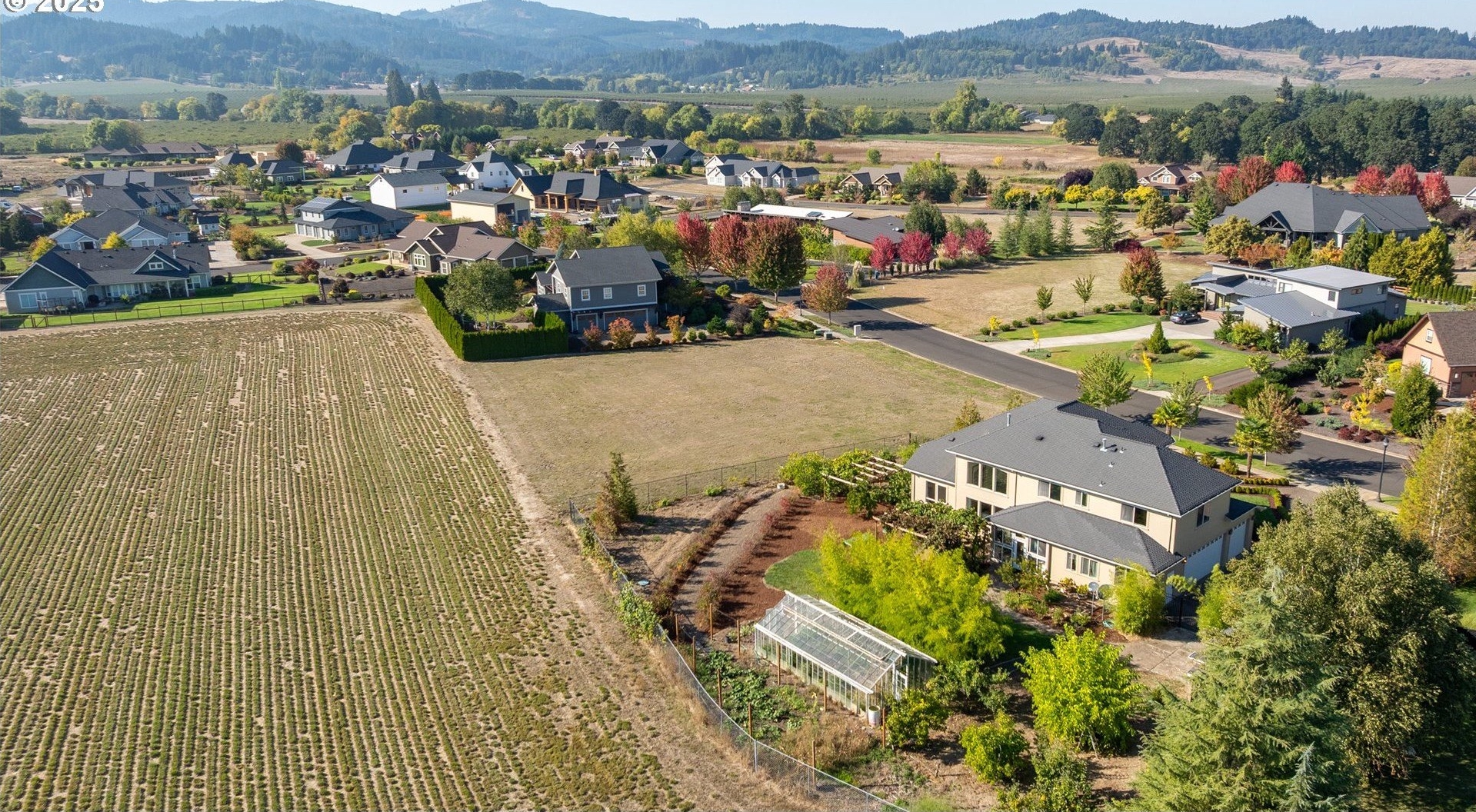 OPEN HOUSE SUNDAY OCTOBER 5TH FROM 12 TO 2 PM. An elegant and stately home is located in the exclusive West Wind Country Estates. The home sits on a large half-acre lot which overlooks farm fields and has views and the foothills of the Coastal Range. The home was built using top-end materials and finishes, including stunning solid Brazilian hardwood floors on the main level and double insulated walls. The large living room has 18 ft high ceilings, an impressive, cultured stone gas fireplace and a wall of windows with views of the back yard and fields. The kitchen, as part of the great room, features a cooking island with "prep" sink and eating bar. It includes top-of-the-line stainless-steel appliances and a new highly efficient oven. The main suite is on the 1st floor and features an attached bathroom with heated granite tiled flooring, a tiled walk-in shower, double sinks and a jetted tub for a spa like experience. A stunning staircase with elegant banisters leads to the 2nd level with a large landing. Upstairs there are two spacious guest bedrooms, each with an attached bathroom, an additional flex room or office which could be a 4th bedroom with an added closet. A large family or media room is ideal for games, movie night or a game of Ping Pong. There is space for your cars in the large, oversized 3-car garage with an EV-charger and additional parking in the wide driveway. Dreaming of growing your own fruits and vegetables?... Look no further... the fenced, backyard has among others, various fruit trees, blueberries, 7 grape varieties and a large greenhouse for all weather gardening.