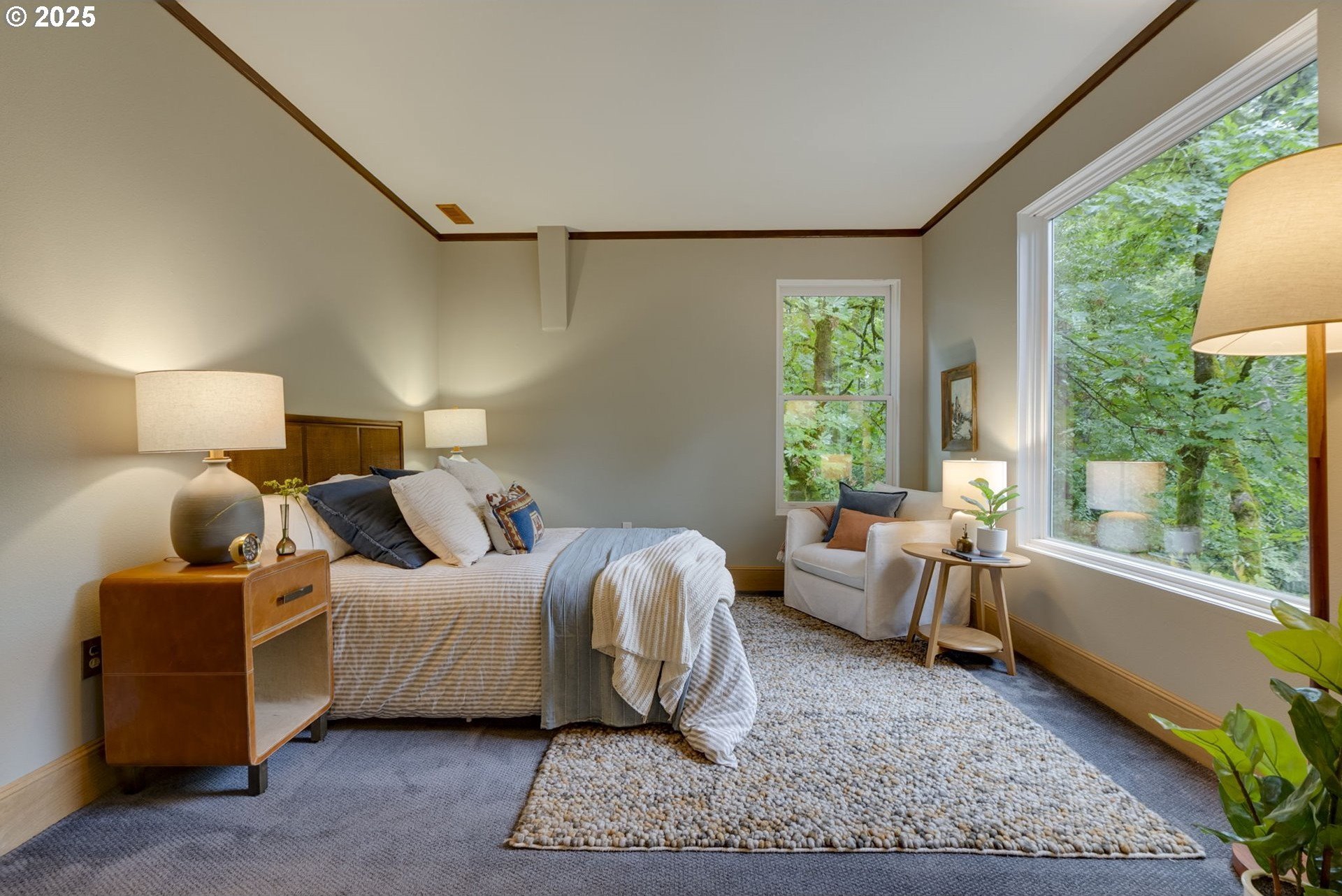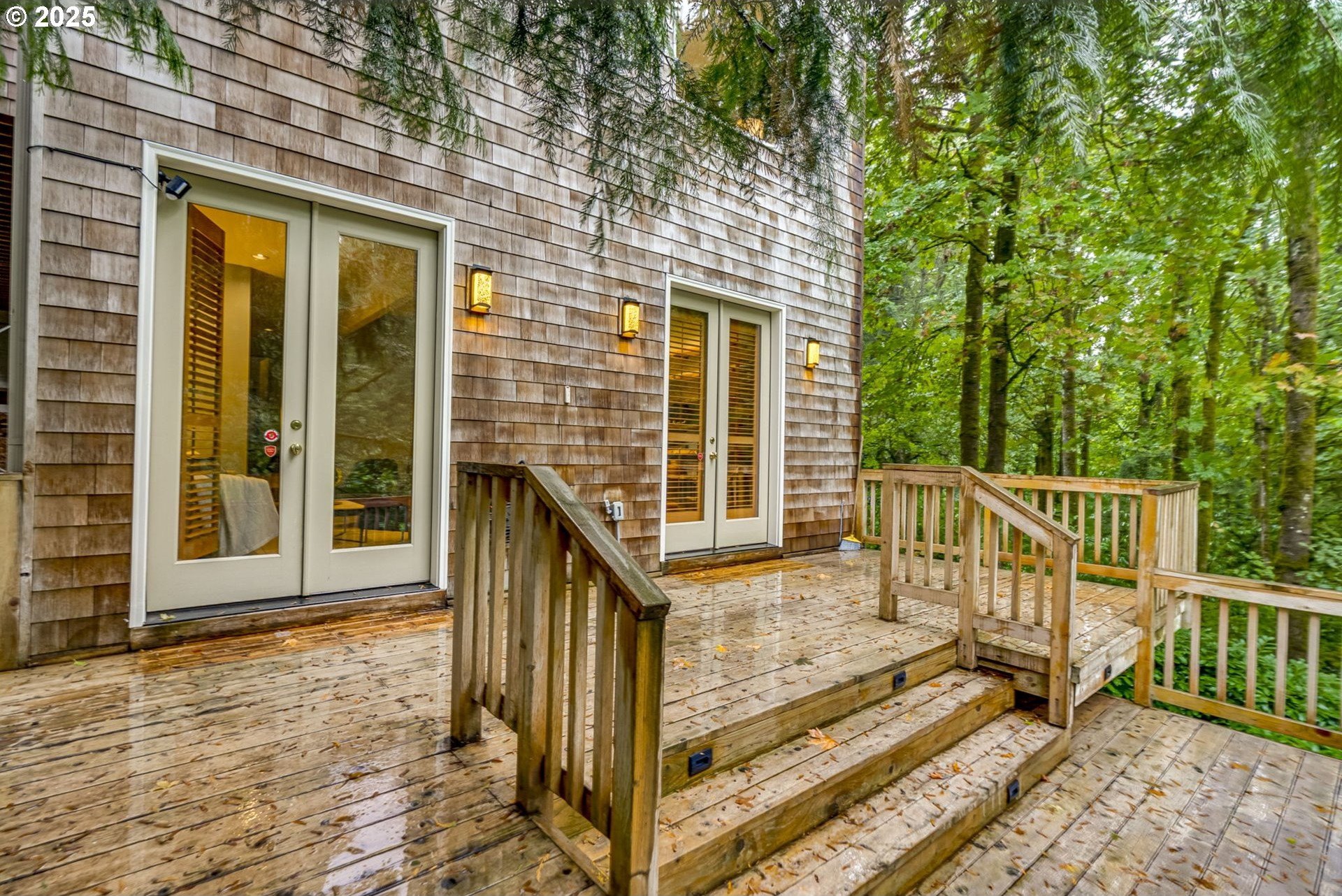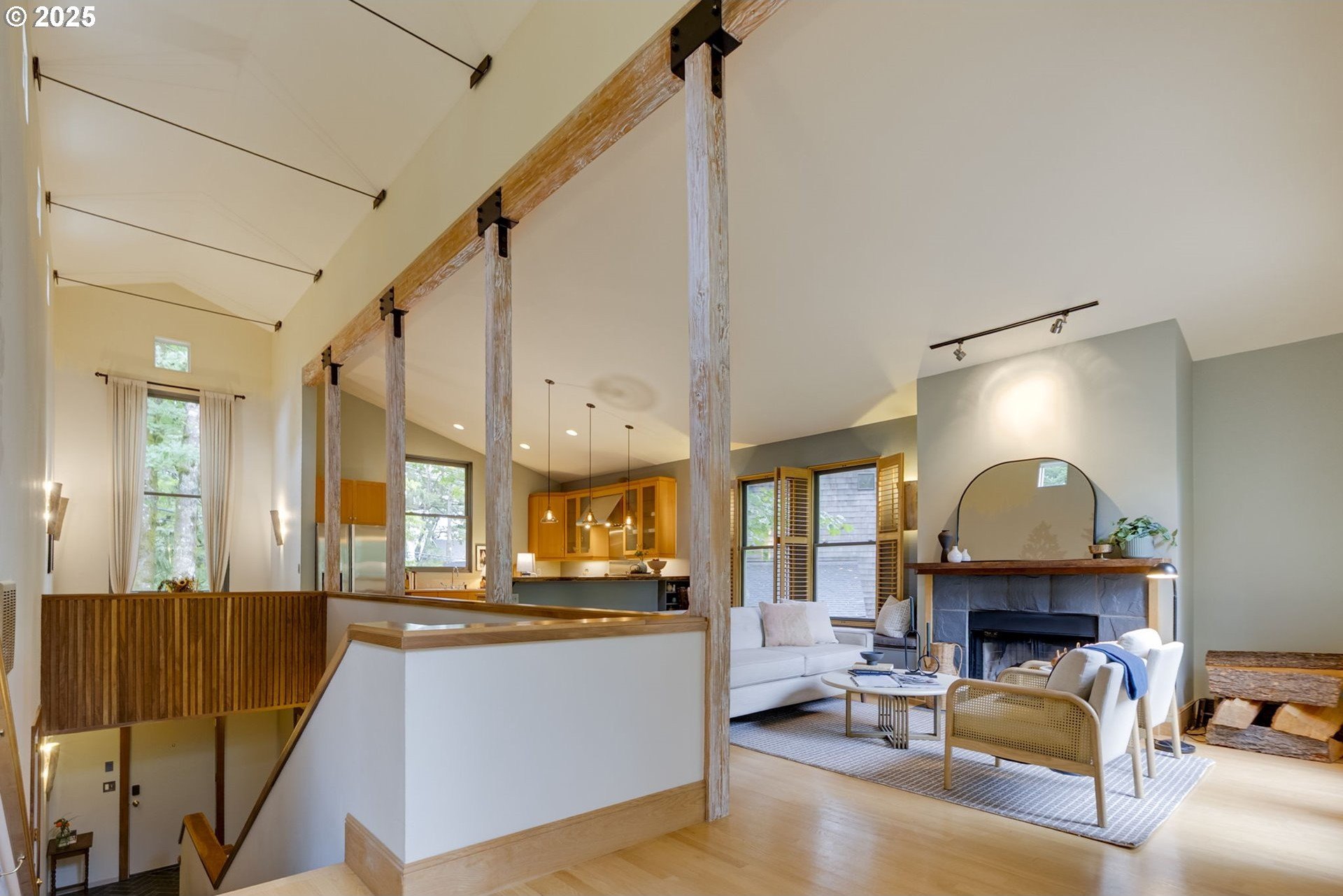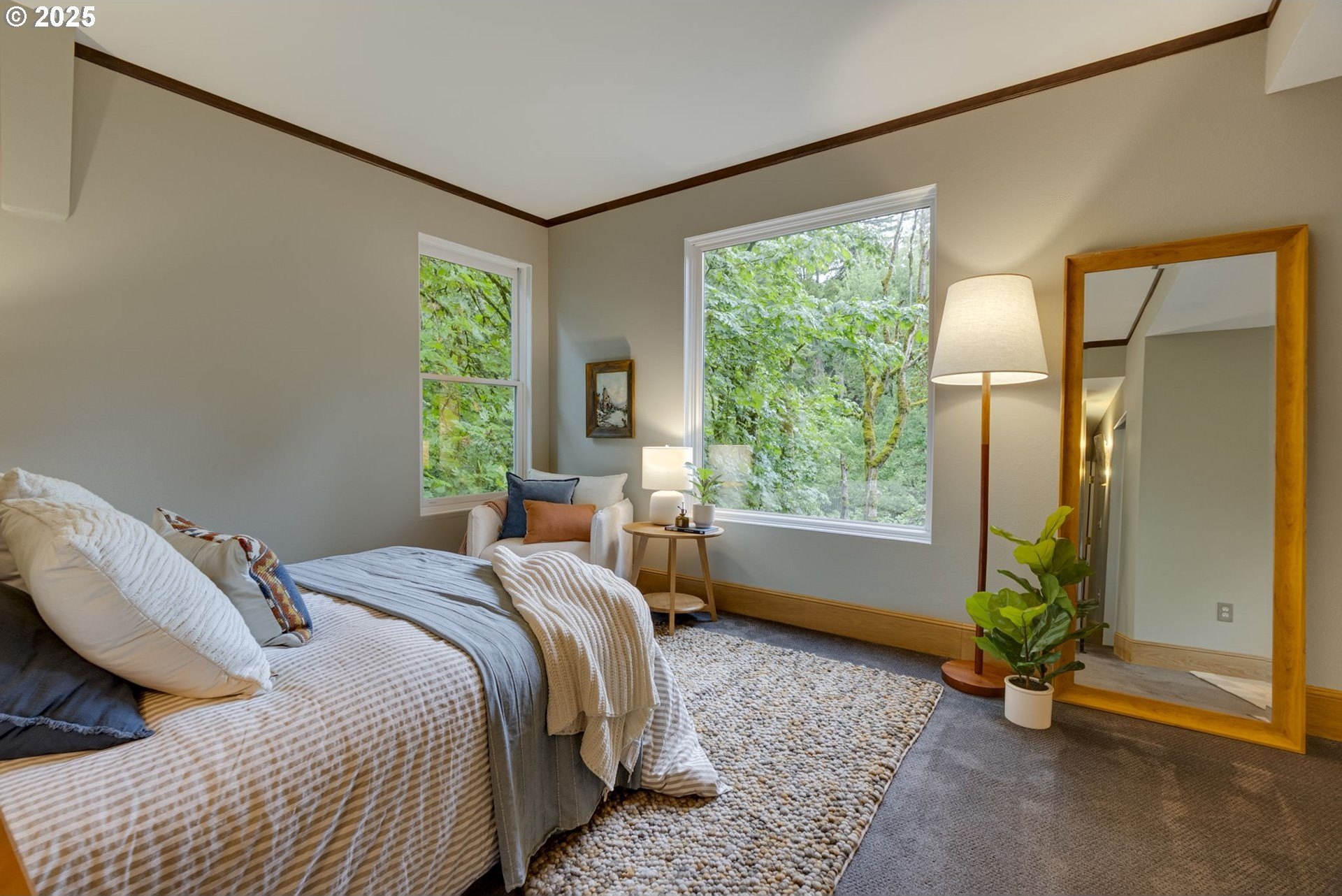 Modern Treehouse Living in Sylvan Heights! Perched above the street and nestled among the trees, this custom-built 1998 NW contemporary home offers a rare blend of architectural charm, natural beauty, and urban convenience. Designed to feel like a luxury treehouse, the home features soaring windows, vaulted ceilings, and clean modern lines that bring in abundant natural light and serene, wooded views from every room. The open concept invites both entertaining and everyday living, with a spacious kitchen equipped with modern cabinetry, stainless steel appliances, and ample storage. A cozy wood-burning fireplace anchors the living room, while expansive outdoor decks offer seamless indoor-outdoor living. Expansive living on three levels. The flexible floor plan includes a generous primary suite, a lower-level guest suite, a dedicated home office, and a versatile bonus room—ideal for gathering or finding a quiet retreat. Tucked into a peaceful residential loop just minutes from Washington Park, Forest Park, the Oregon Zoo, and NW 23rd Avenue, this home offers the best of Portland living. Enjoy easy access to downtown, top-rated schools, and miles of nearby trails. Whether you're sipping coffee among the treetops or hosting dinner with friends, this home offers a unique opportunity to live in nature—without leaving the city. [Home Energy Score = 4. HES Report at https://rpt.greenbuildingregistry.com/hes/OR10242157]