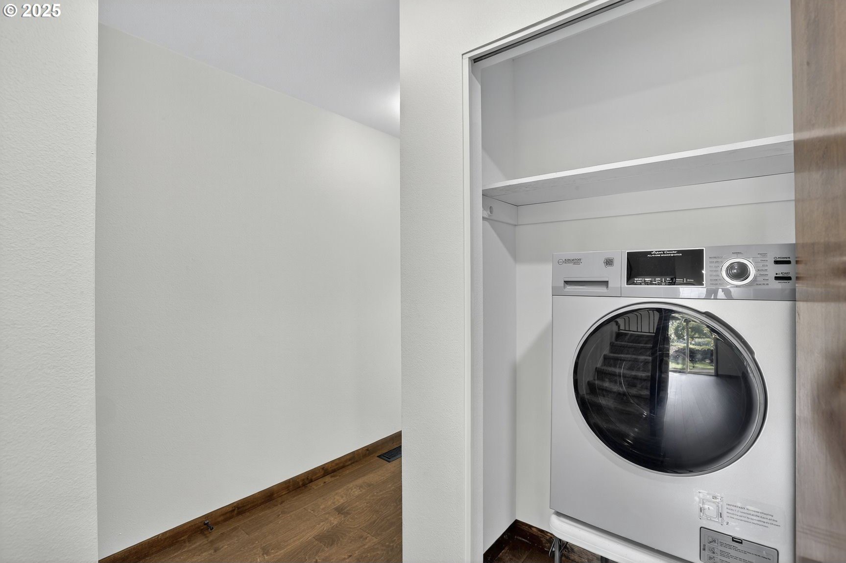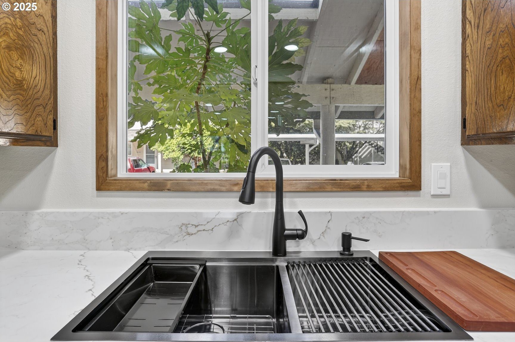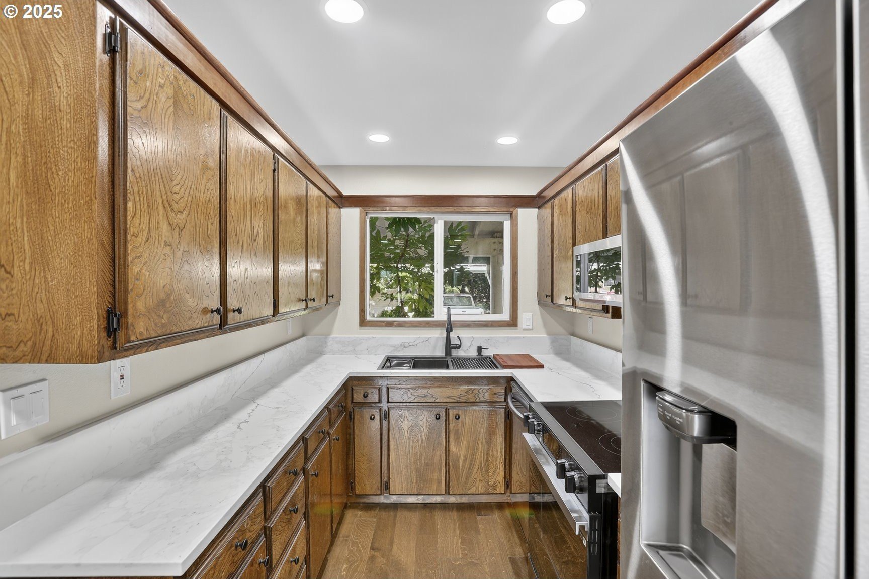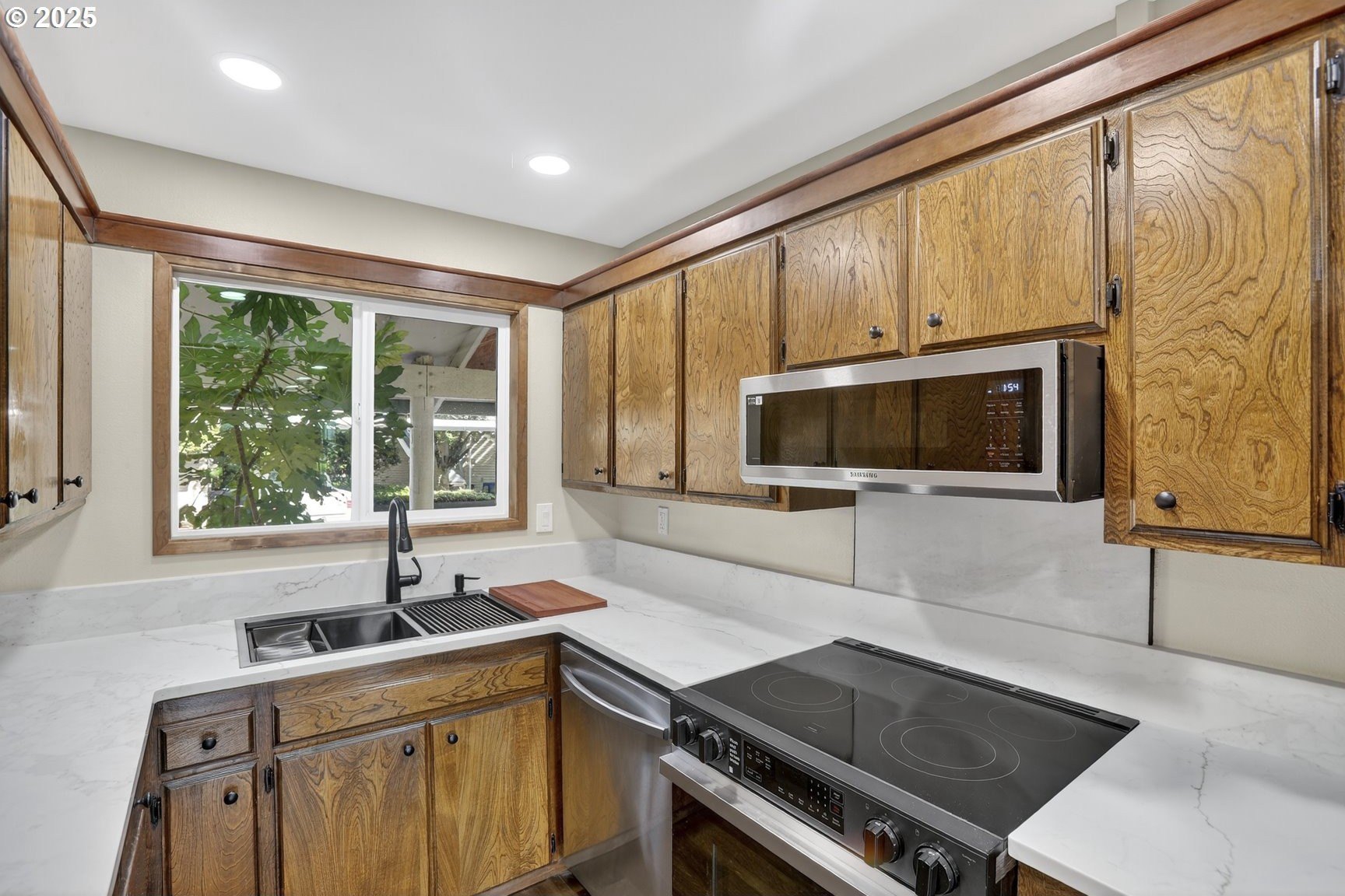 Vintage charm meets Modern amenities in this over-the-top restoration-renovation at Jantzen Beach Village! No surface was left untouched in this methodical and tasteful revitalization. Step back in time with period light fixtures and restored fir millwork, doors, and kitchen cabinetry, juxtaposed amongst all new mechanical systems, surfaces, & fixtures. You won't find any grey LVP nor white pressboard trim in this unit; quality abounds! New air handler, oversized heat pump, water heater, electrical panel, & new lifetime warranty Milguard windows and doors for lowest possible electric bill! NO popcorn ceilings in this unit! Abated to make way for all adjustable-zoned led recessed and fixture lighting throughout! High end Samsung appliances round out the monthly savings! The kitchen has 1" quartz slab, backsplash, and modern black stainless sink. Convenient motion and light sensor led lighting in under stair storage and rear shed will brighten the space as you open and turn off in case forgotten! The main level boasts glue down engineered hardwood flooring and stained hemlock baseboards. Vintage abounds in the 1/2 bath with black hex tile flooring, restored 70's yellow sink and toilet, accompanied with black hardware & fixtures. A custom black railing ascends to the upper level & brand-new carpeting with upgraded pad is solid & cozy underfoot! Both bedrooms have central lighting with remote ceiling fans, solid wood stained & painted millwork, & motion / light sensing lights in closets. The upstairs bath is a work of art with heated porcelain tile floors, walk in shower, high end vanity with soft close, slab top, dual undermount sinks; all in brushed gold, carrying the vintage vibe! And why not..A heated bidet! Attention to detail, period restored elements, all new mechanicals, quality fixtures, fit, & finish make this a truly 1 of a kind renovation! Unit comes with a deeded carport, rear patio, and access to all the amenities Jantzen Beach Village has to offer!!
