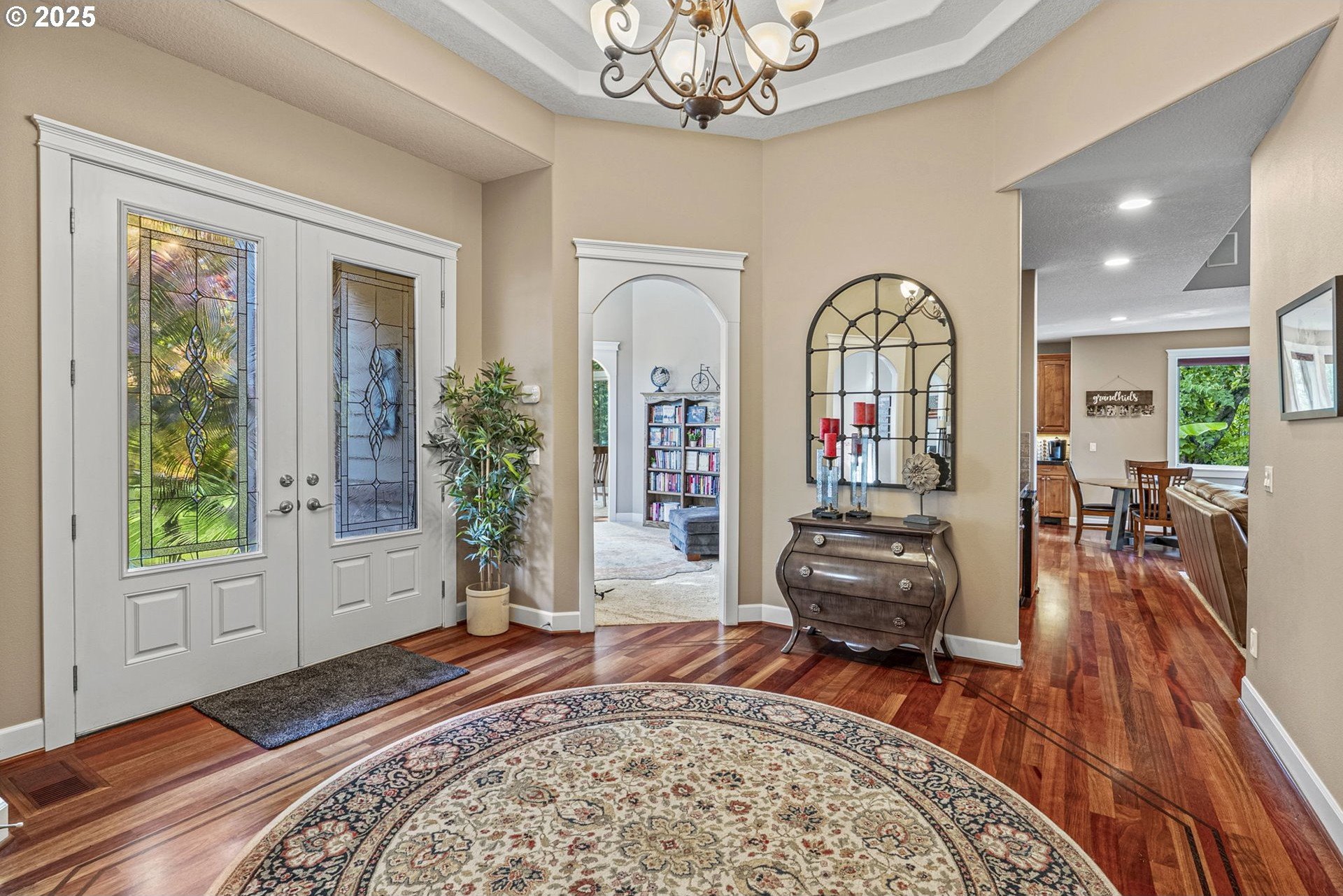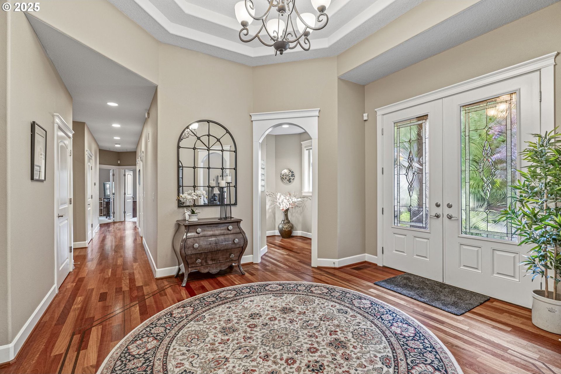 Beautiful Custom Home, this stunning quality-built home 3 bedrooms, 2.5 bathrooms, with den/office ,sits on 1.42 beautifully landscaped acres and offers the perfect blend of elegance, comfort, and space. A covered deck with wood accents and Custom Screens ambient lighting and Heat system sets the stage for unforgettable evenings of outdoor entertaining.Step inside to a welcoming formal entry, spacious halls, and a dining room that flows seamlessly into the large kitchen, all highlighted by gleaming cherry hardwood floors. The kitchen features granite countertops, a center island with cooktop and bar seating, and a generous eating area that adjoins the great room — ideal for hosting friends and family gatherings.The lovely primary suite overlooks the picturesque grounds, creating a peaceful retreat to unwind at the end of the day. Garden area, Water feature, Firepit, Call today for your private tour!
