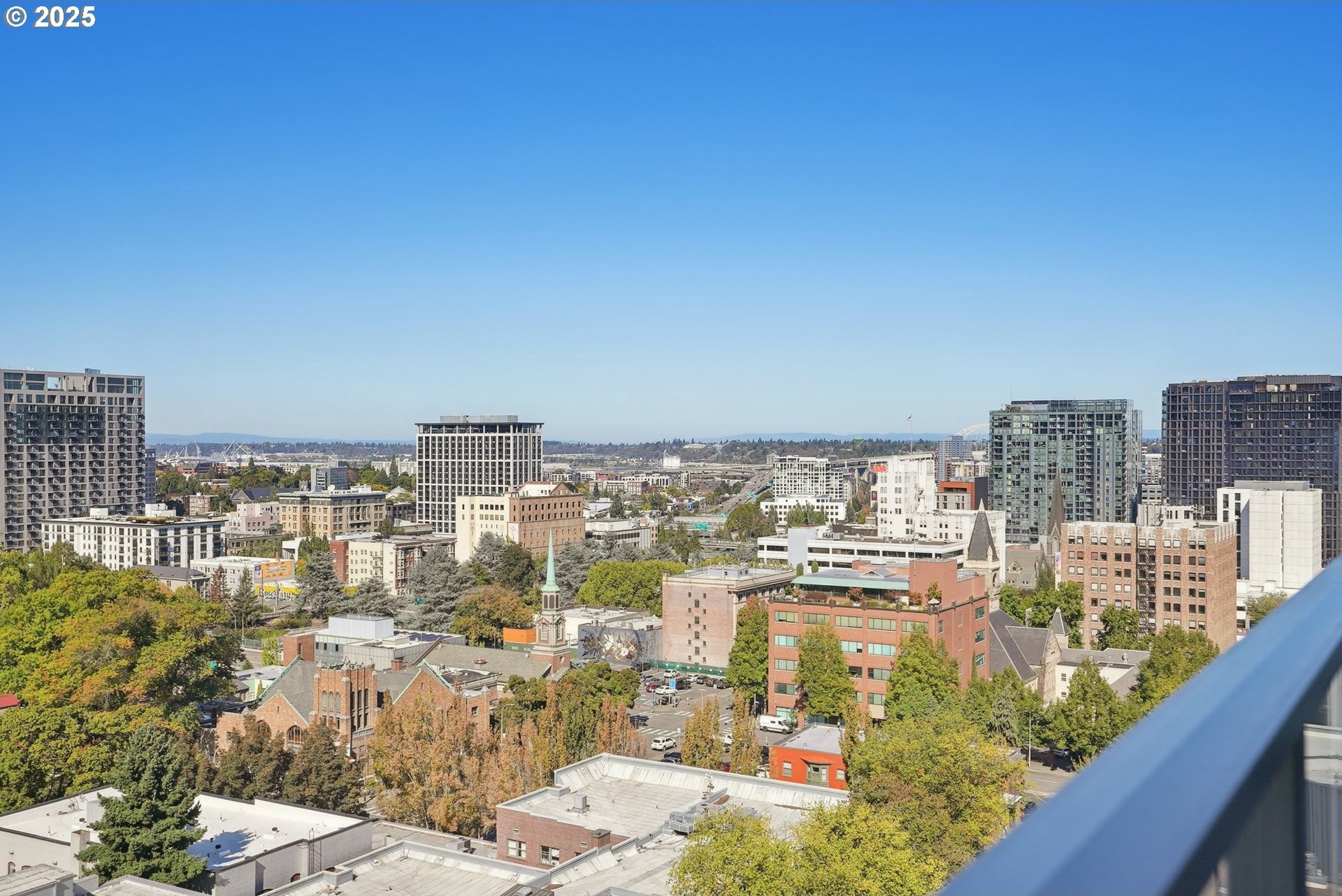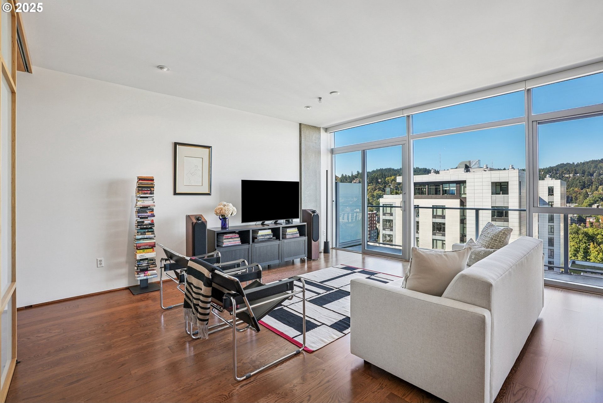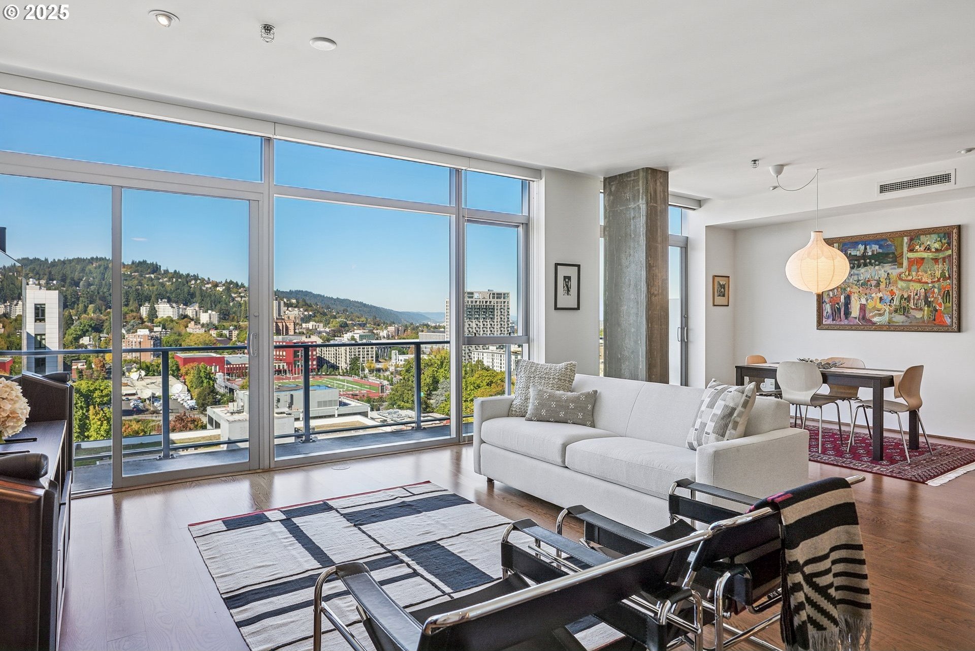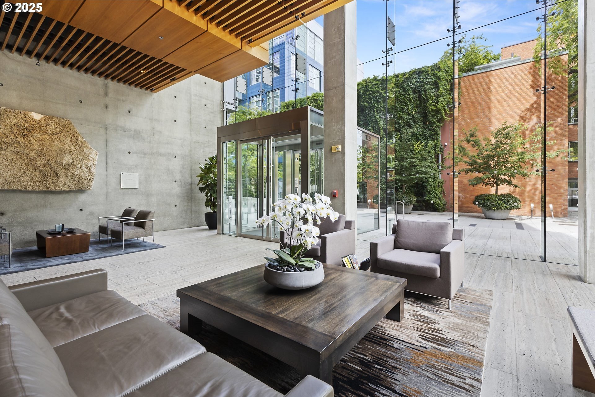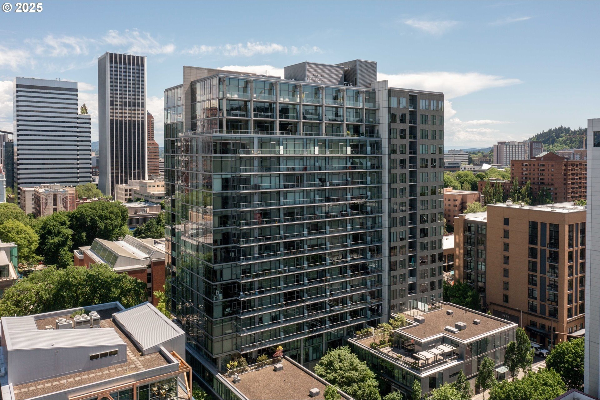Enjoy a turnkey lifestyle & a breath of fresh air in this light and bright condo on the highest floor possible before the penthouse levels. Mid-century vibes & modern style with an open living area flooded with light from the floor to ceiling windows with two layers of mesh solar shades to control all the natural light you like. Enjoy watching the sunsets & grilling on the balcony spanning over 26'. Clean lines in the kitchen with European-style cabinets, granite counters, a custom full-height backsplash and stainless appliances, including the wine cooler in the eating island. The primary suite is private off the living room with custom wood & glass sliders, custom closets & an en suite bathroom featuring a marble vanity and large soaking tub/shower combination. Matching custom wood & glass sliders enclose the 2nd bedroom for working or hosting guests with the adjacent 2nd bath. The large entry leads to a big laundry room with generous storage space, washer & dryer. Separately deeded & secure parking space is within the building, and includes a private storage room adjacent to the parking space. The building has power for EV charging & each owner can contract to bring the power and install charging stations at each parking space at their own cost. The building has many wonderful amenities: fitness room & library on the 2nd floor, meeting room & common terrace with kitchen & bath on the 3rd floor, plus 24/7 concierge service. Strong HOA & very well managed building. Frequent the new Mark Rothko Pavilion at the Portland Art Museum across the street, events at the Schnitz, Oregon Historical Society, Farmers Markets, classes at PSU, downtown shopping & dining.