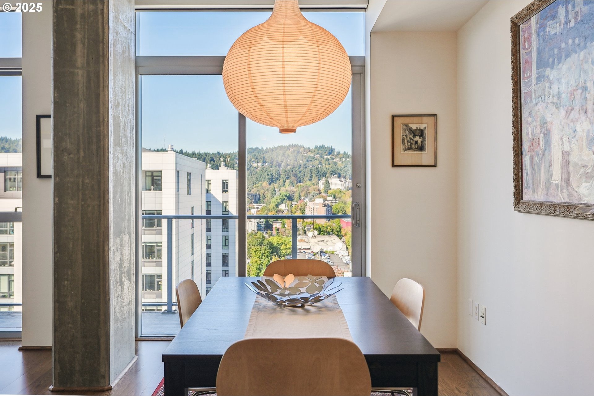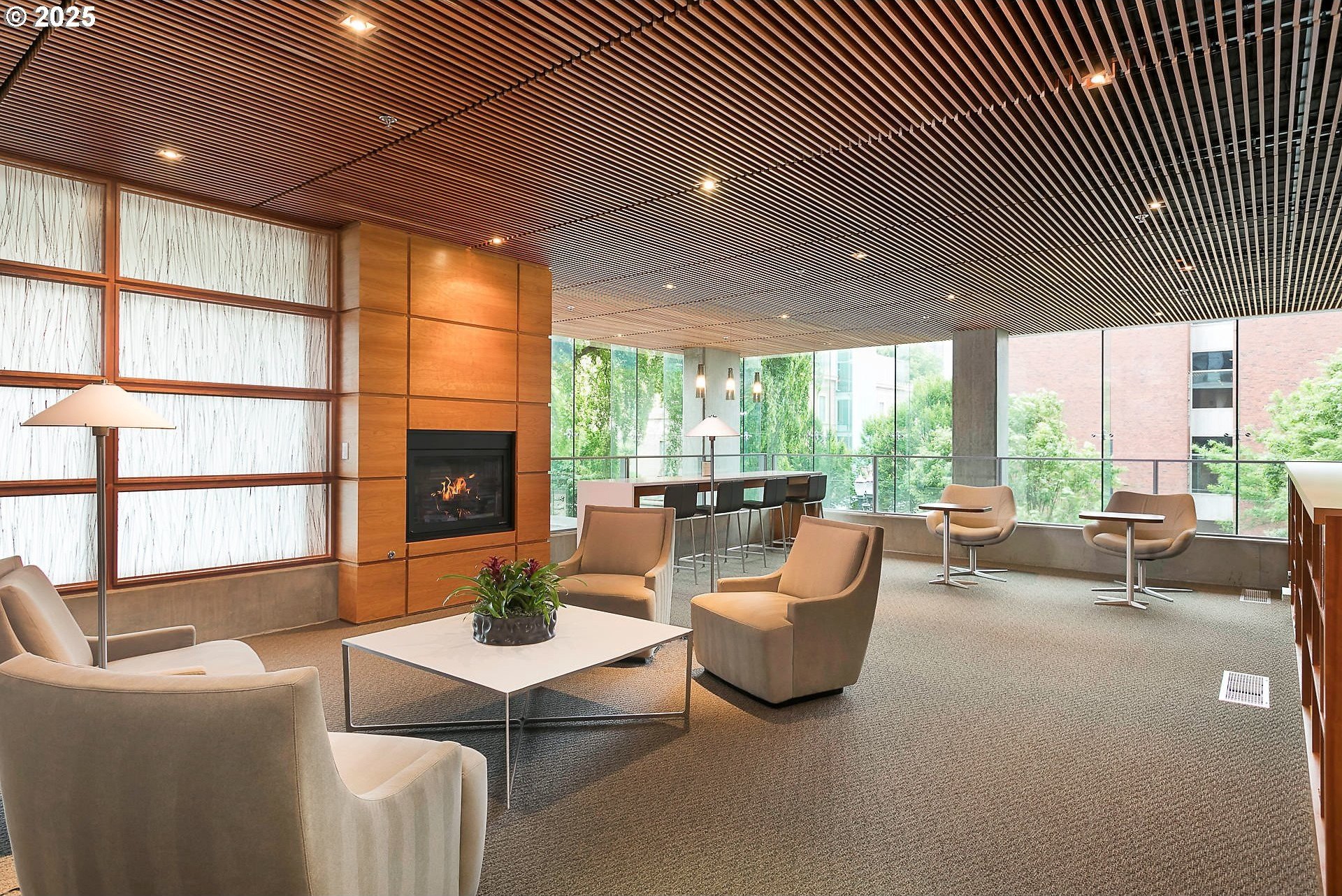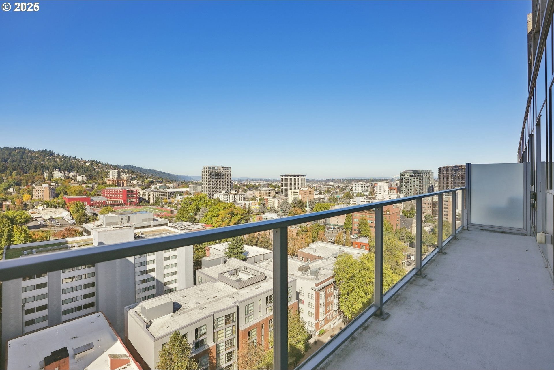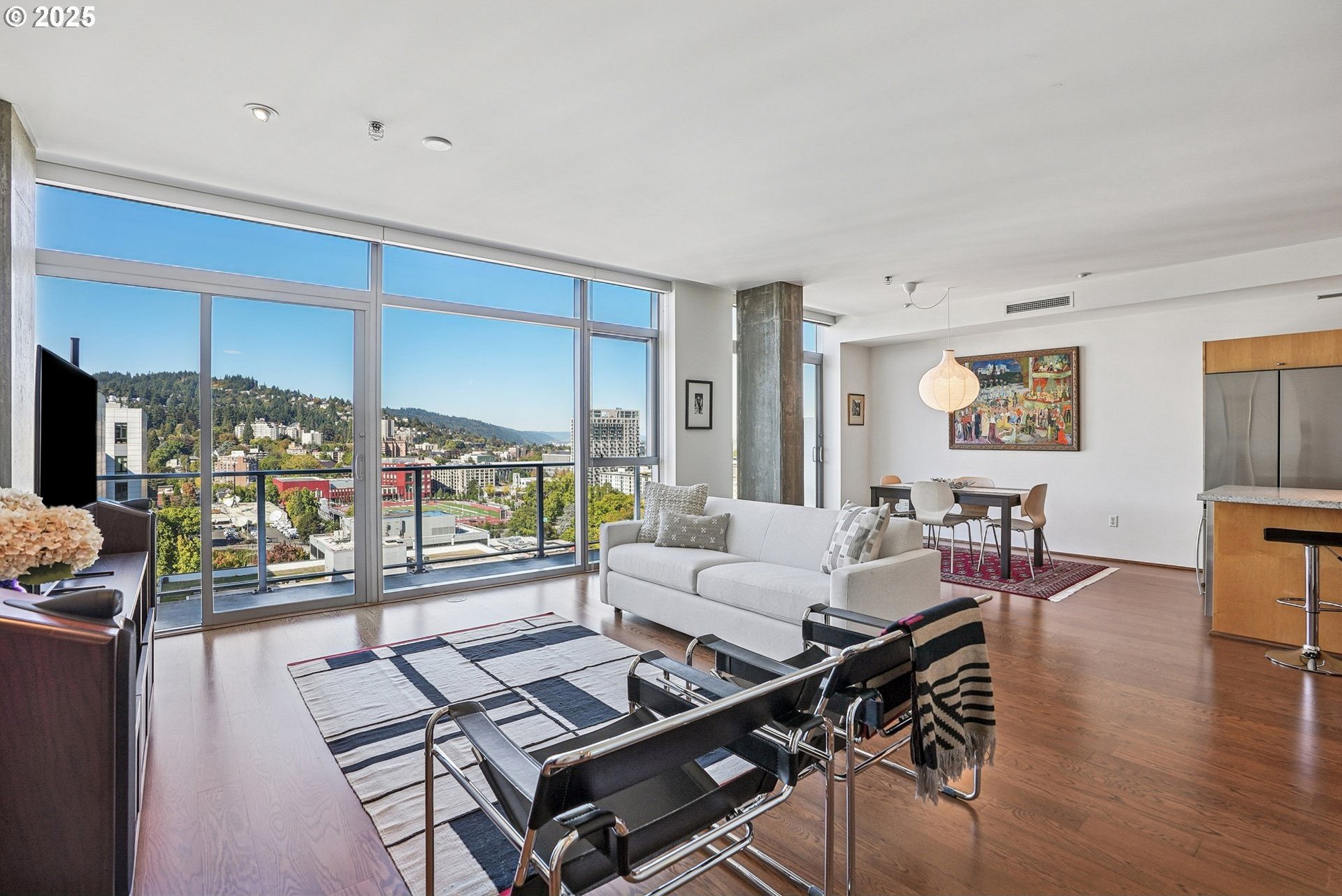 Enjoy a turnkey lifestyle & a breath of fresh air in this light and bright condo on the highest floor possible before the penthouse levels. Mid-century vibes & modern style with an open living area flooded with light from the floor to ceiling windows with two layers of mesh solar shades to control all the natural light you like. Enjoy watching the sunsets & grilling on the balcony spanning over 26'. Clean lines in the kitchen with European-style cabinets, granite counters, a custom full-height backsplash and stainless appliances, including the wine cooler in the eating island. The primary suite is private off the living room with custom wood & glass sliders, custom closets & an en suite bathroom featuring a marble vanity and large soaking tub/shower combination. Matching custom wood & glass sliders enclose the 2nd bedroom for working or hosting guests with the adjacent 2nd bath. The large entry leads to a big laundry room with generous storage space, washer & dryer. Separately deeded & secure parking space is within the building, and includes a private storage room adjacent to the parking space. The building has power for EV charging & each owner can contract to bring the power and install charging stations at each parking space at their own cost. The building has many wonderful amenities: fitness room & library on the 2nd floor, meeting room & common terrace with kitchen & bath on the 3rd floor, plus 24/7 concierge service. Strong HOA & very well managed building. Frequent the new Mark Rothko Pavilion at the Portland Art Museum across the street, events at the Schnitz, Oregon Historical Society, Farmers Markets, classes at PSU, downtown shopping & dining.