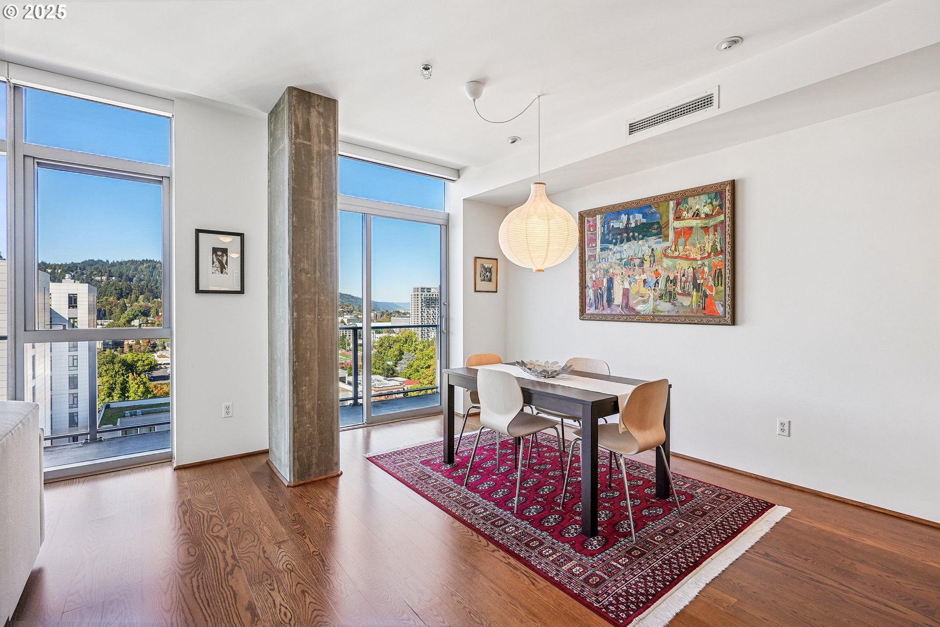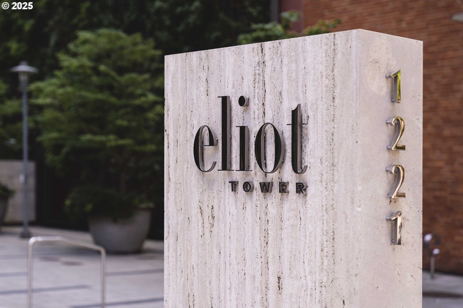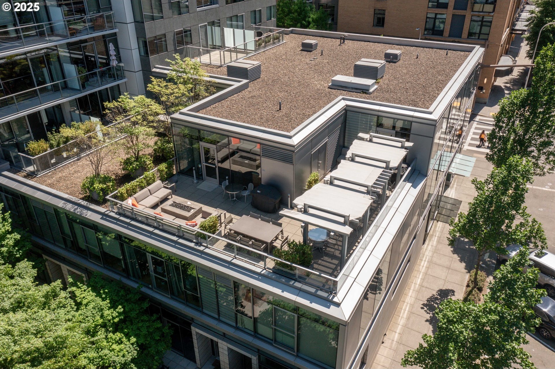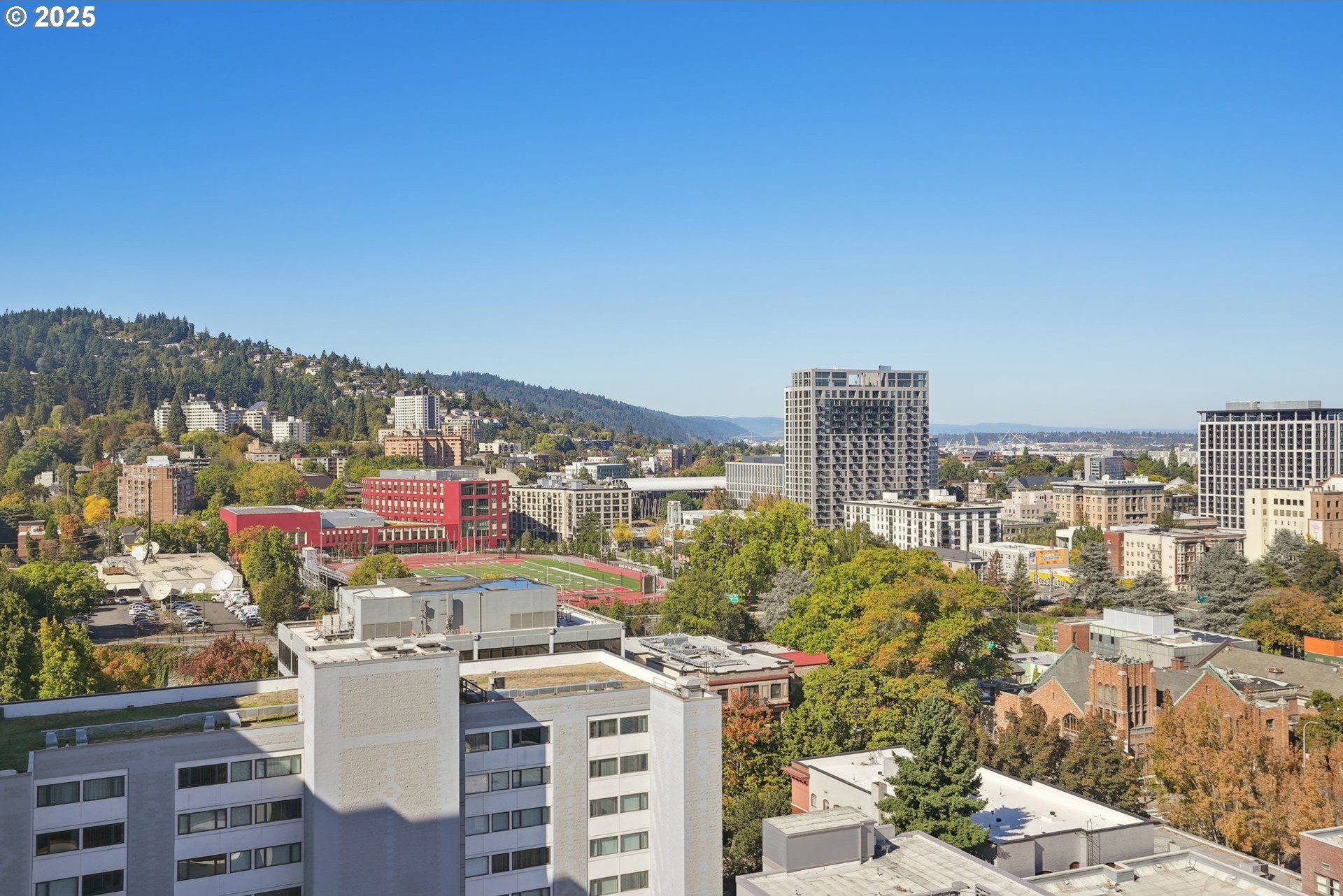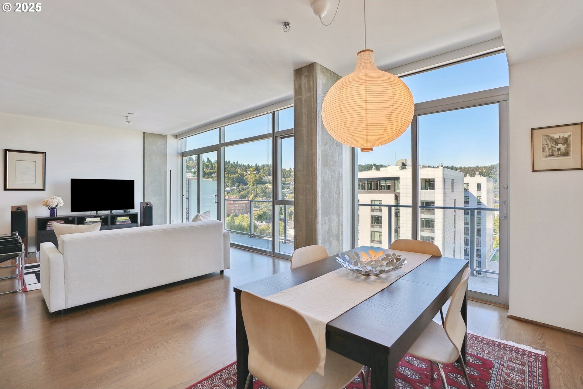 Enjoy a turnkey lifestyle & a breath of fresh air in this light and bright condo on the highest floor possible before the penthouse levels. Mid-century vibes & modern style with an open living area flooded with light from the floor to ceiling windows with two layers of mesh solar shades to control all the natural light you like. Enjoy watching the sunsets & grilling on the balcony spanning over 26'. Clean lines in the kitchen with European-style cabinets, granite counters, a custom full-height backsplash and stainless appliances, including the wine cooler in the eating island. The primary suite is private off the living room with custom wood & glass sliders, custom closets & an en suite bathroom featuring a marble vanity and large soaking tub/shower combination. Matching custom wood & glass sliders enclose the 2nd bedroom for working or hosting guests with the adjacent 2nd bath. The large entry leads to a big laundry room with generous storage space, washer & dryer. Separately deeded & secure parking space is within the building, and includes a private storage room adjacent to the parking space. The building has power for EV charging & each owner can contract to bring the power and install charging stations at each parking space at their own cost. The building has many wonderful amenities: fitness room & library on the 2nd floor, meeting room & common terrace with kitchen & bath on the 3rd floor, plus 24/7 concierge service. Strong HOA & very well managed building. Frequent the new Mark Rothko Pavilion at the Portland Art Museum across the street, events at the Schnitz, Oregon Historical Society, Farmers Markets, classes at PSU, downtown shopping & dining.