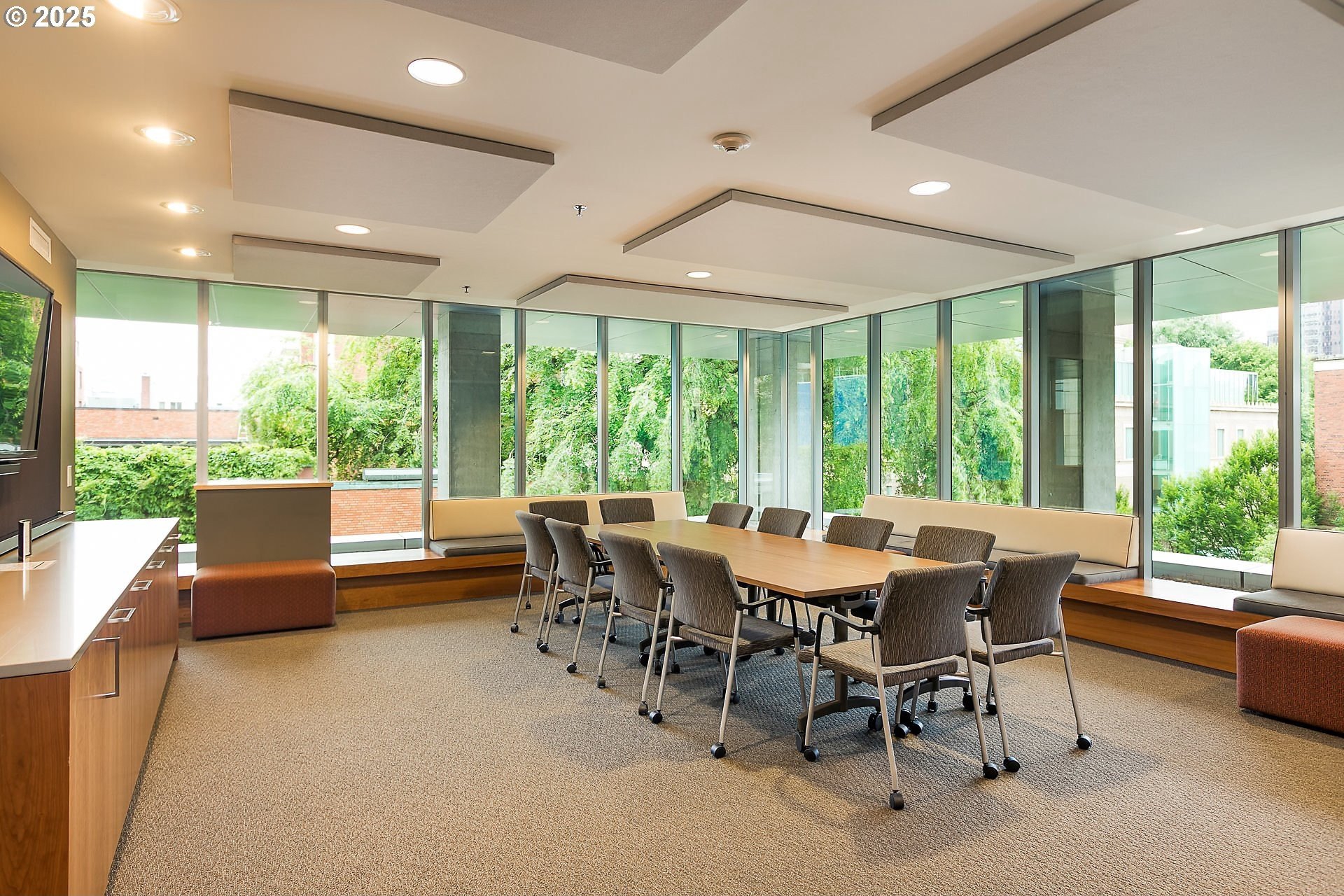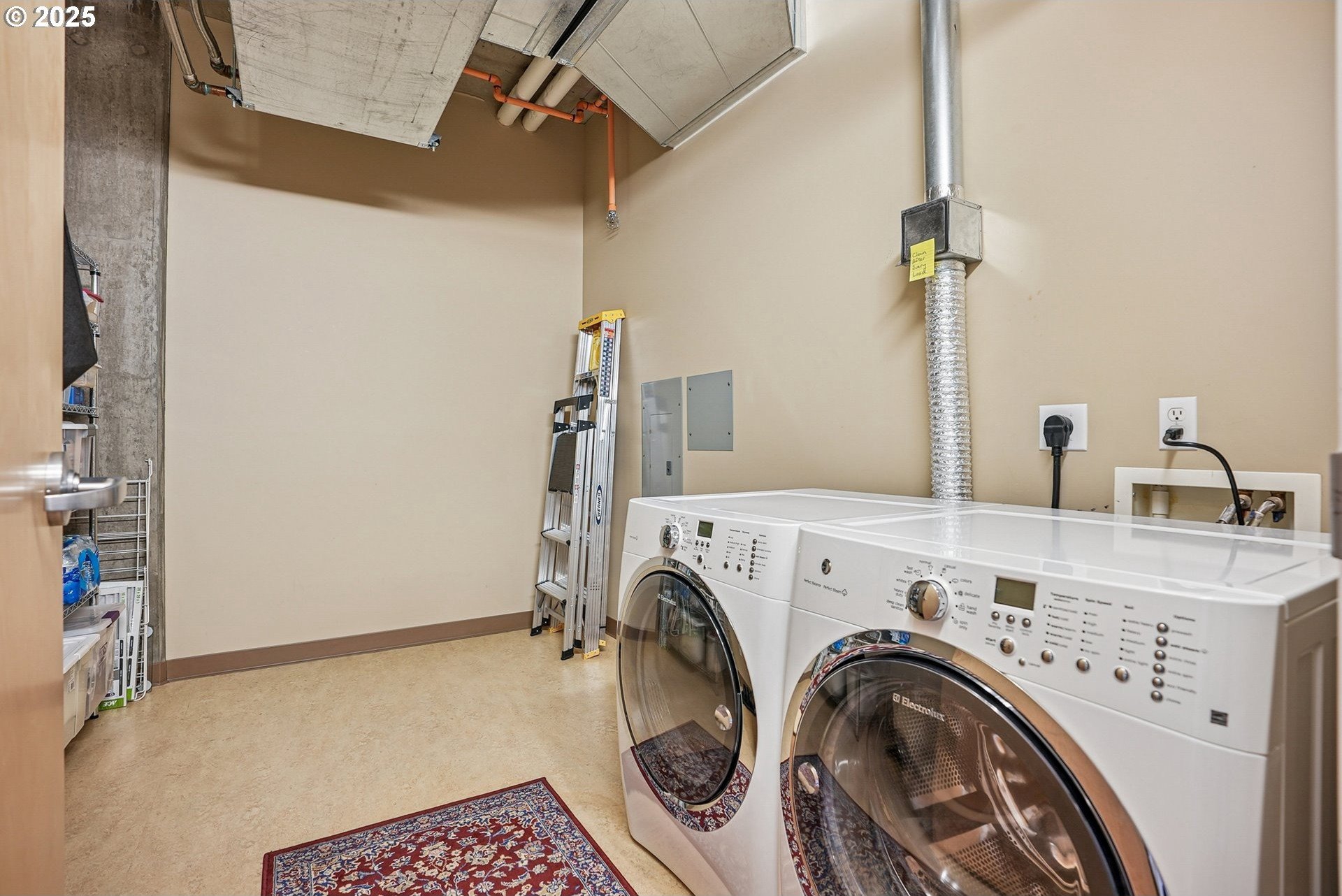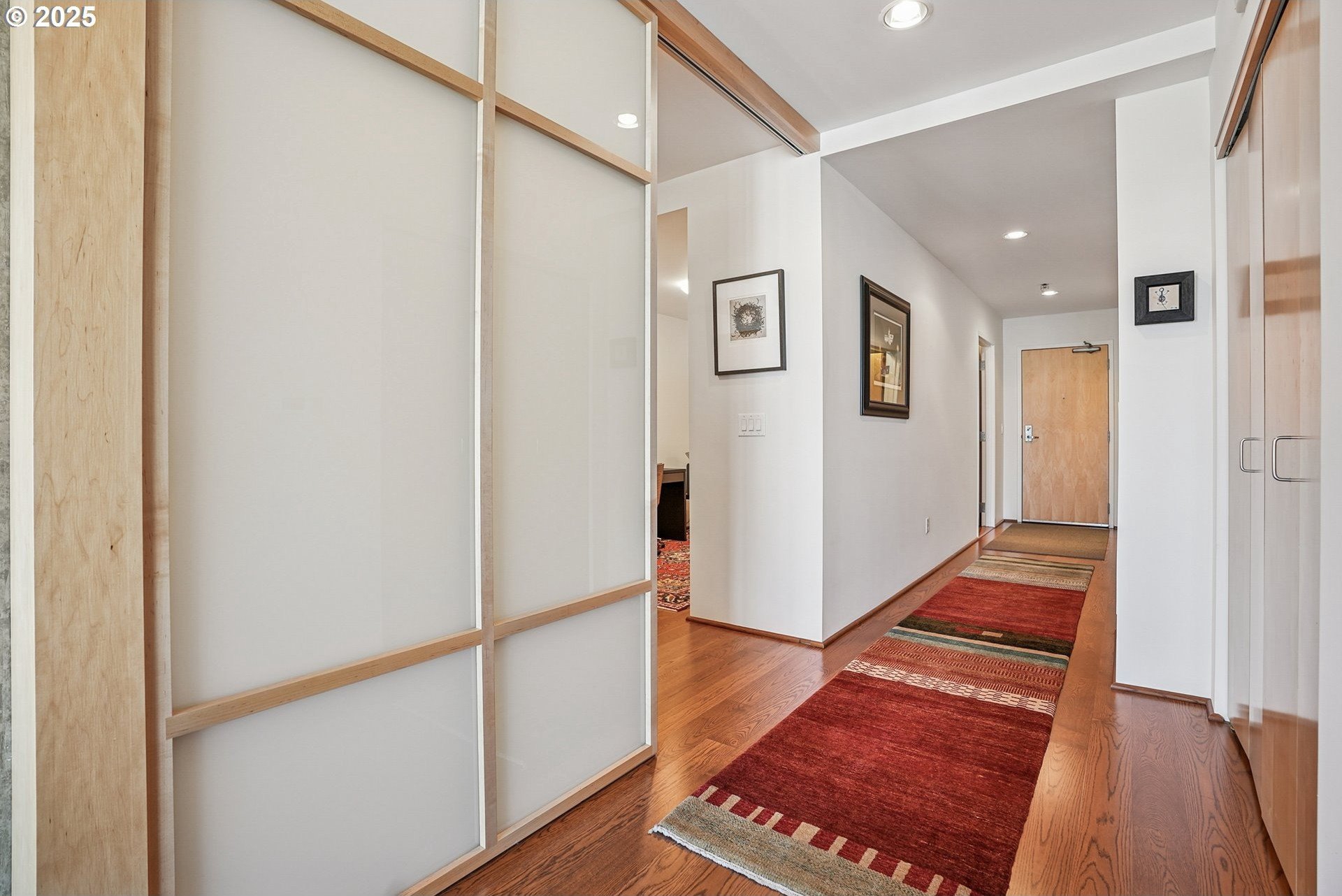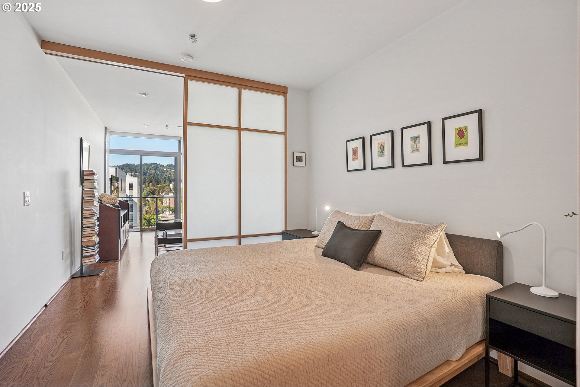 Enjoy a turnkey lifestyle & a breath of fresh air in this light and bright condo on the highest floor possible before the penthouse levels. Mid-century vibes & modern style with an open living area flooded with light from the floor to ceiling windows with two layers of mesh solar shades to control all the natural light you like. Enjoy watching the sunsets & grilling on the balcony spanning over 26'. Clean lines in the kitchen with European-style cabinets, granite counters, a custom full-height backsplash and stainless appliances, including the wine cooler in the eating island. The primary suite is private off the living room with custom wood & glass sliders, custom closets & an en suite bathroom featuring a marble vanity and large soaking tub/shower combination. Matching custom wood & glass sliders enclose the 2nd bedroom for working or hosting guests with the adjacent 2nd bath. The large entry leads to a big laundry room with generous storage space, washer & dryer. Separately deeded & secure parking space is within the building, and includes a private storage room adjacent to the parking space. The building has power for EV charging & each owner can contract to bring the power and install charging stations at each parking space at their own cost. The building has many wonderful amenities: fitness room & library on the 2nd floor, meeting room & common terrace with kitchen & bath on the 3rd floor, plus 24/7 concierge service. Strong HOA & very well managed building. Frequent the new Mark Rothko Pavilion at the Portland Art Museum across the street, events at the Schnitz, Oregon Historical Society, Farmers Markets, classes at PSU, downtown shopping & dining.