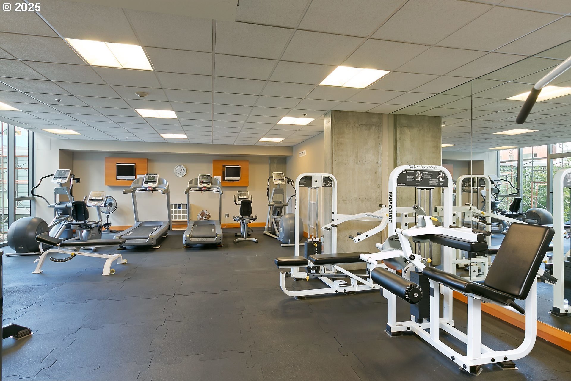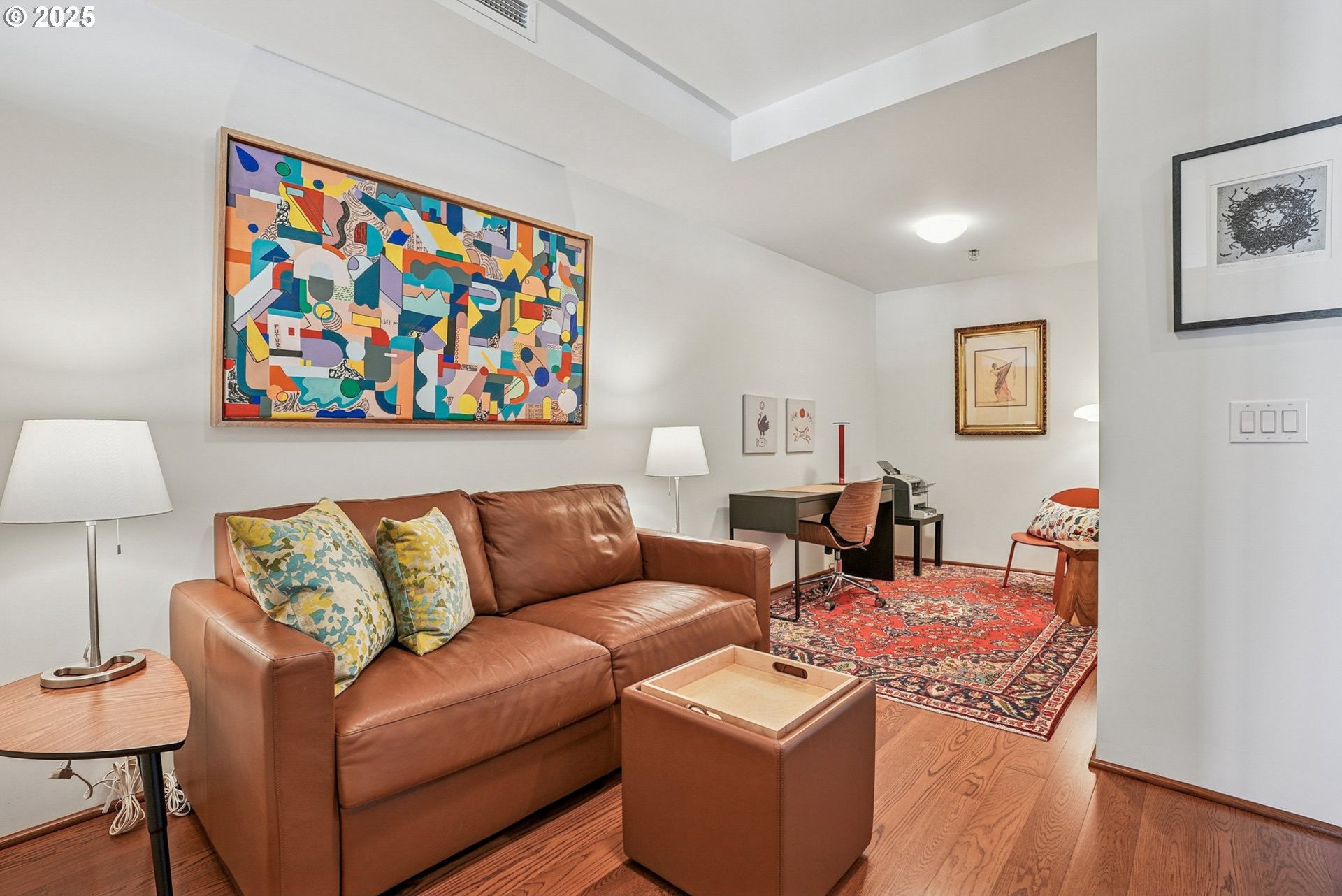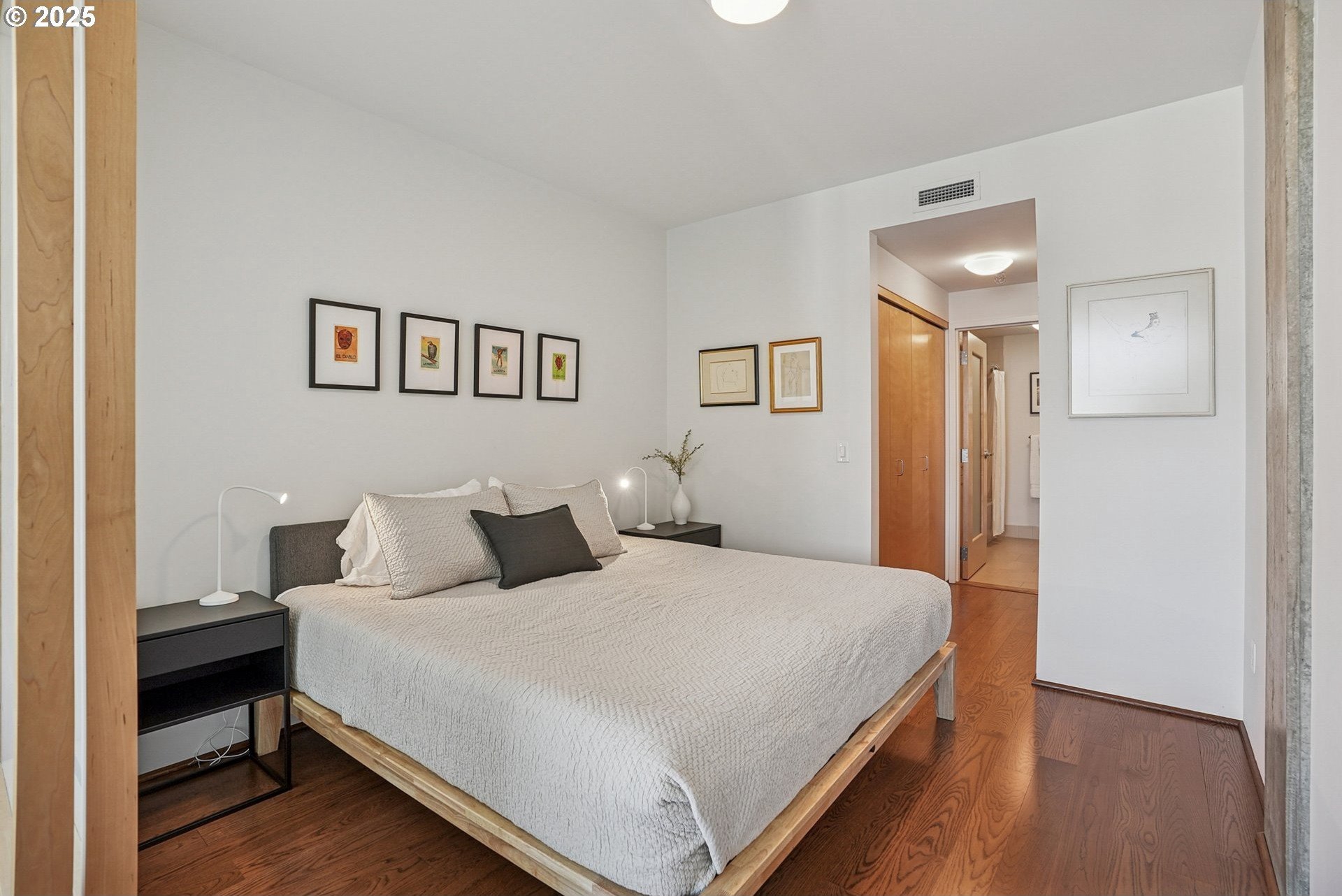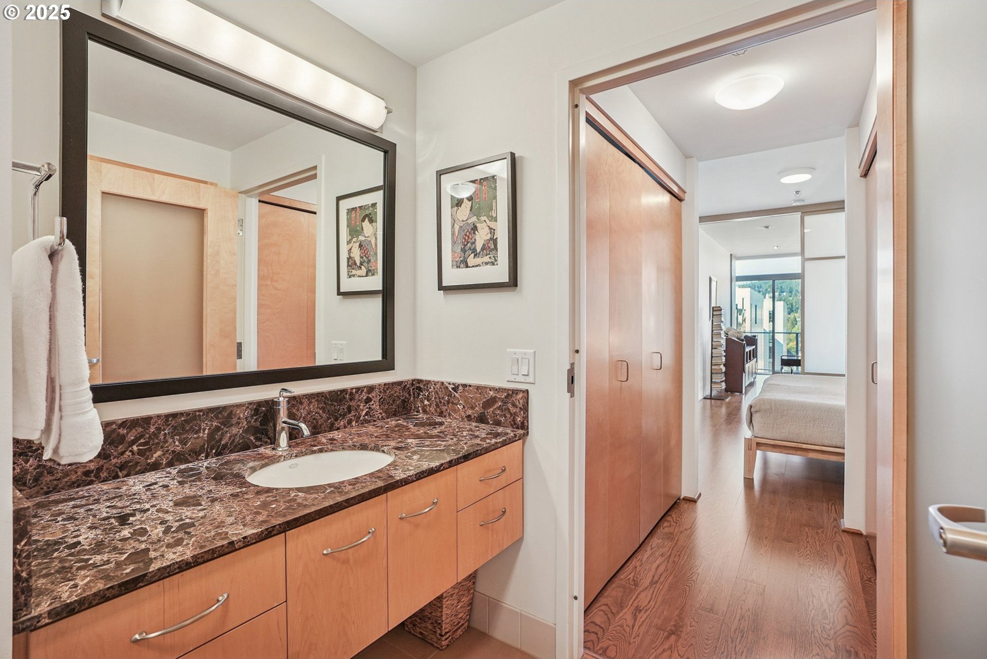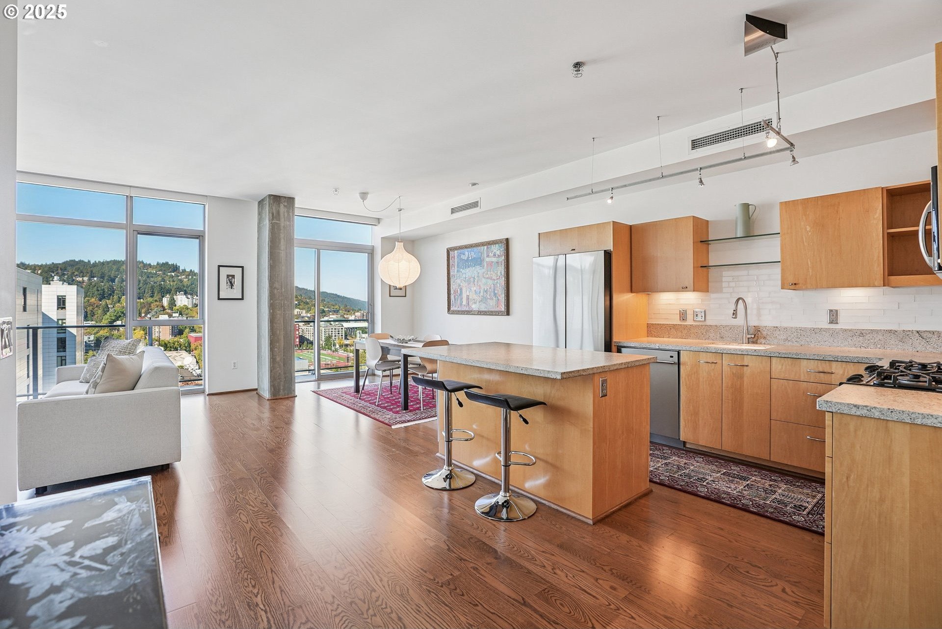 Enjoy a turnkey lifestyle & a breath of fresh air in this light and bright condo on the highest floor possible before the penthouse levels. Mid-century vibes & modern style with an open living area flooded with light from the floor to ceiling windows with two layers of mesh solar shades to control all the natural light you like. Enjoy watching the sunsets & grilling on the balcony spanning over 26'. Clean lines in the kitchen with European-style cabinets, granite counters, a custom full-height backsplash and stainless appliances, including the wine cooler in the eating island. The primary suite is private off the living room with custom wood & glass sliders, custom closets & an en suite bathroom featuring a marble vanity and large soaking tub/shower combination. Matching custom wood & glass sliders enclose the 2nd bedroom for working or hosting guests with the adjacent 2nd bath. The large entry leads to a big laundry room with generous storage space, washer & dryer. Separately deeded & secure parking space is within the building, and includes a private storage room adjacent to the parking space. The building has power for EV charging & each owner can contract to bring the power and install charging stations at each parking space at their own cost. The building has many wonderful amenities: fitness room & library on the 2nd floor, meeting room & common terrace with kitchen & bath on the 3rd floor, plus 24/7 concierge service. Strong HOA & very well managed building. Frequent the new Mark Rothko Pavilion at the Portland Art Museum across the street, events at the Schnitz, Oregon Historical Society, Farmers Markets, classes at PSU, downtown shopping & dining.
